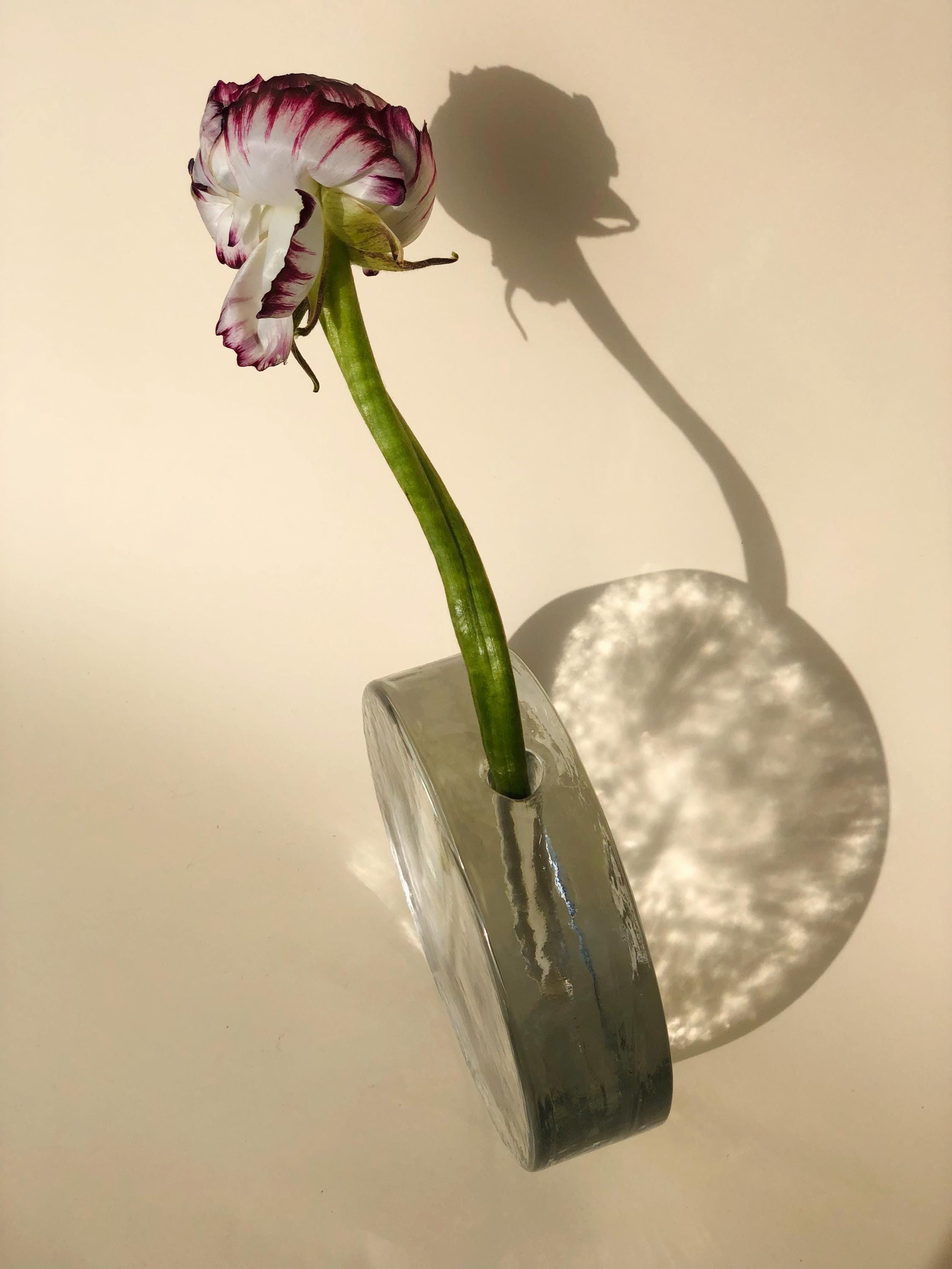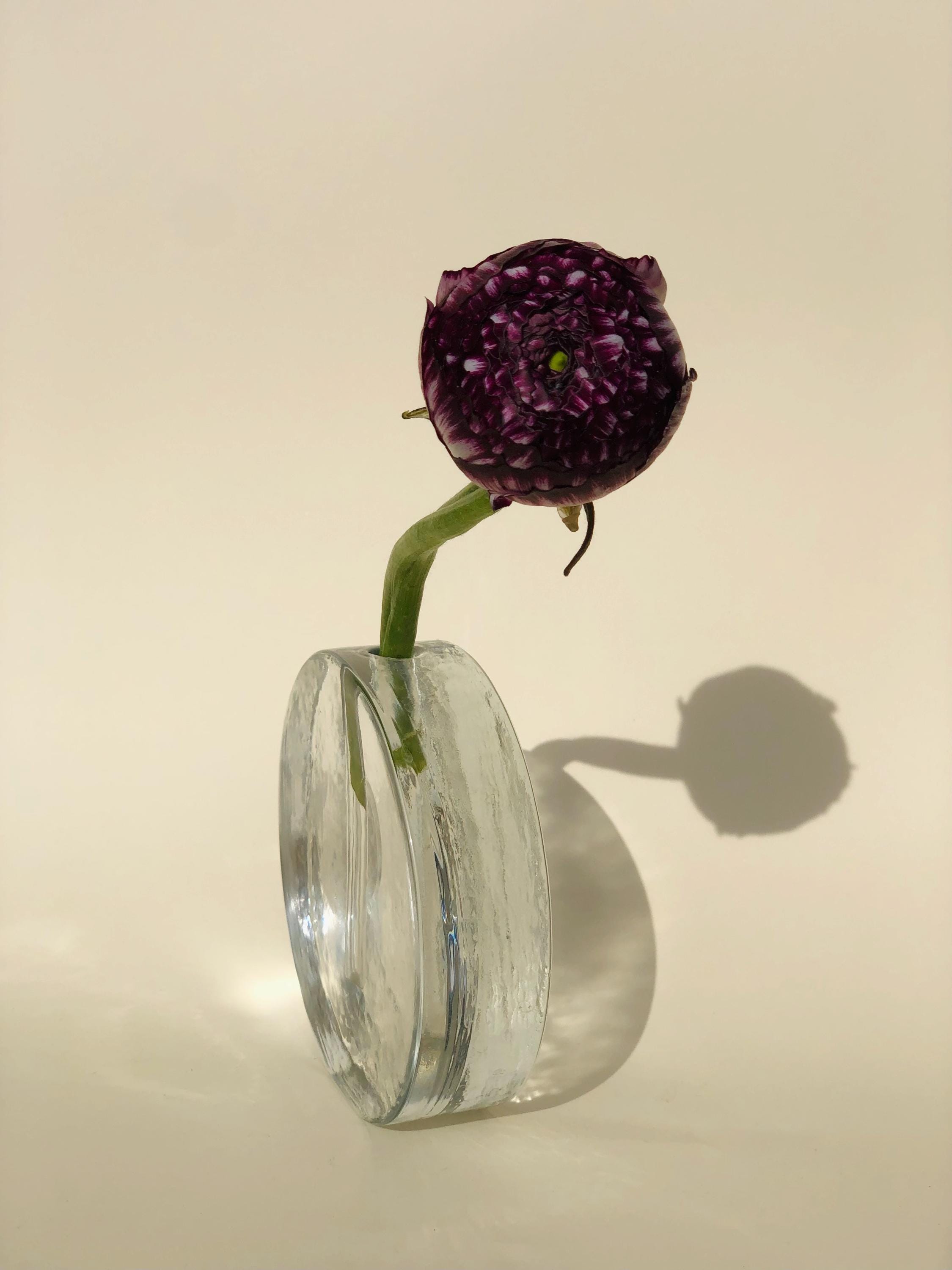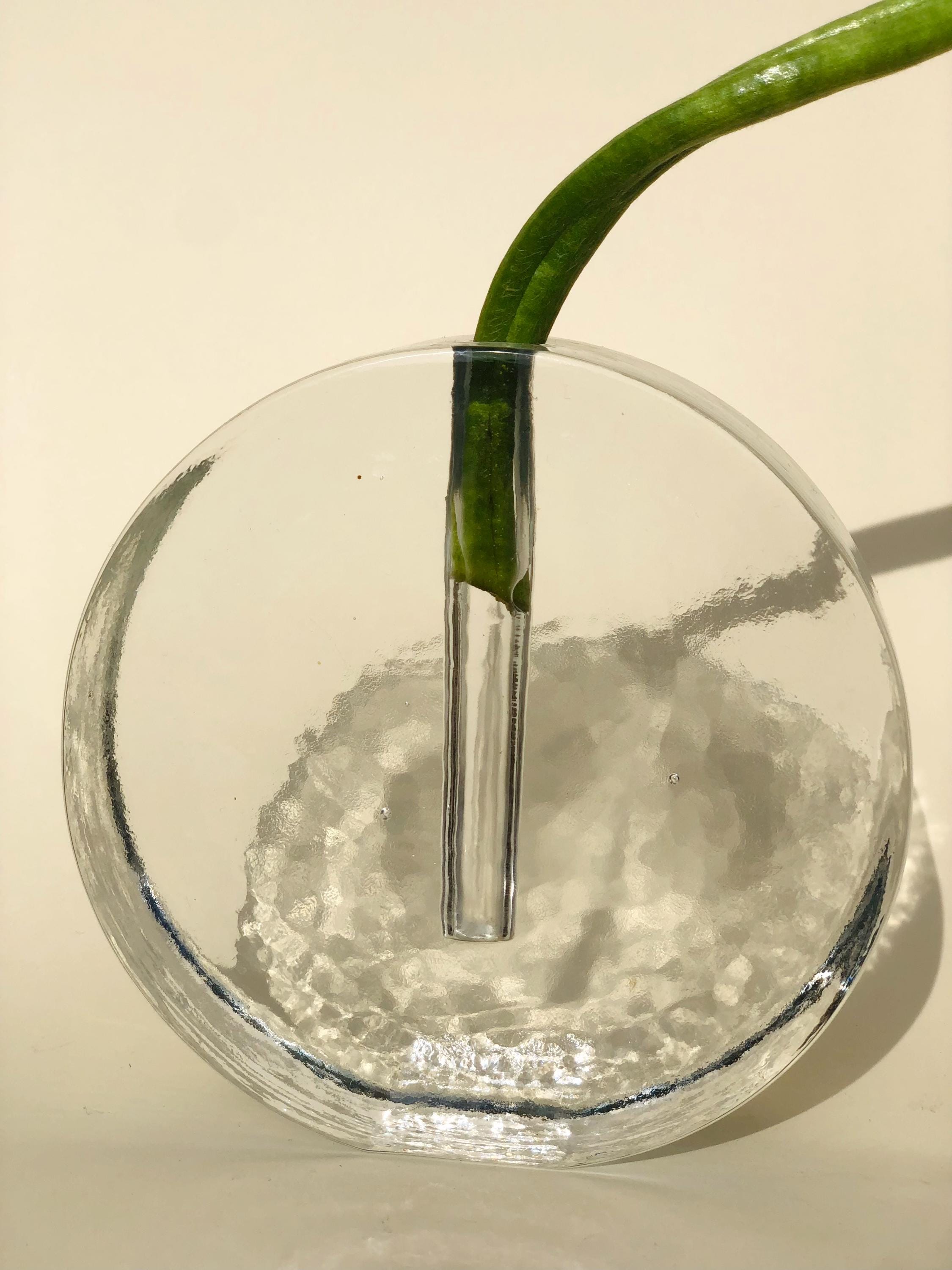 This mid-century modern glass bud vase, designed by Klaus Breit for Wiesenthal Hรผtte, embodies the timeless style of 1970s. It's designed to highlight the beauty of a single flower or small arrangement.