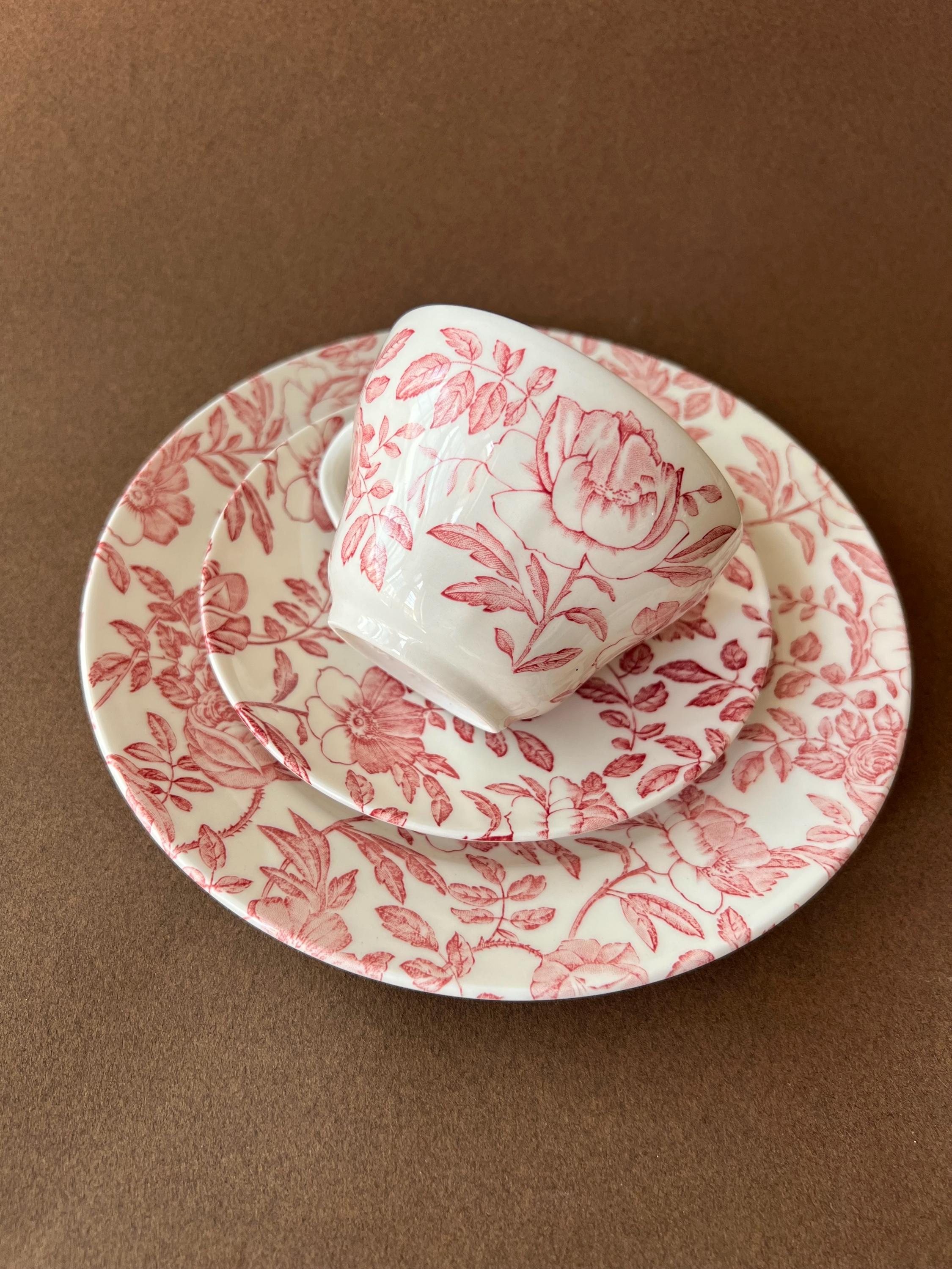 This vintage Churchill Pink Peony trio, made in England, includes a tea cup, saucer, and side plate. It features a classic pink and white floral design. It's perfect as cottage core and vintage-inspired home décor, for elegant tea parties, or as a thoughtful gift for vintage lovers.