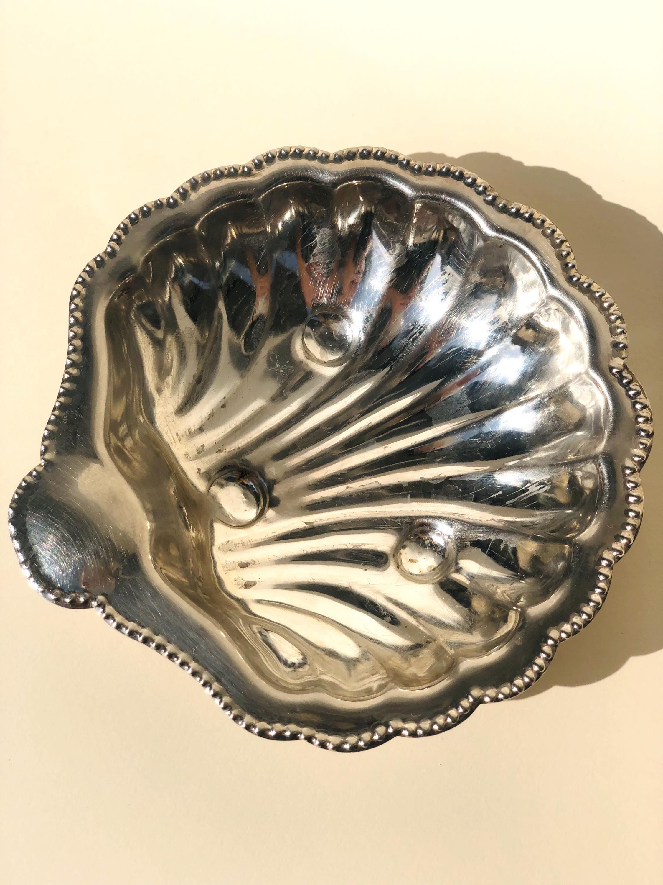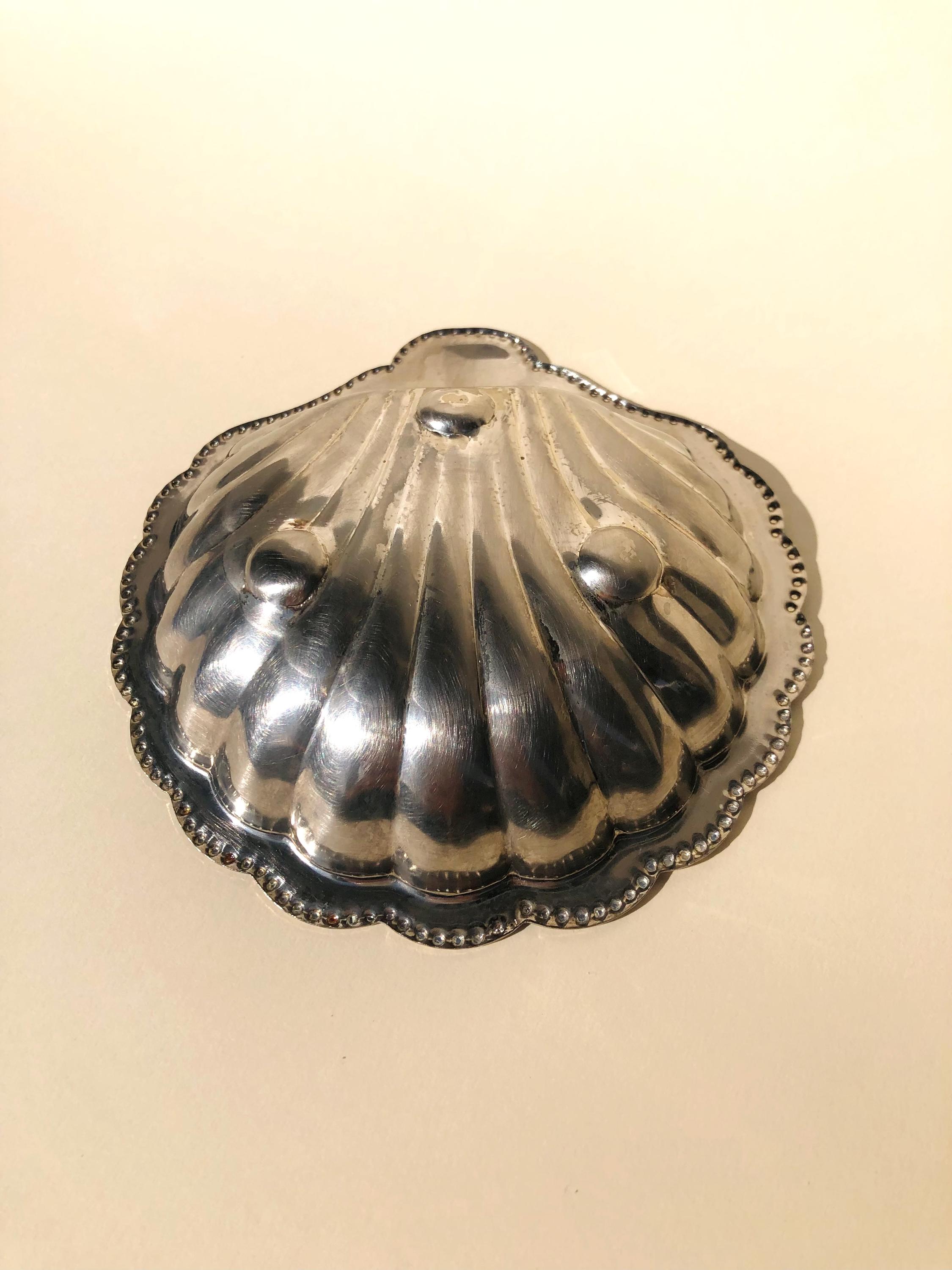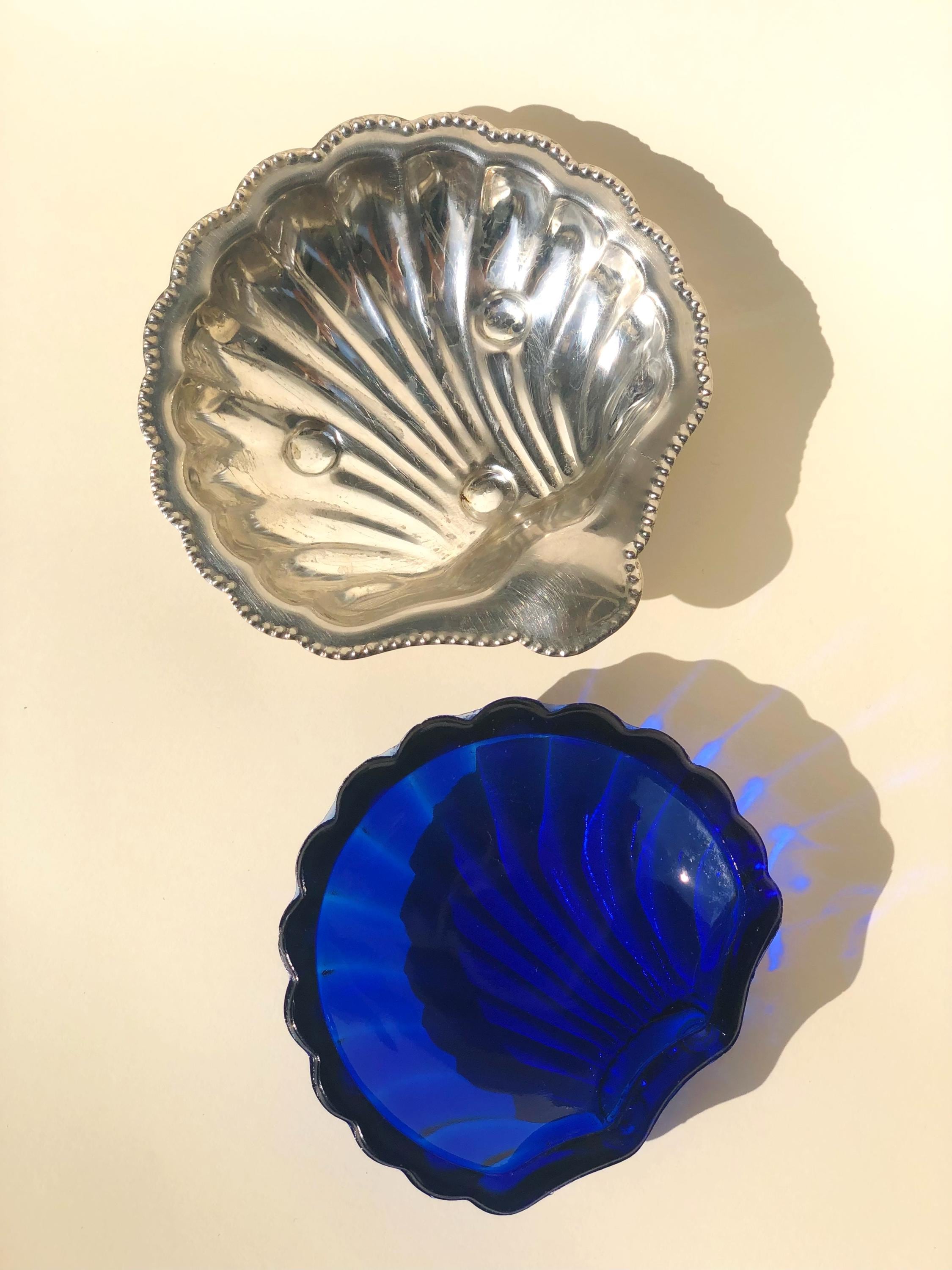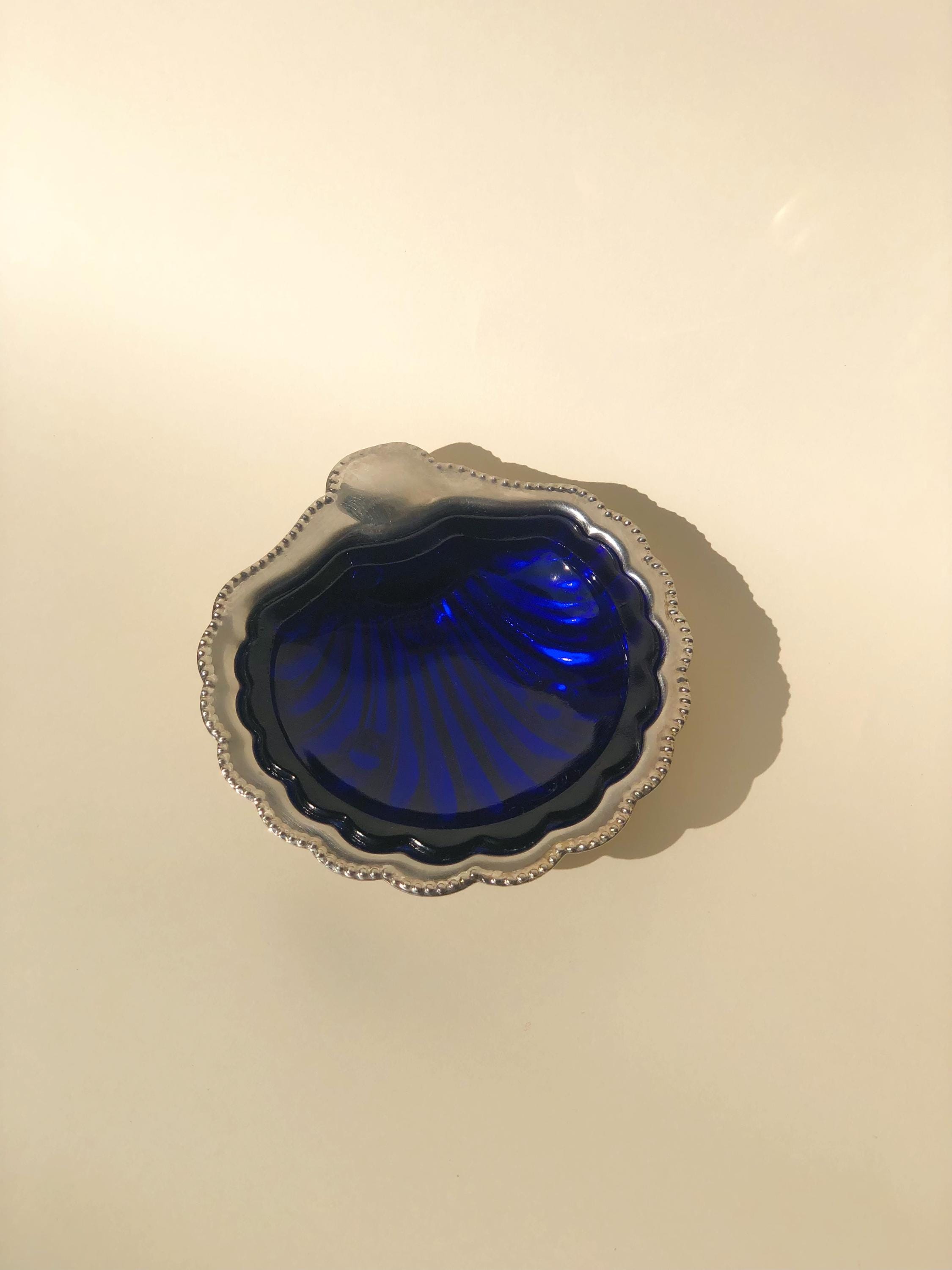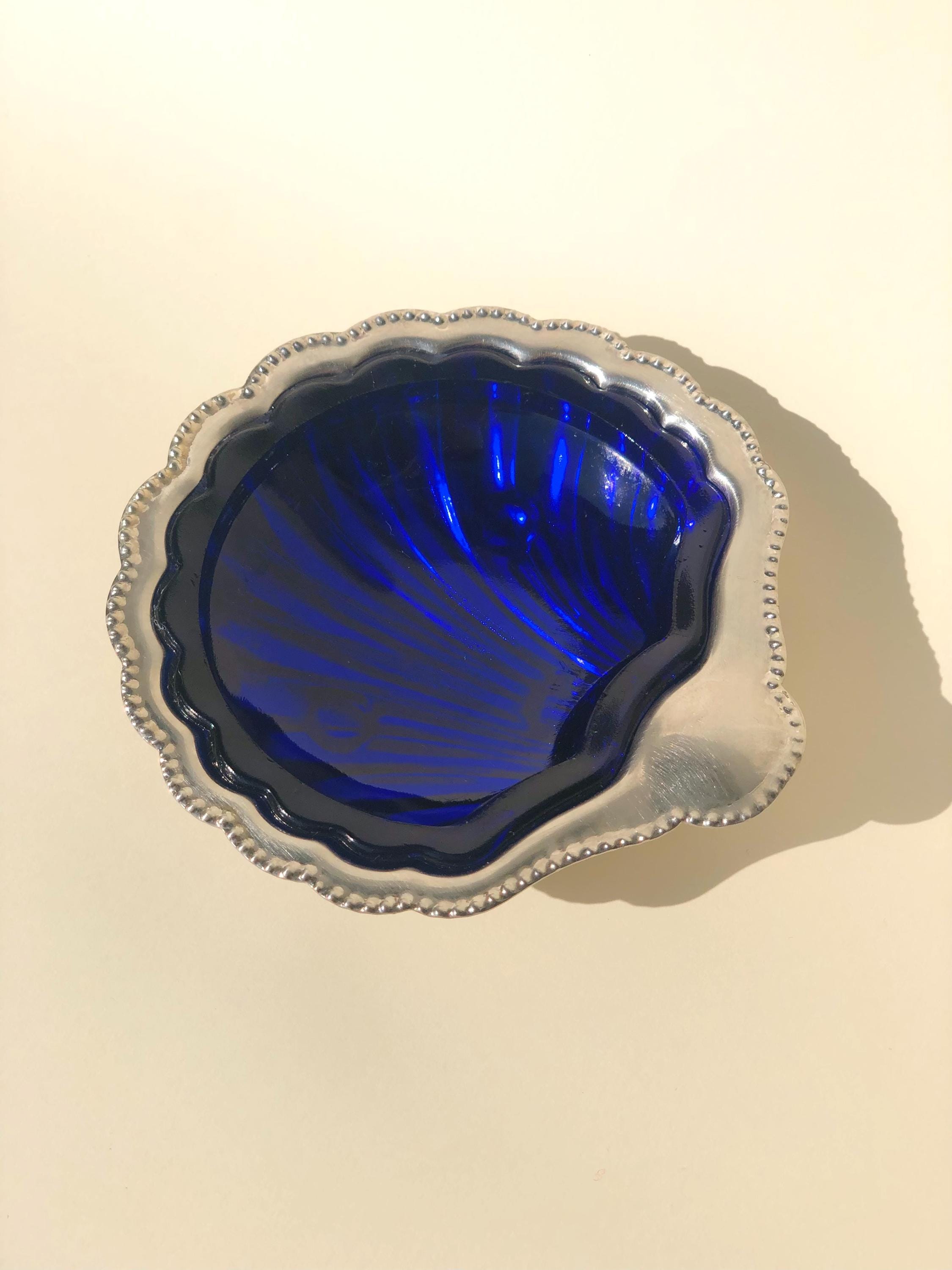 Shell shaped French shell butter dish with the removable blue glass insert.