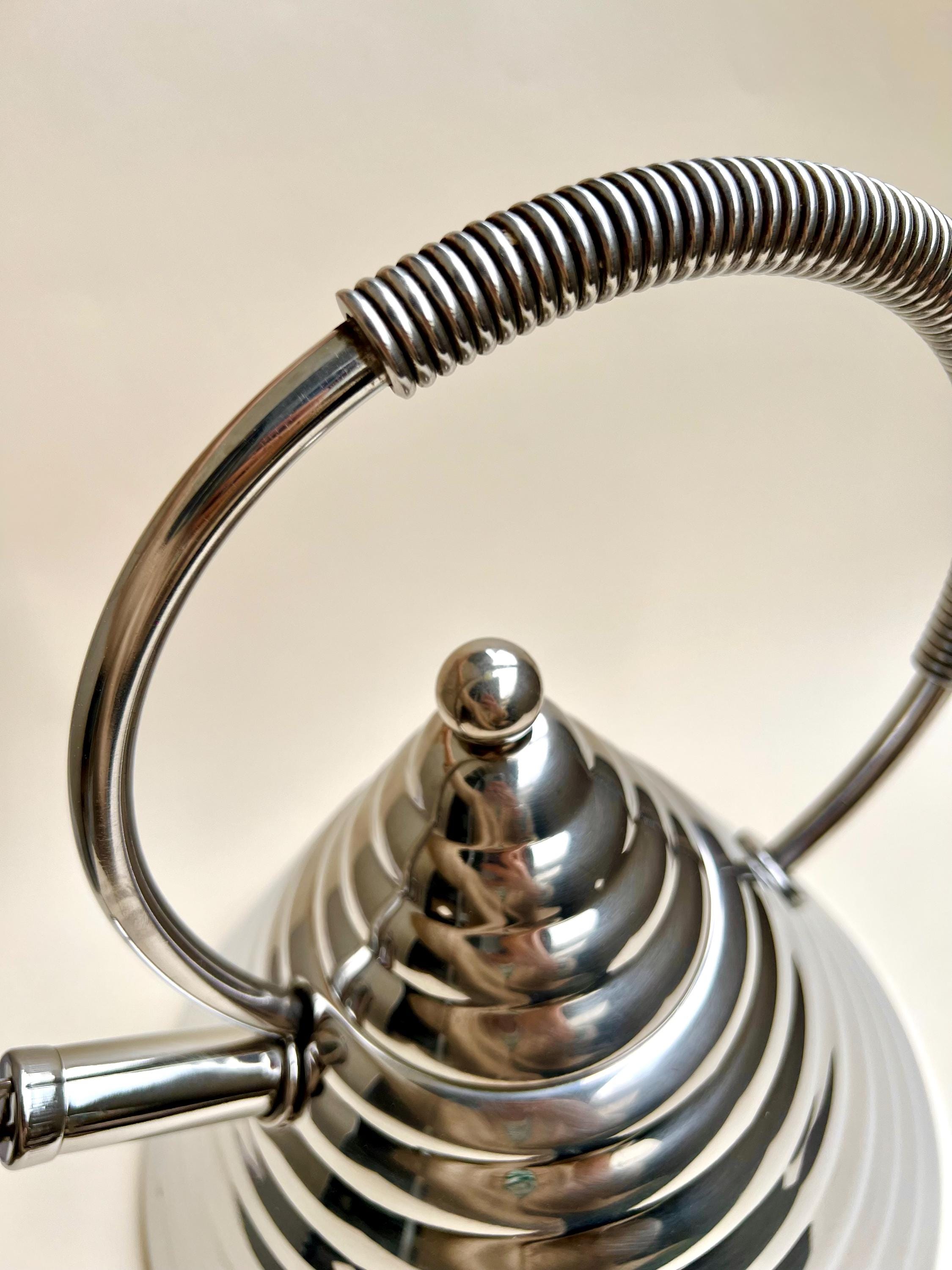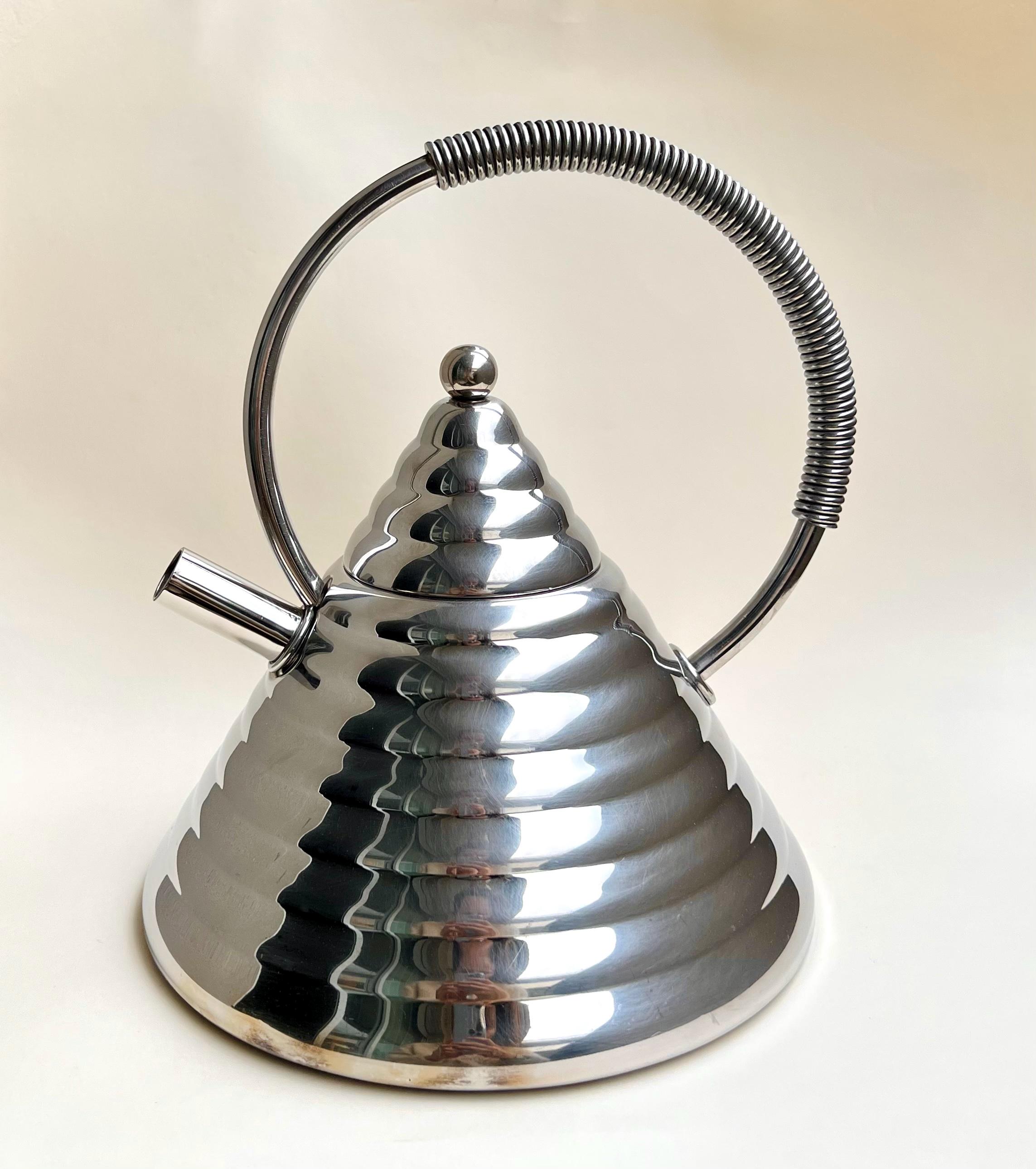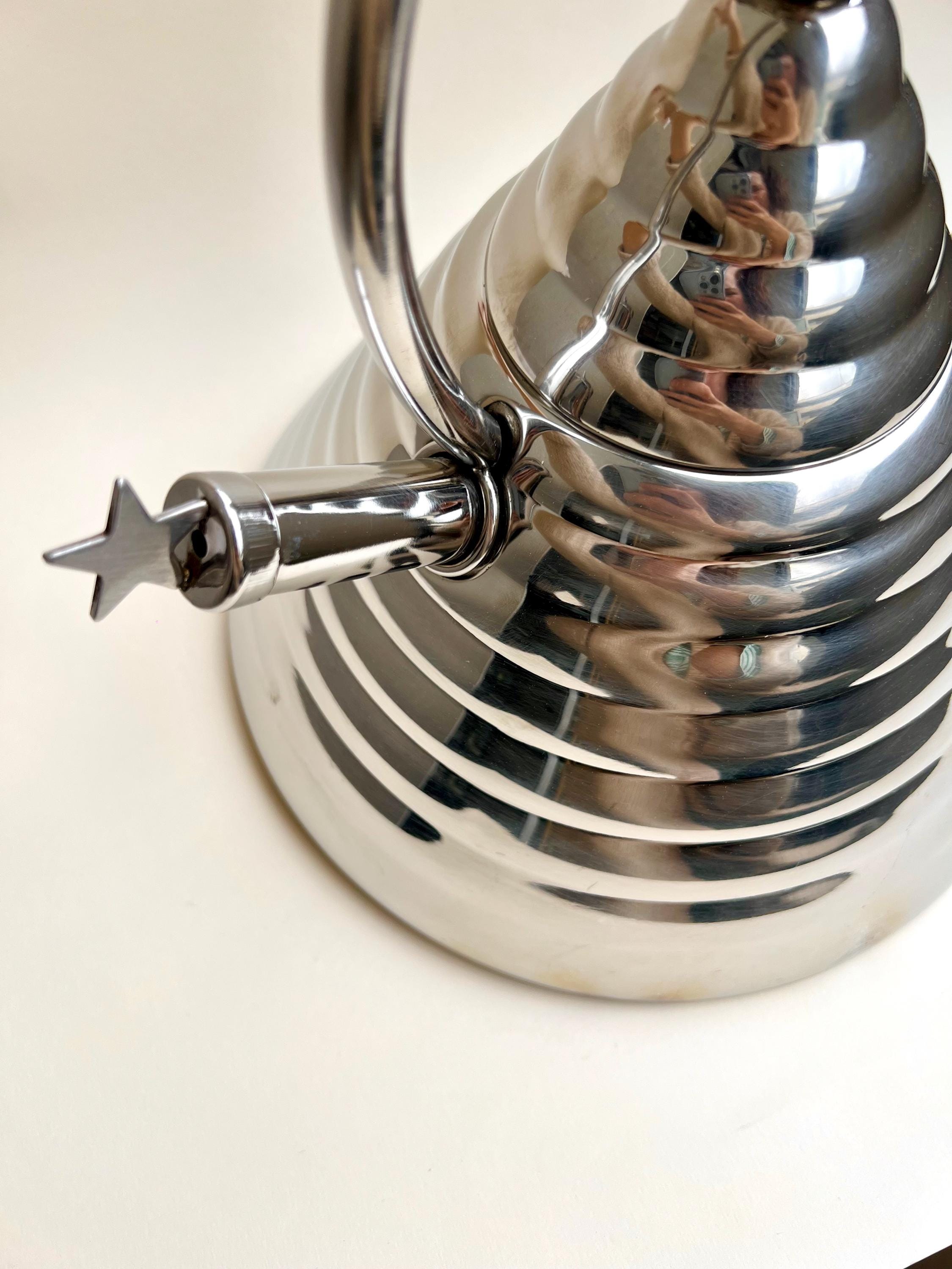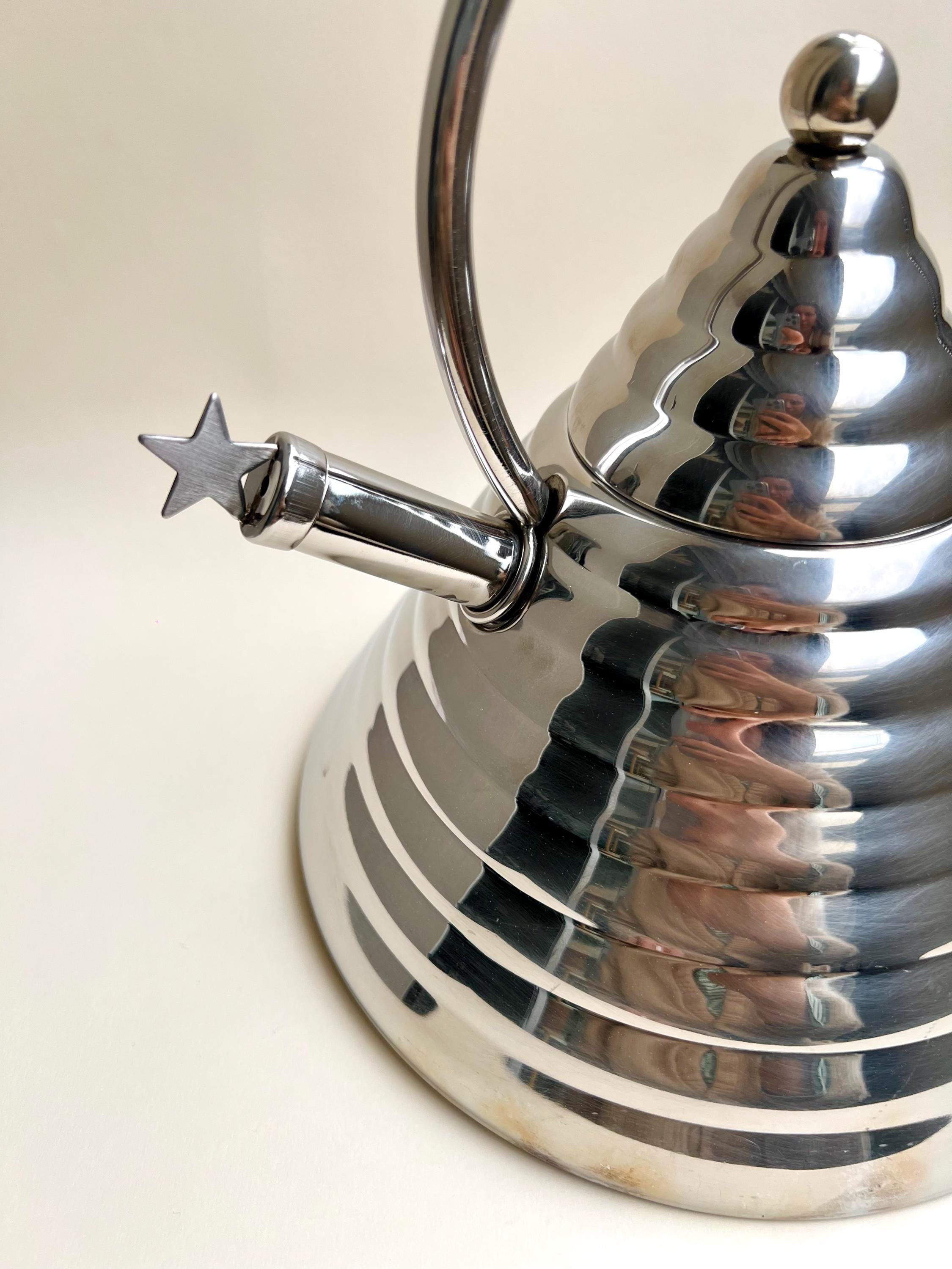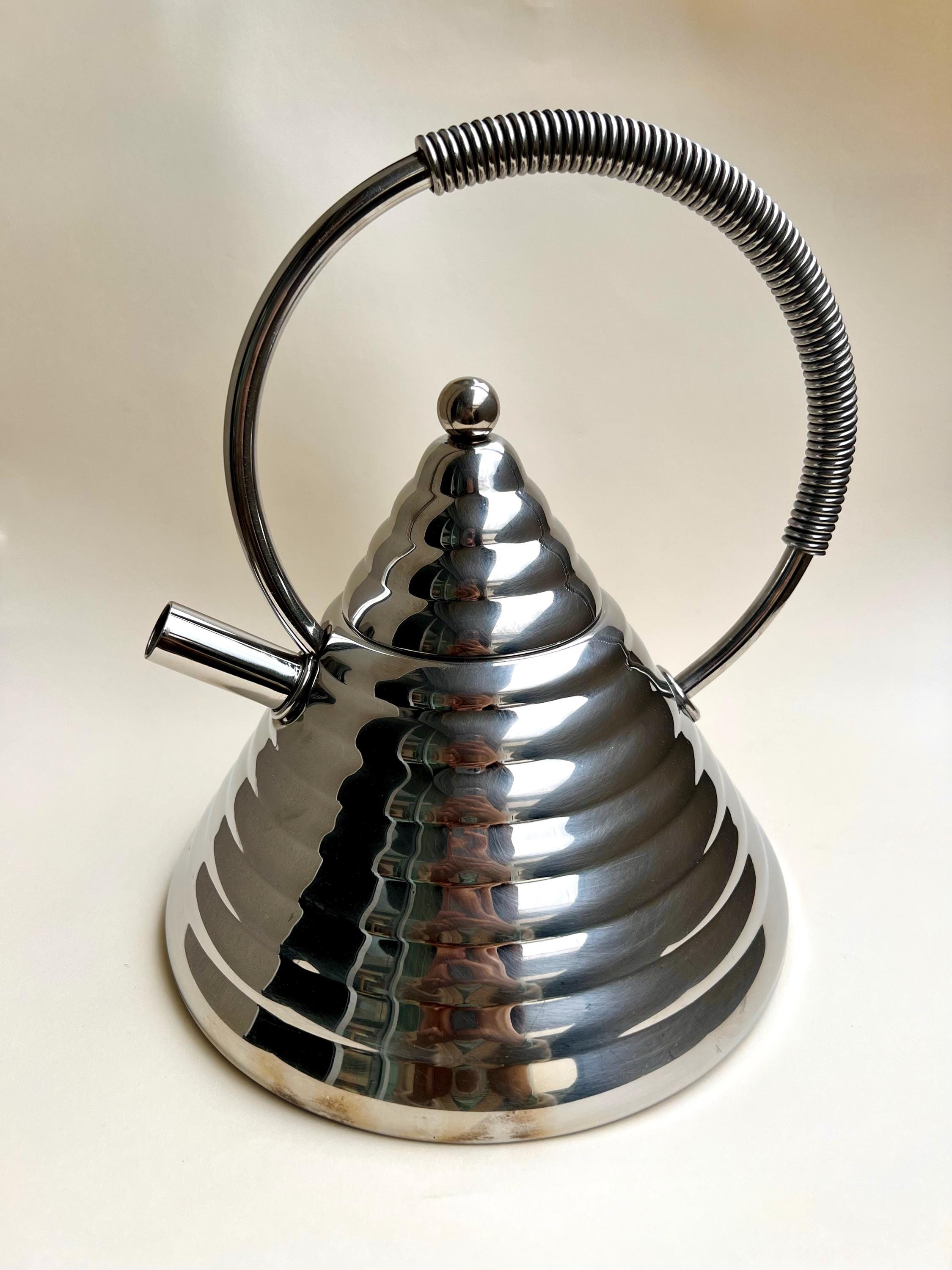 A rare and striking piece of Italian design from the 1980s, the Stella Archimede whistling kettle by Marina Sgarbi is a collector’s item. With its conical shape, domed reliefs, and intricate star details, this kettle is perfect for those who appreciate high-quality craftsmanship and bold aesthetics.