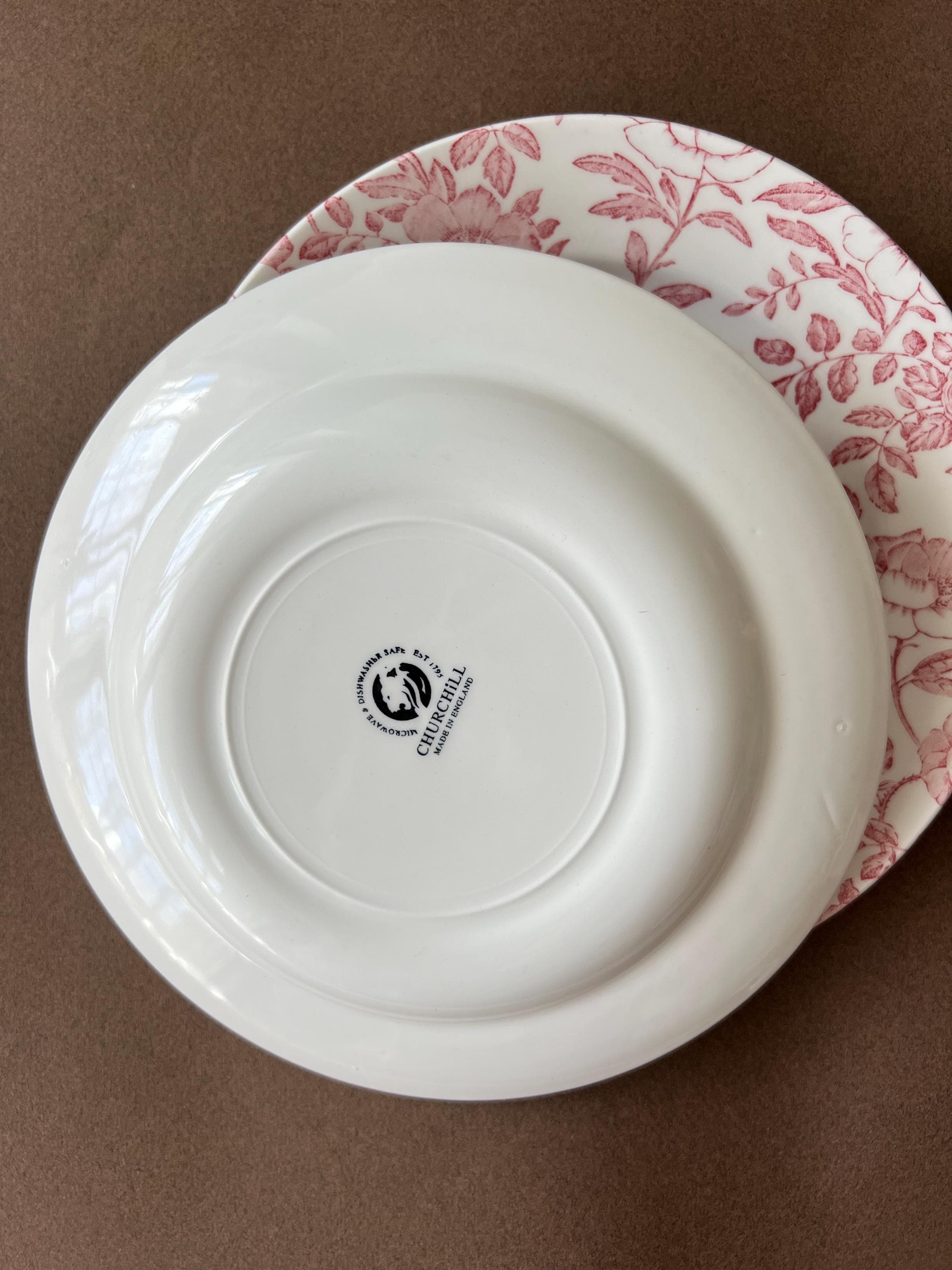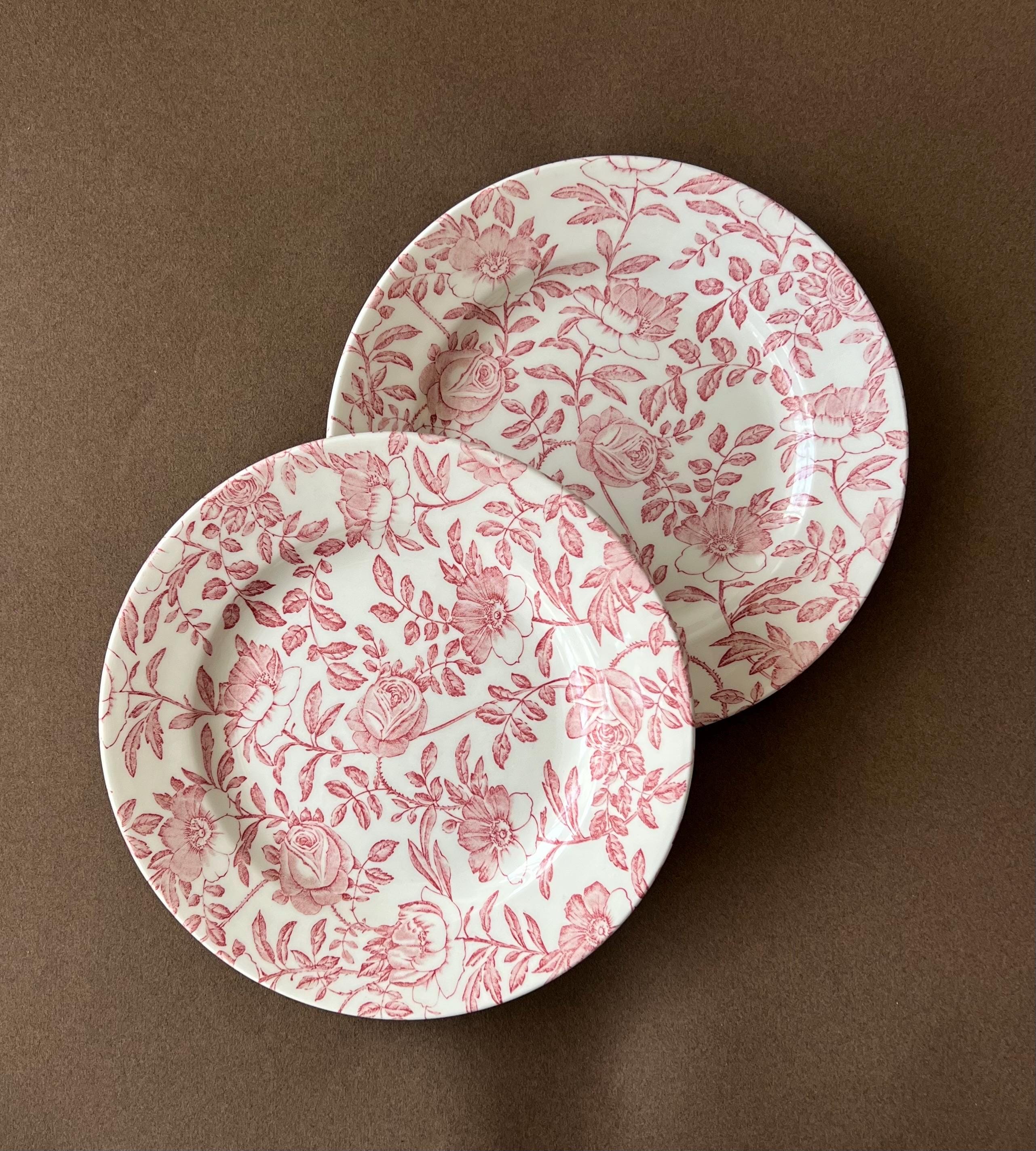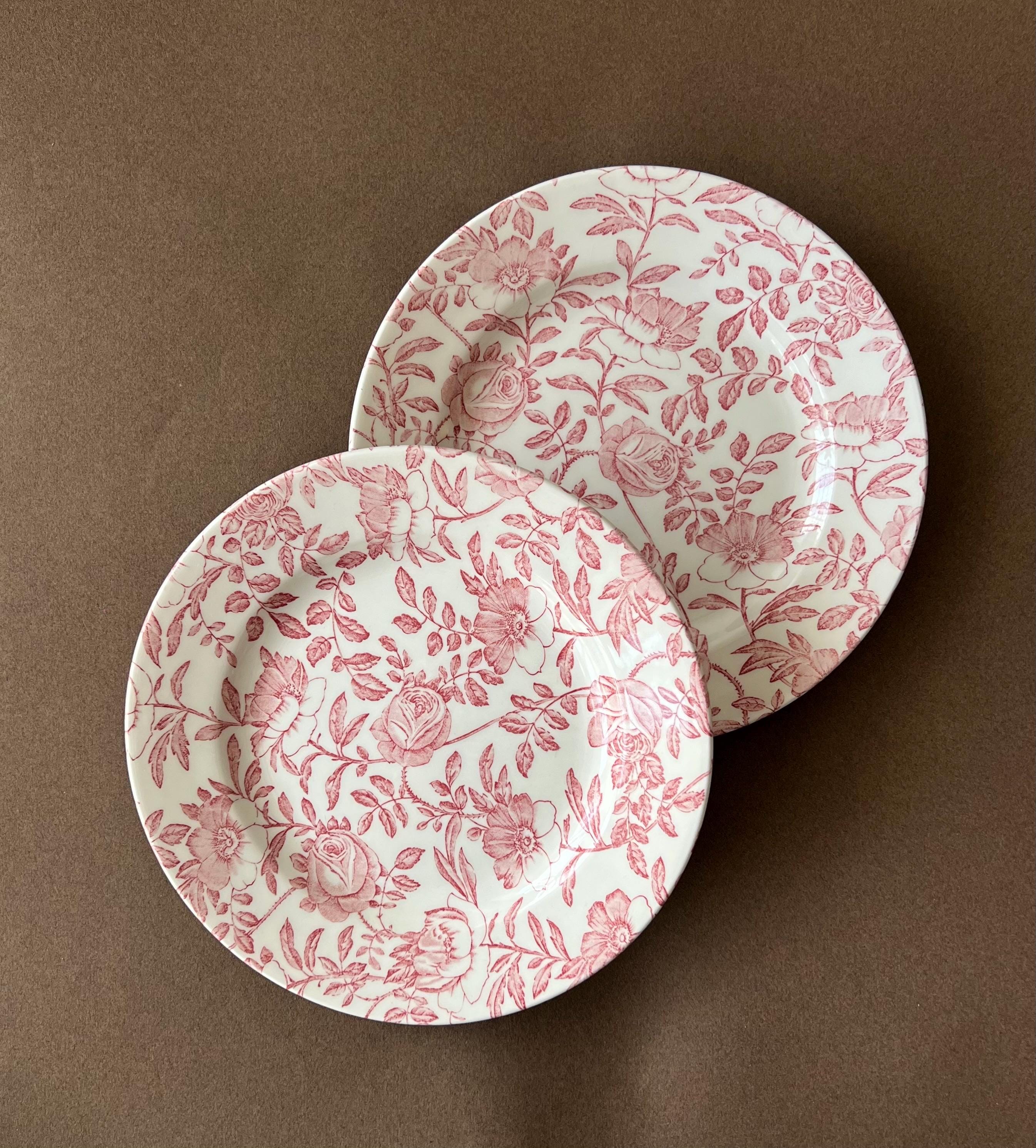 Set of pink peony Churchill plates, featuring an elegant floral pattern in a soft pink against a white background, perfect for breakfast, desserts, or afternoon tea.