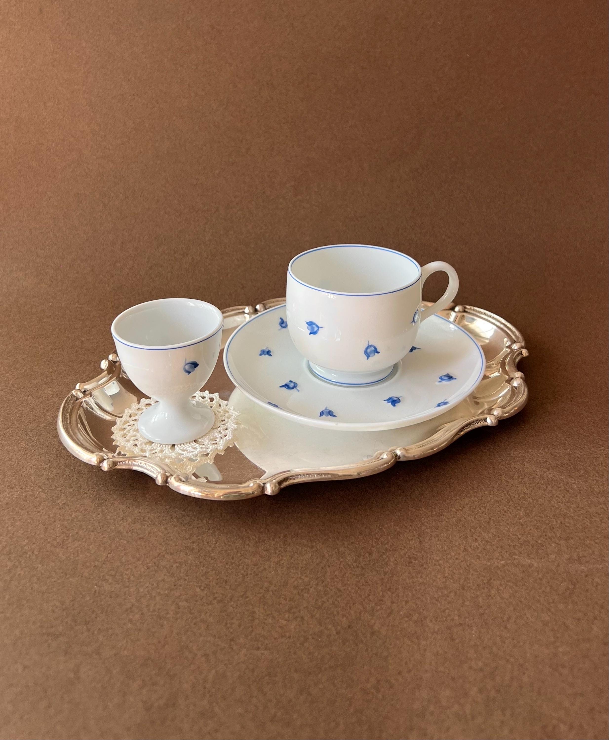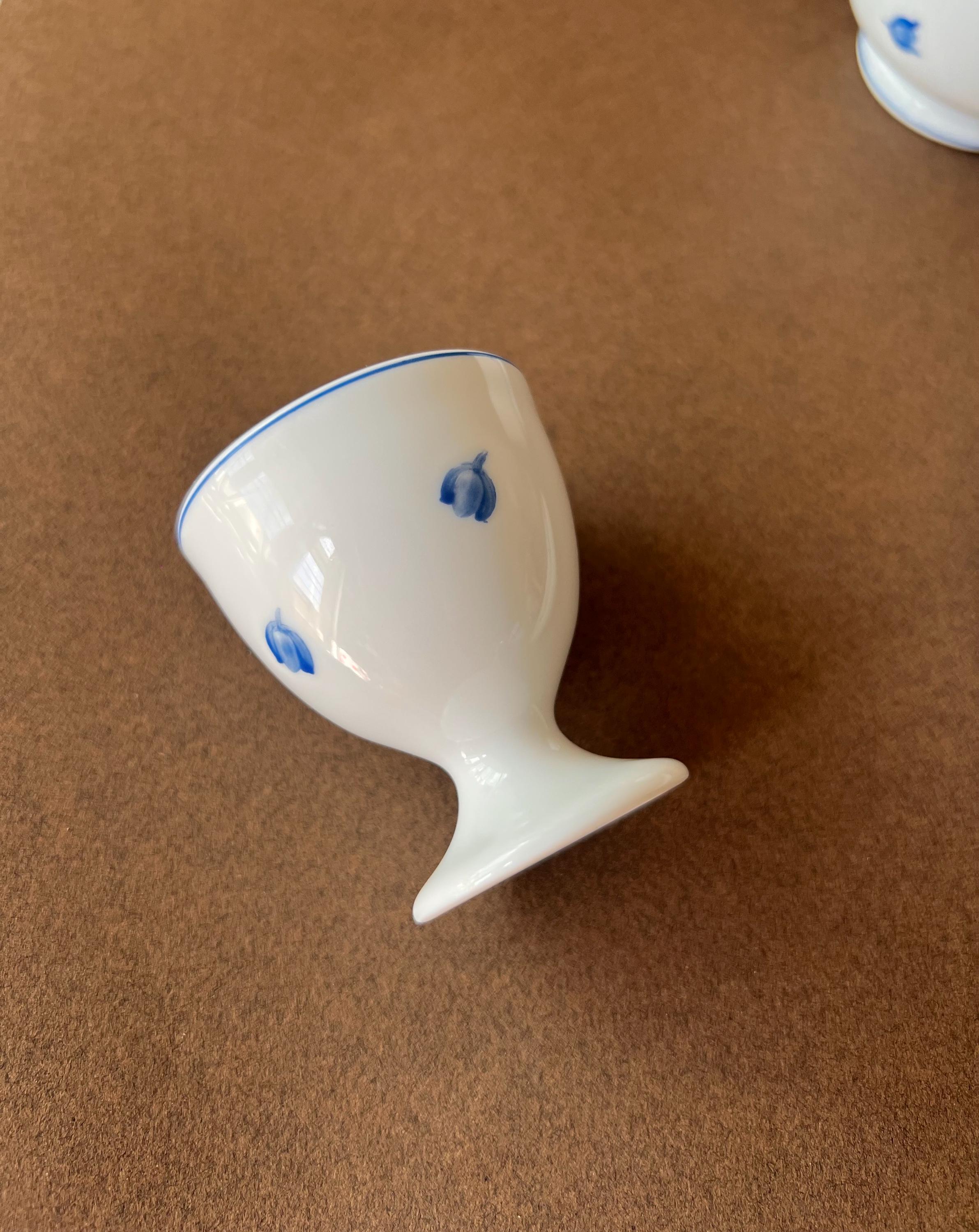 Made out of fine Limoges porcelain, this delicate egg holder features a subtle engraved floral motif in blue.