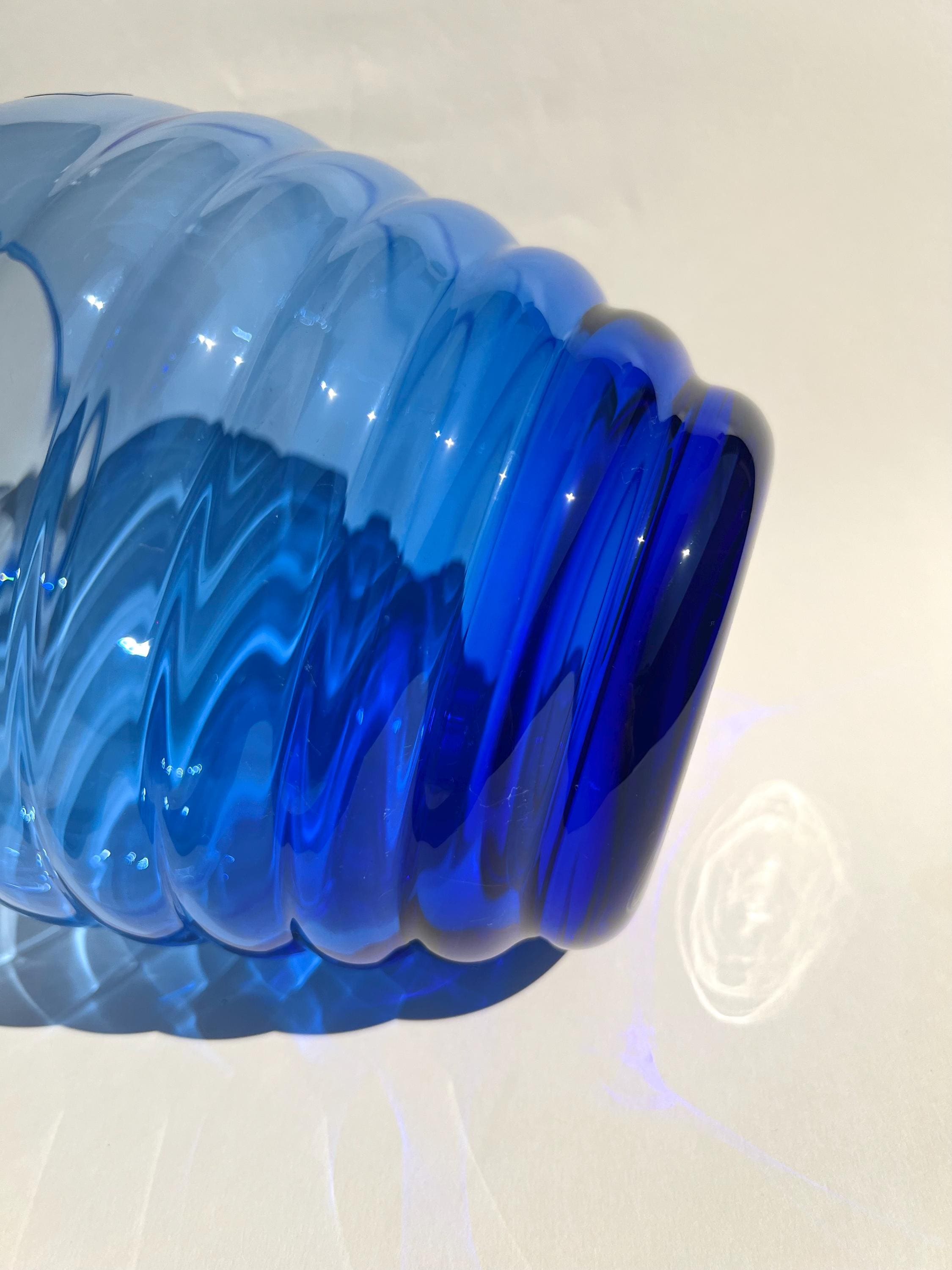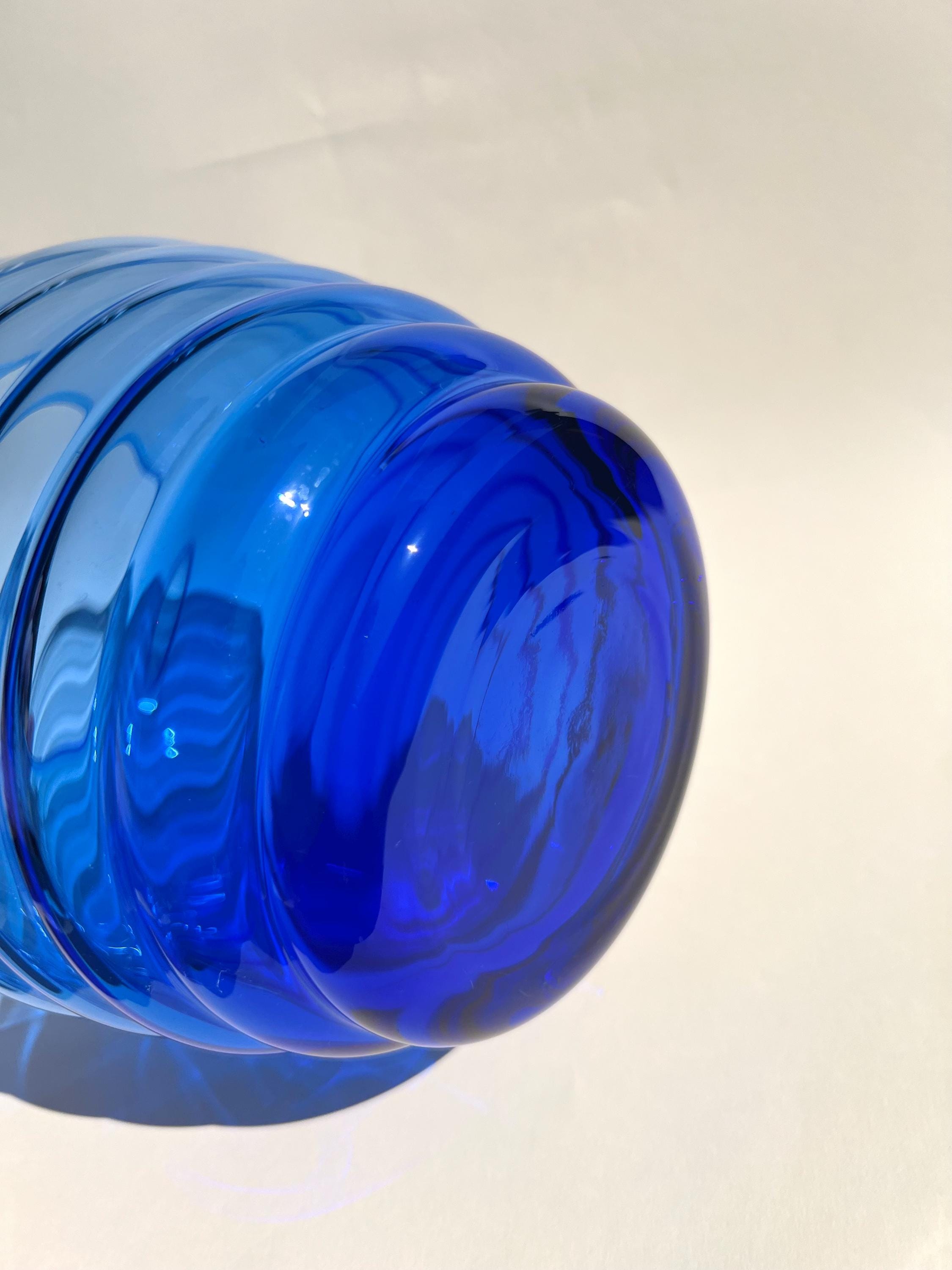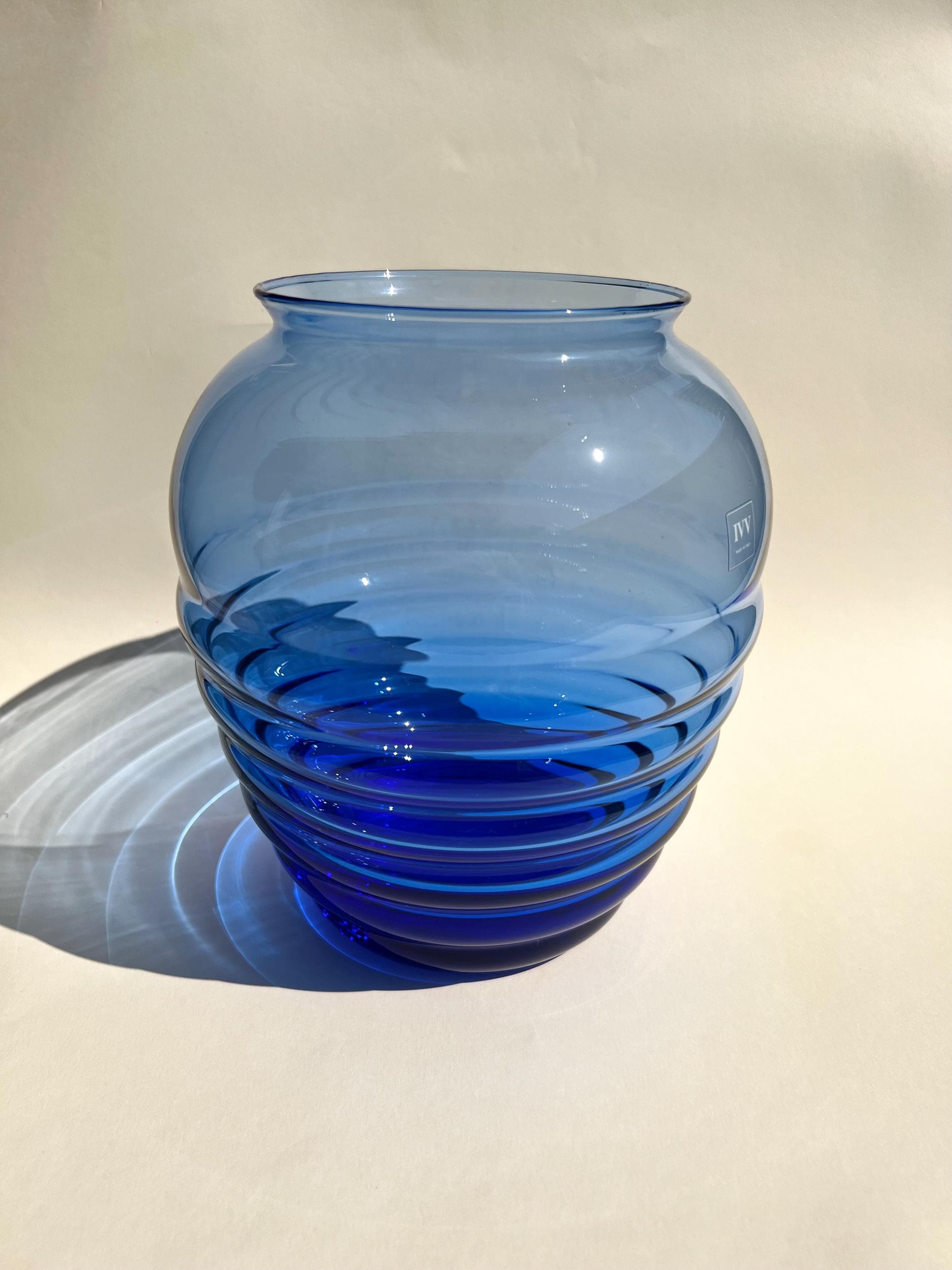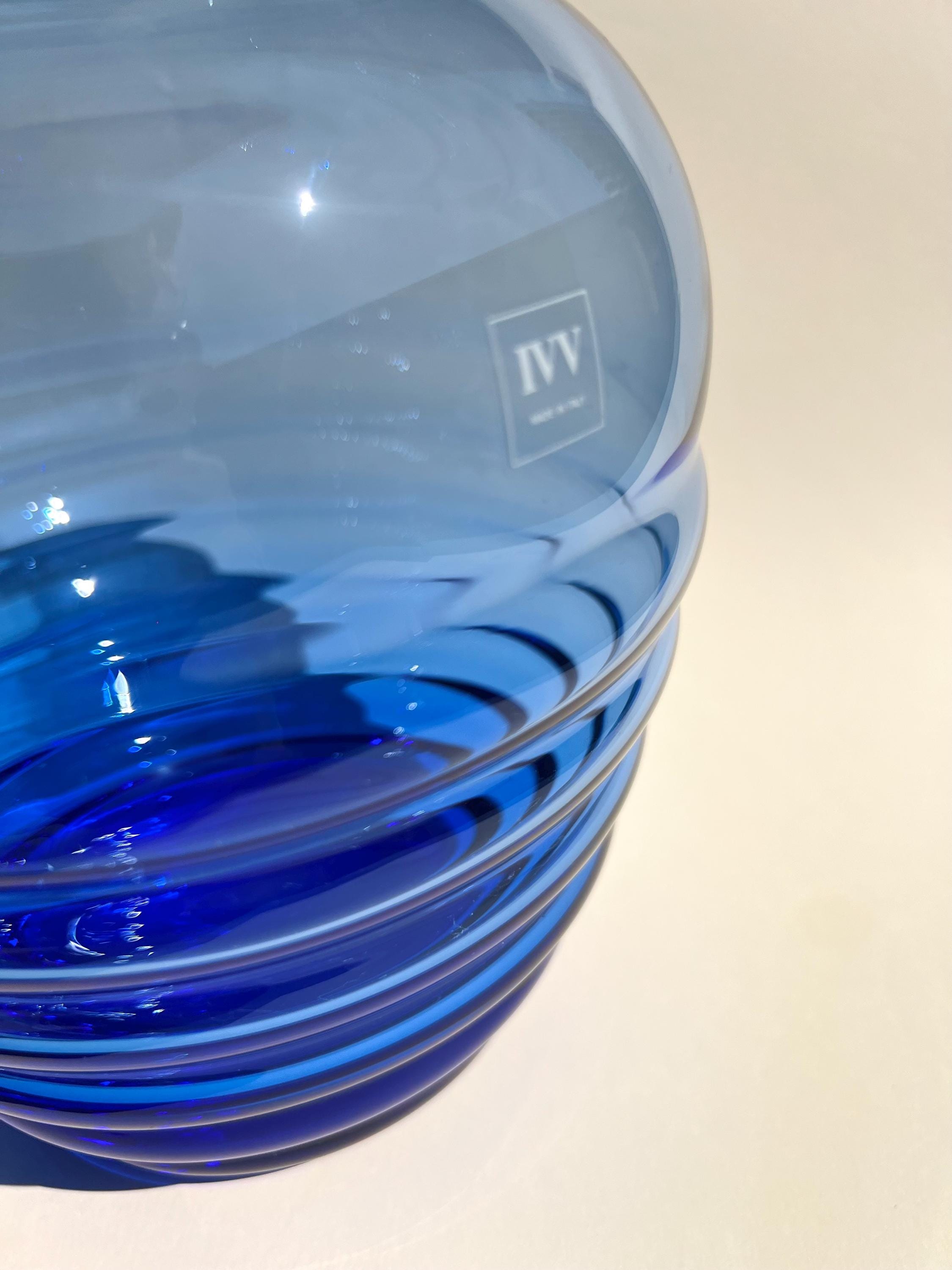 This Italian glass vase by IVV (Industria Vetraria Valdarnese) is a sculptural statement piece in a rich cobalt blue. Whether displayed on its own or holding a bouquet, it adds a bold and refined touch to any space. Labeled "IVV Made in Italy"