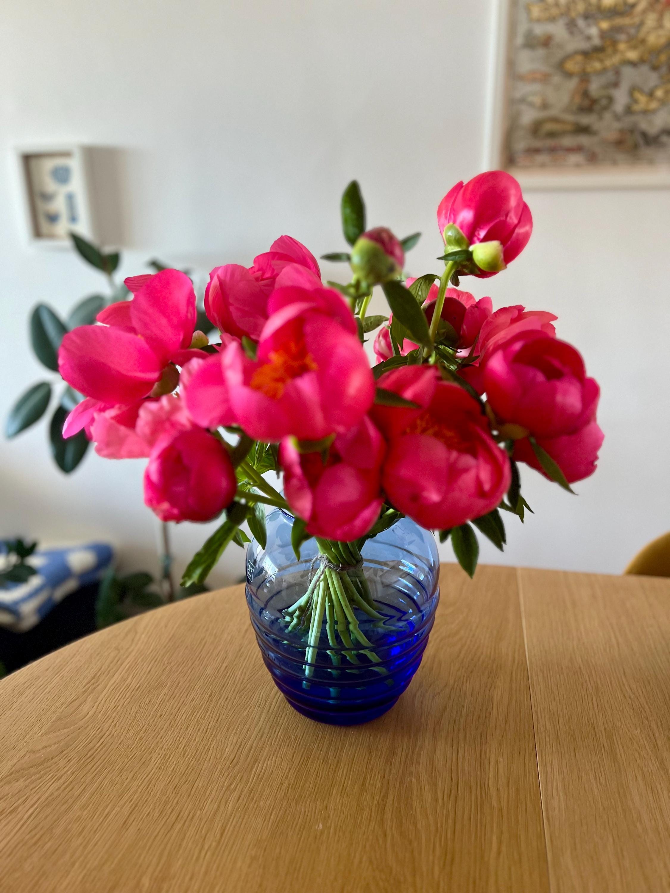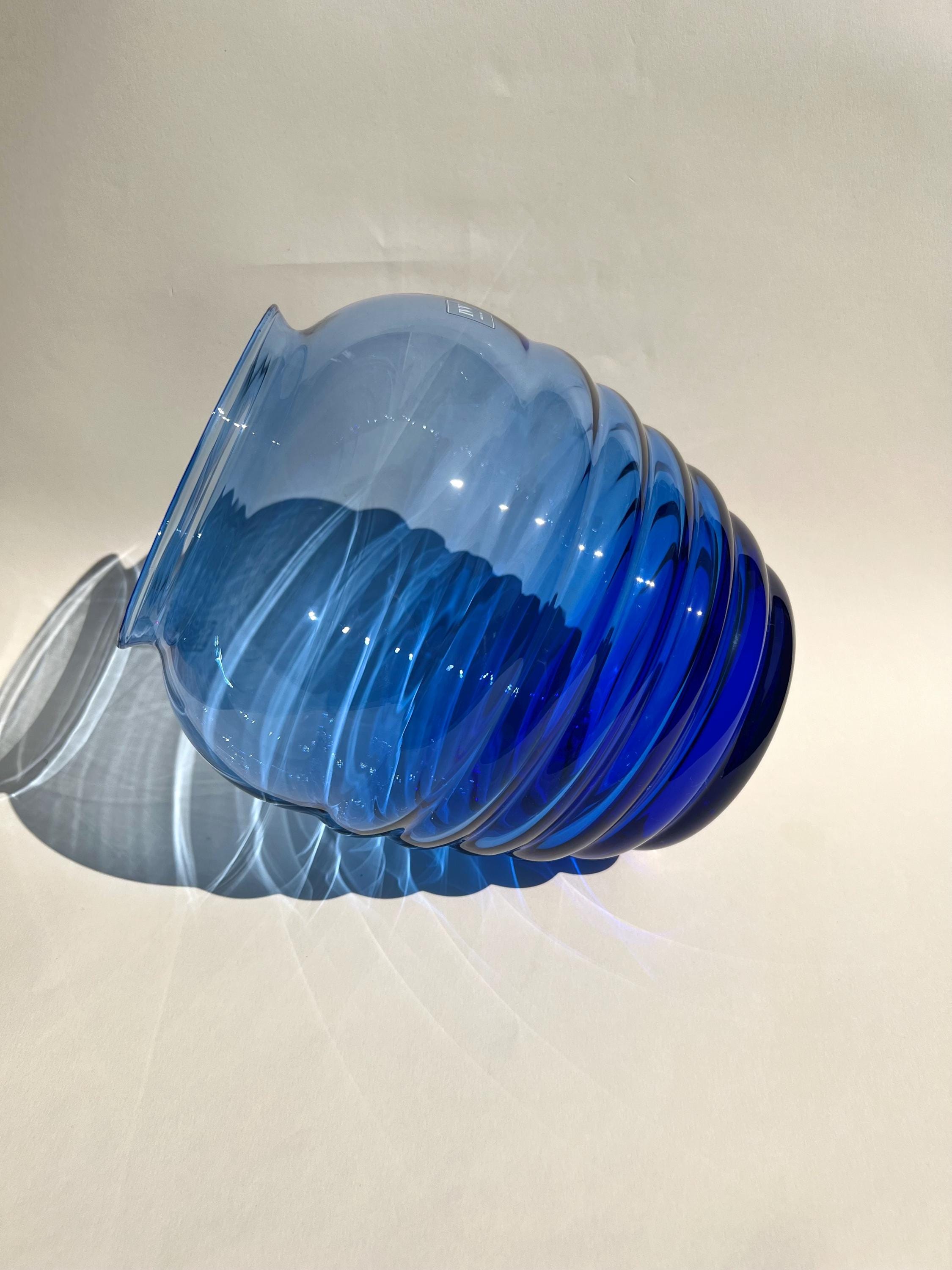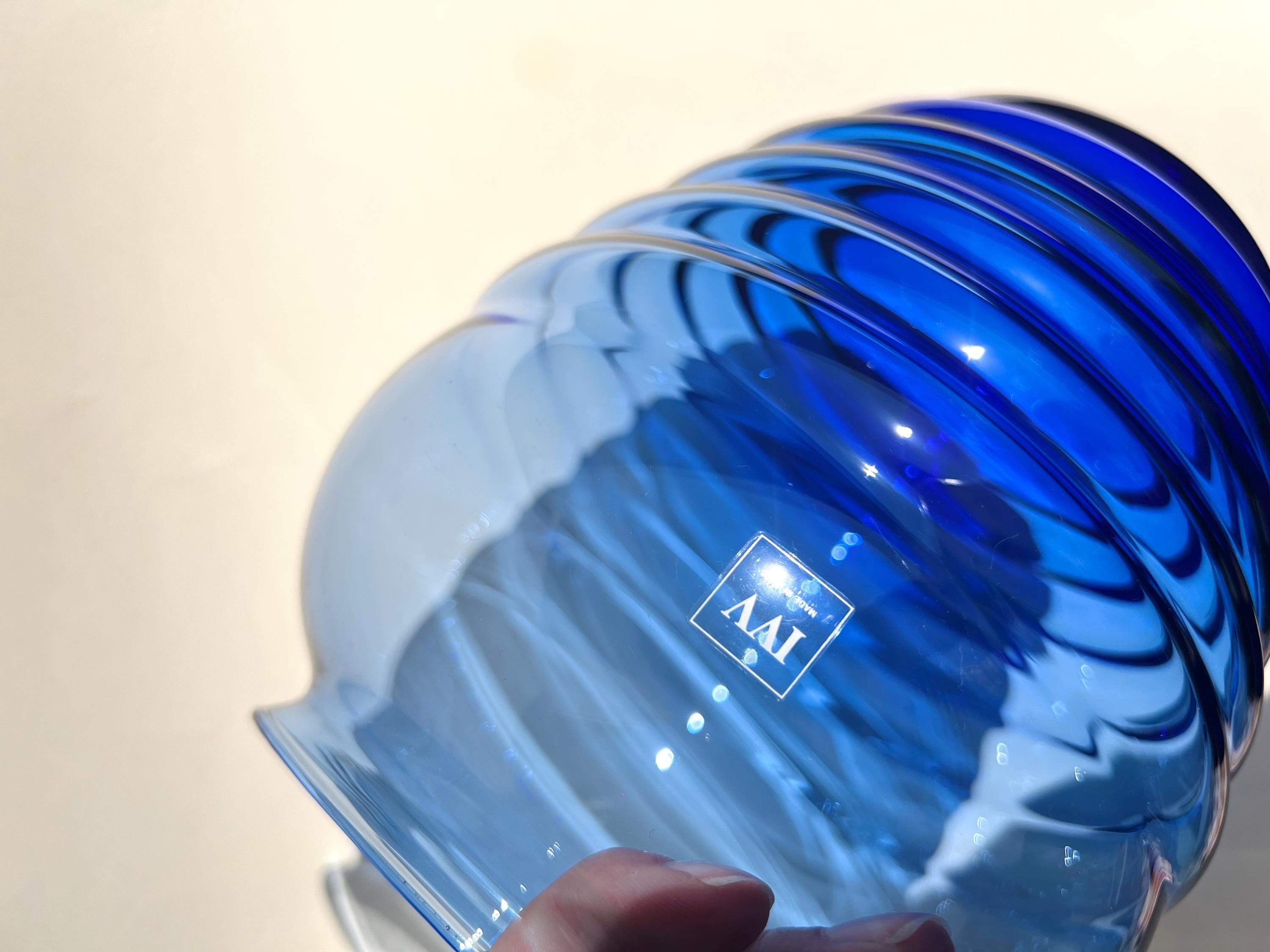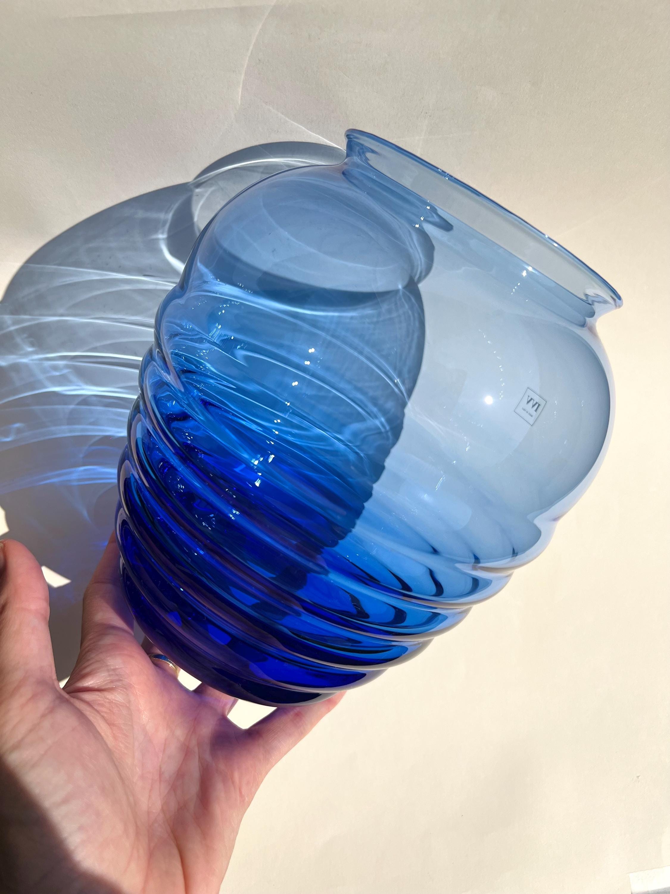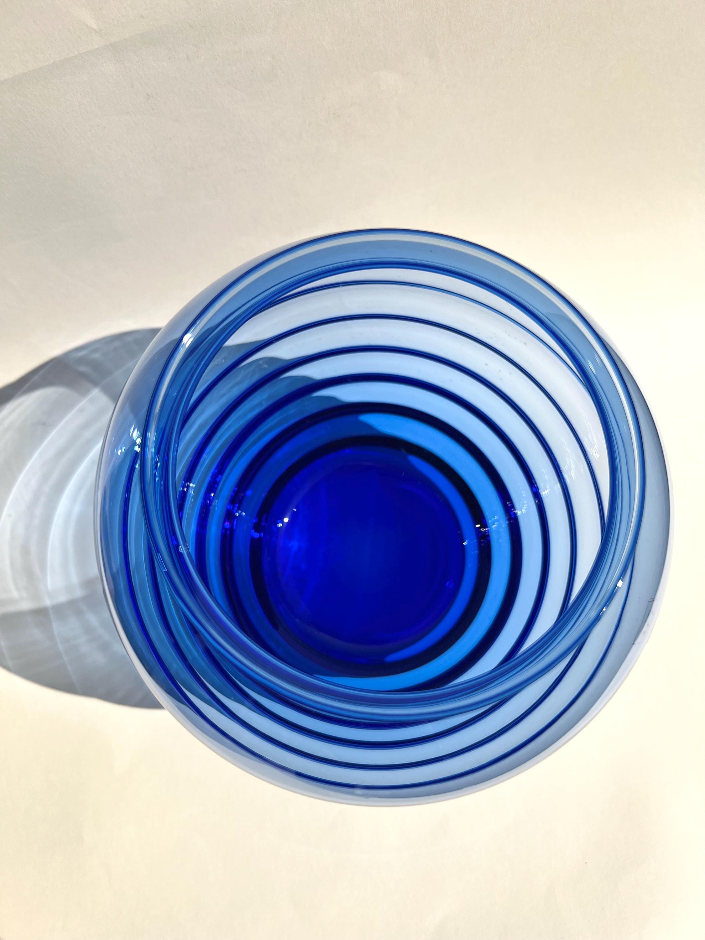 This Italian glass vase by IVV (Industria Vetraria Valdarnese) is a sculptural statement piece in a rich cobalt blue. Whether displayed on its own or holding a bouquet, it adds a bold and refined touch to any space. Labeled "IVV Made in Italy"