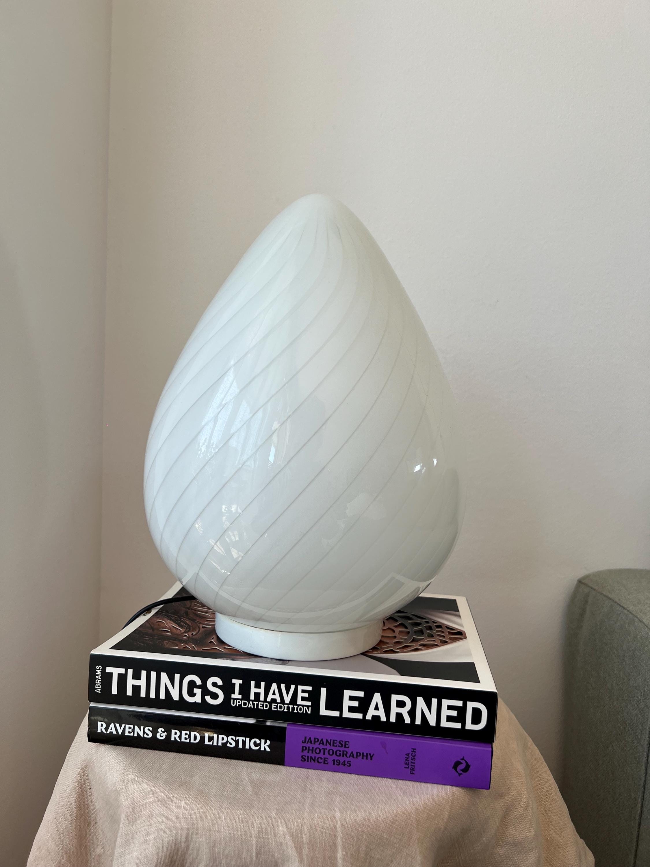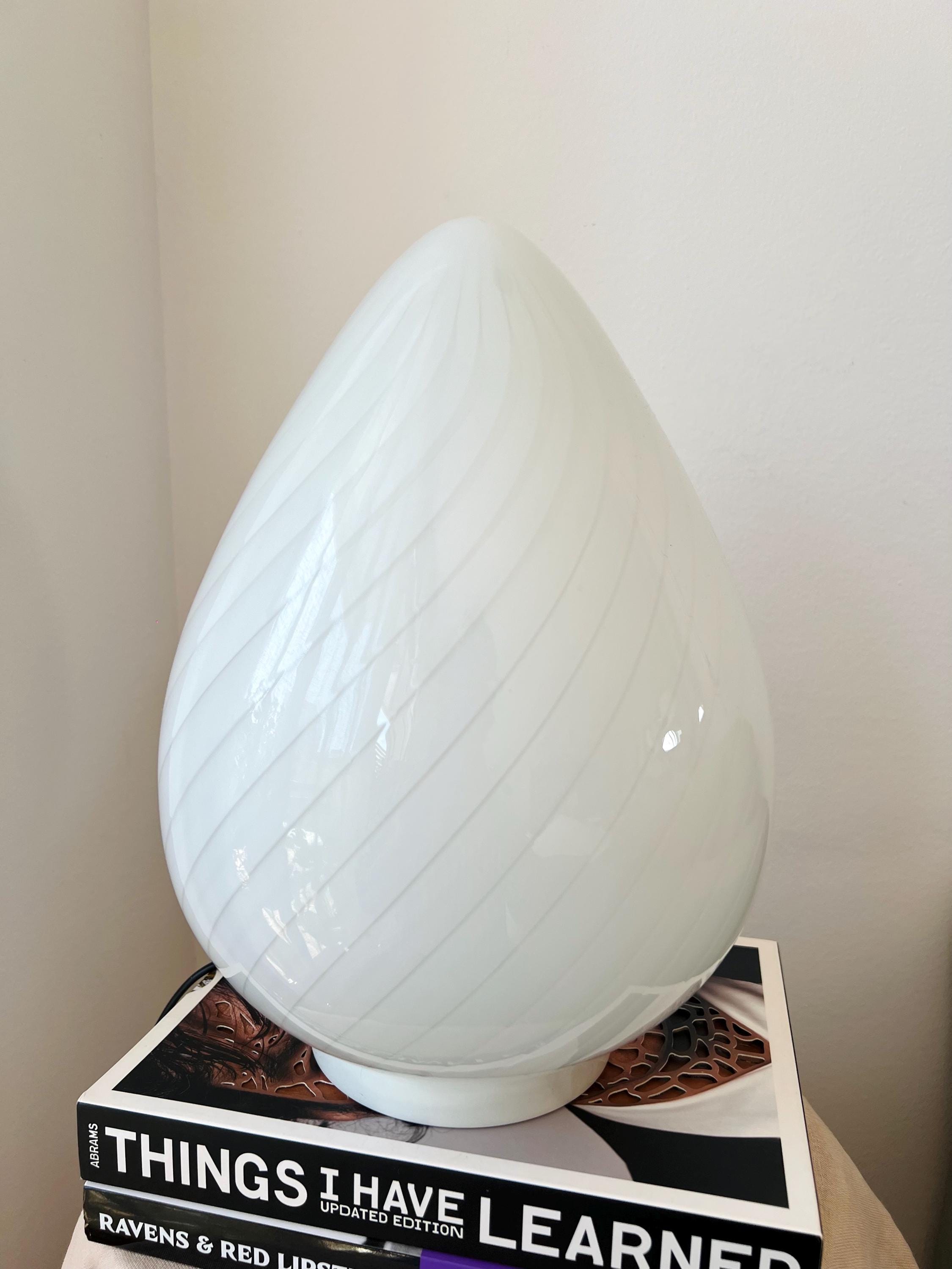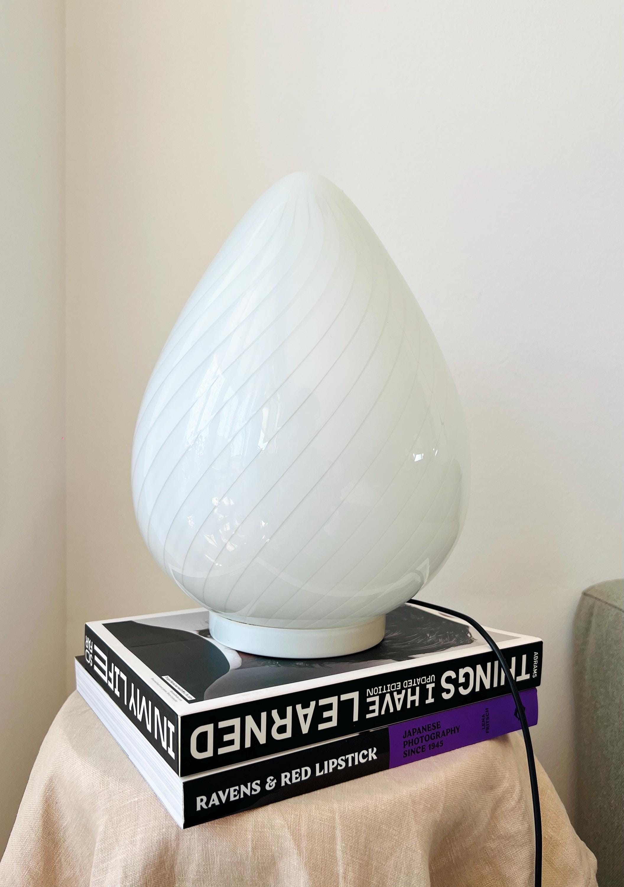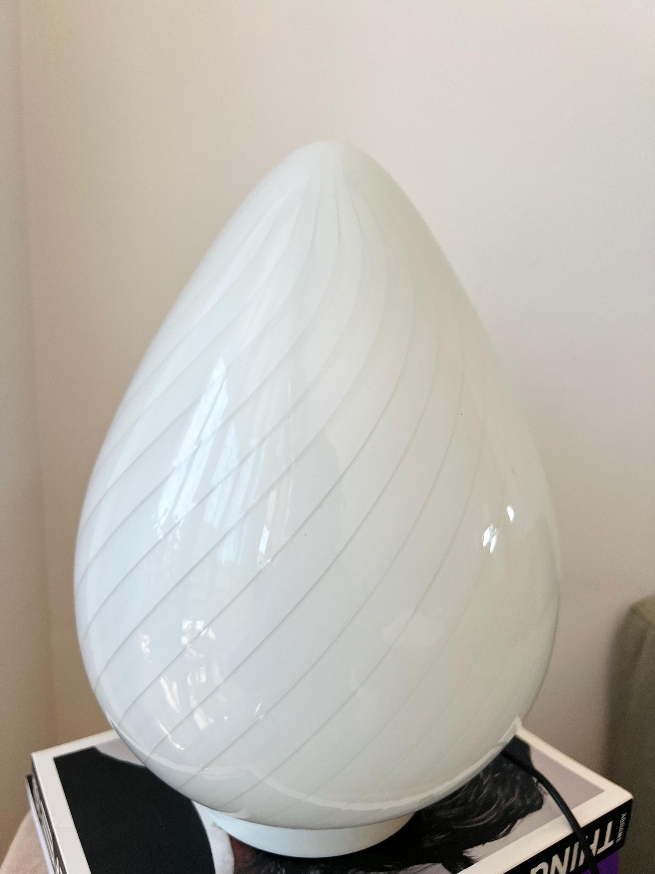 Made in Italy in the 1980s, this vintage Murano glass lamp features a teardrop silhouette and white swirl pattern. Perfect for cozy corners, nightstands, or adding character to your favorite shelf.