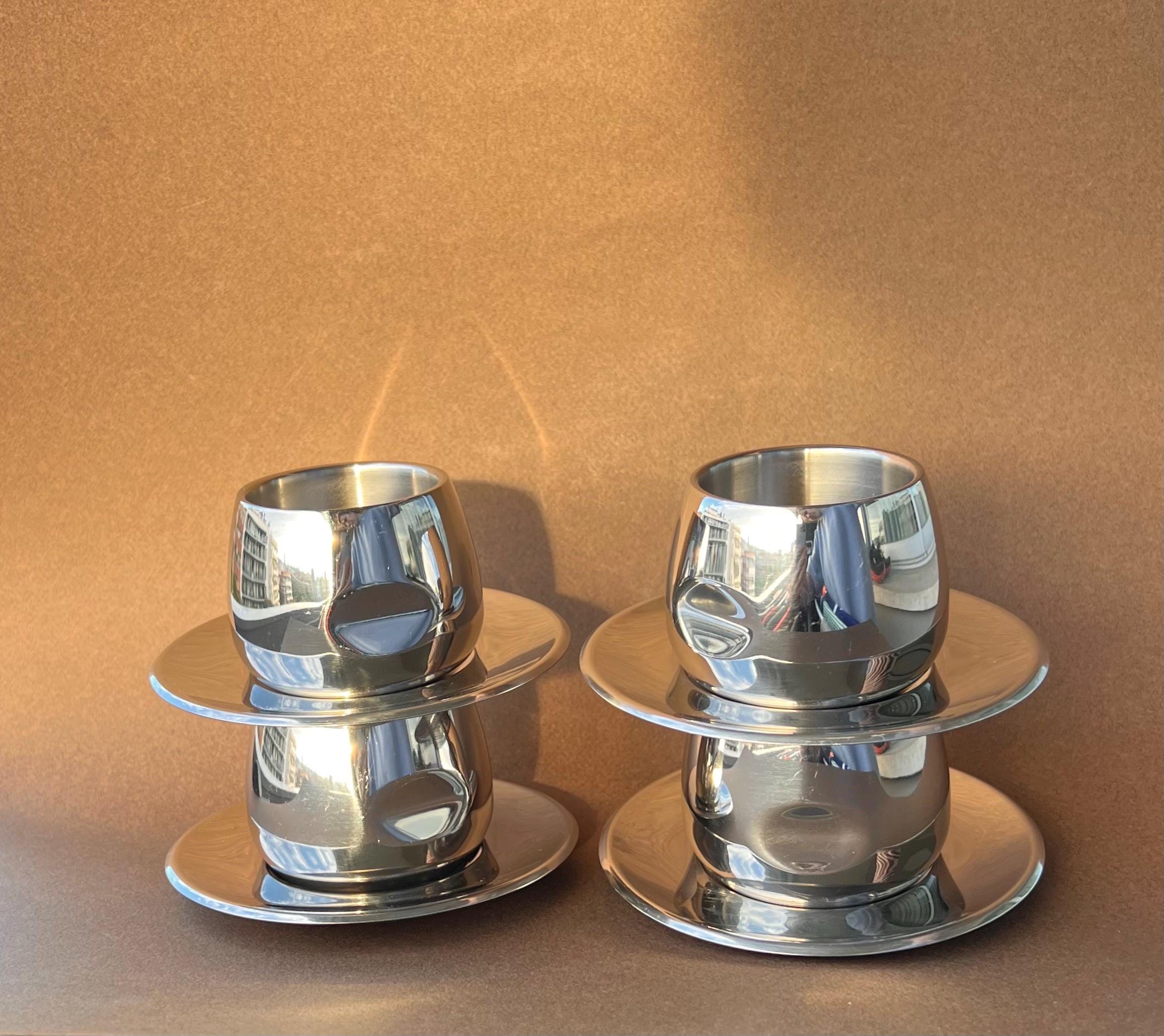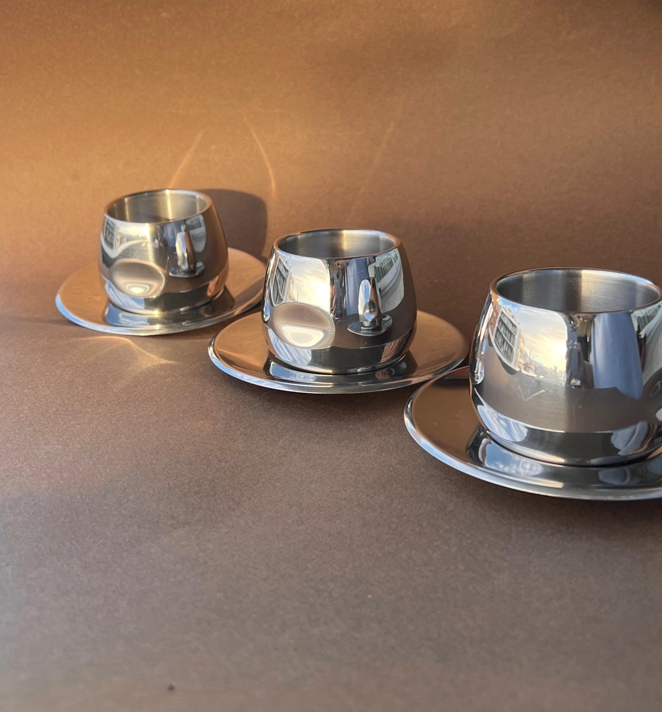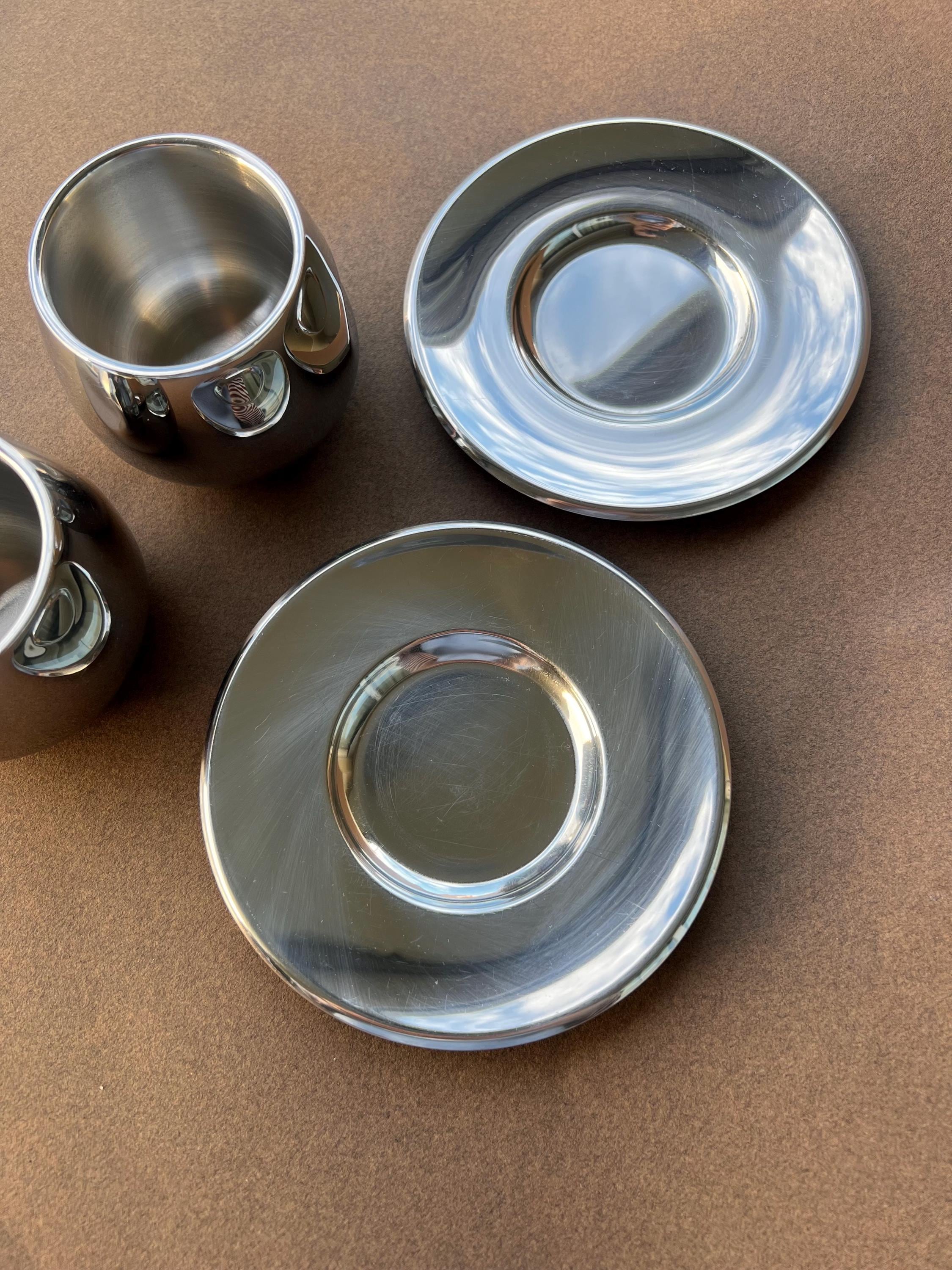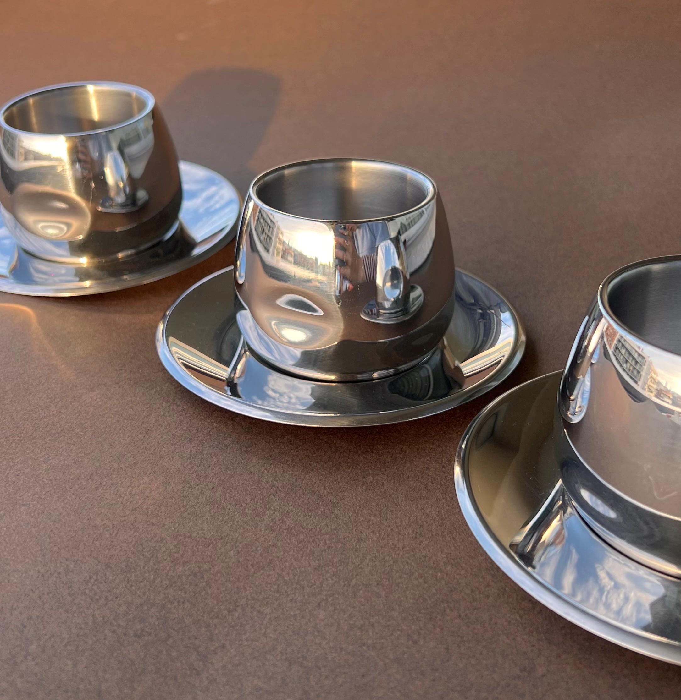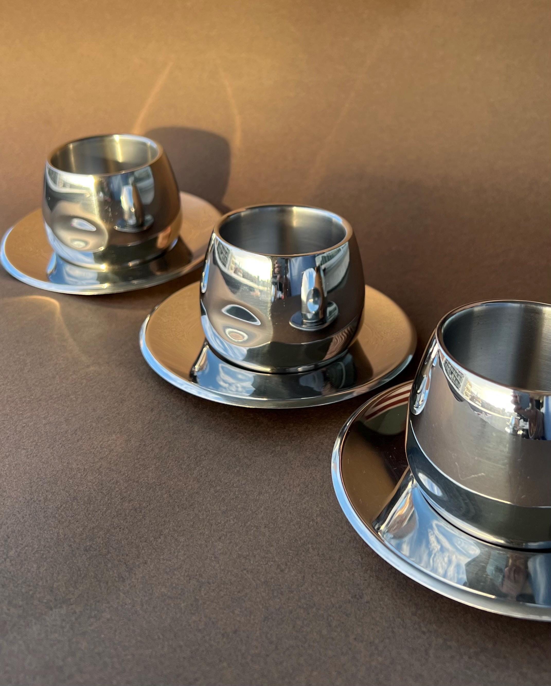 This sleek, minimalist set includes espresso cups with matching saucers, crafted in high-quality stainless steel for a timeless, modernist aesthetic.