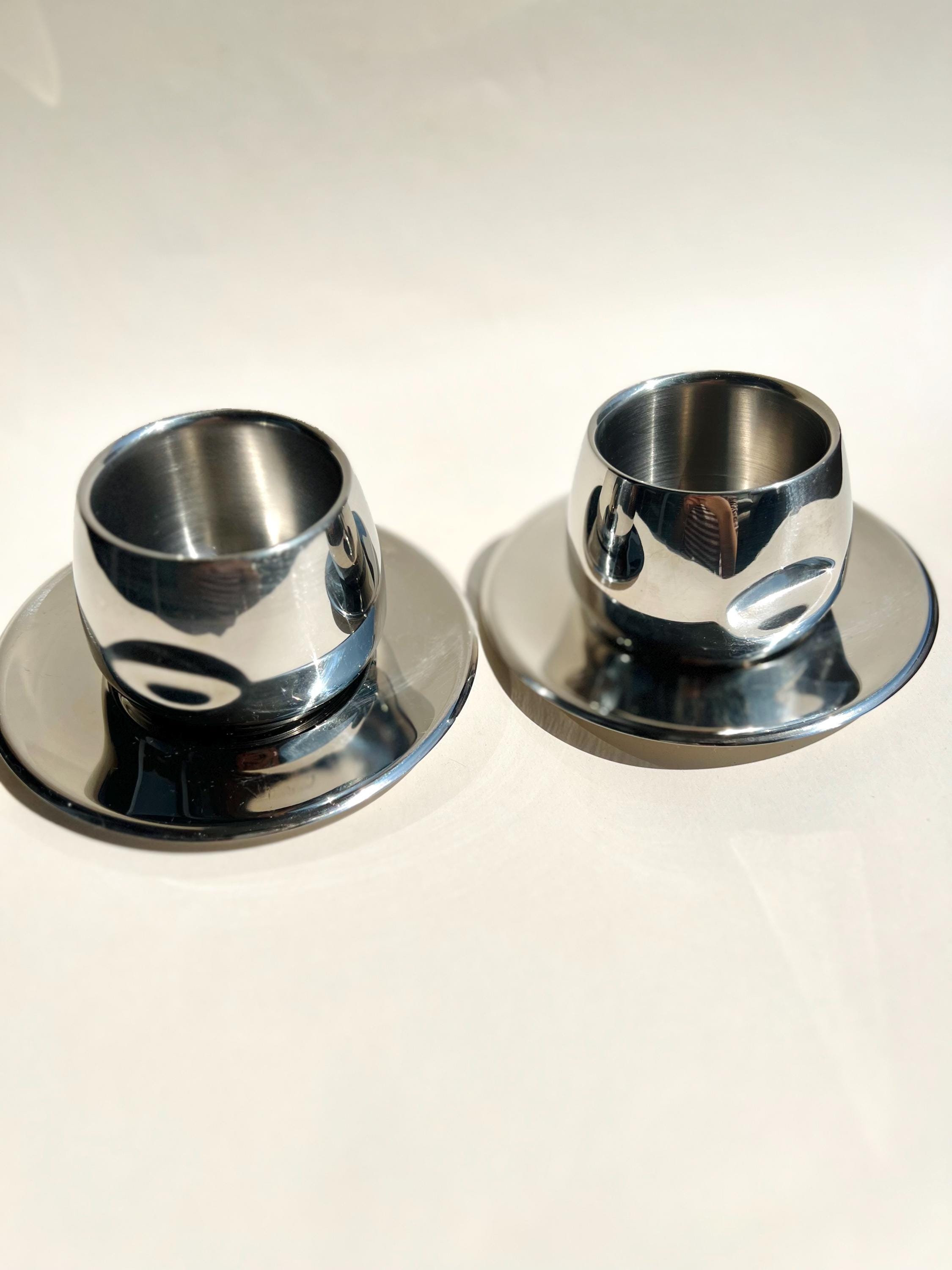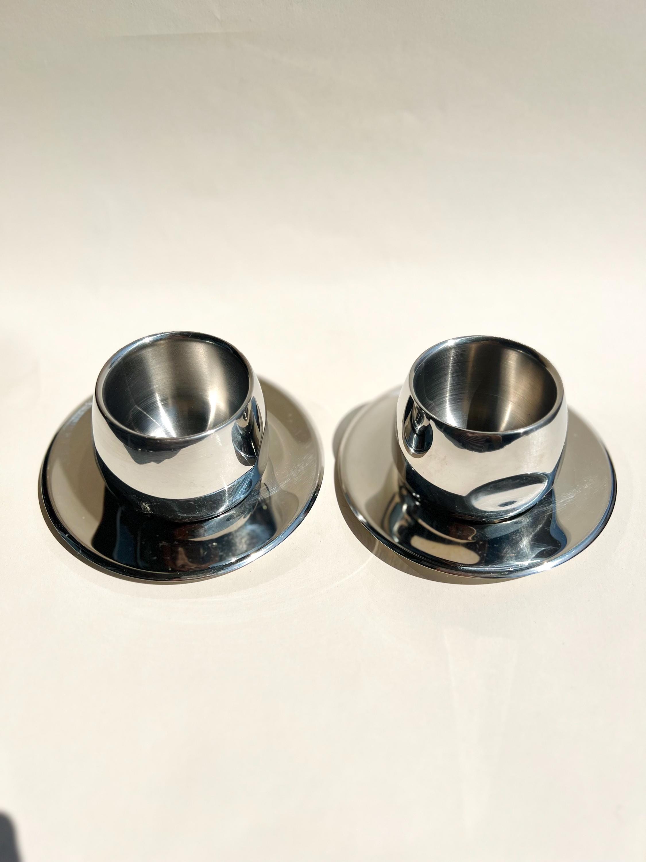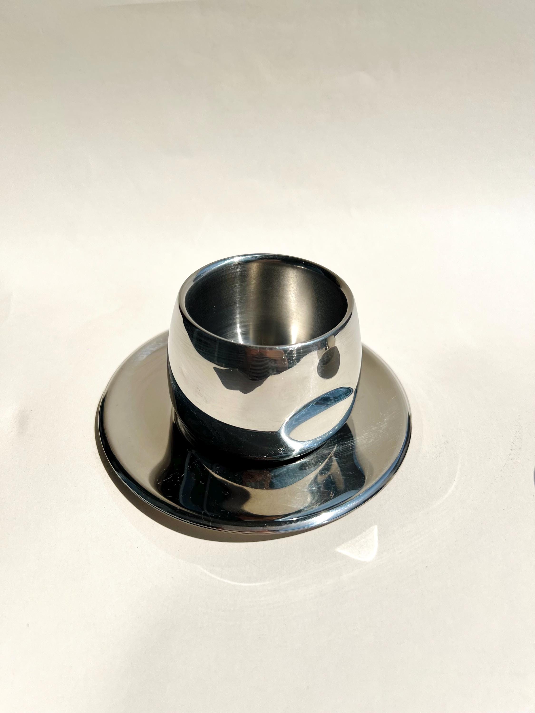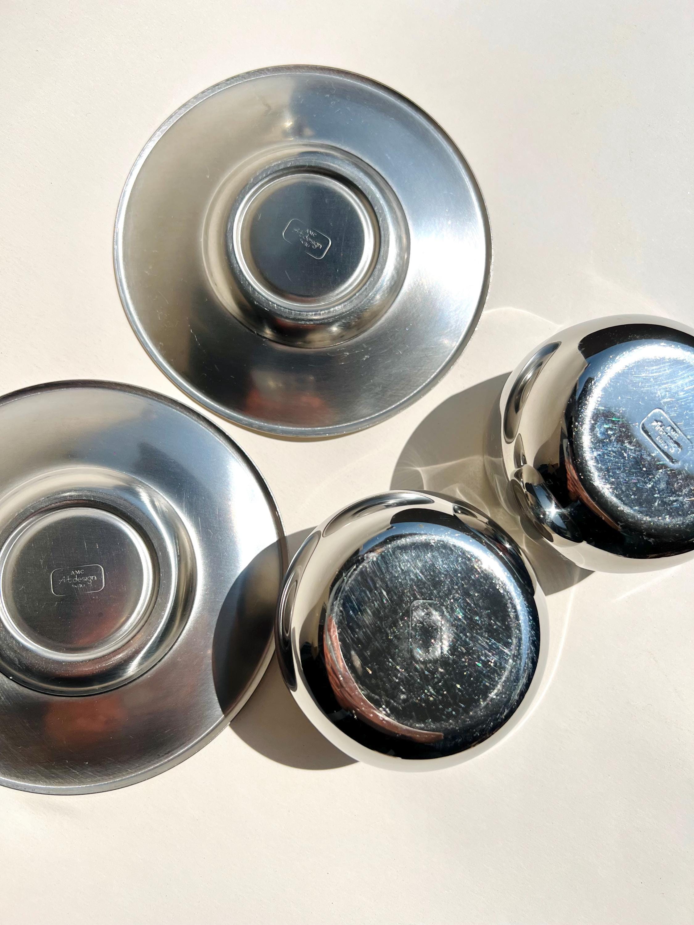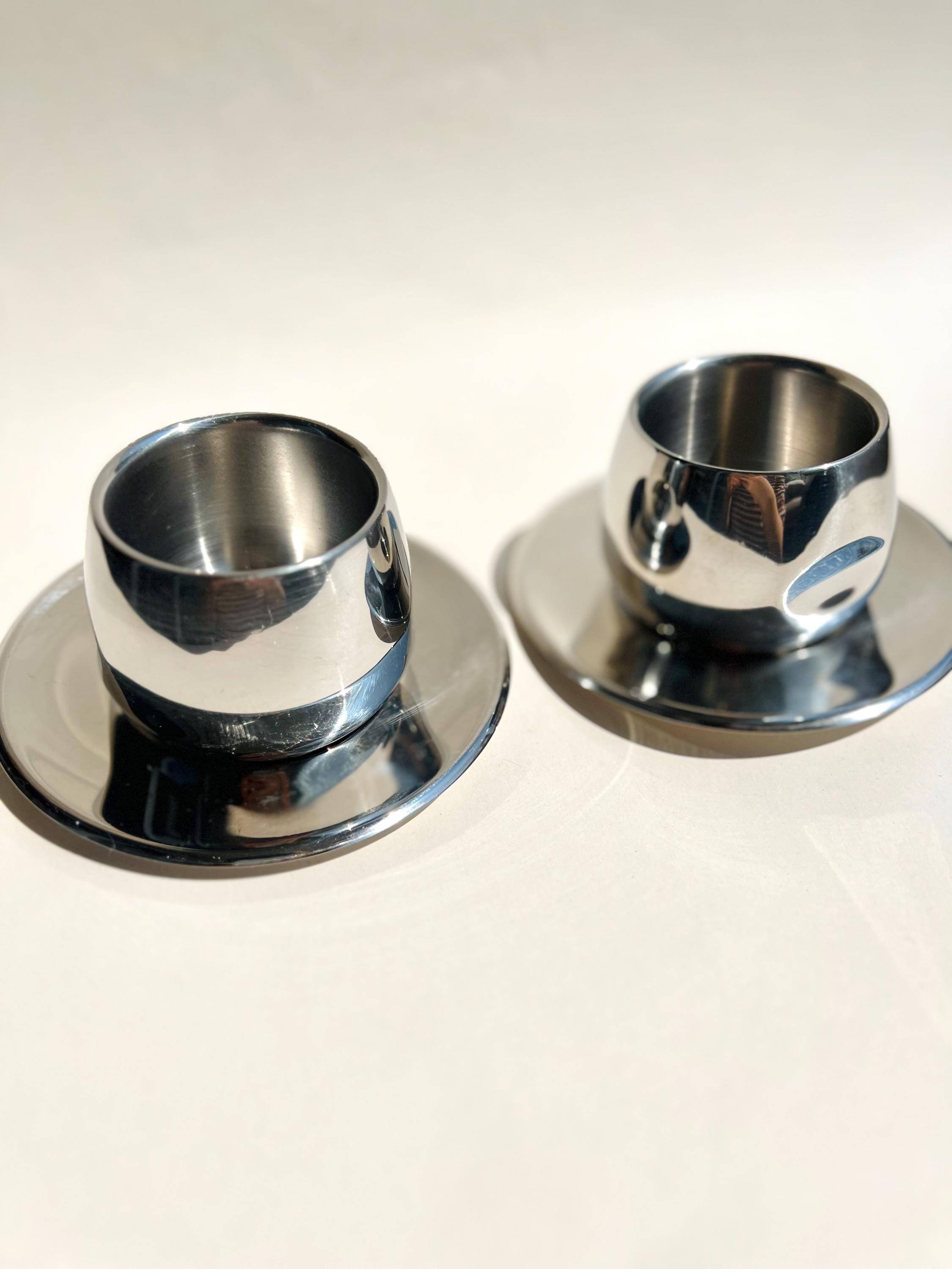 This sleek, minimalist set includes espresso cups with matching saucers, crafted in high-quality stainless steel for a timeless, modernist aesthetic.