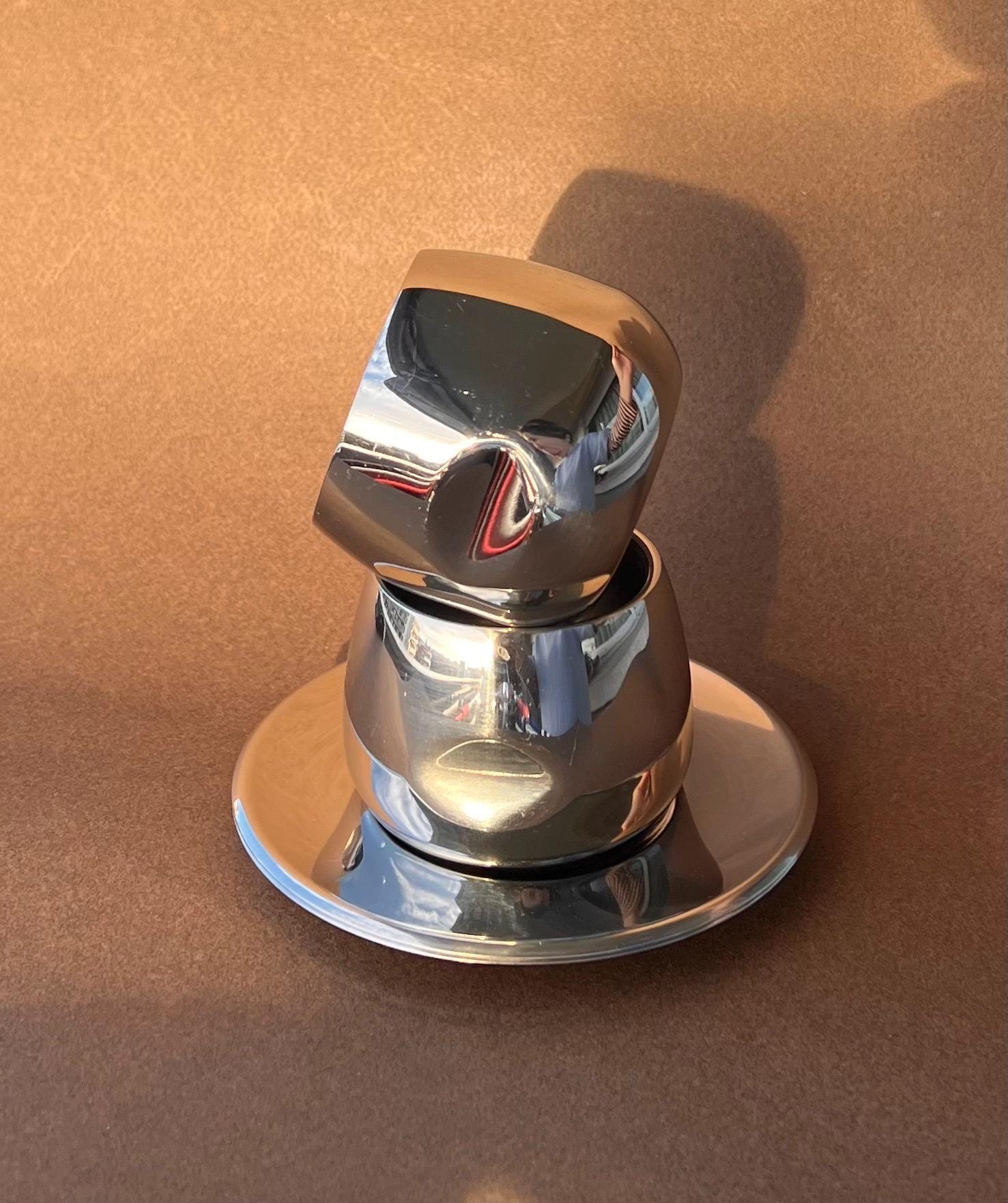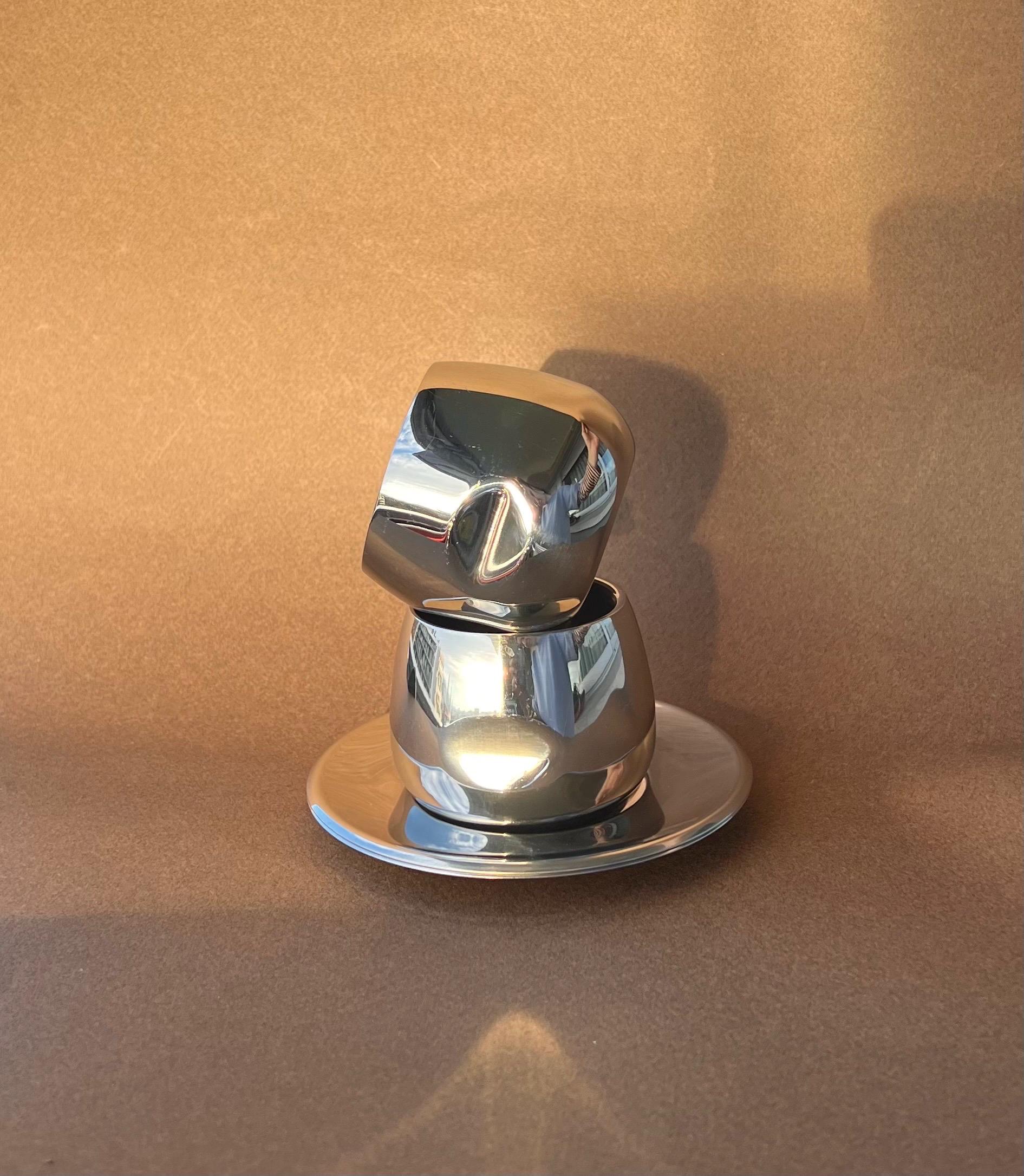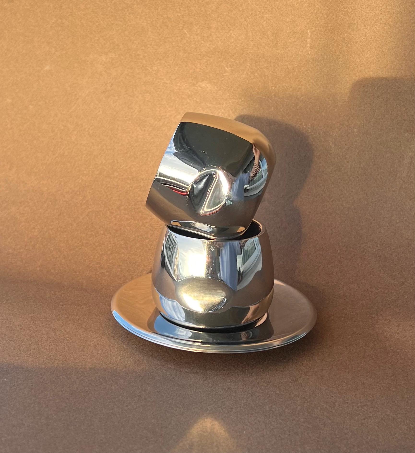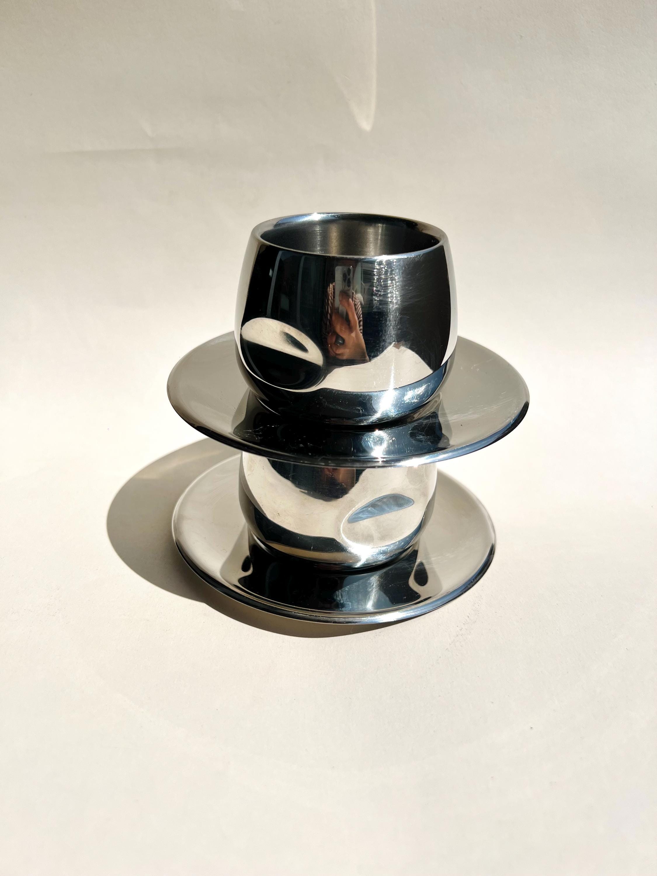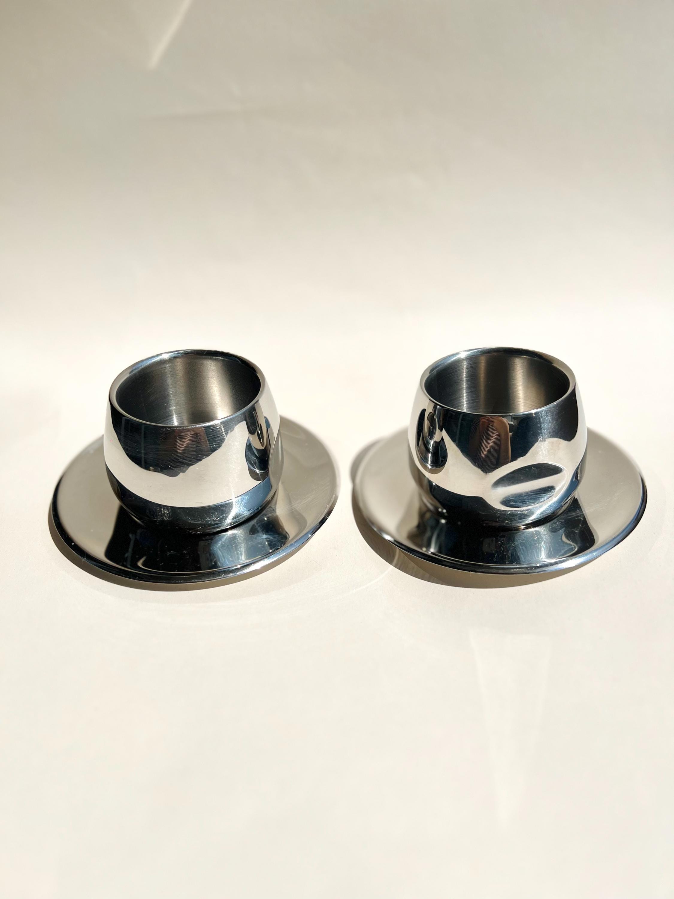 This sleek, minimalist set includes espresso cups with matching saucers, crafted in high-quality stainless steel for a timeless, modernist aesthetic.