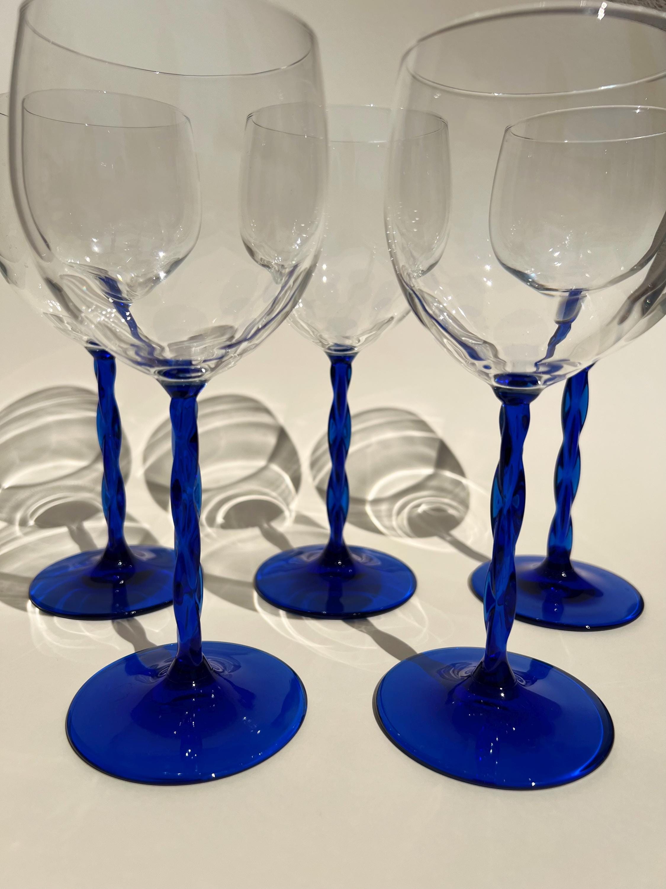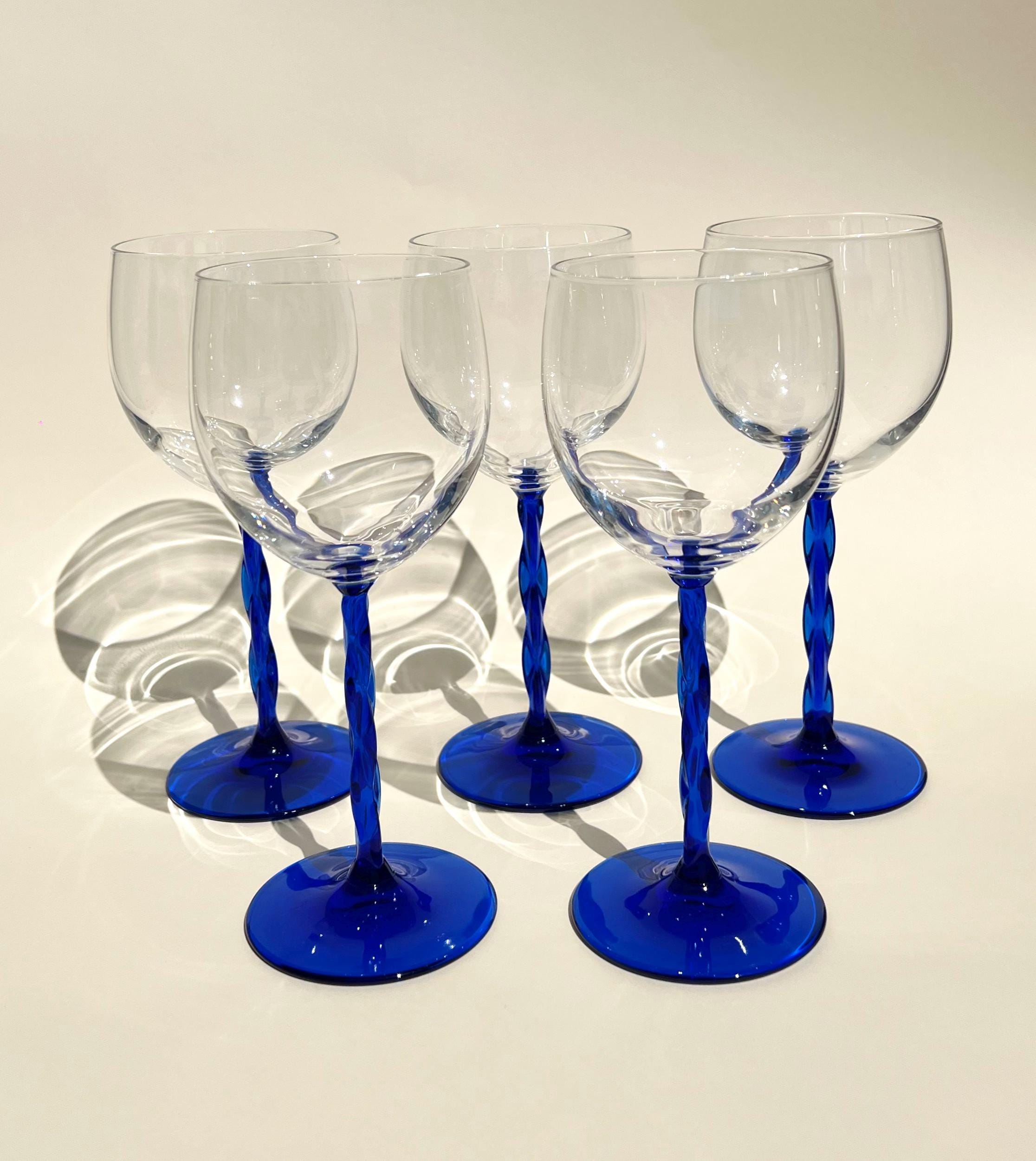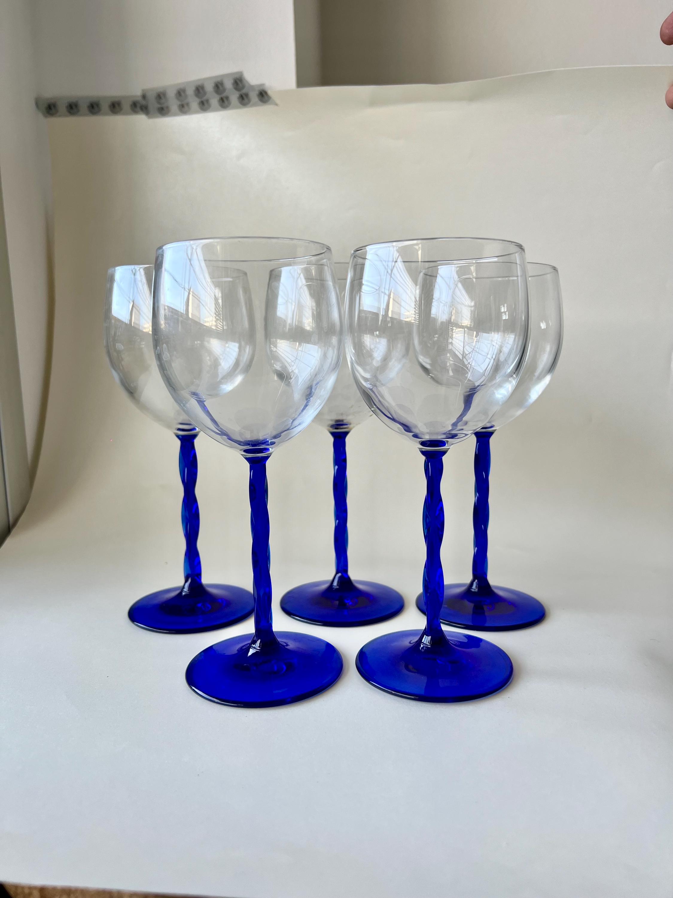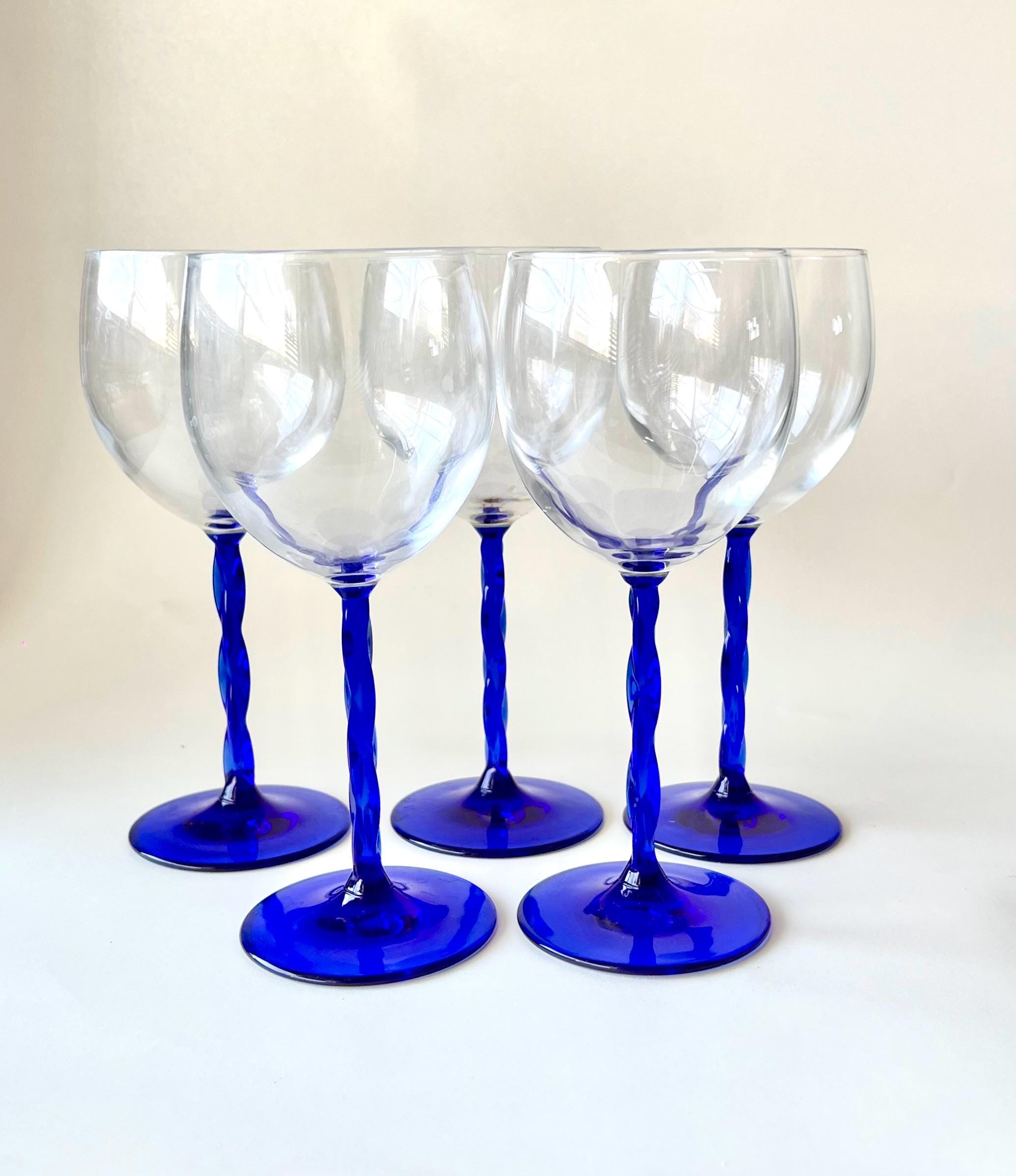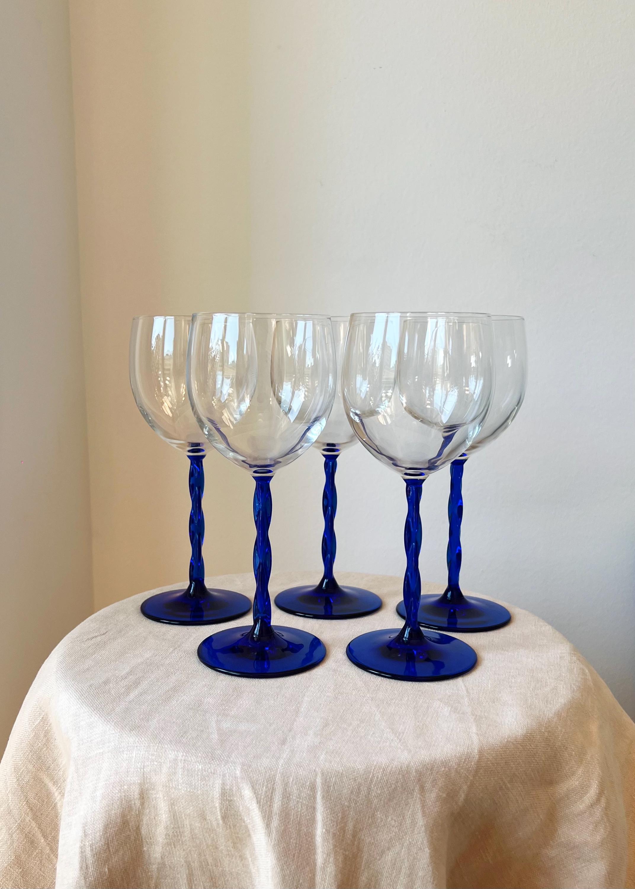 This set of five vintage wine glasses, crafted in Italy during the 1980sβ1990s features a twisted blue stem.