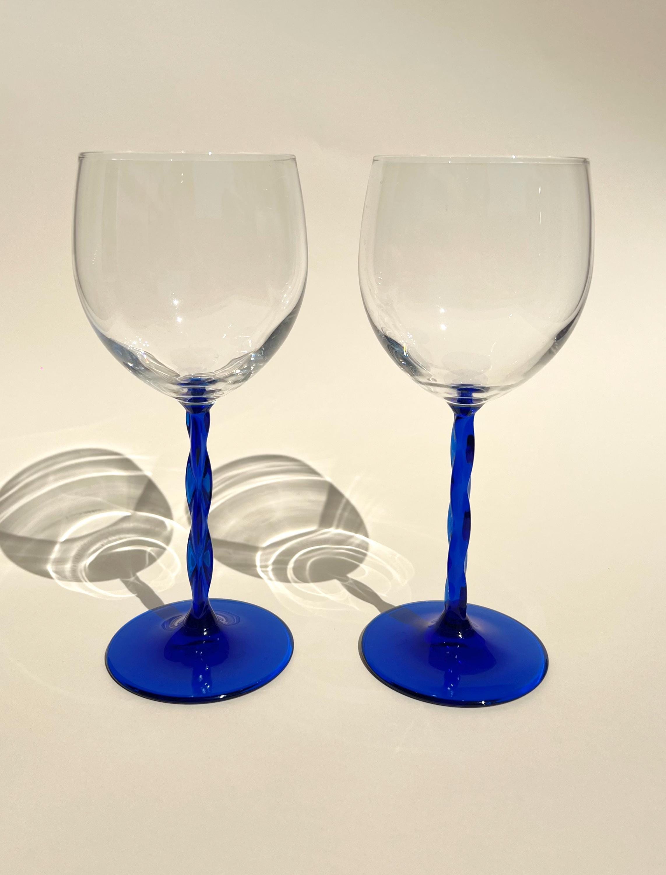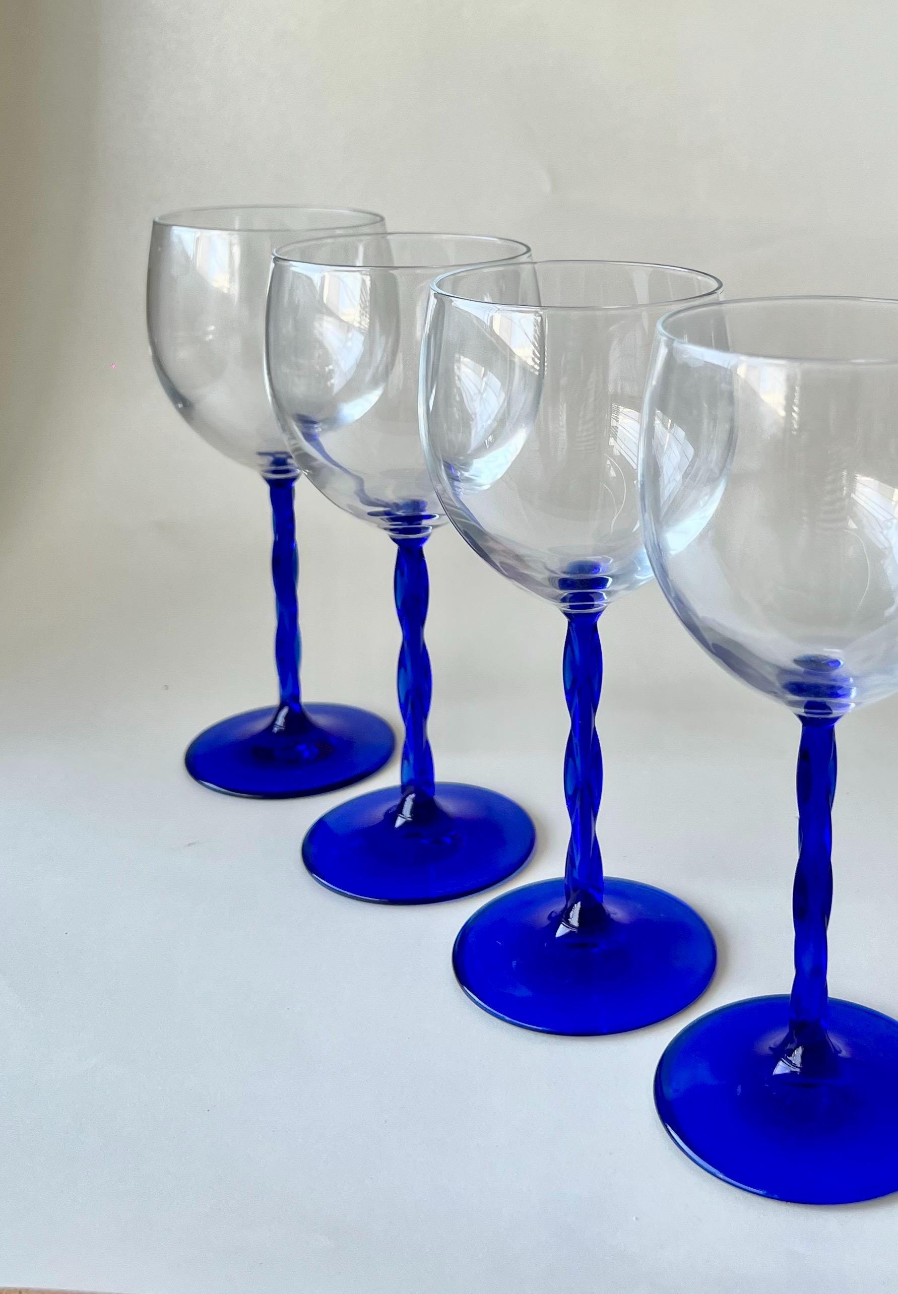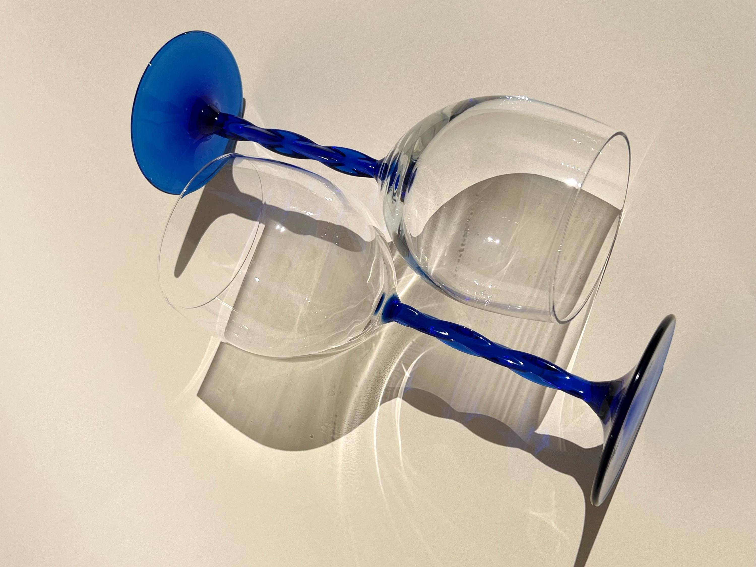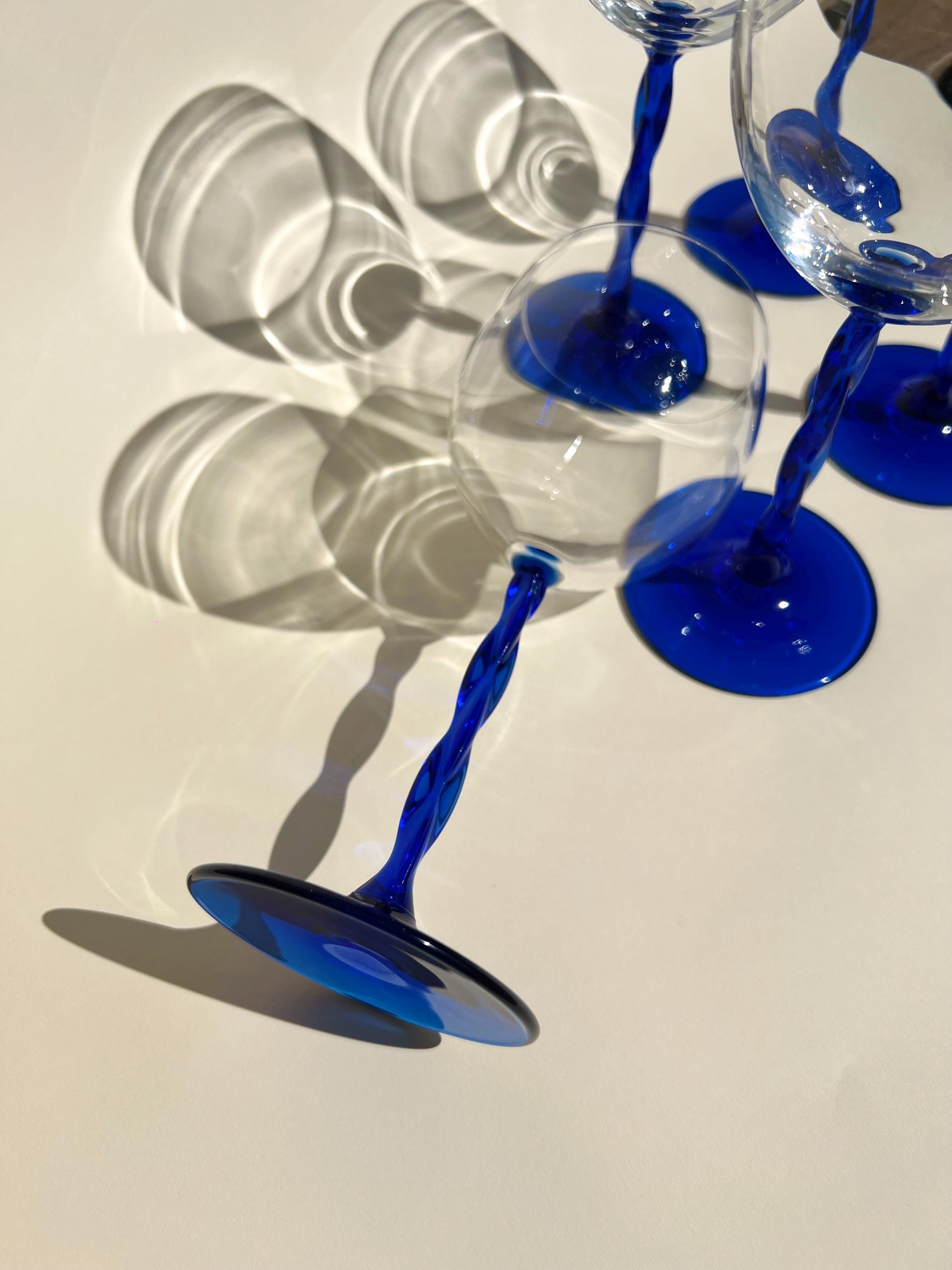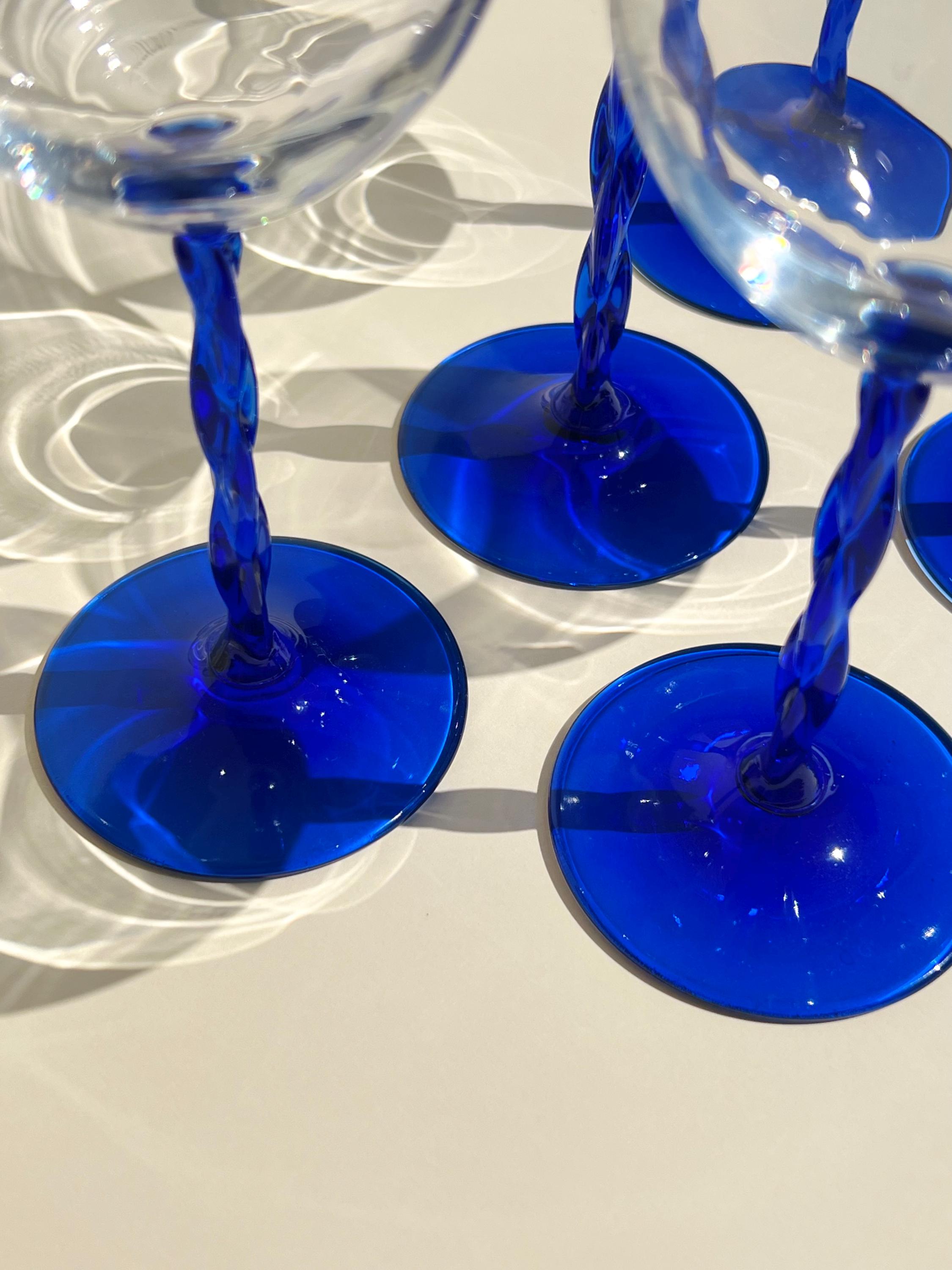 This set of five vintage wine glasses, crafted in Italy during the 1980sβ1990s features a twisted blue stem.