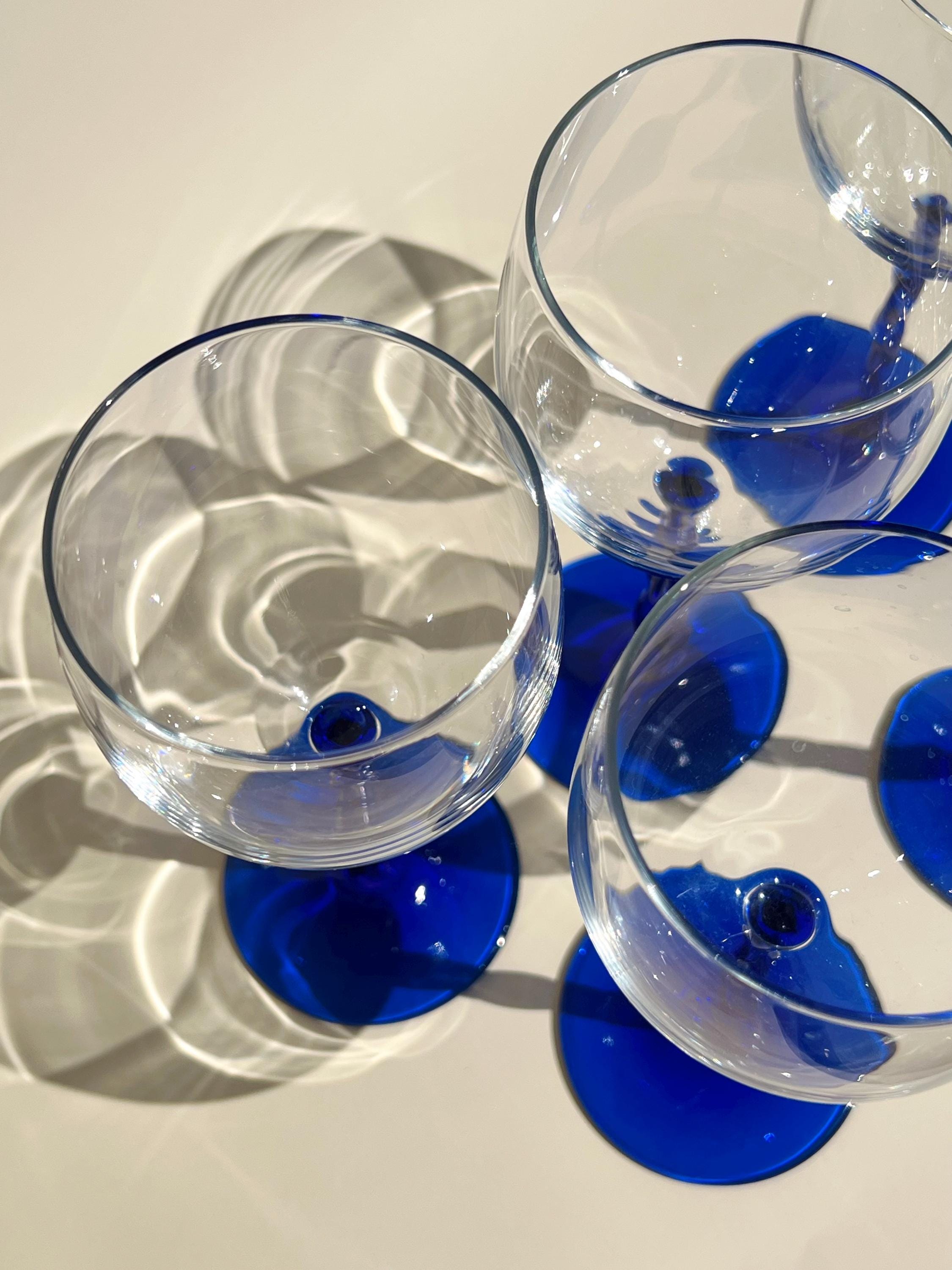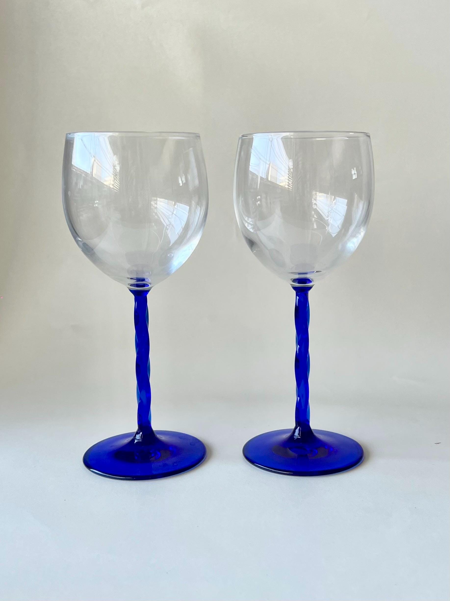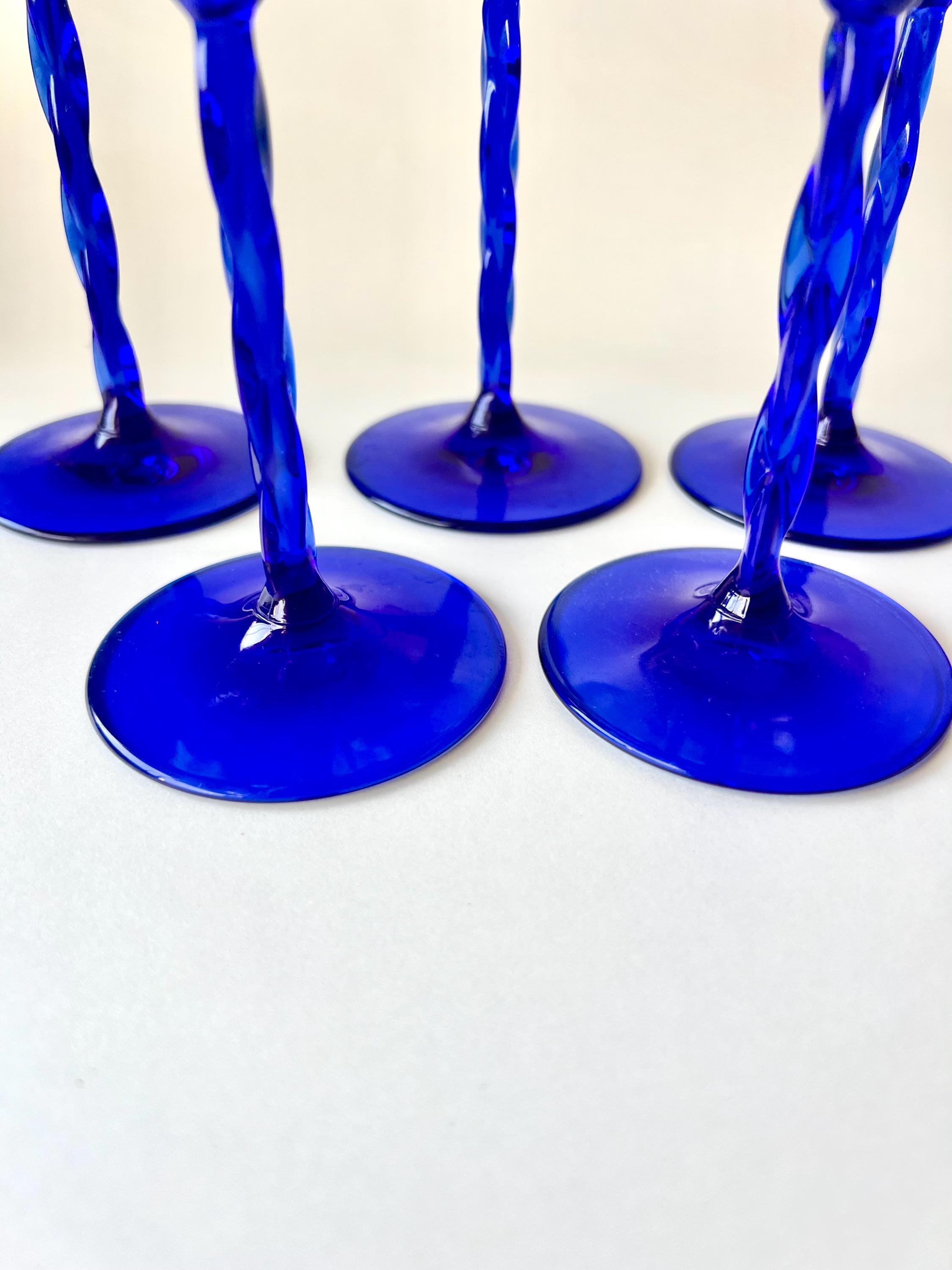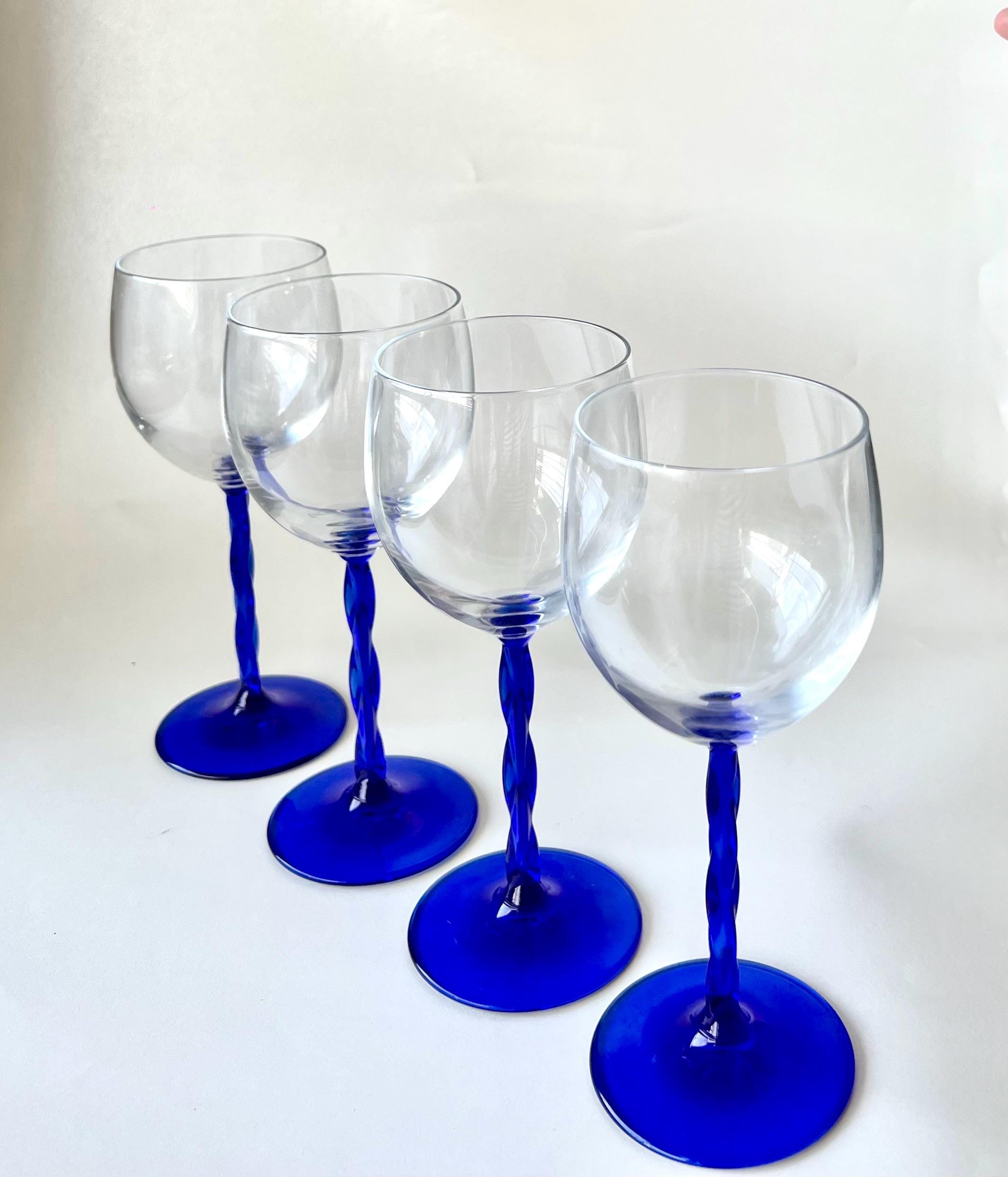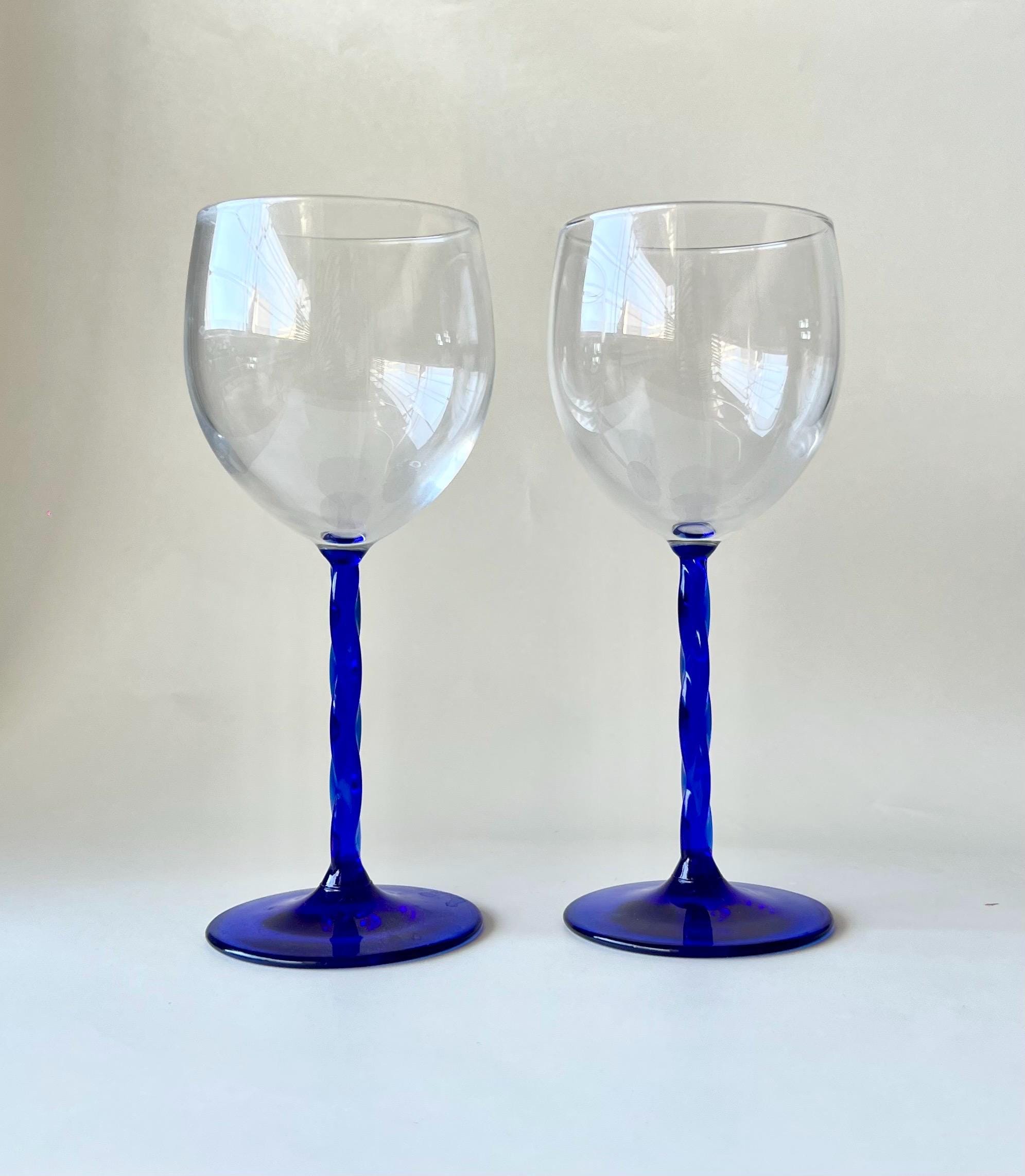 This set of five vintage wine glasses, crafted in Italy during the 1980sβ1990s features a twisted blue stem.