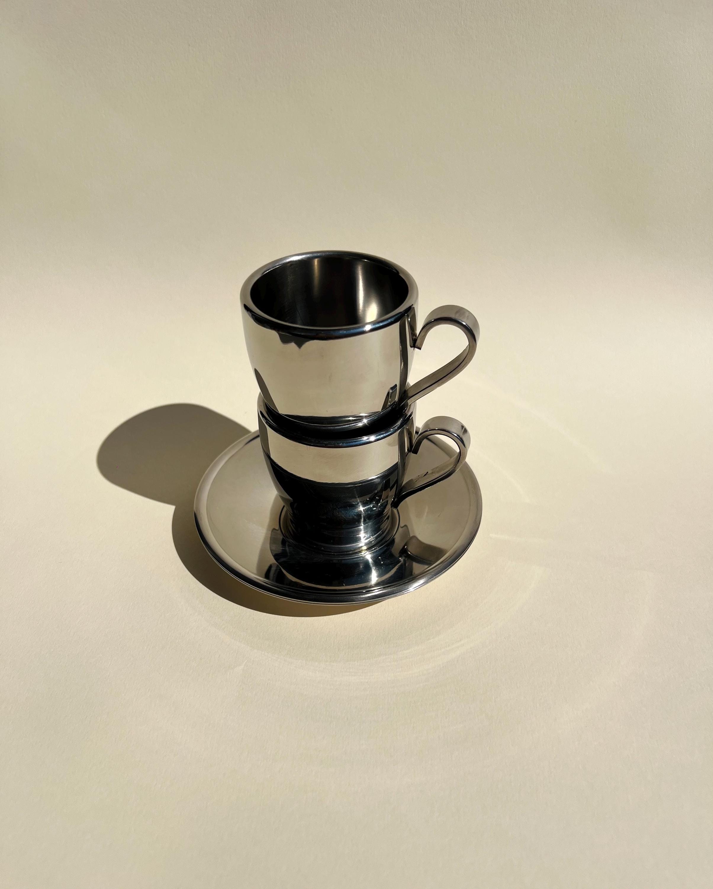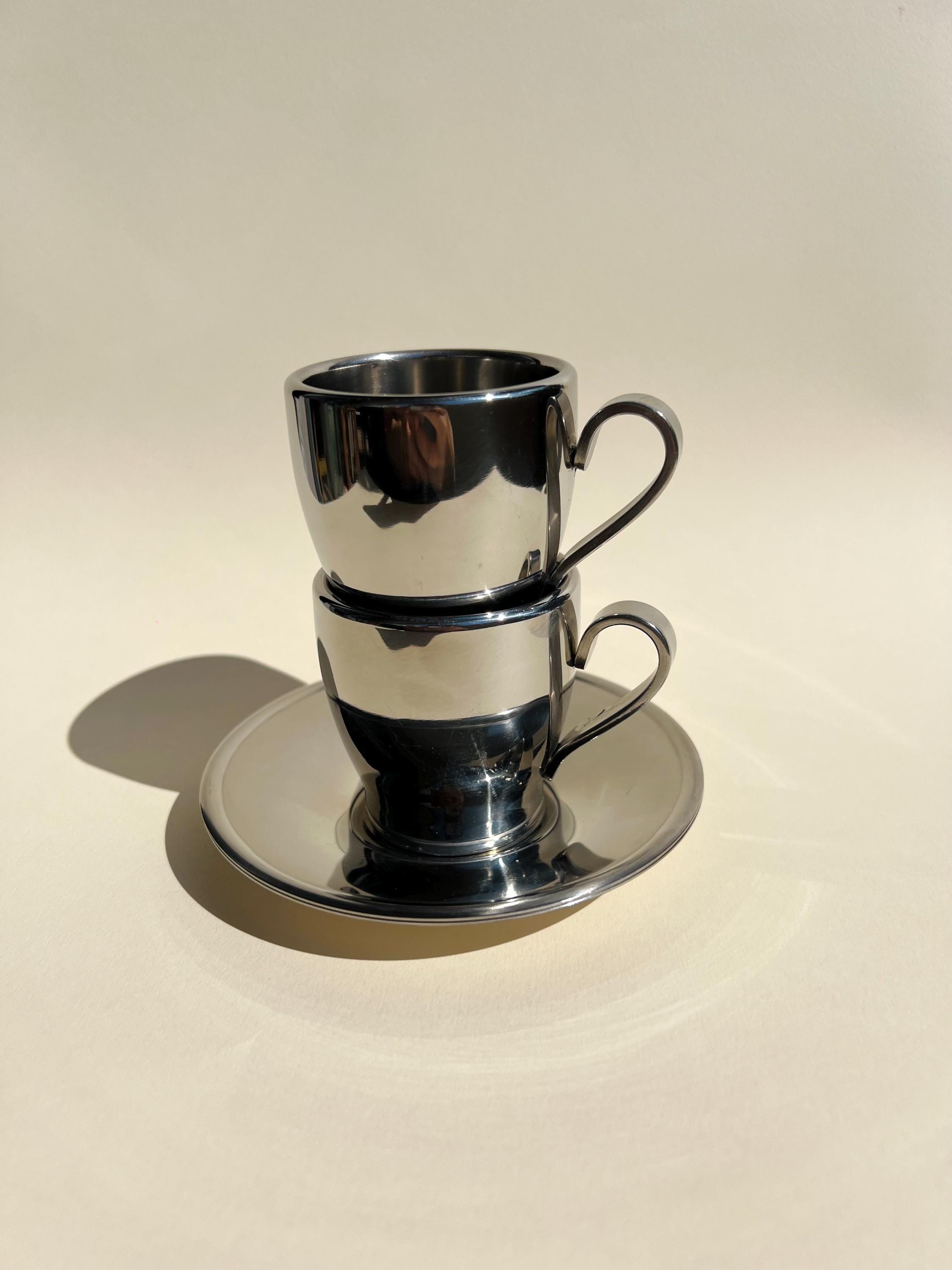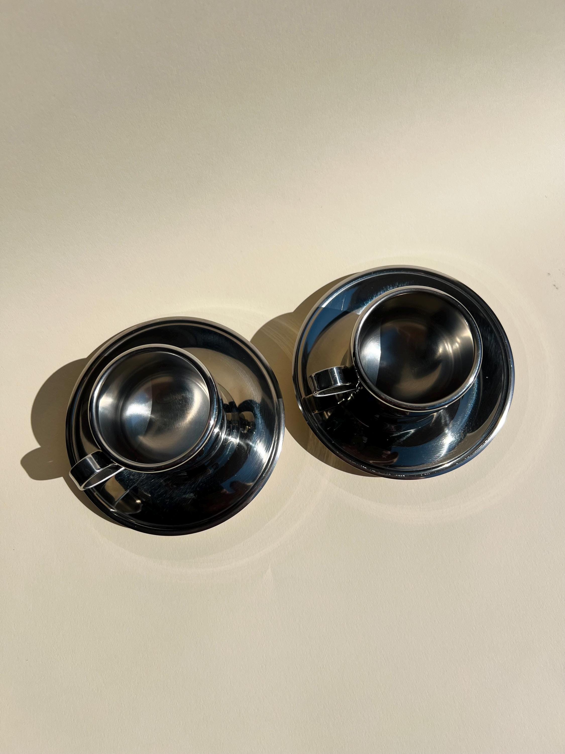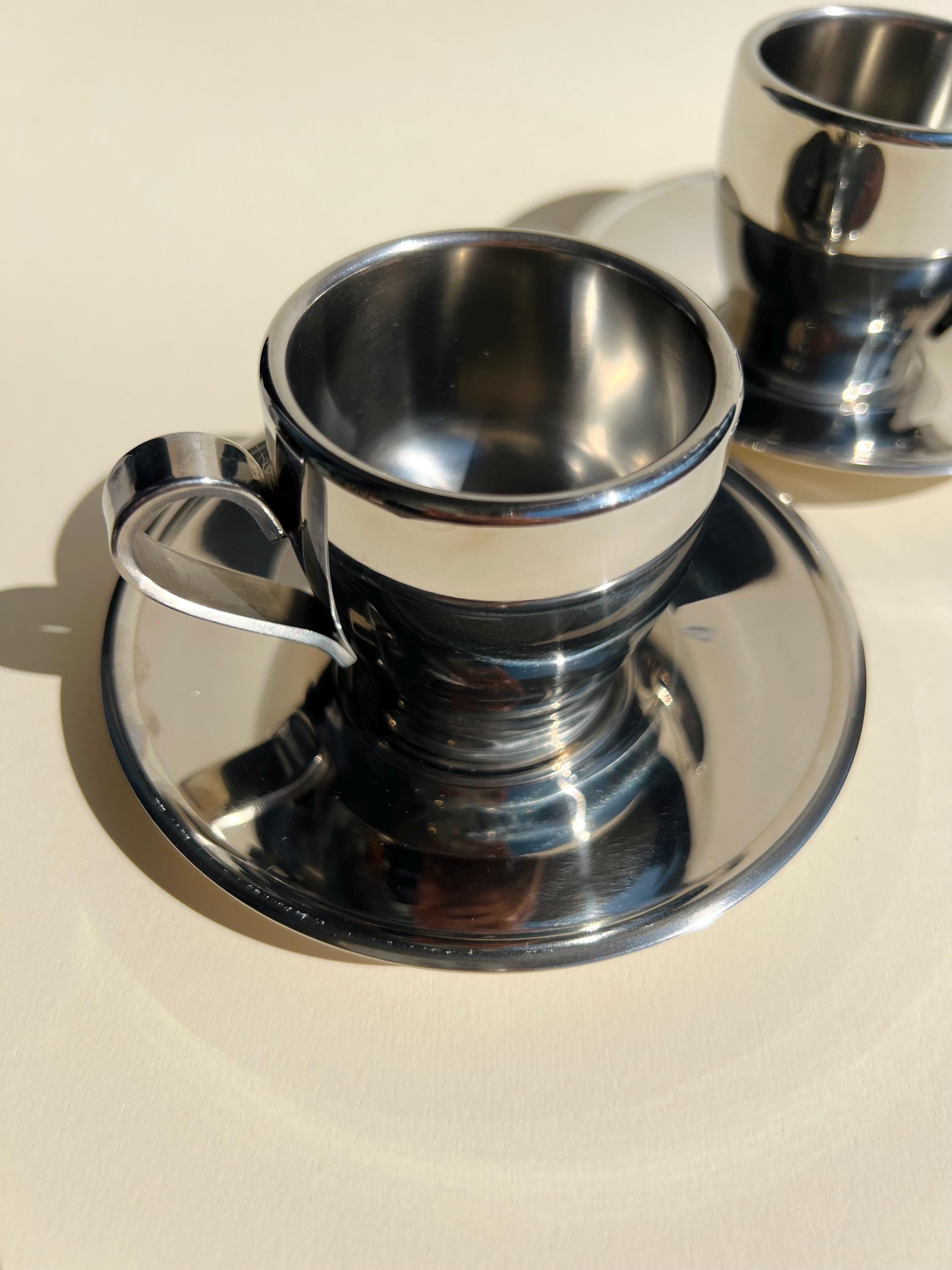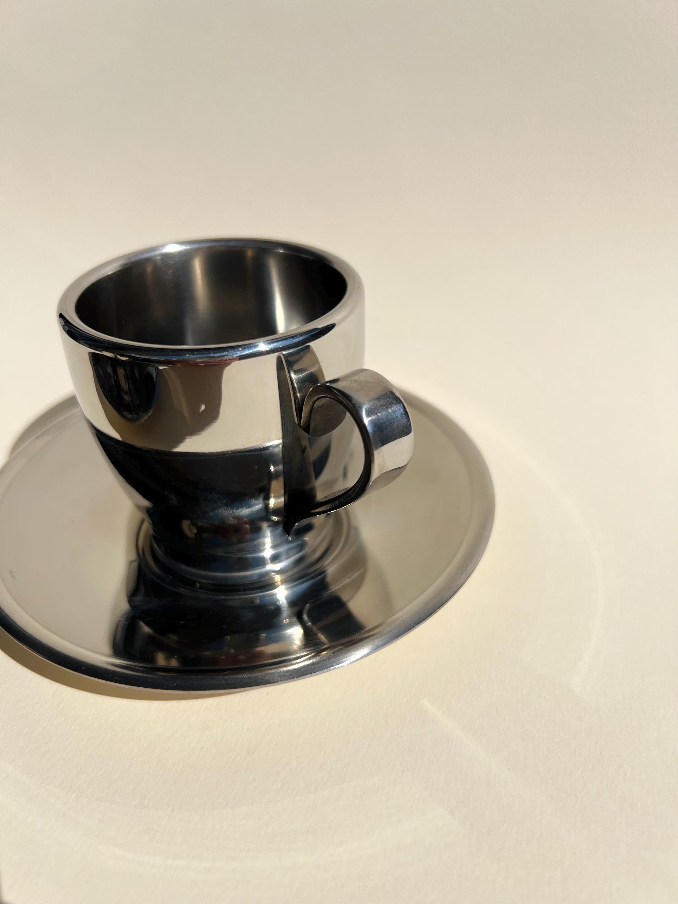 Espresso cups with matching saucers, crafted in high-quality stainless steel for a timeless, modernist aesthetic. These beautiful and minimalistic cups feature a double-walled design, so you’ll be able to enjoy your coffee warm for longer.