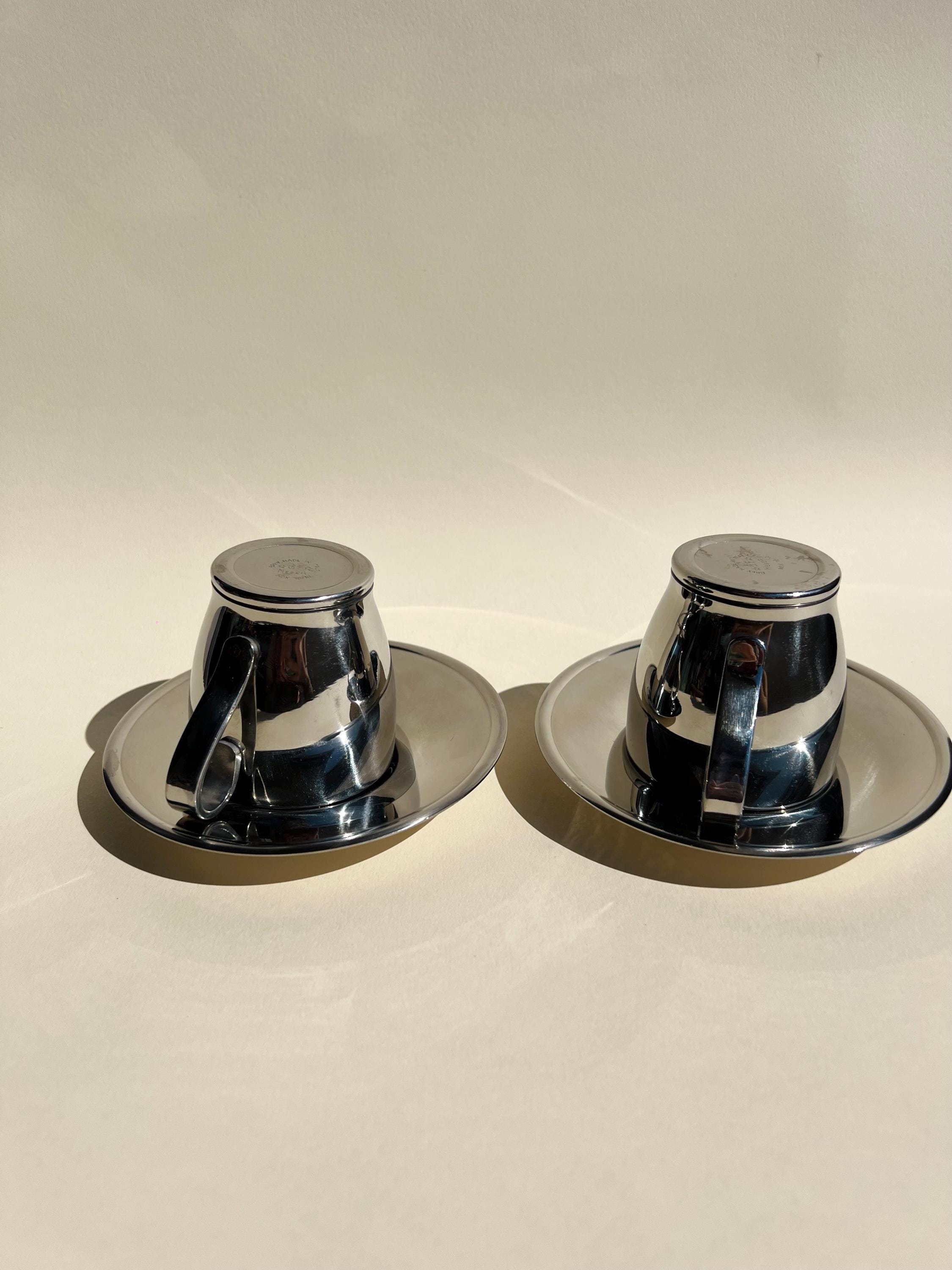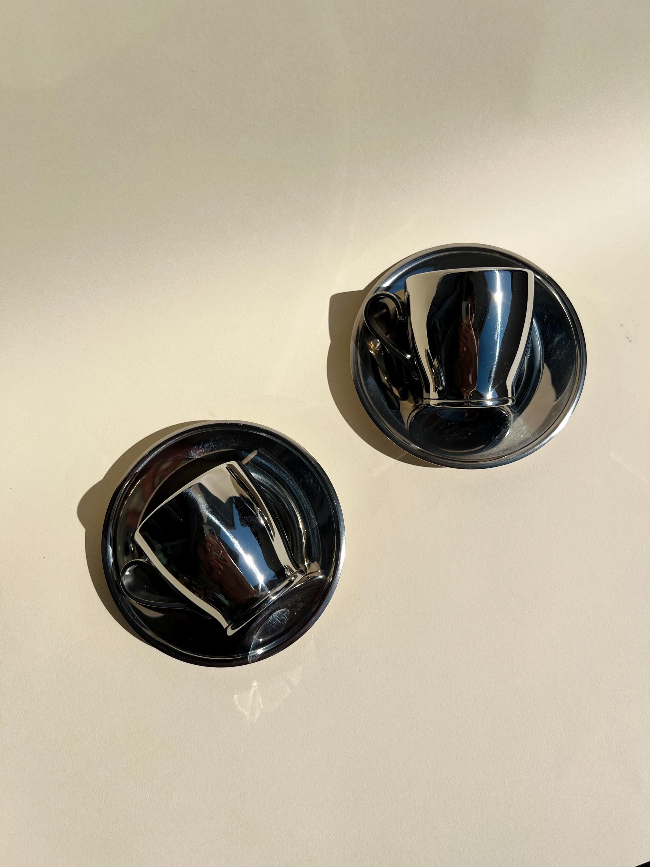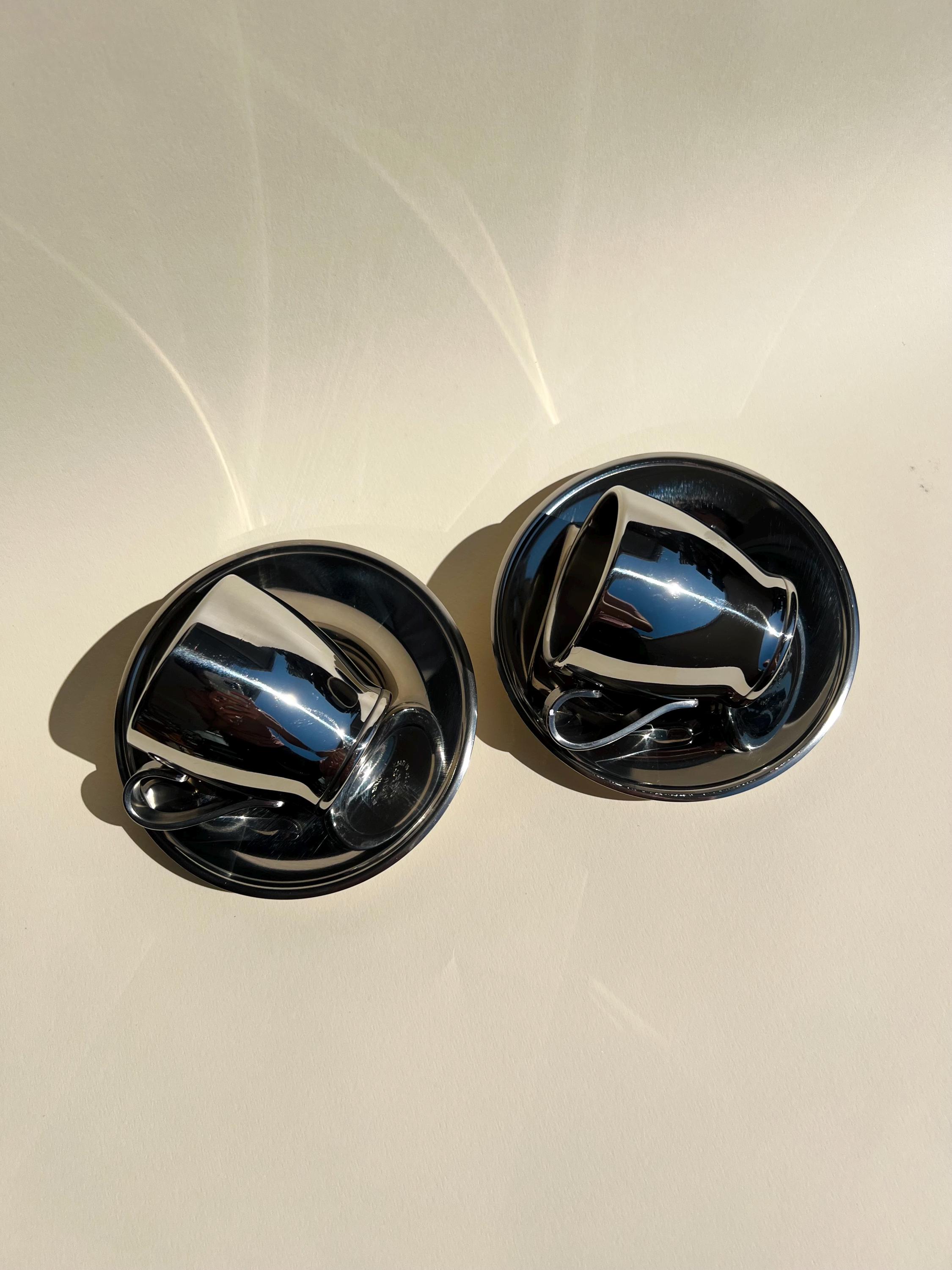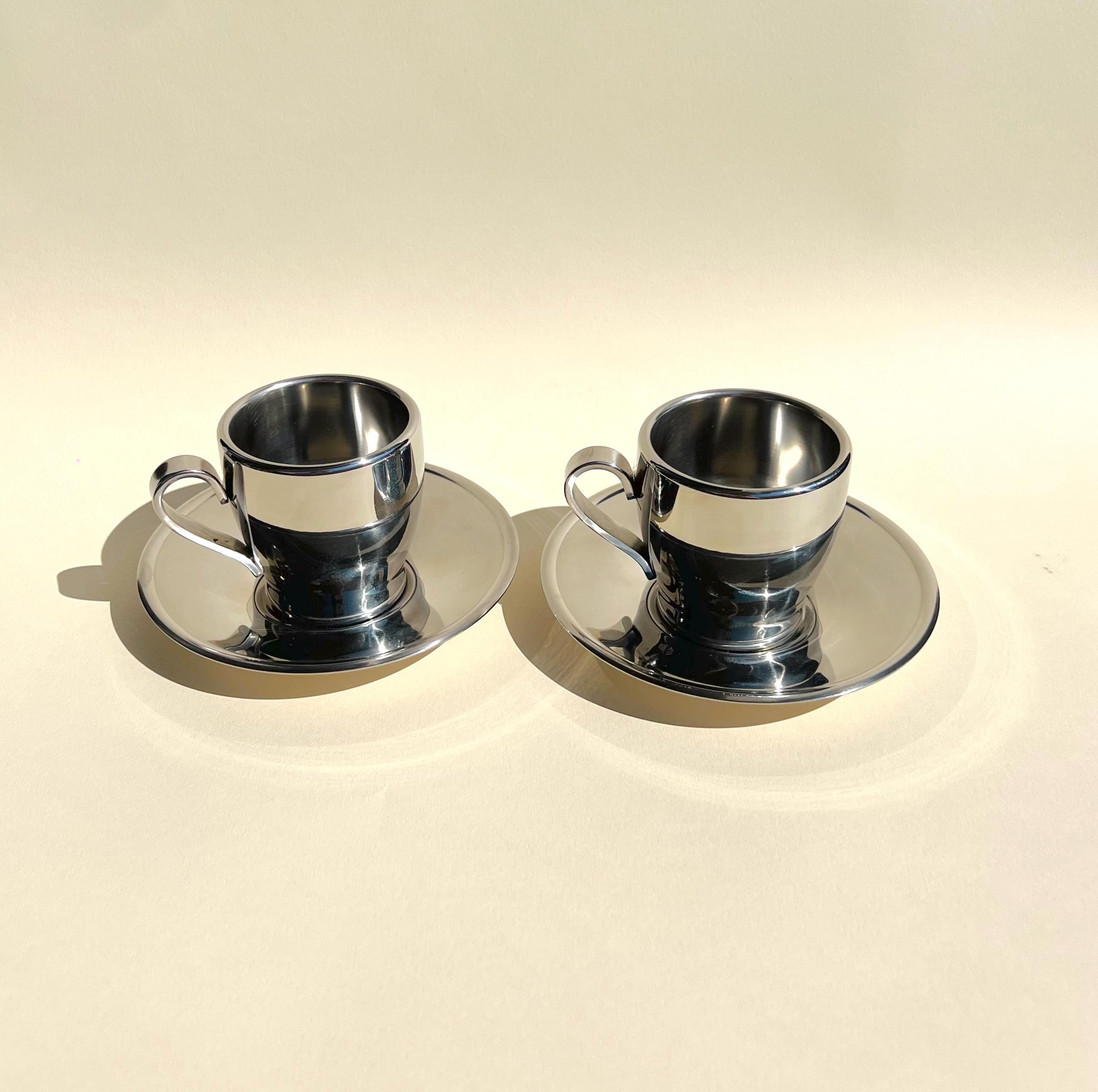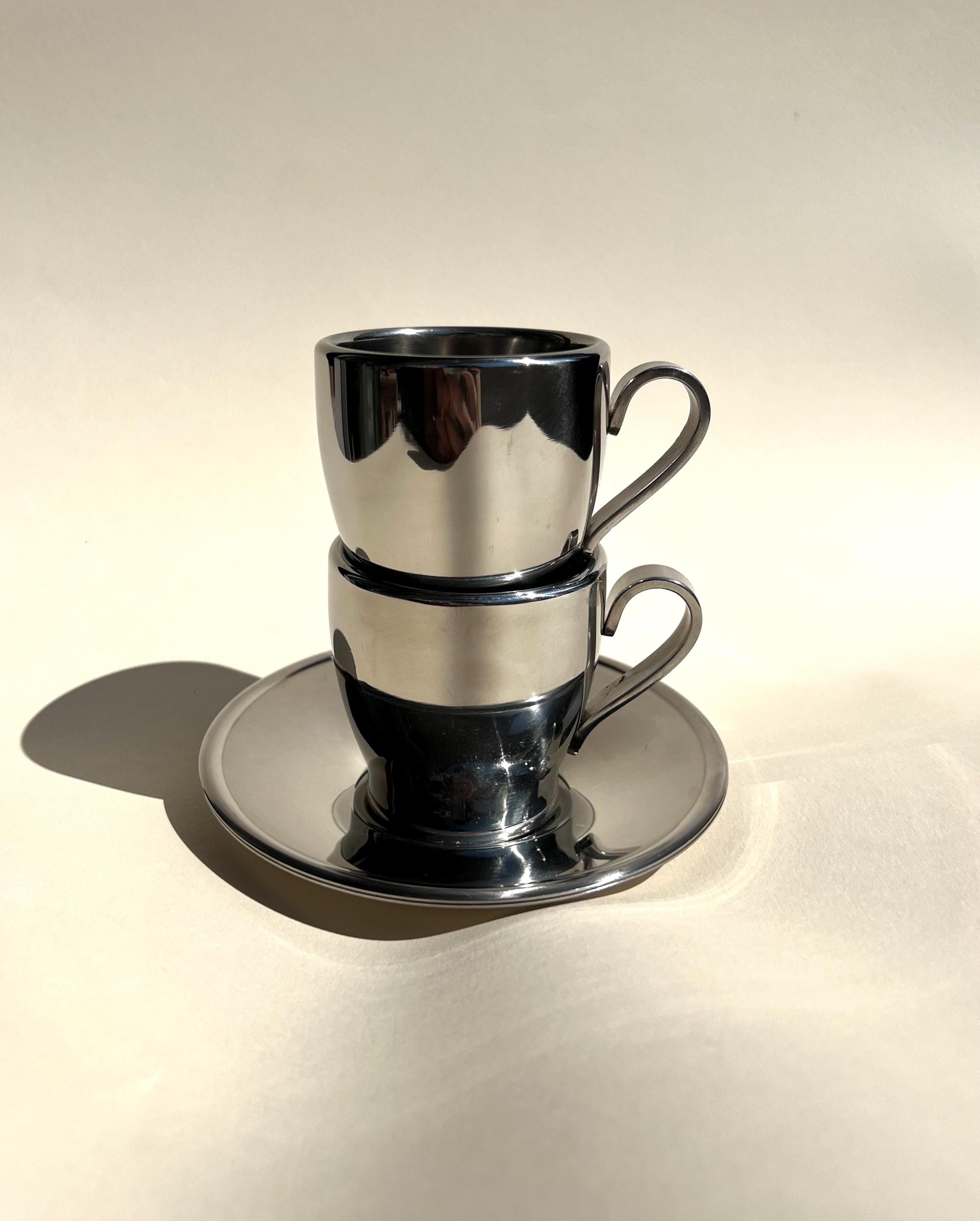 Espresso cups with matching saucers, crafted in high-quality stainless steel for a timeless, modernist aesthetic. These beautiful and minimalistic cups feature a double-walled design, so you’ll be able to enjoy your coffee warm for longer.
