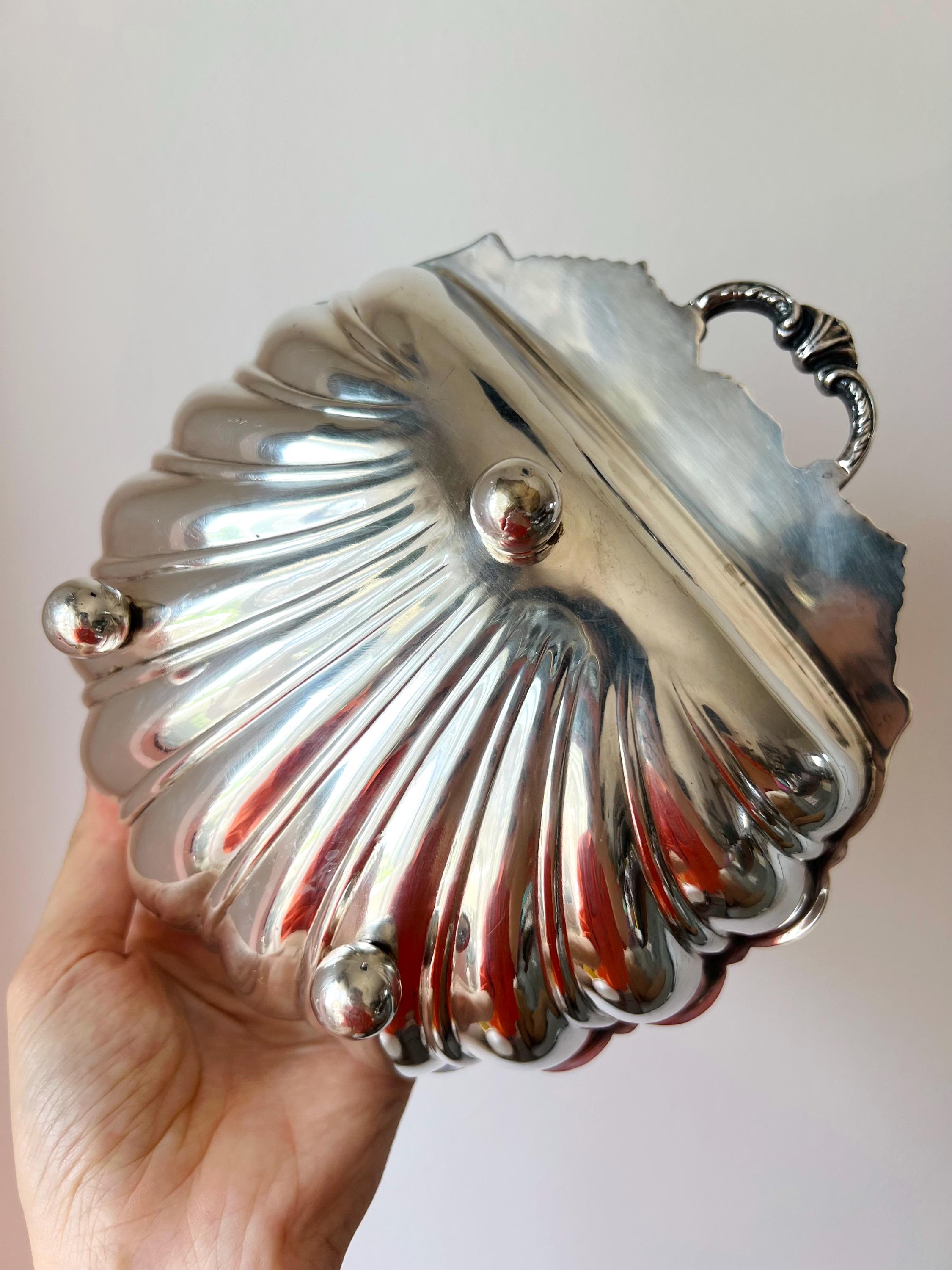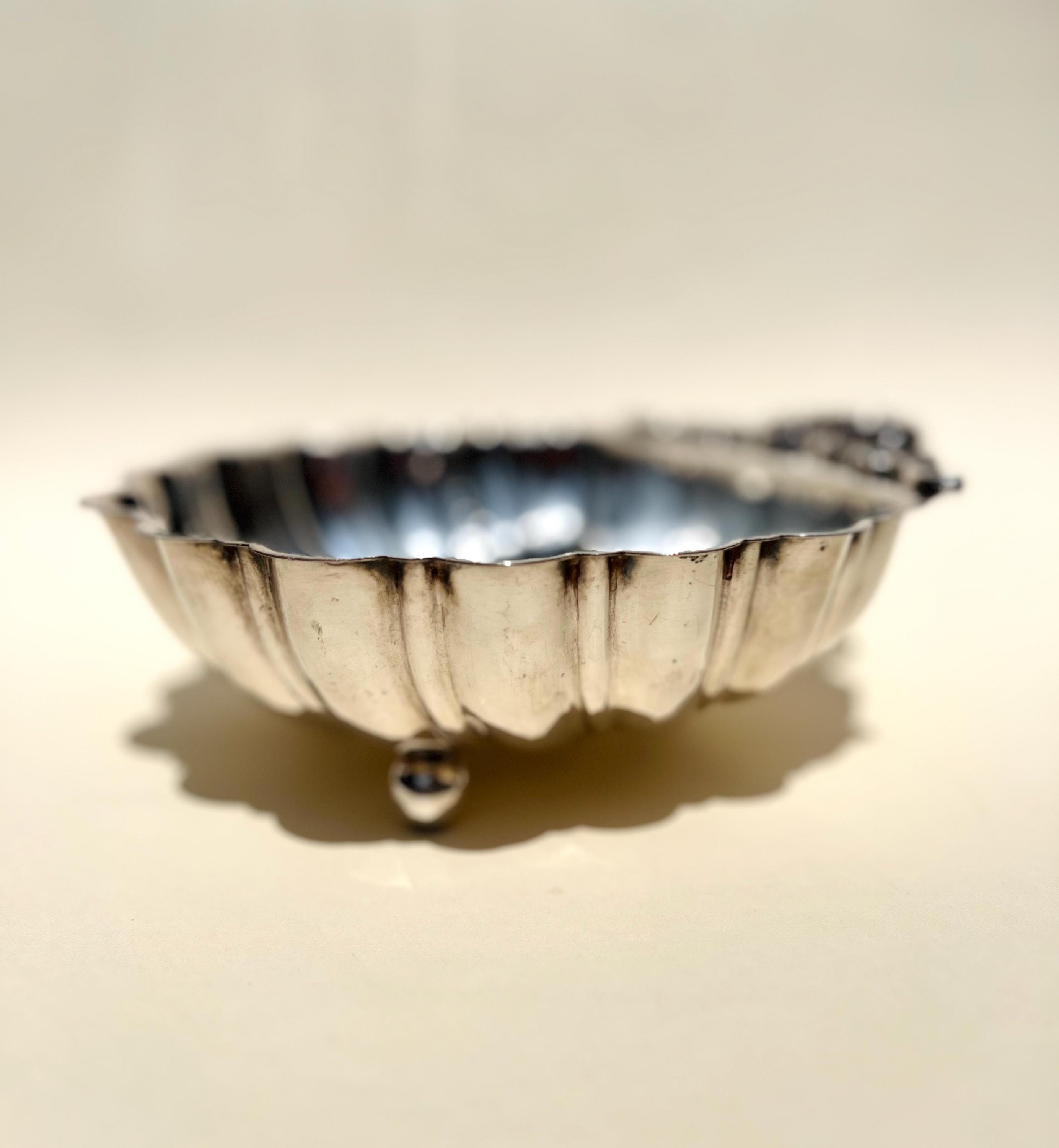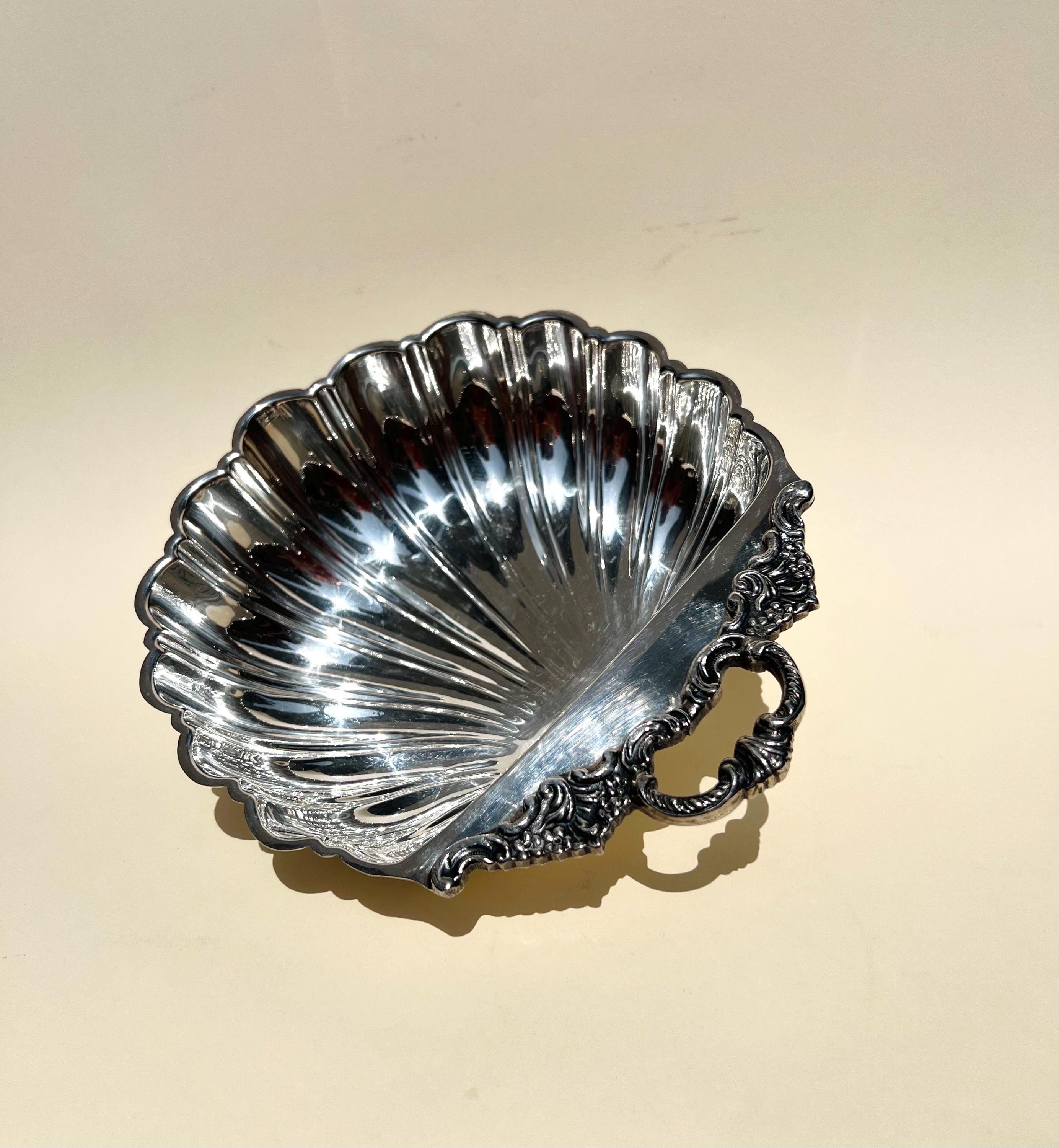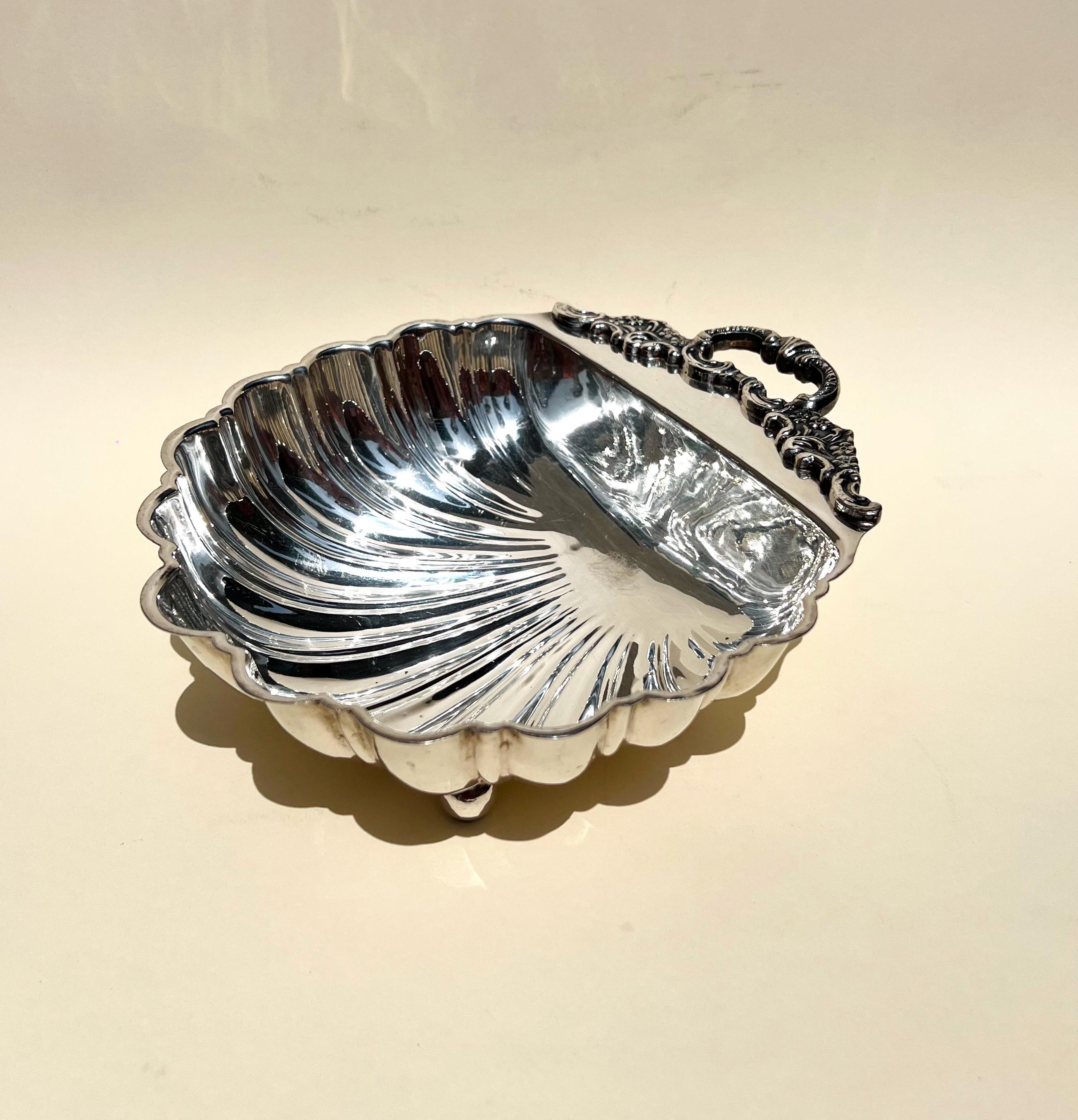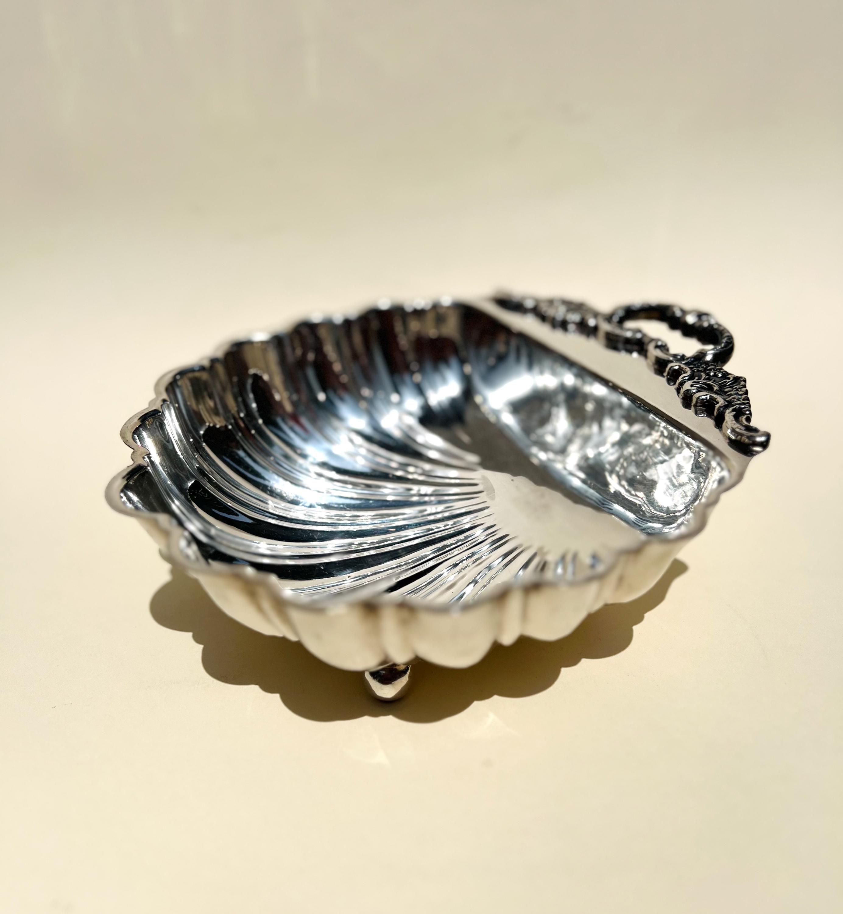 Vintage shell-shaped serving bowl with ornate handle and small decorative feet, sourced in Spain.