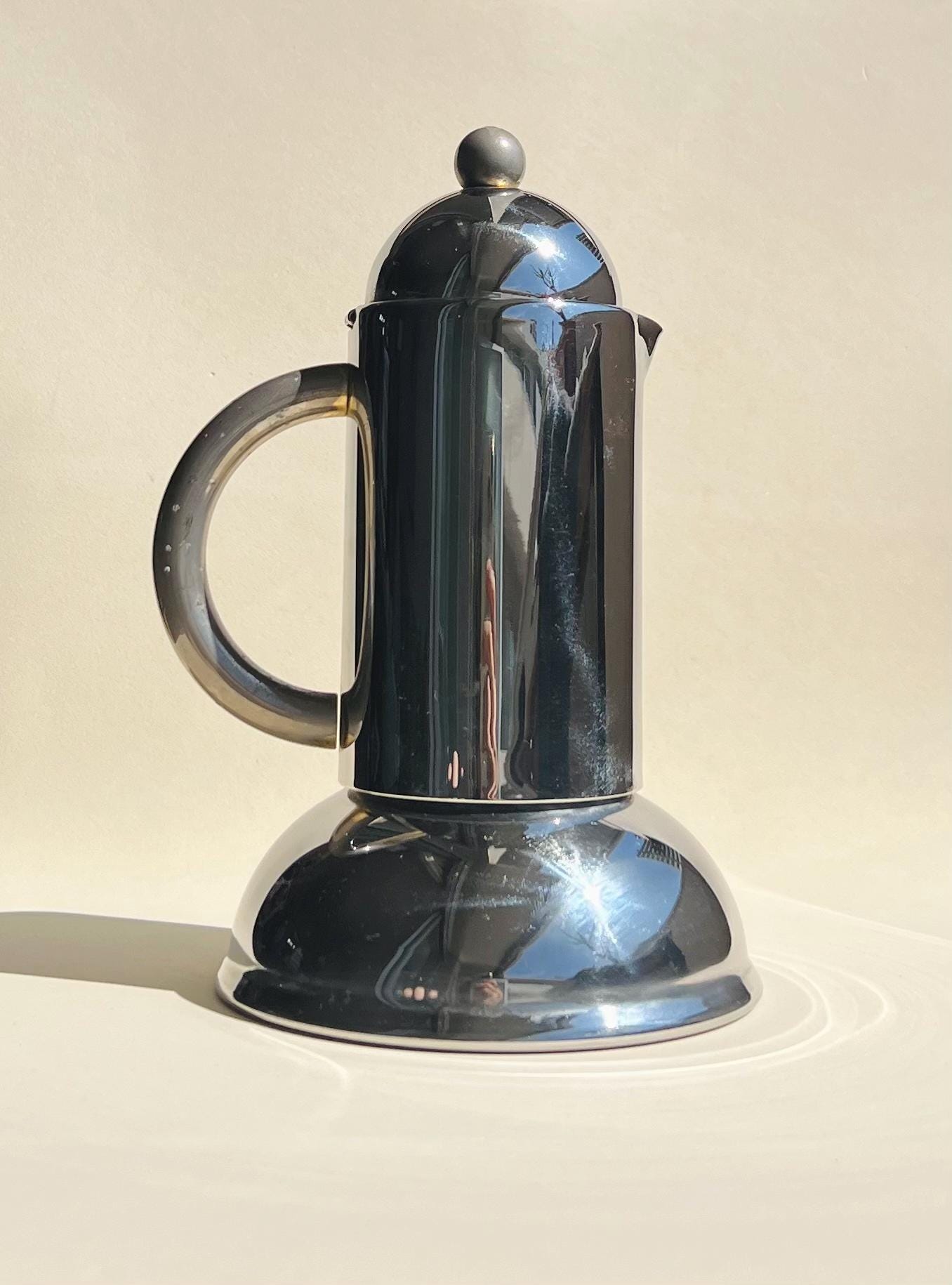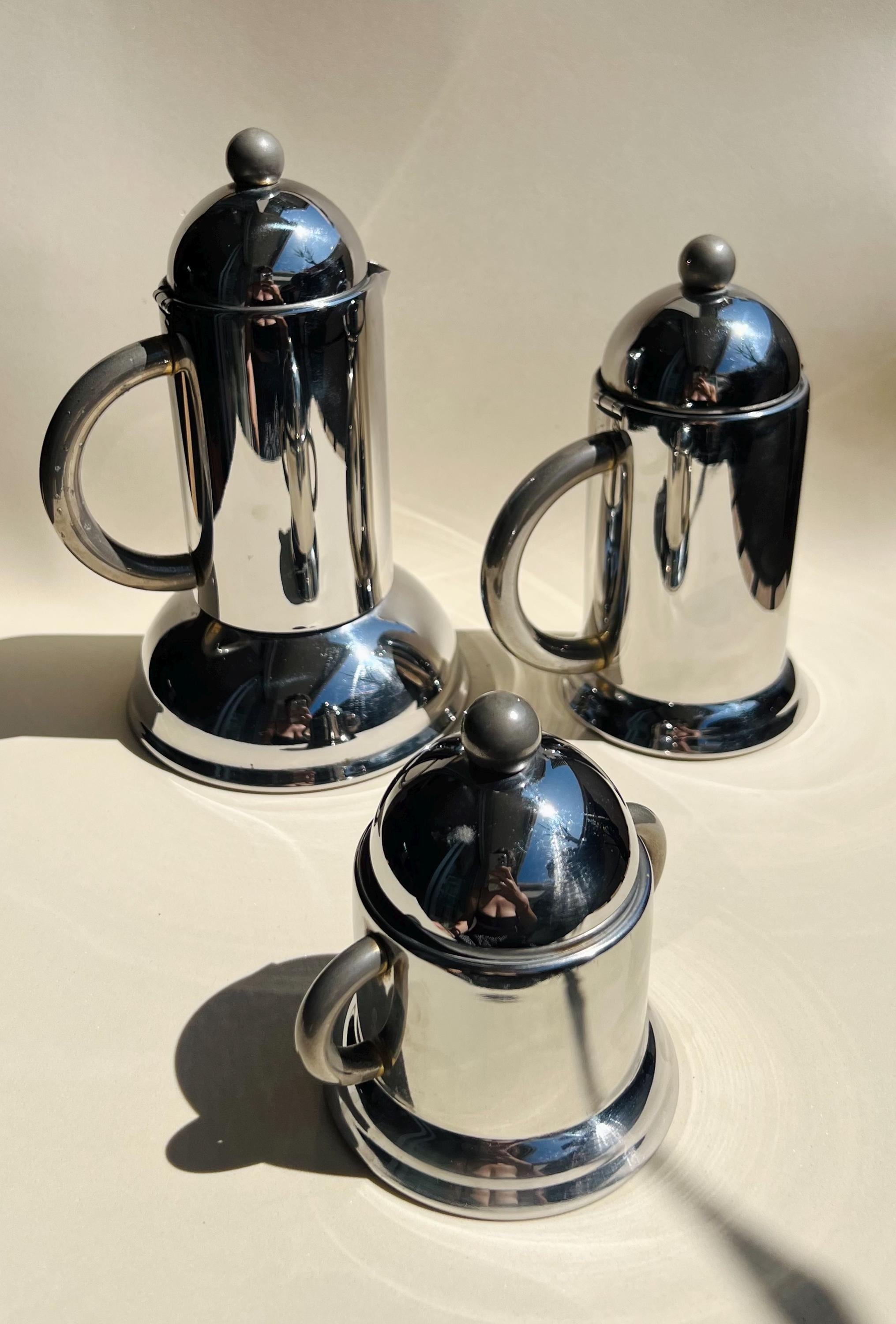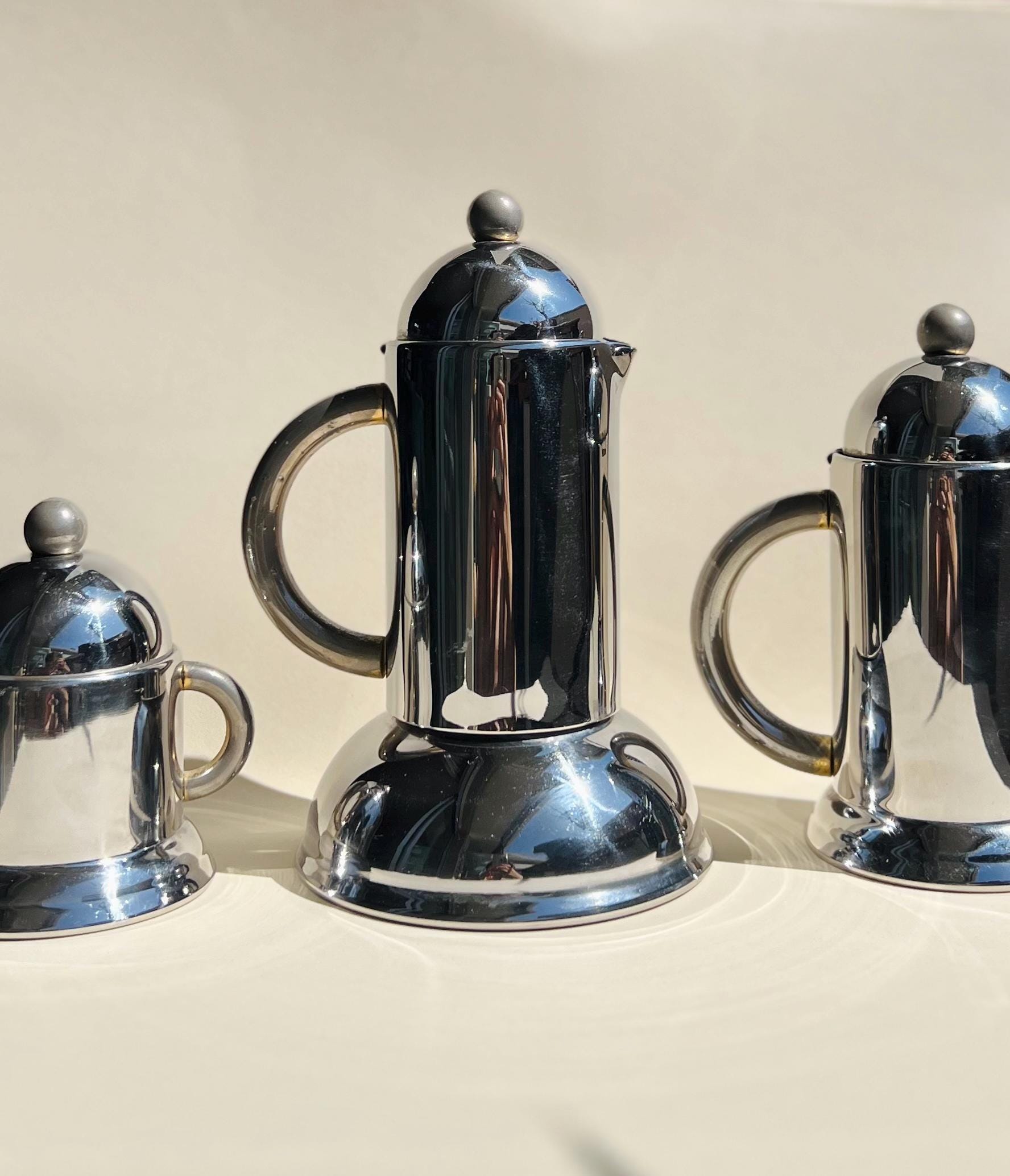 Streamlined and sculptural, this 1980s Italian coffee set by Inoxpran features sleek stainless steel forms with rounded domed lids and minimalist silhouettes. A quintessential example of Italian postmodern design, itβs both functional and beautifully futuristic.