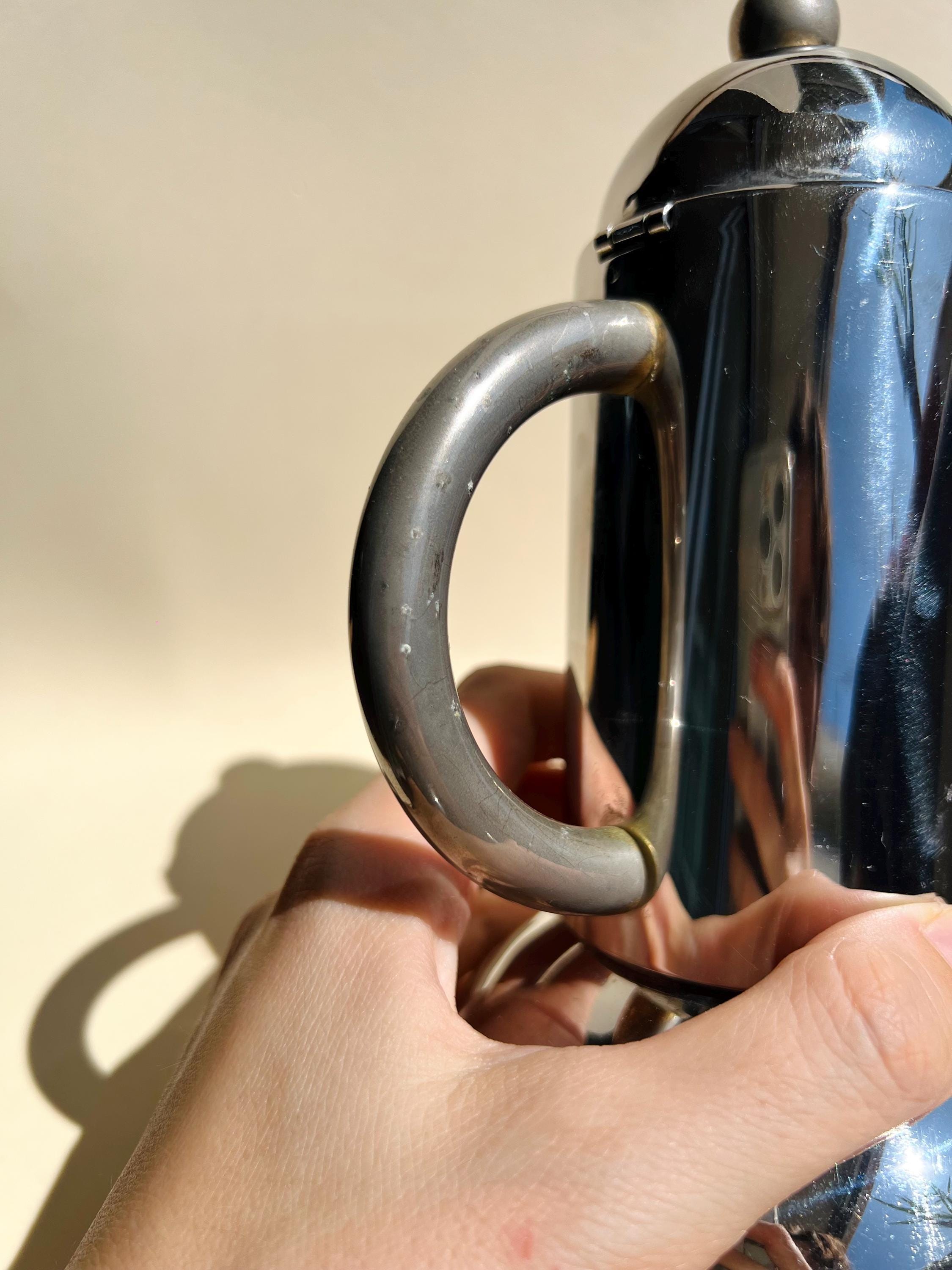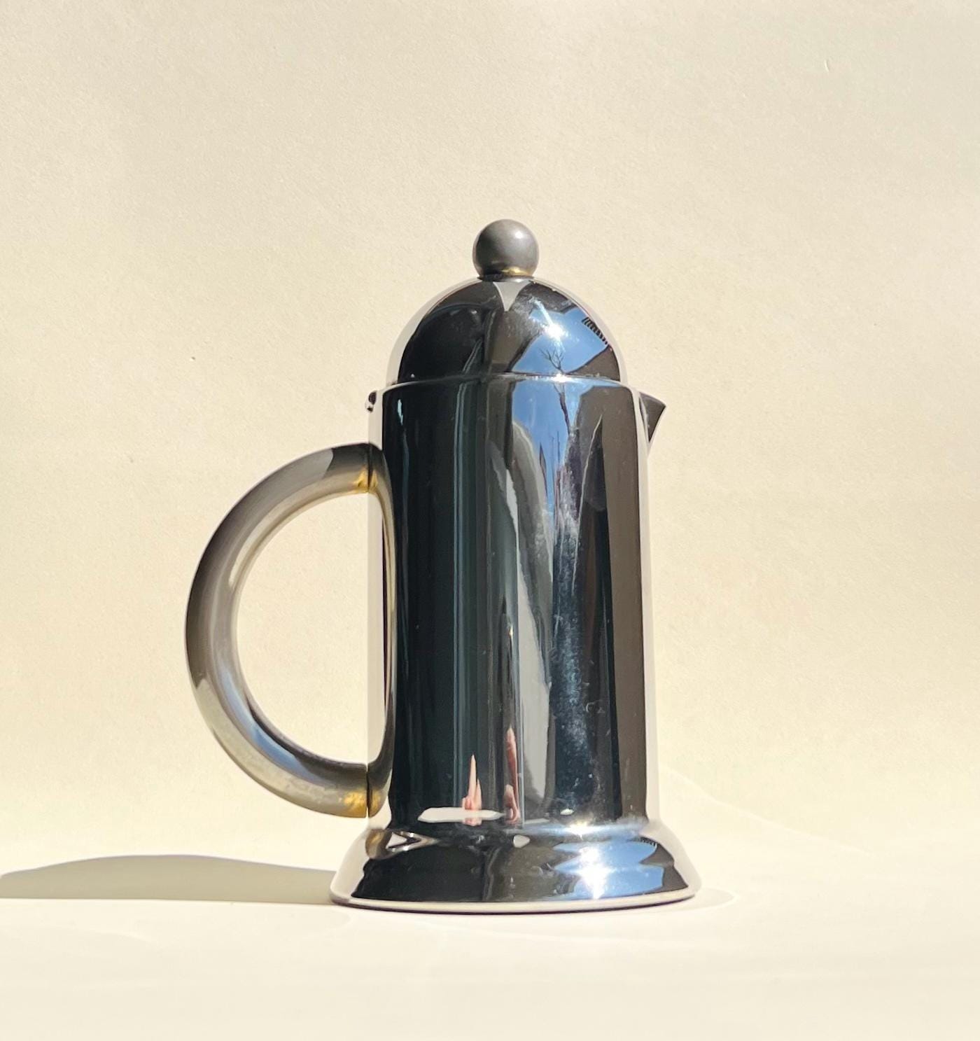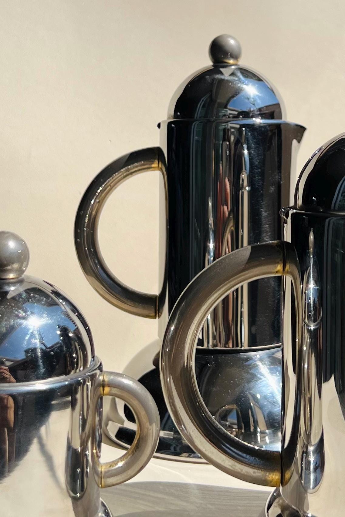 Streamlined and sculptural, this 1980s Italian coffee set by Inoxpran features sleek stainless steel forms with rounded domed lids and minimalist silhouettes. A quintessential example of Italian postmodern design, itβs both functional and beautifully futuristic.