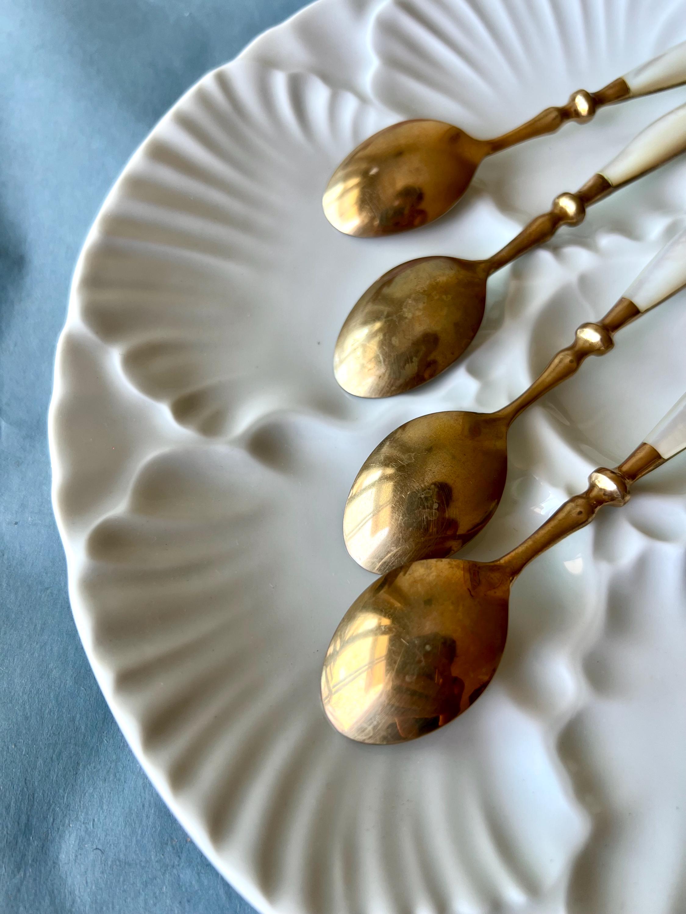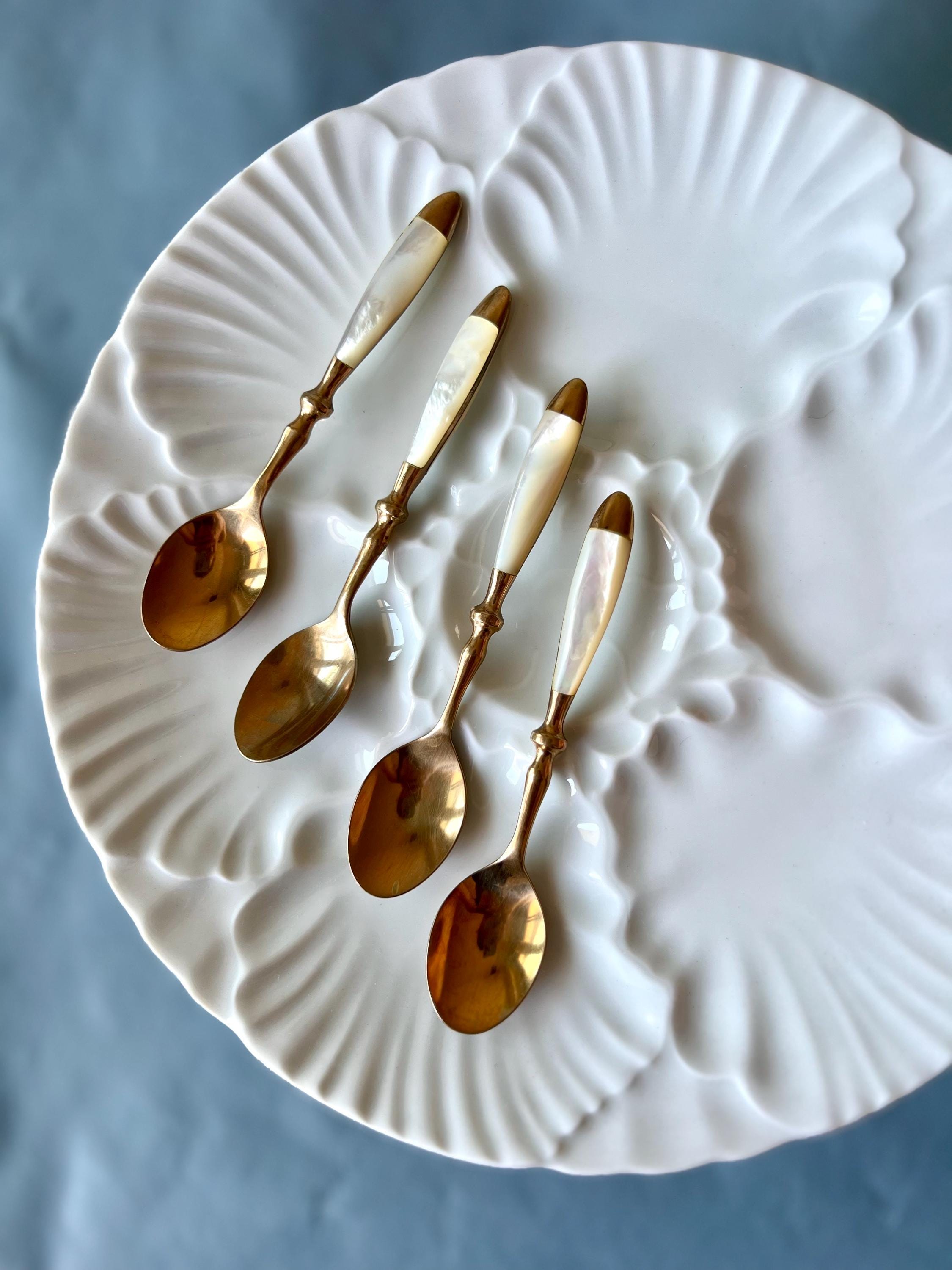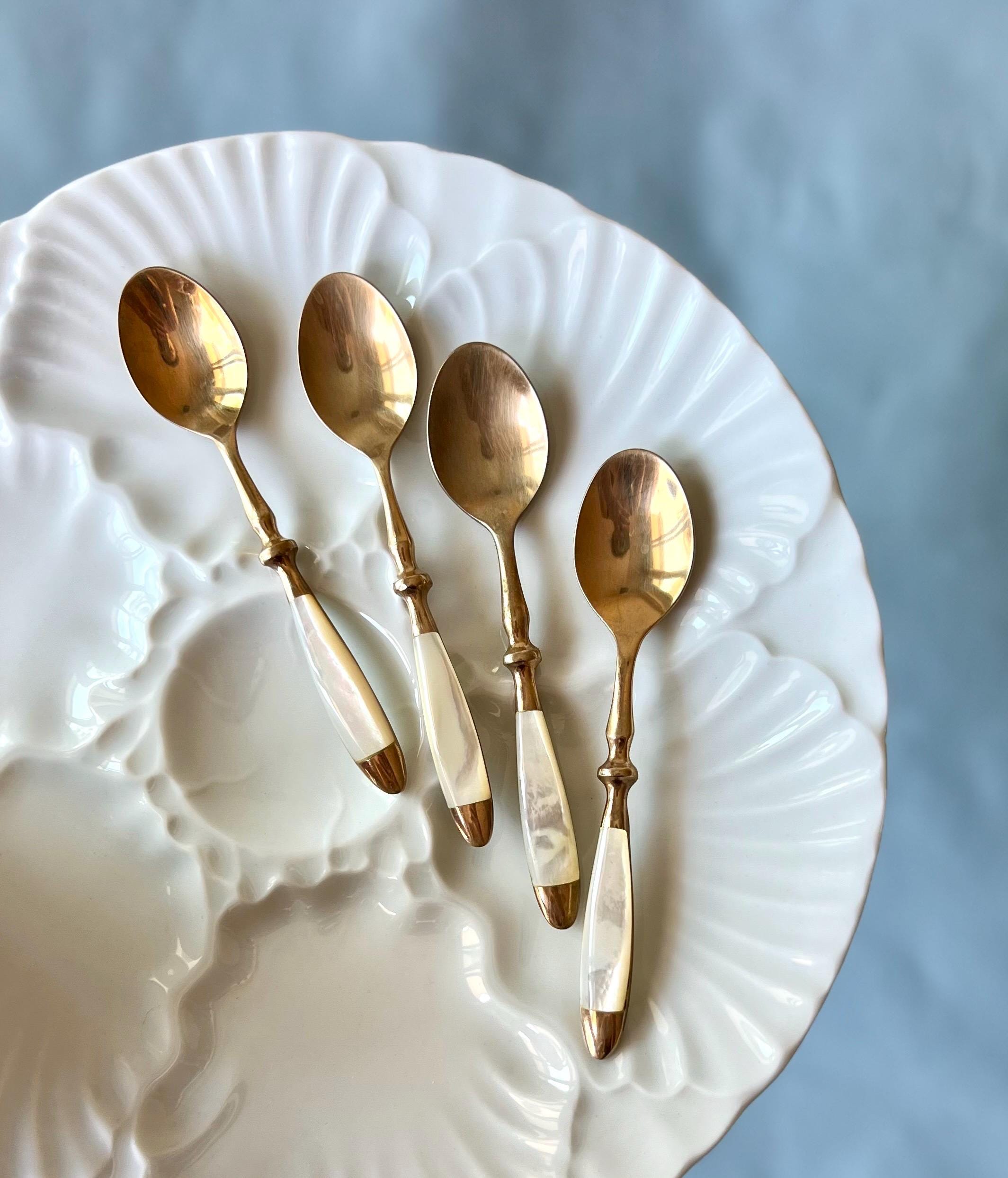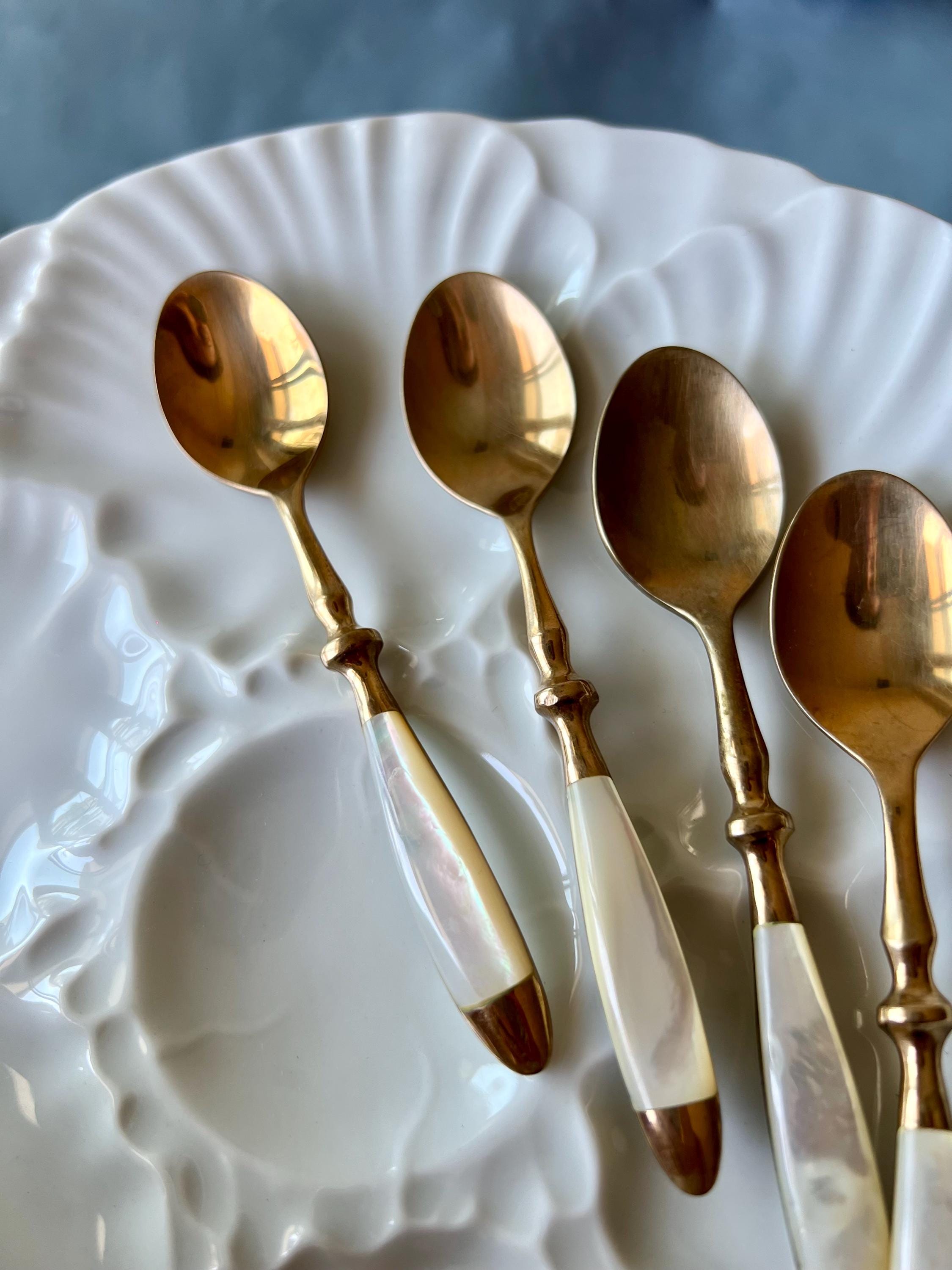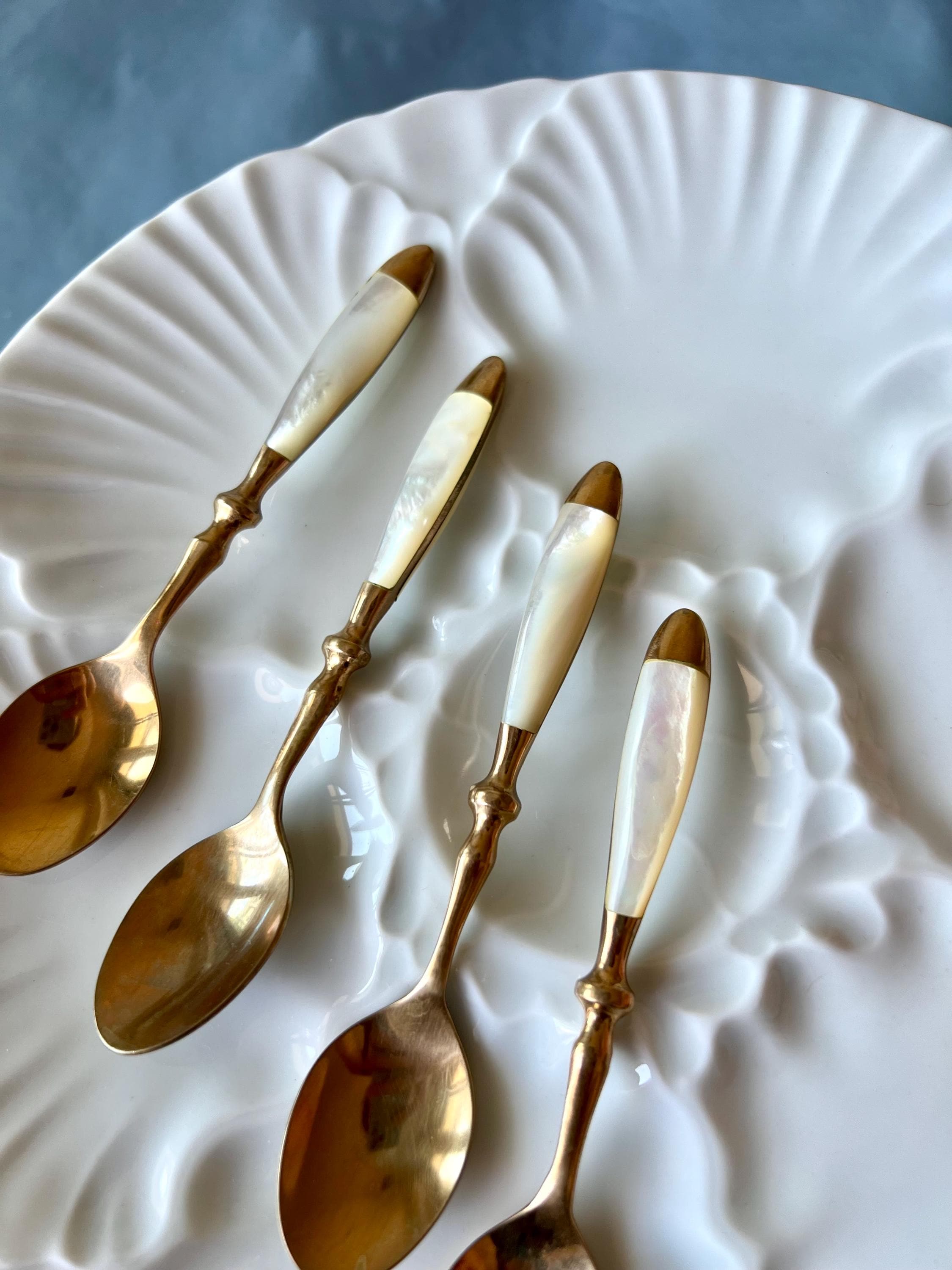 This set features 4 spoons with bronze heads and sculptural handles in mother-of-pearl. Ideal for entertaining, styling, or gifting to a vintage lover.