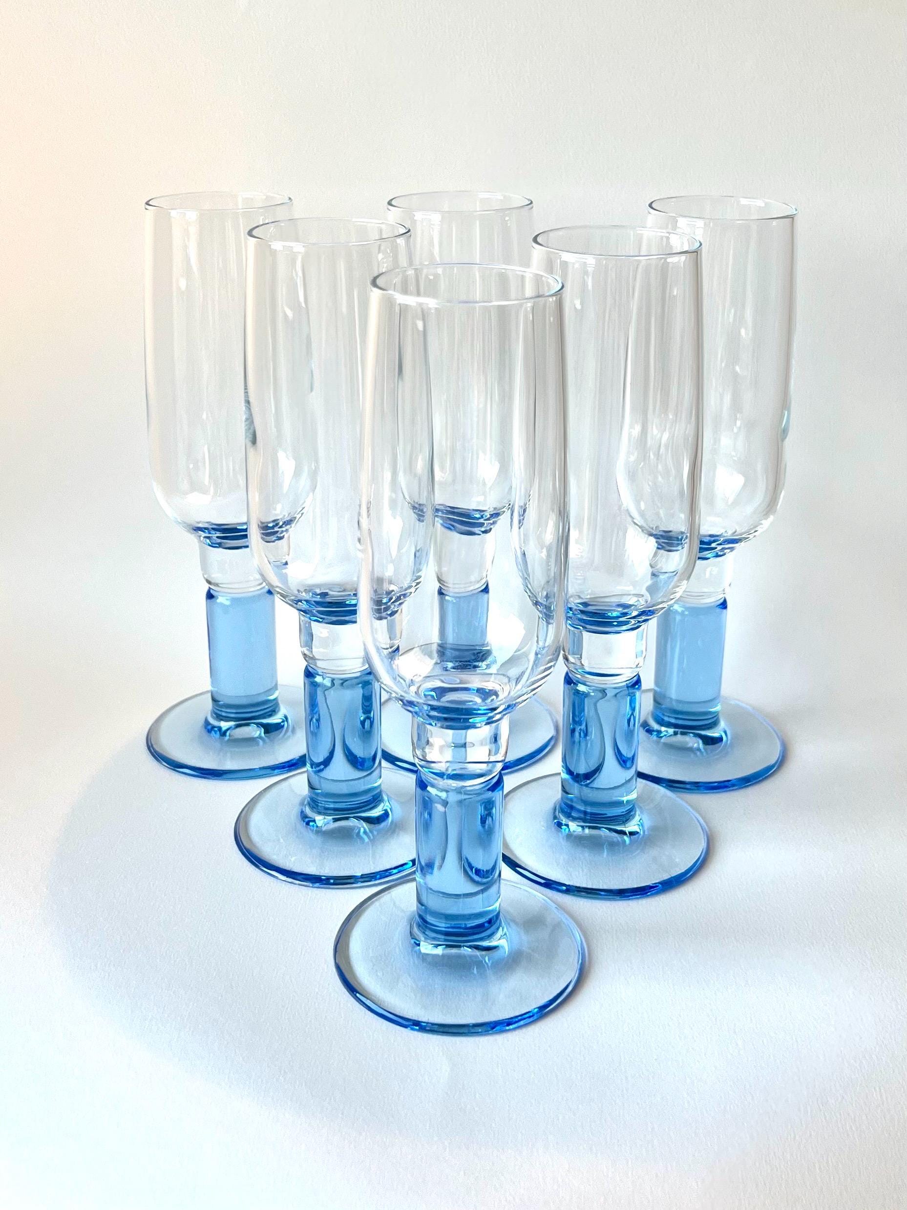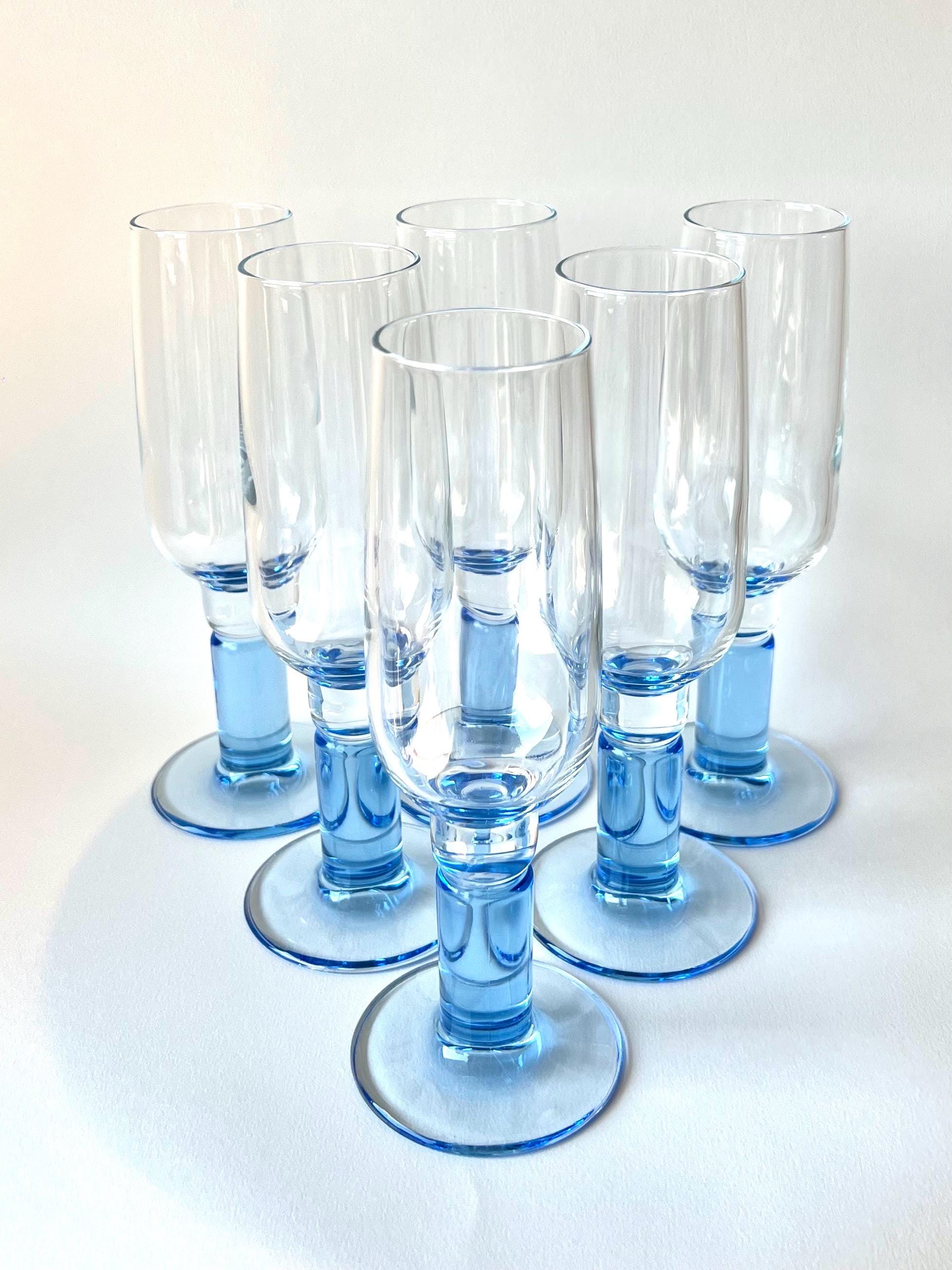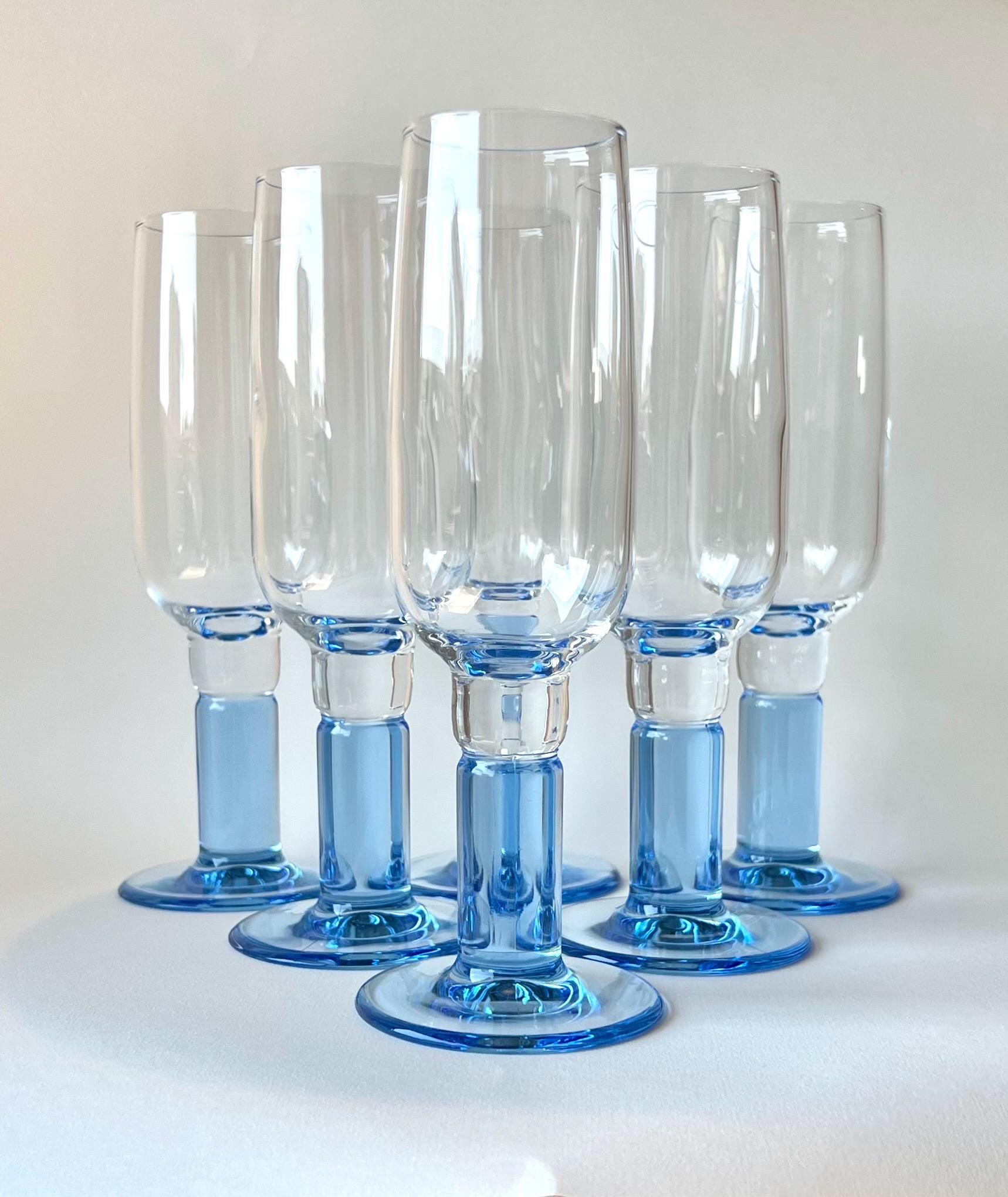 Set of six vintage Bormioli Rocco champagne flutes with split stem design. A beautiful addition to any mid-century or modern bar setup, these are both stylish and practical for entertaining guests.