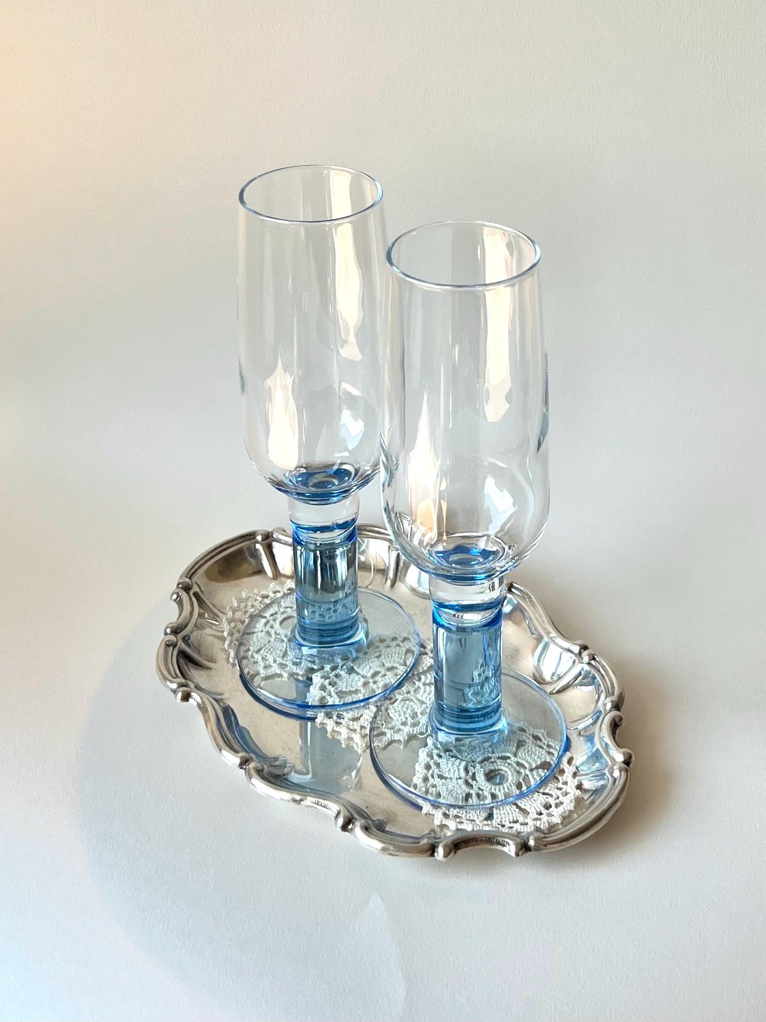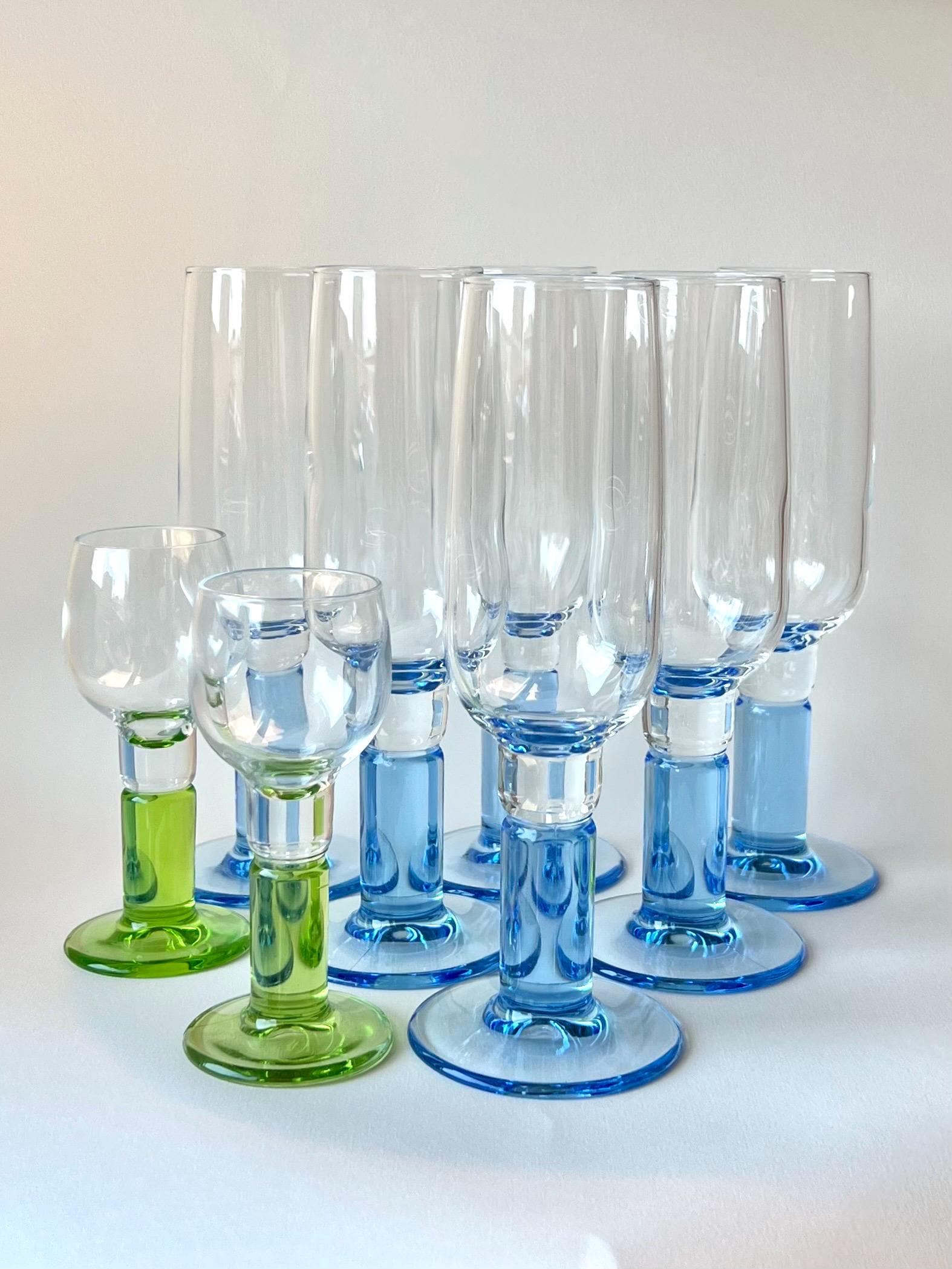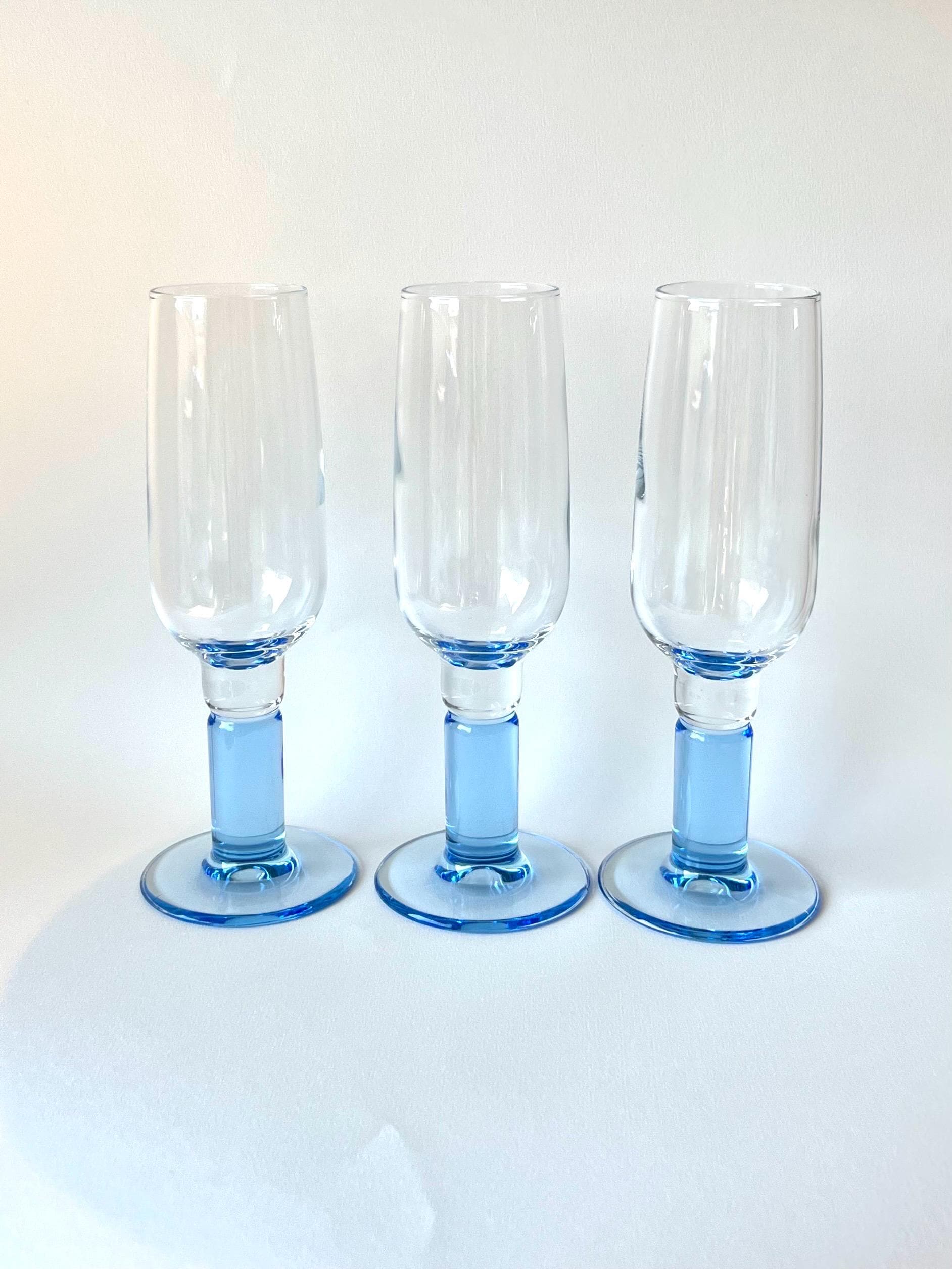 Set of six vintage Bormioli Rocco champagne flutes with split stem design. A beautiful addition to any mid-century or modern bar setup, these are both stylish and practical for entertaining guests.