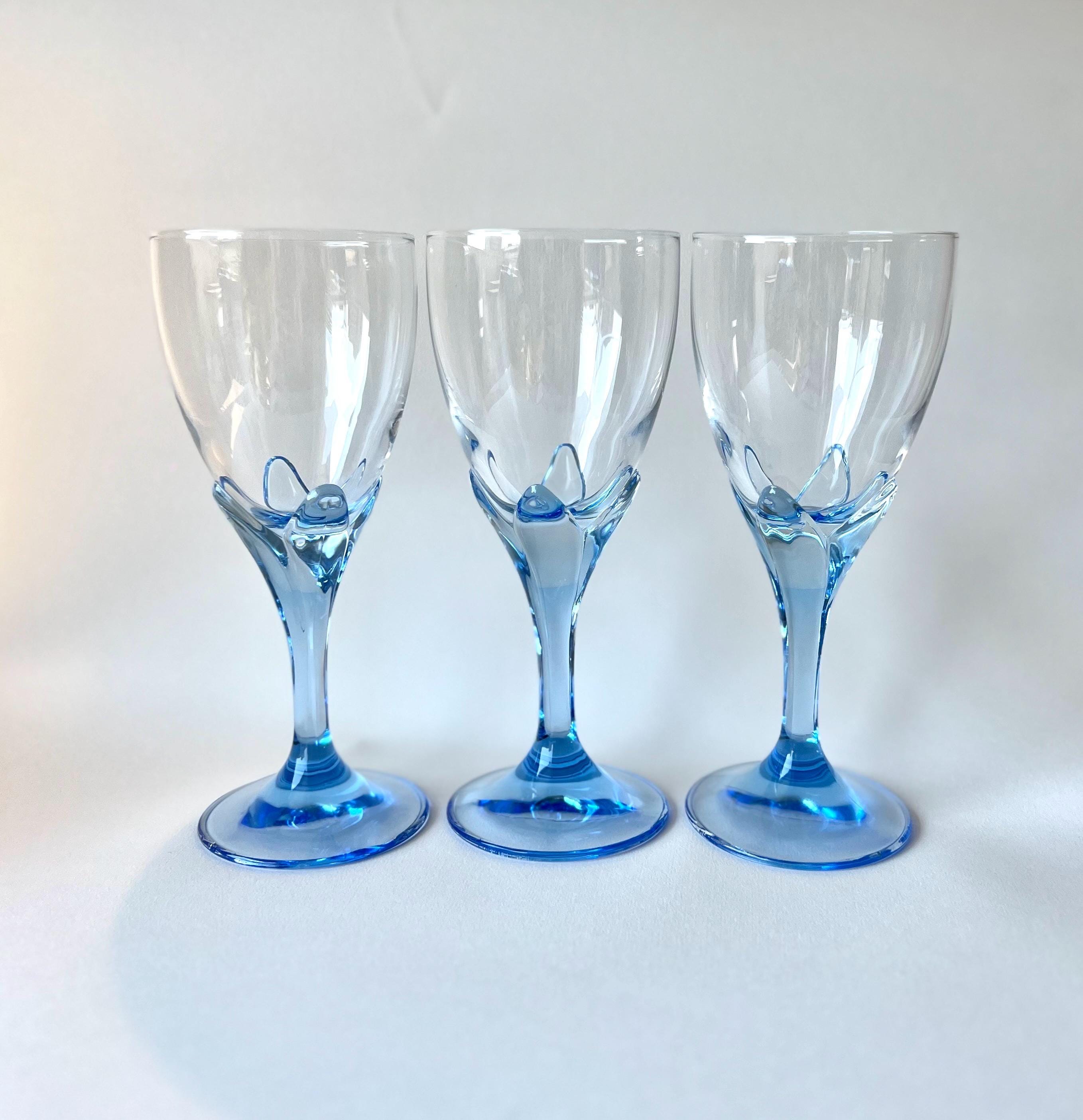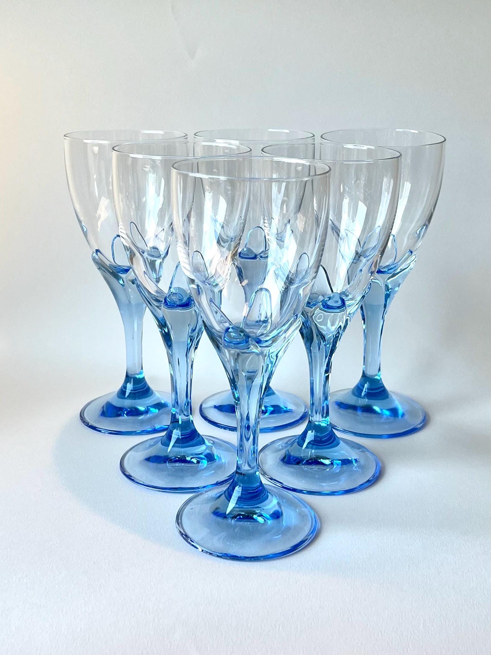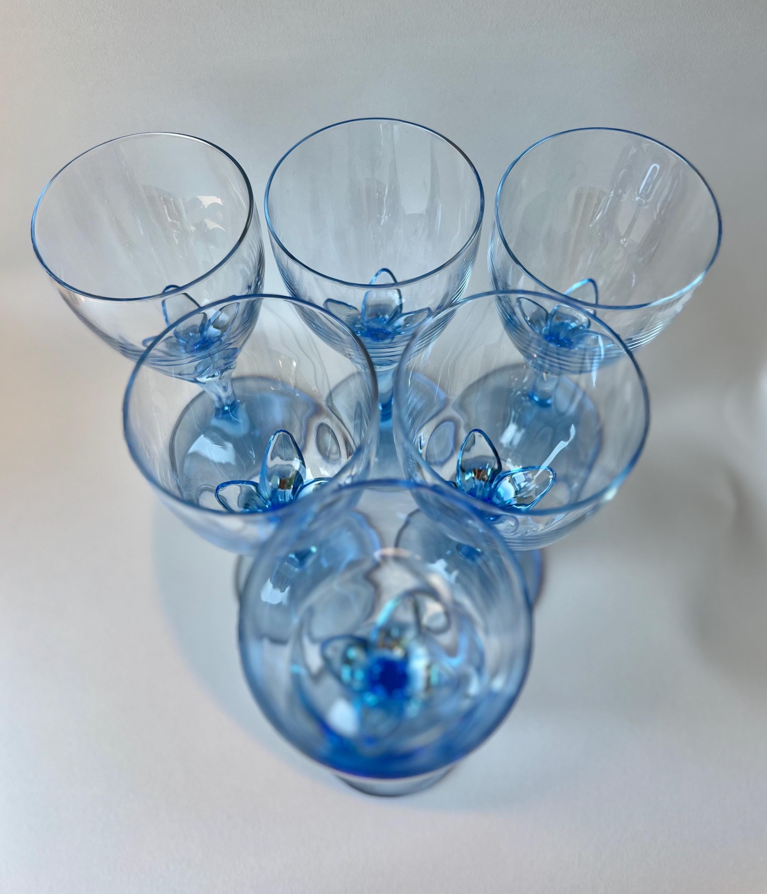 Set of 5 vintage wine glasses by Bormioli Rocco, crafted in Italy during 1990s. Featuring a flower shaped blue stem, these glasses bring a playful yet sophisticated flair to your wine presentations.