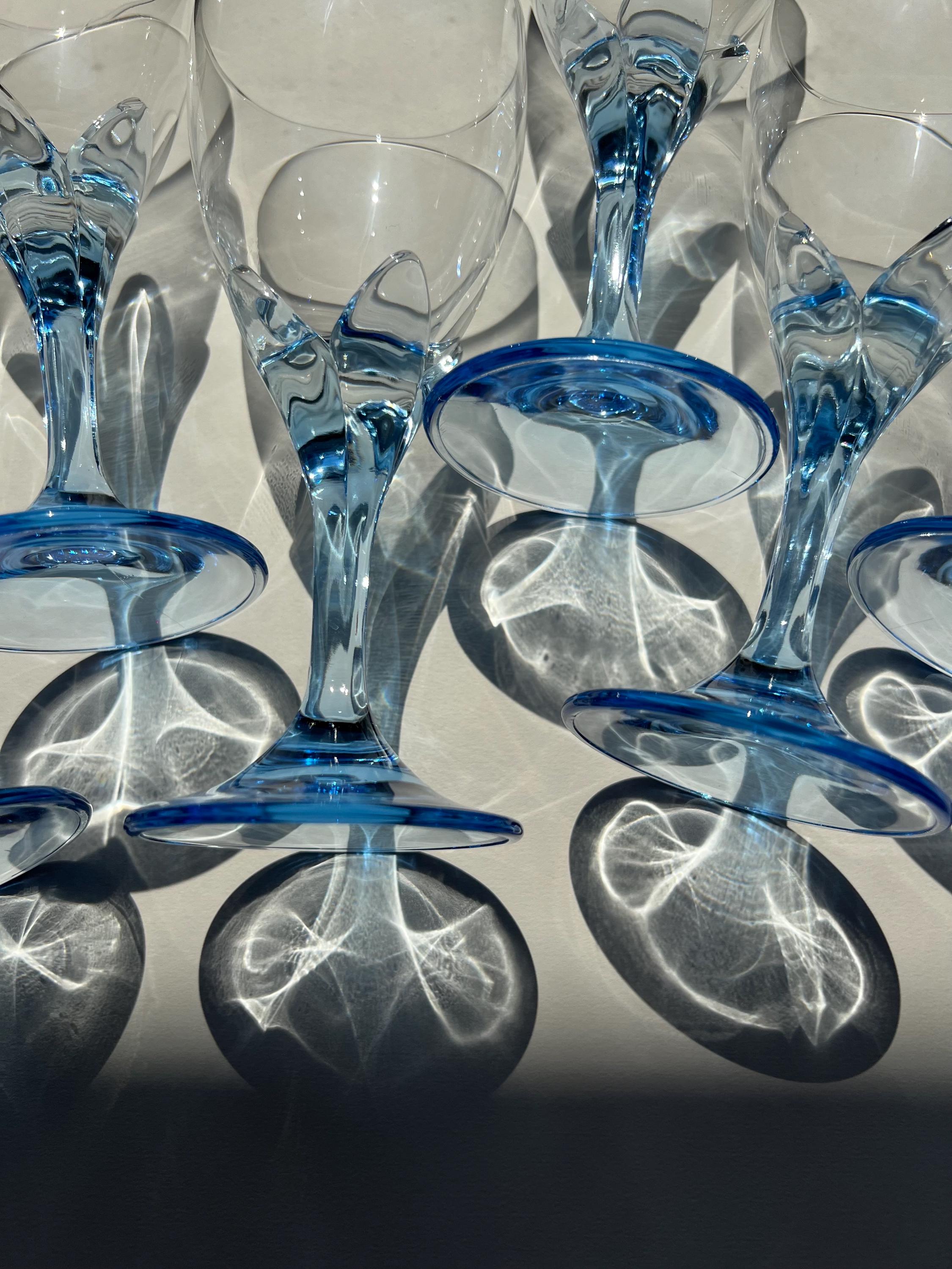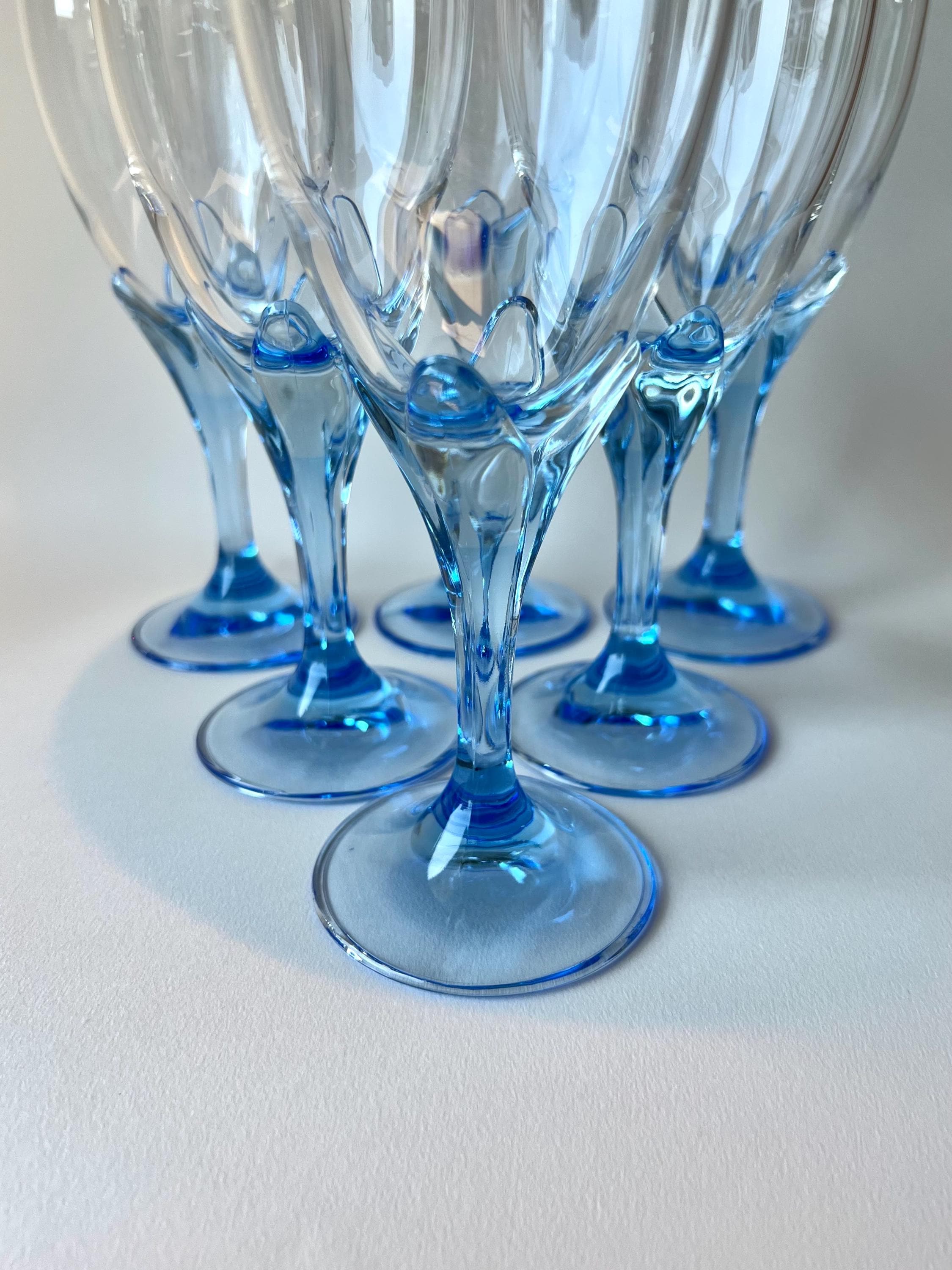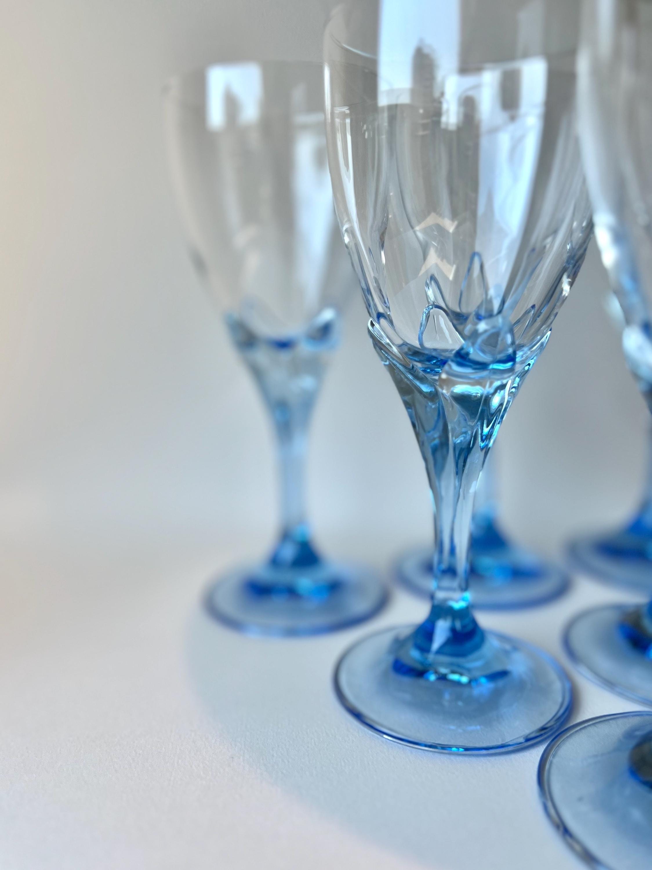 Set of 5 vintage wine glasses by Bormioli Rocco, crafted in Italy during 1990s. Featuring a flower shaped blue stem, these glasses bring a playful yet sophisticated flair to your wine presentations.