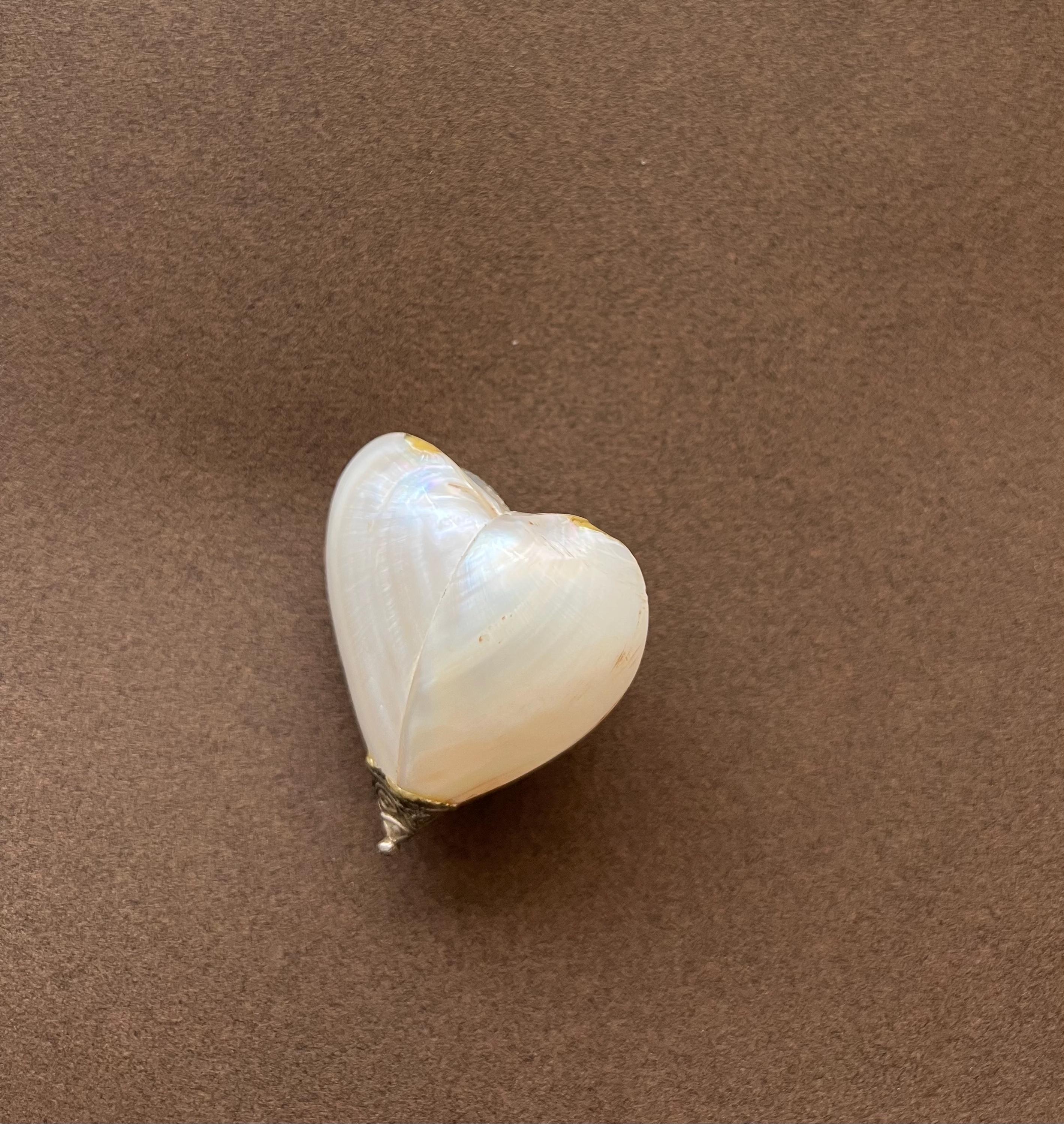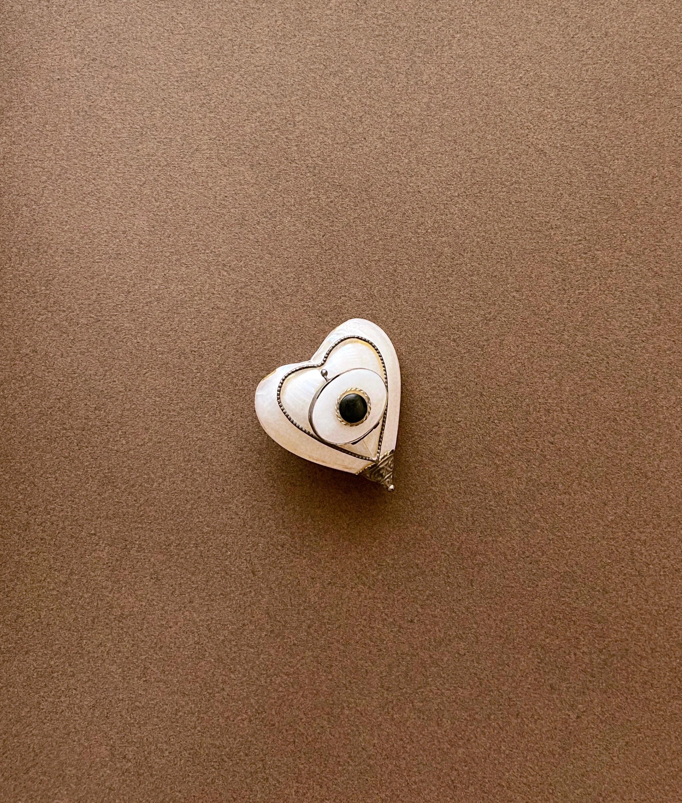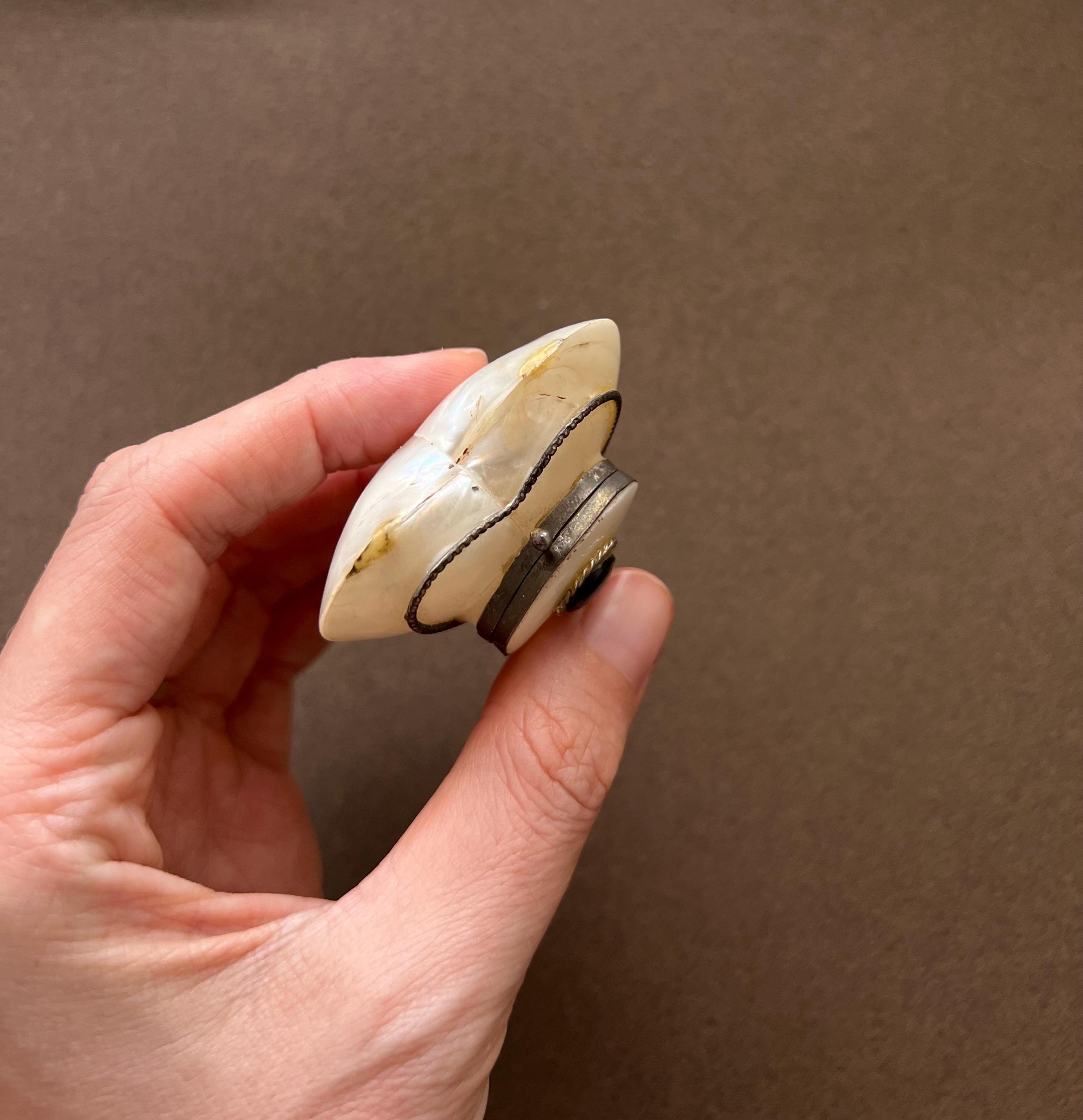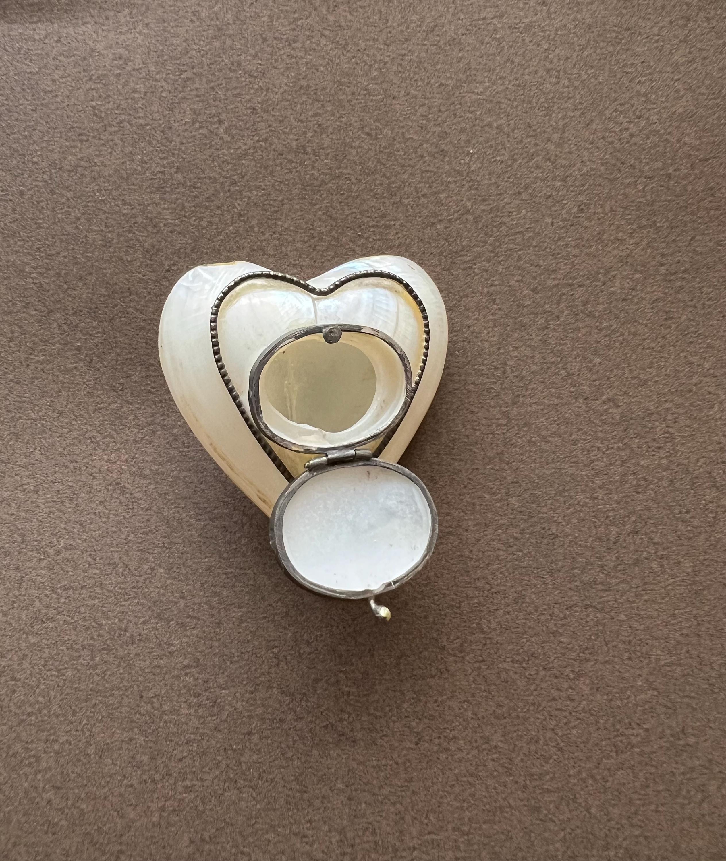This rare antique heart-shaped container is crafted from mother-of-pearl, framed in metal. It can be used as a keepsake holder for tiny treasures or a pillbox. Likely dating from the late 19th to early 20th century and sourced in Spain, it is a truly special find for any collector.