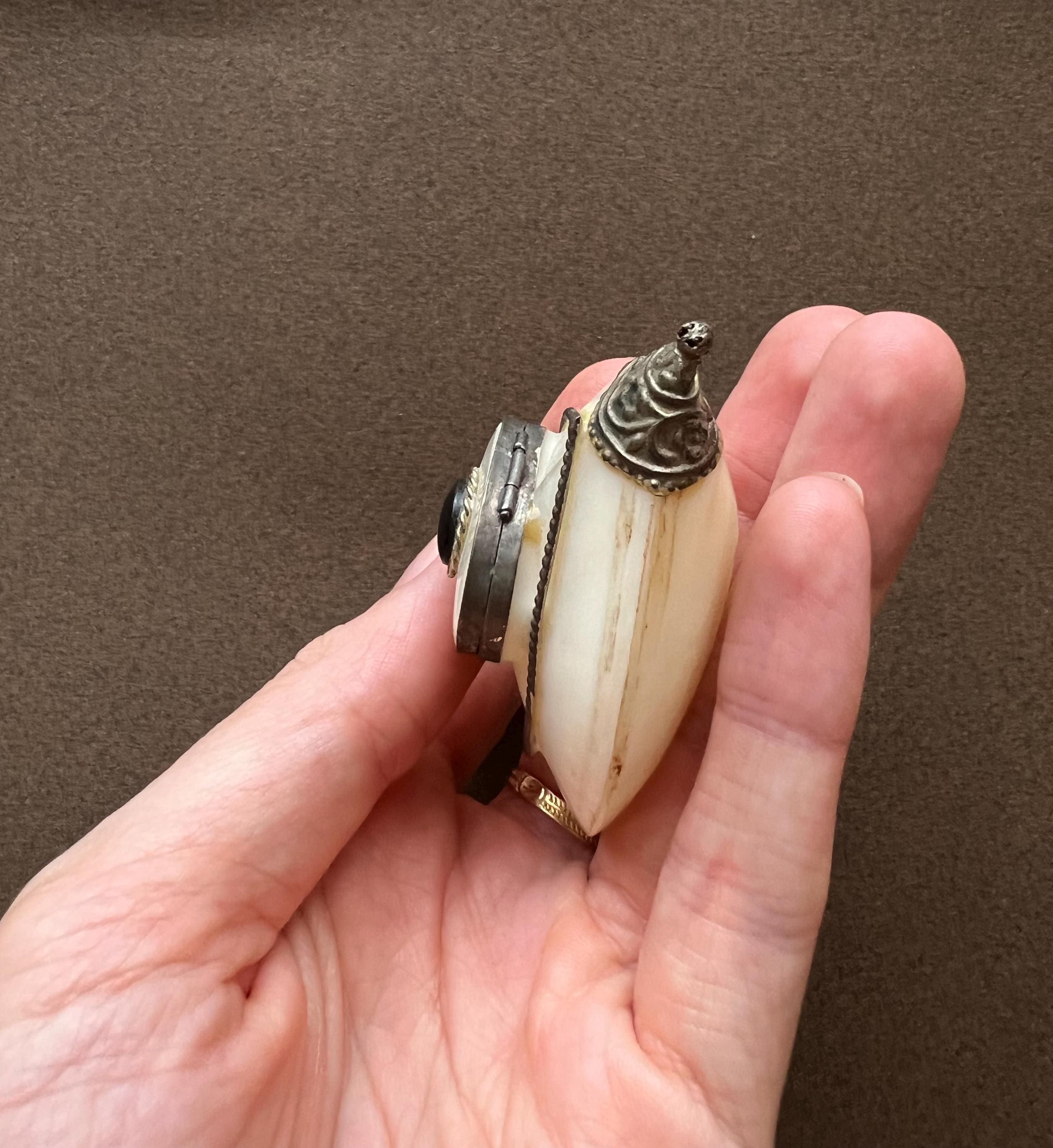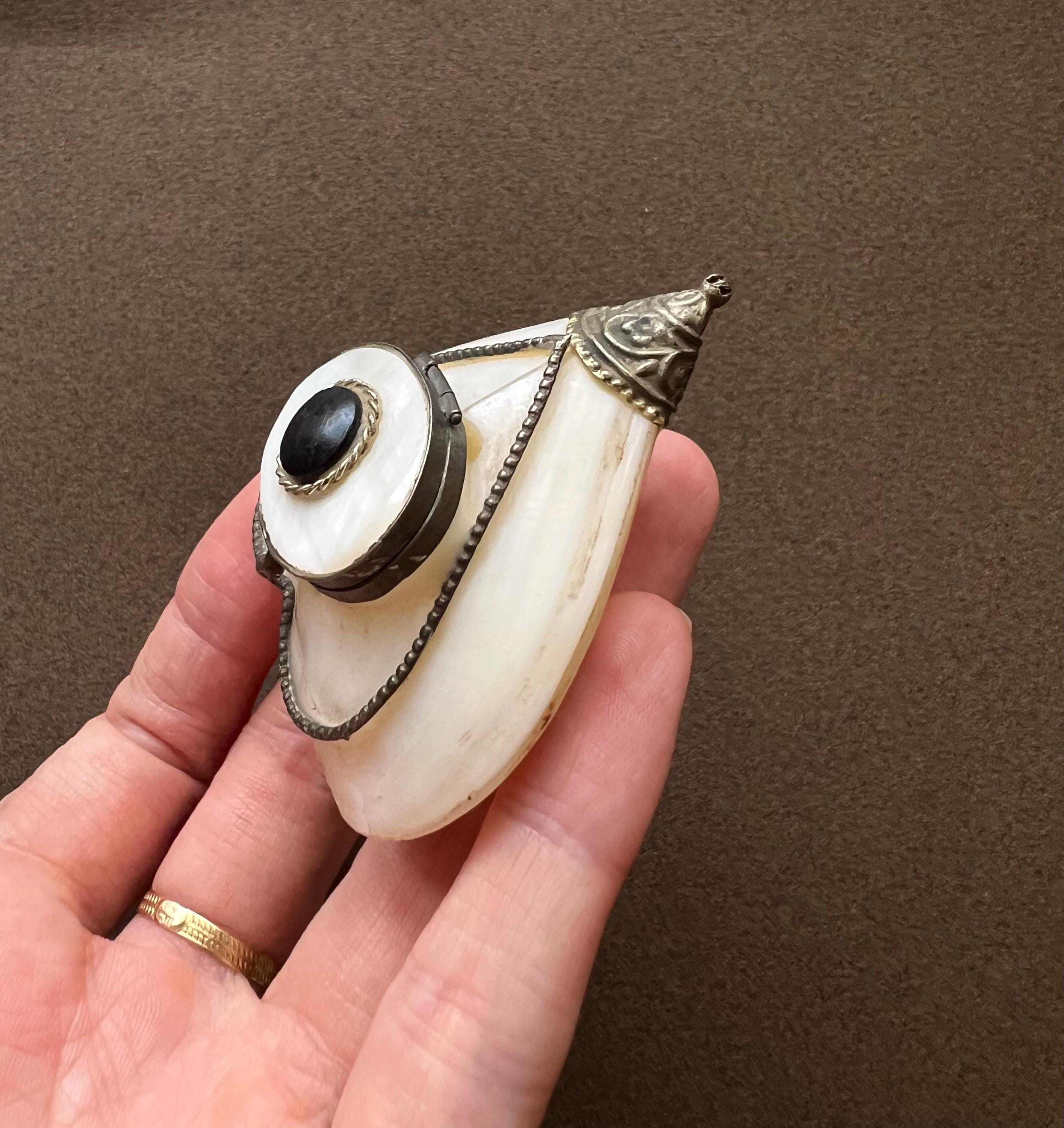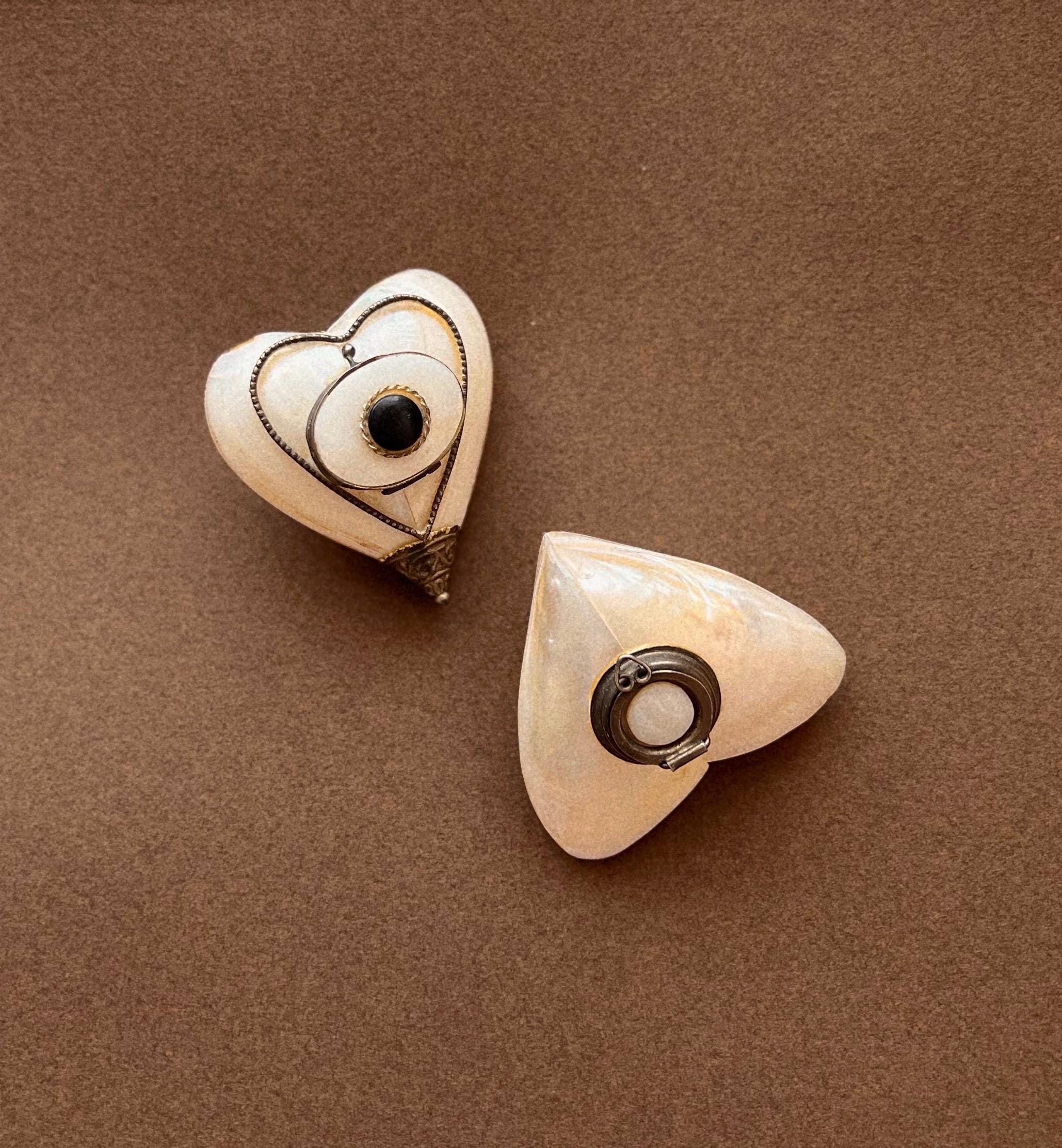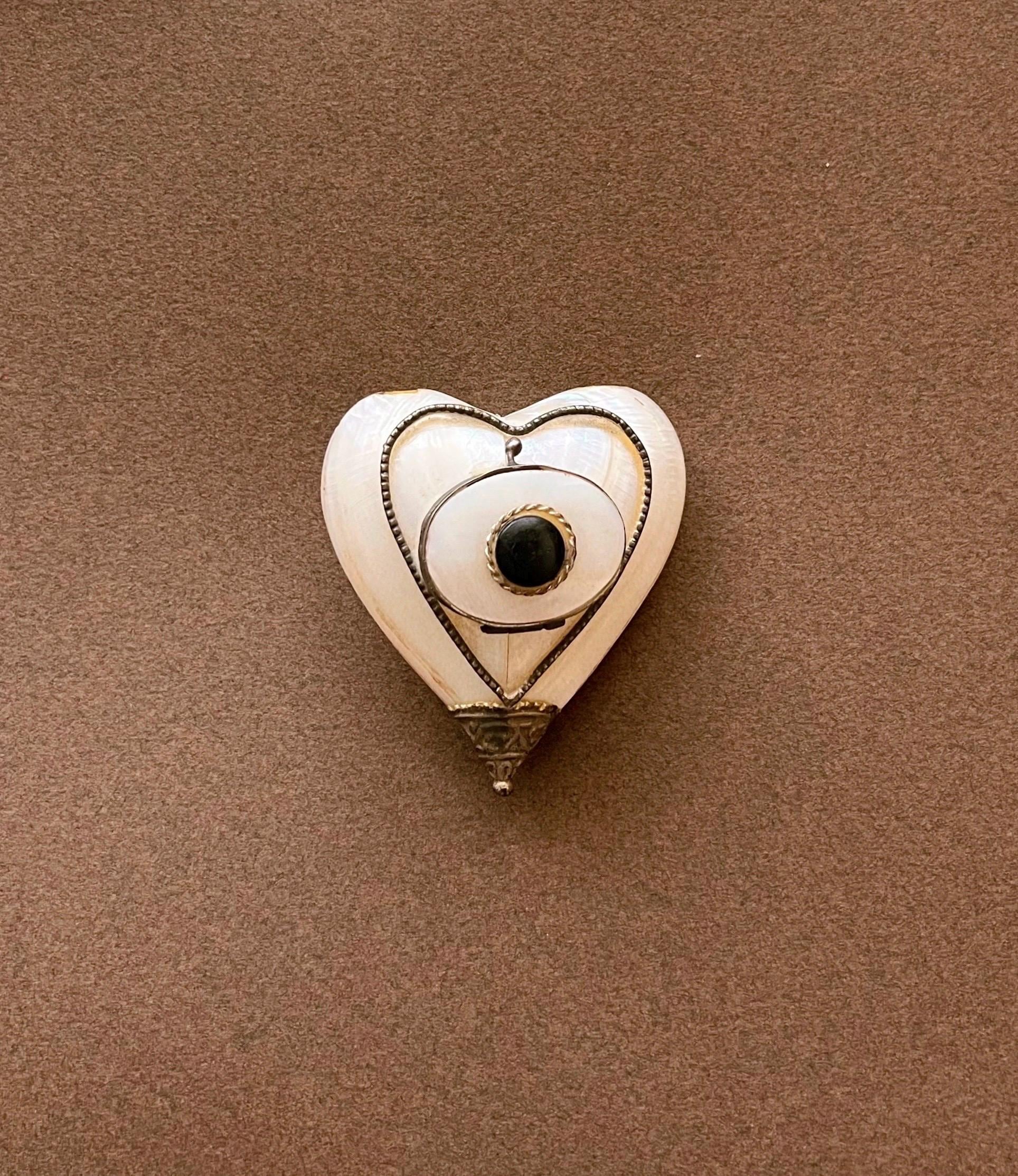 This rare antique heart-shaped container is crafted from mother-of-pearl, framed in metal. It can be used as a keepsake holder for tiny treasures or a pillbox. Likely dating from the late 19th to early 20th century and sourced in Spain, it is a truly special find for any collector.