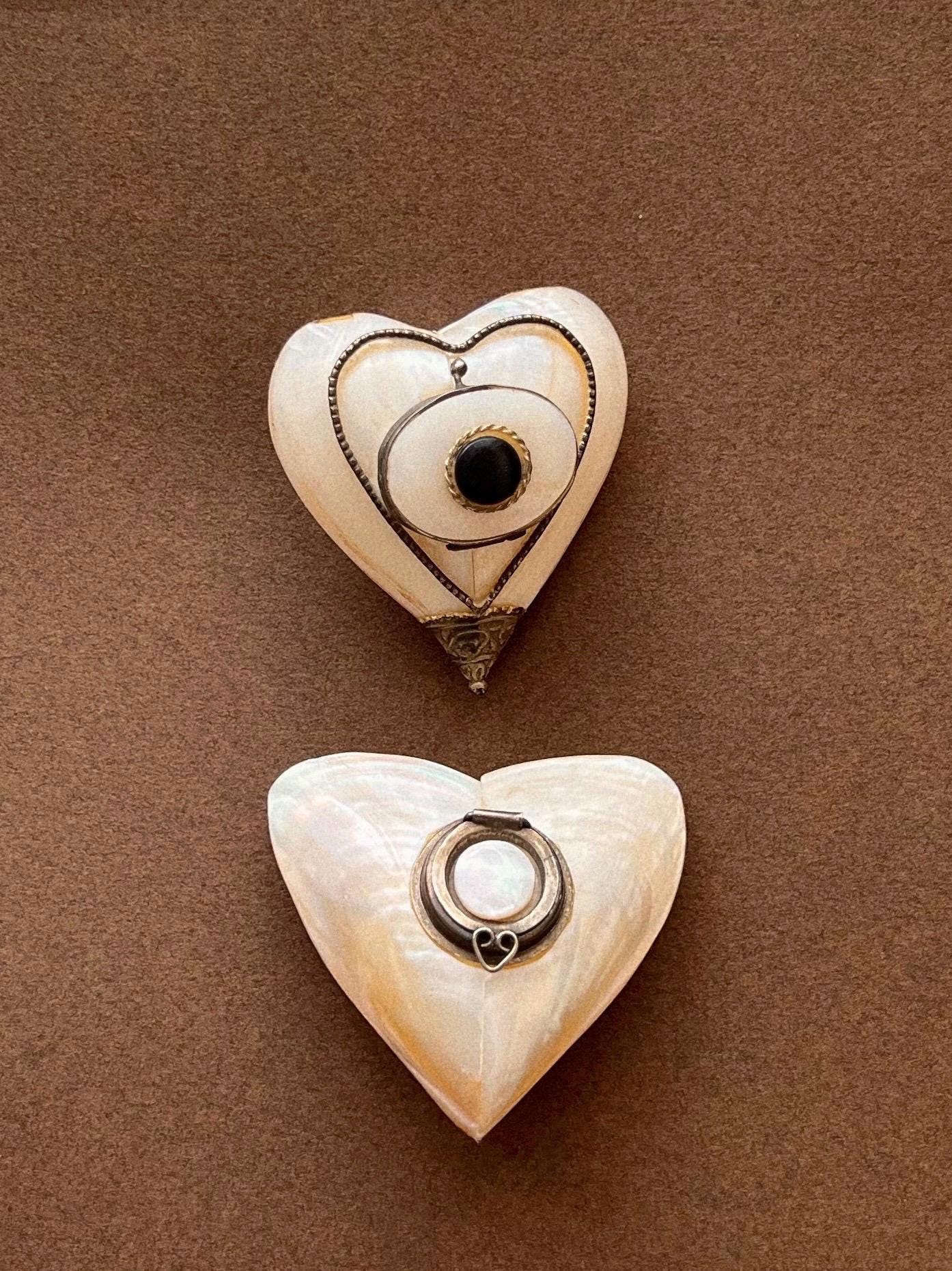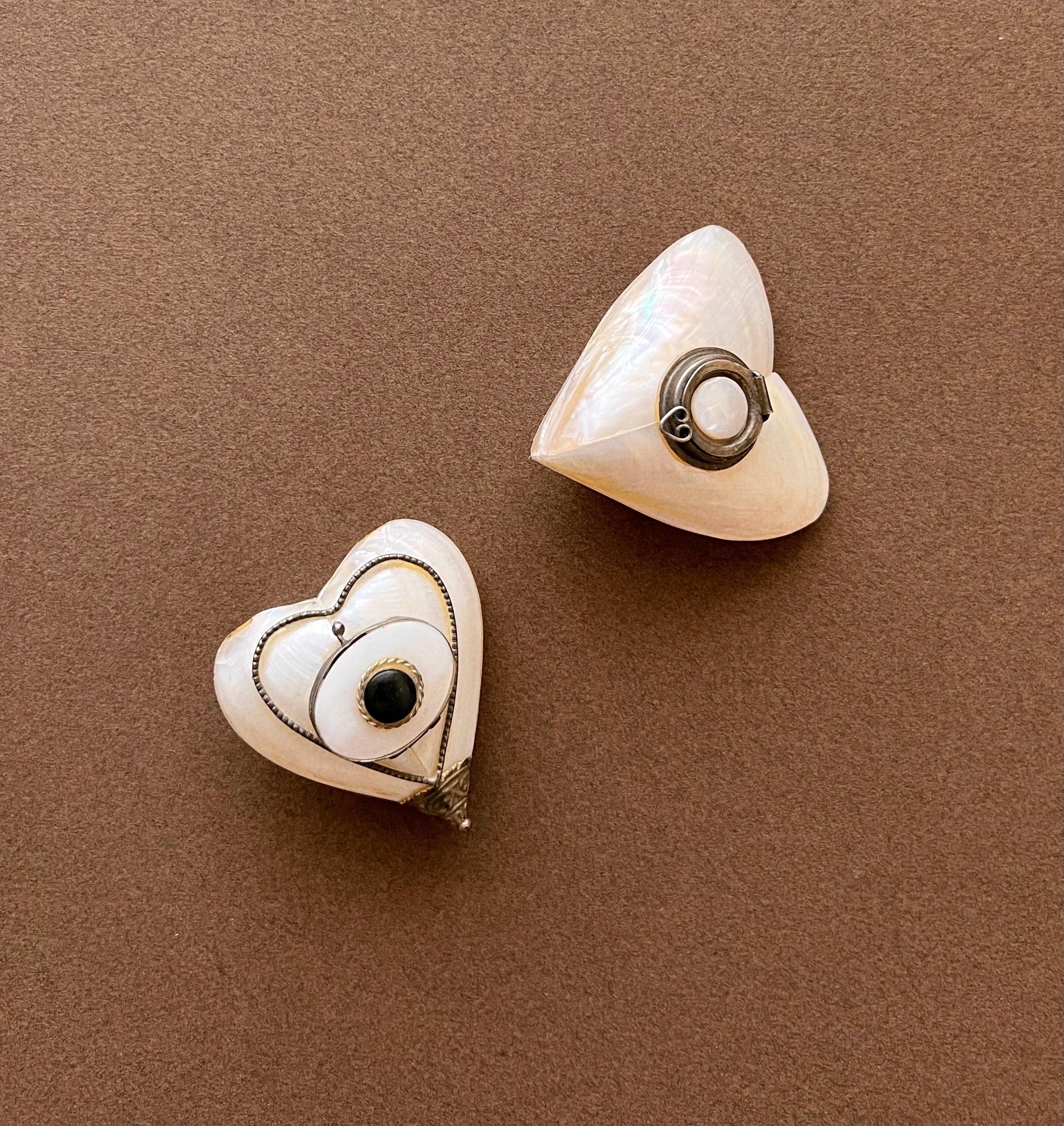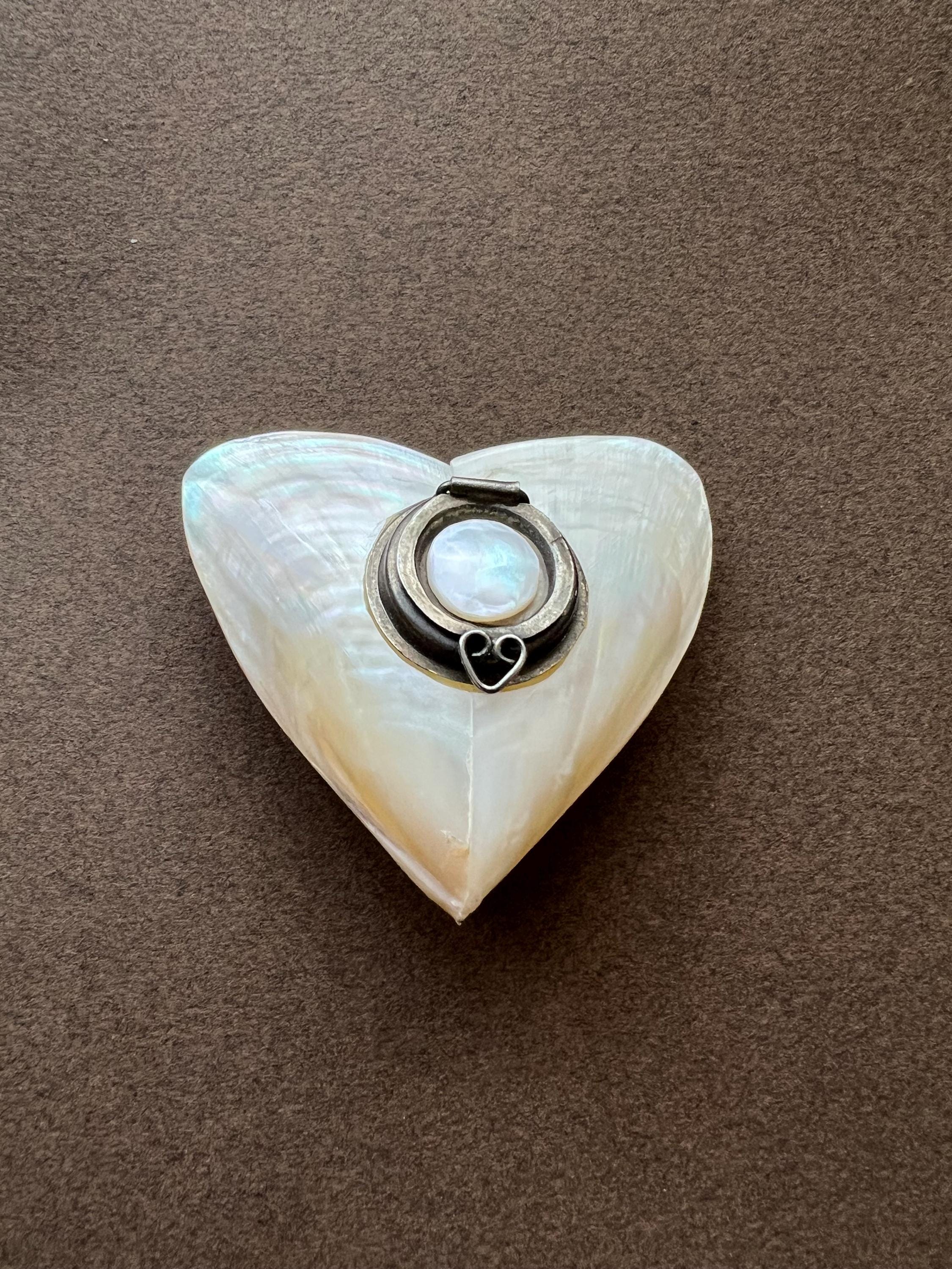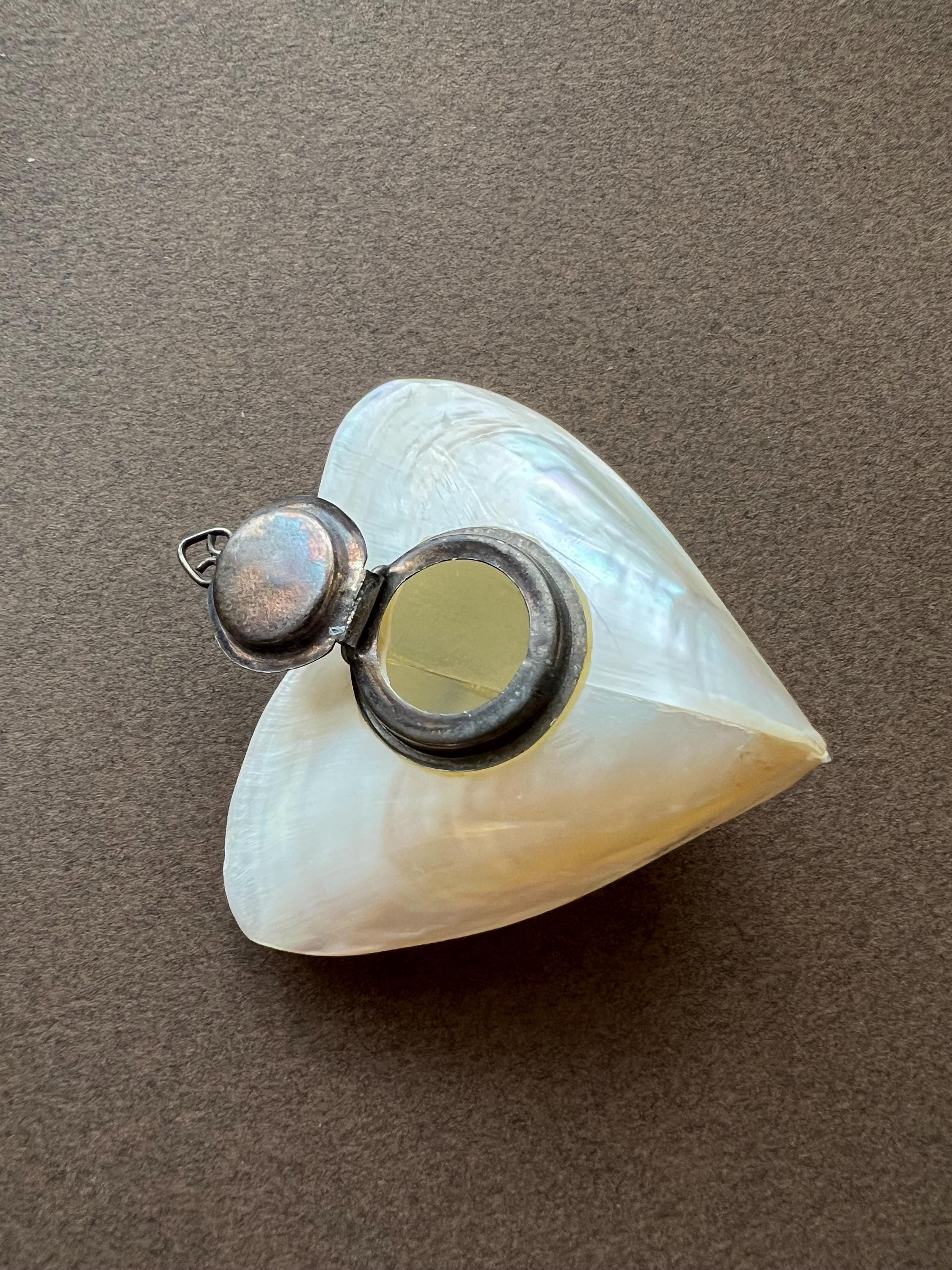 This rare antique heart-shaped container is crafted from mother-of-pearl, framed in metal. It can be used as a keepsake holder for tiny treasures or a pillbox. Likely dating from the late 19th to early 20th century and sourced in Spain, it is a truly special find for any collector.
