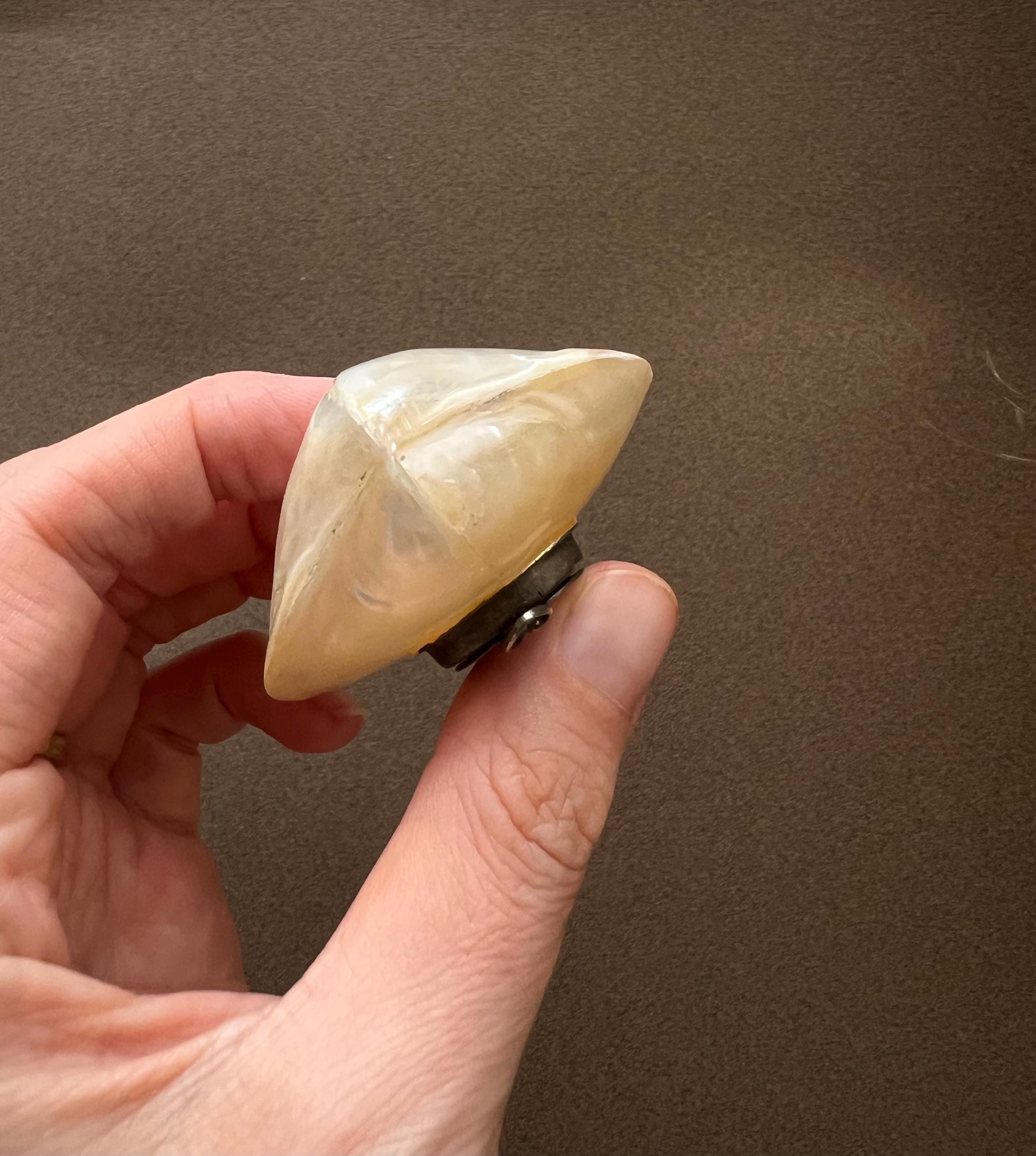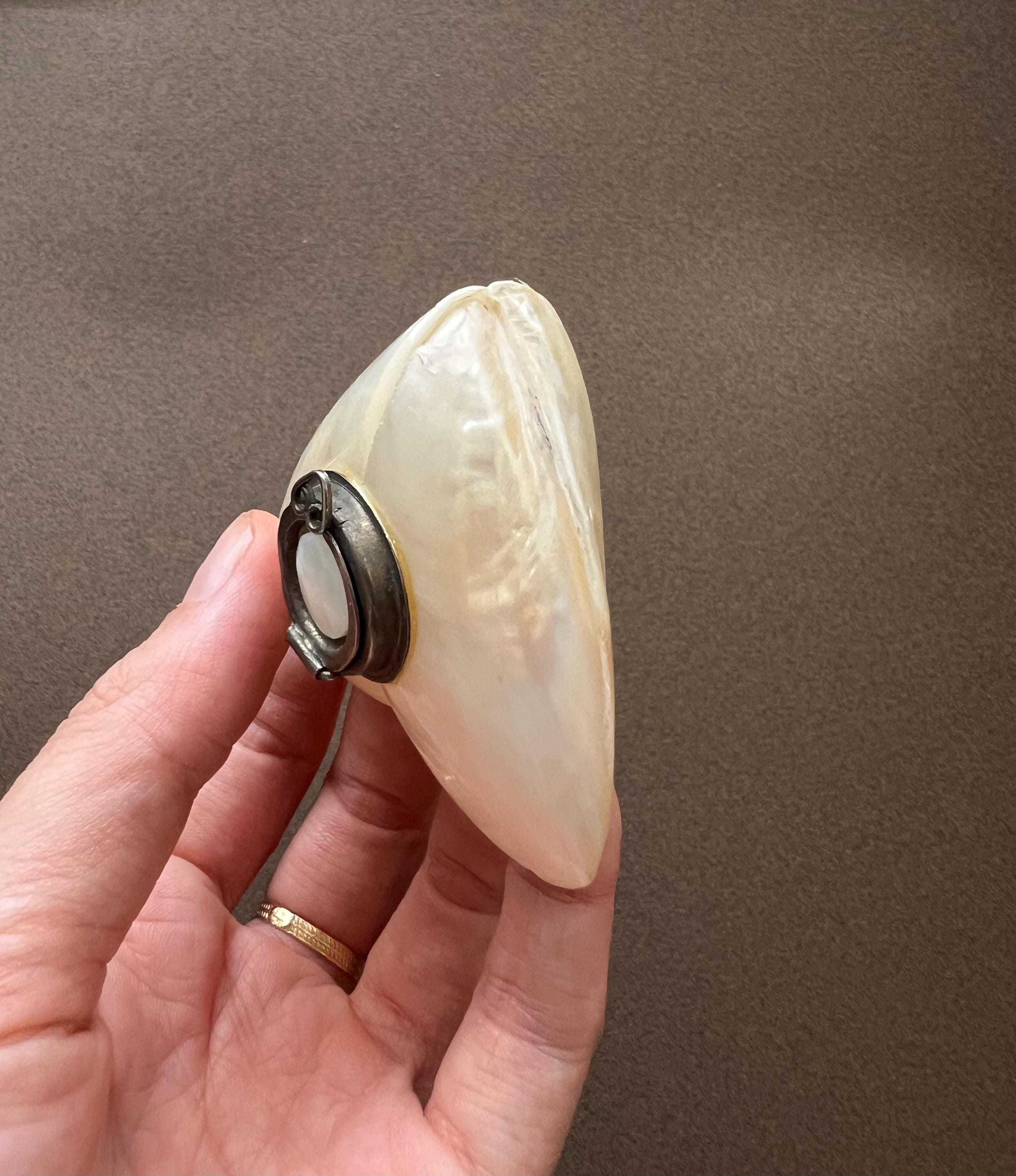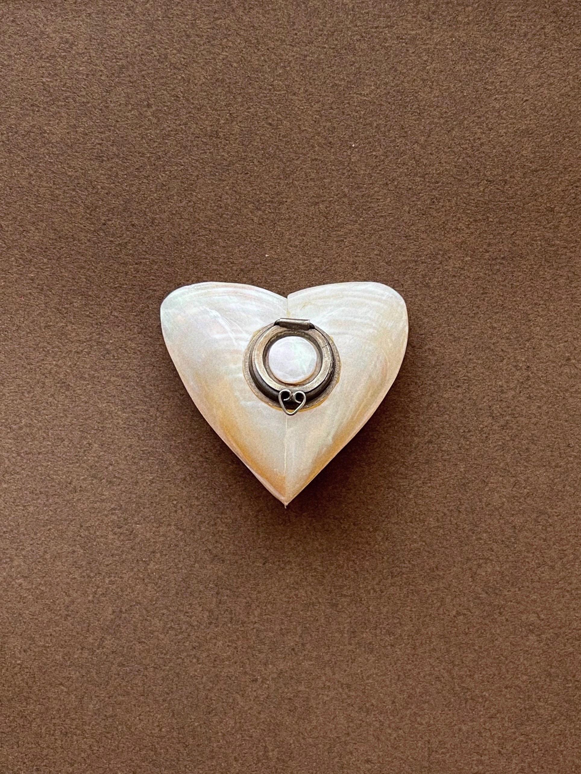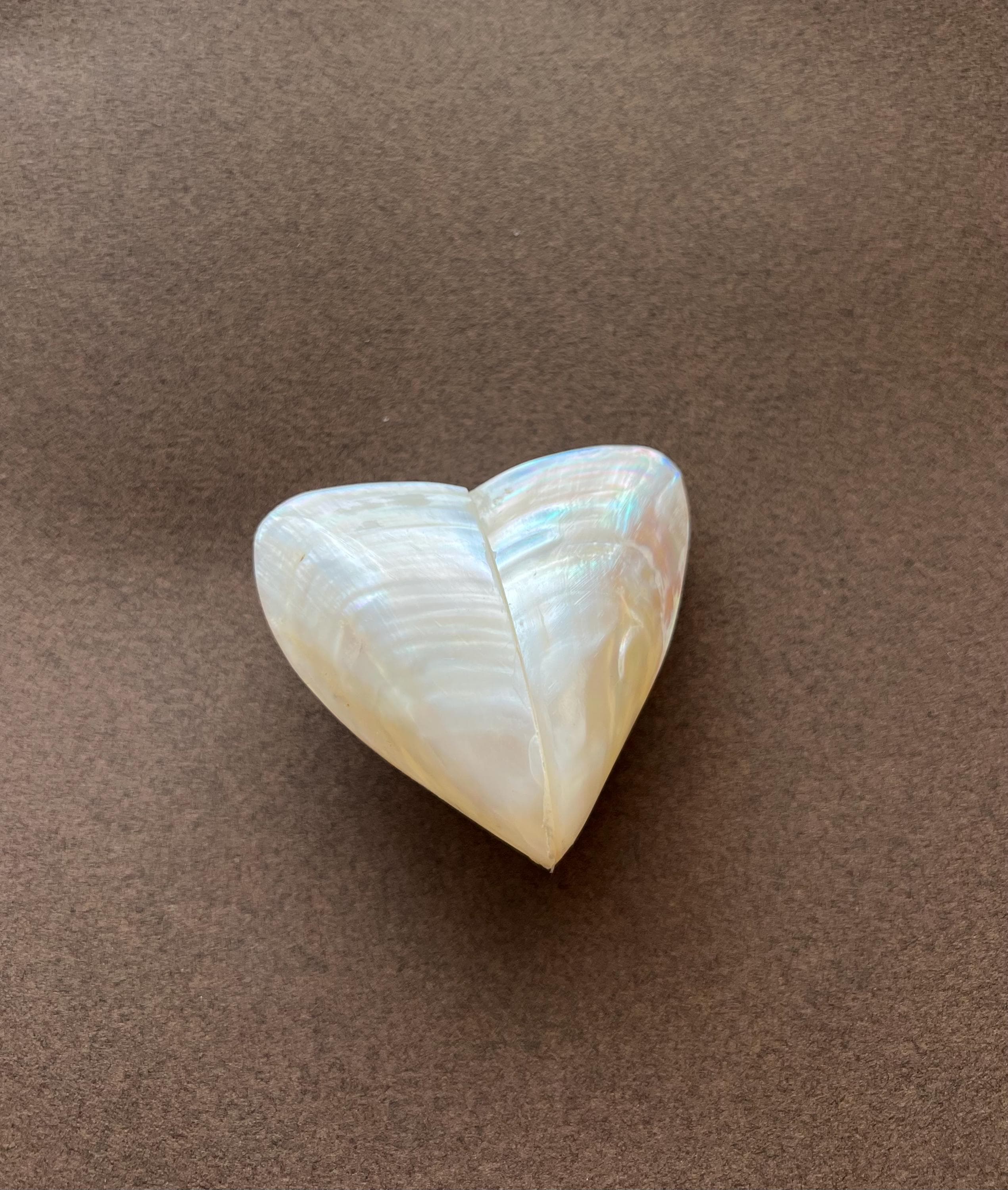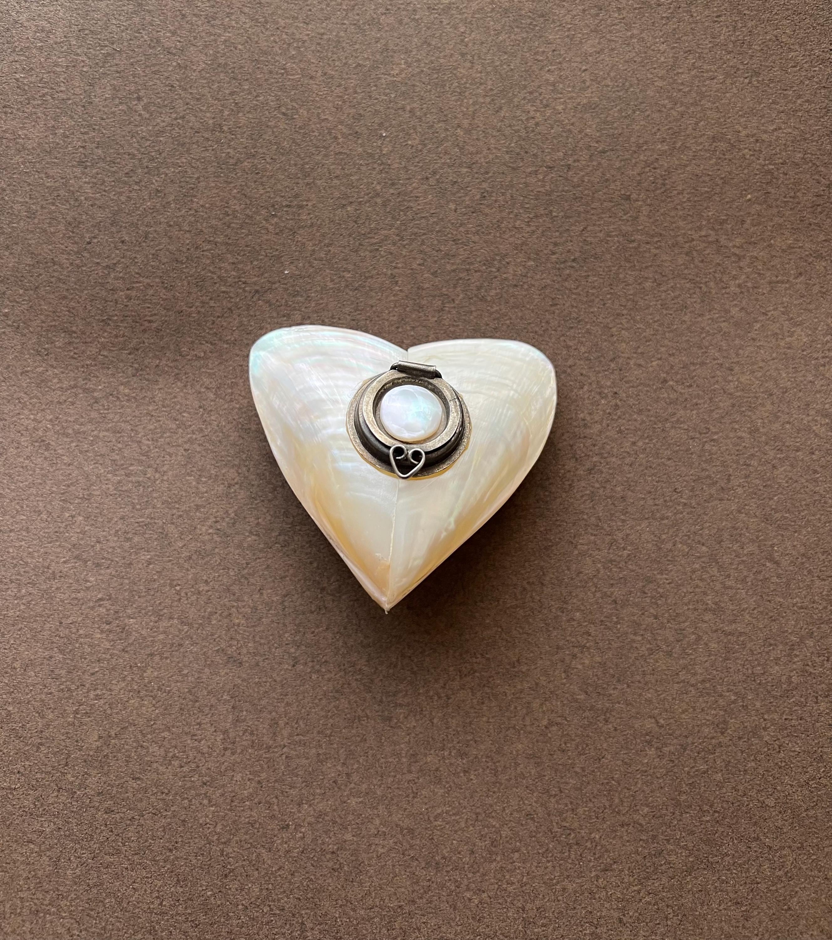 This rare antique heart-shaped container is crafted from mother-of-pearl, framed in metal. It can be used as a keepsake holder for tiny treasures or a pillbox. Likely dating from the late 19th to early 20th century and sourced in Spain, it is a truly special find for any collector.