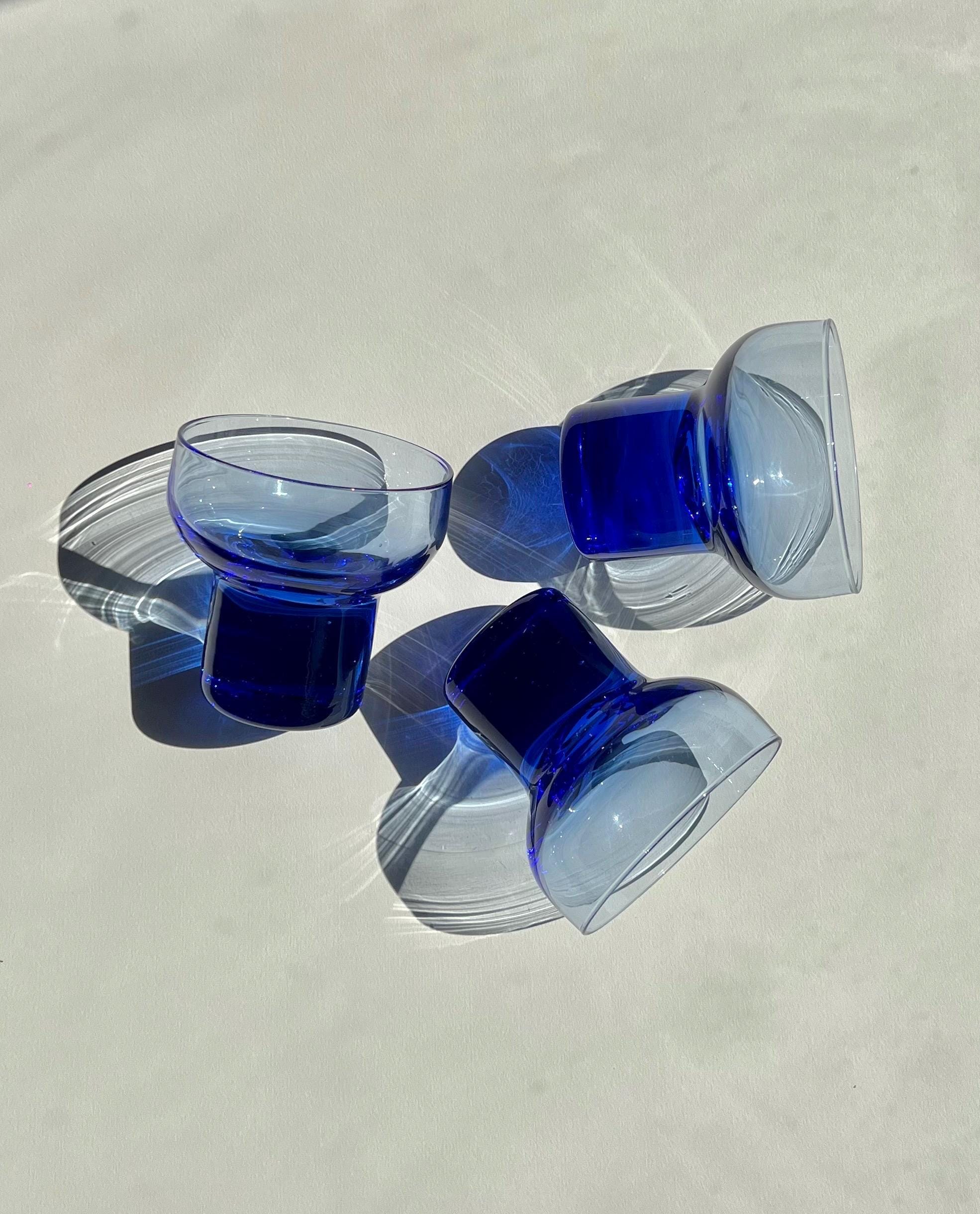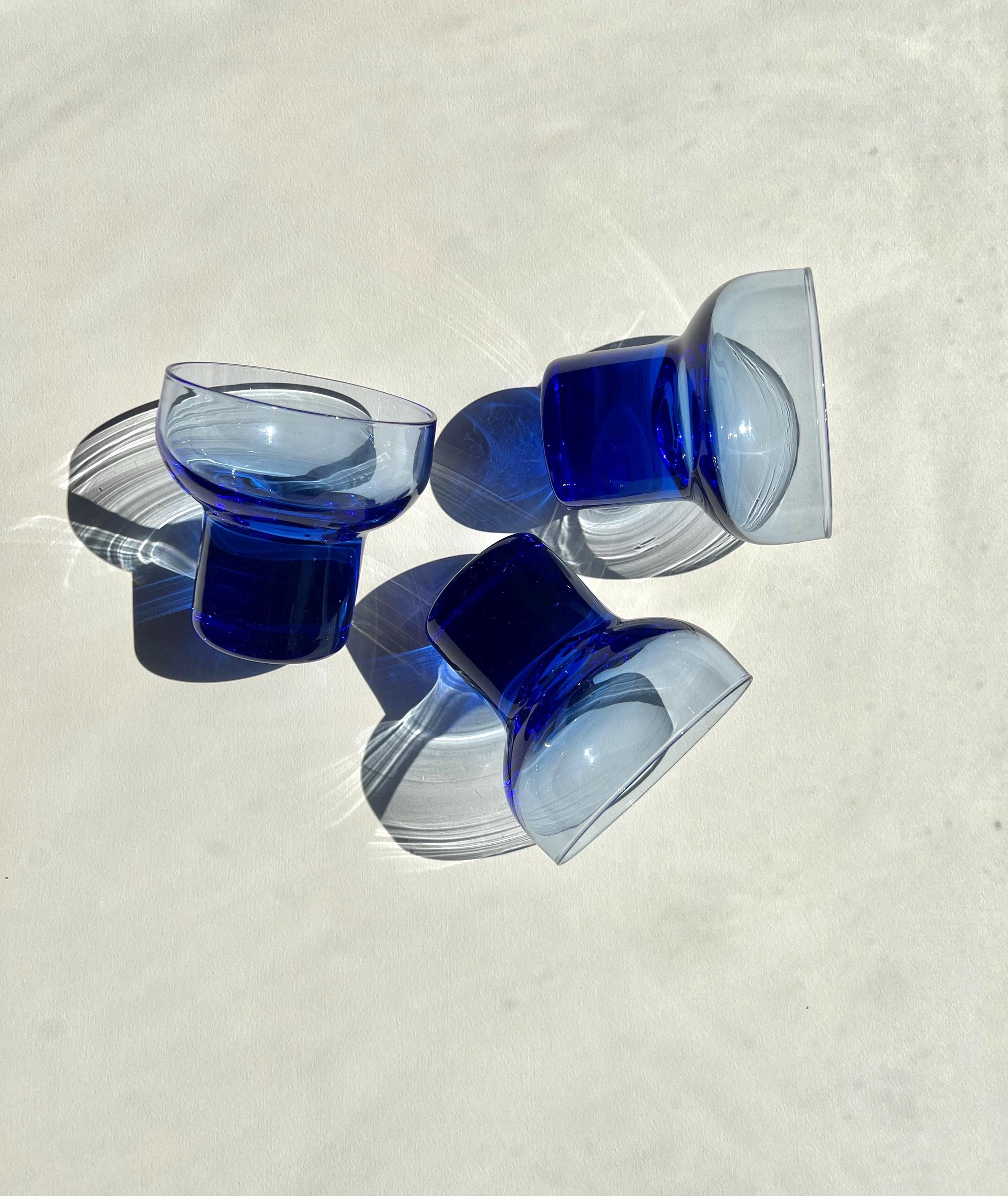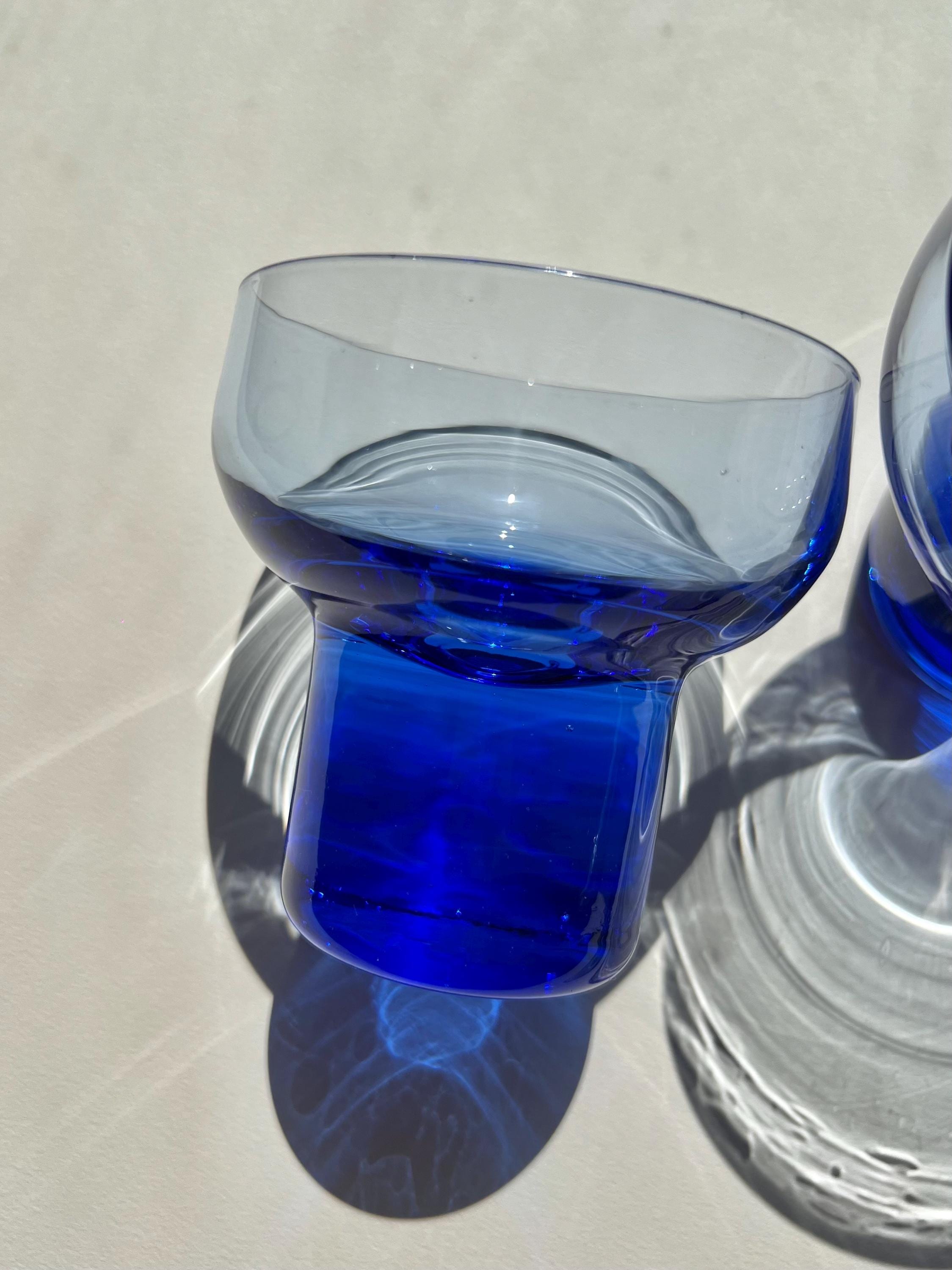 This set of vintage Italian glasses features a bold cobalt blue base and stem that immediately catches the eye. With their weighty feel and modernist silhouette, they are as versatile as they are beautiful, perfect for cocktails, wine, aperitifs, or even sparkling water.