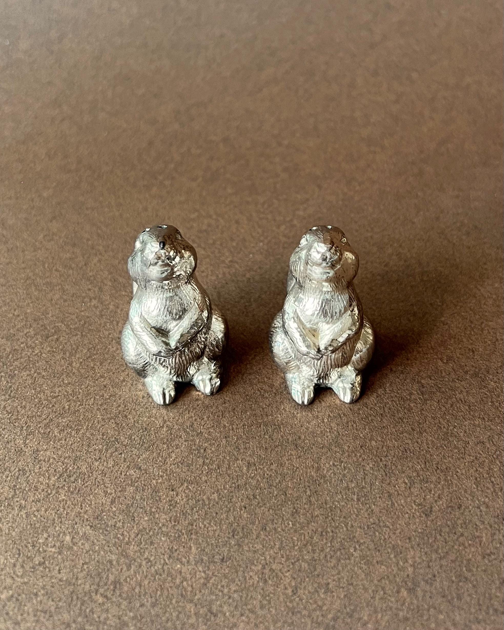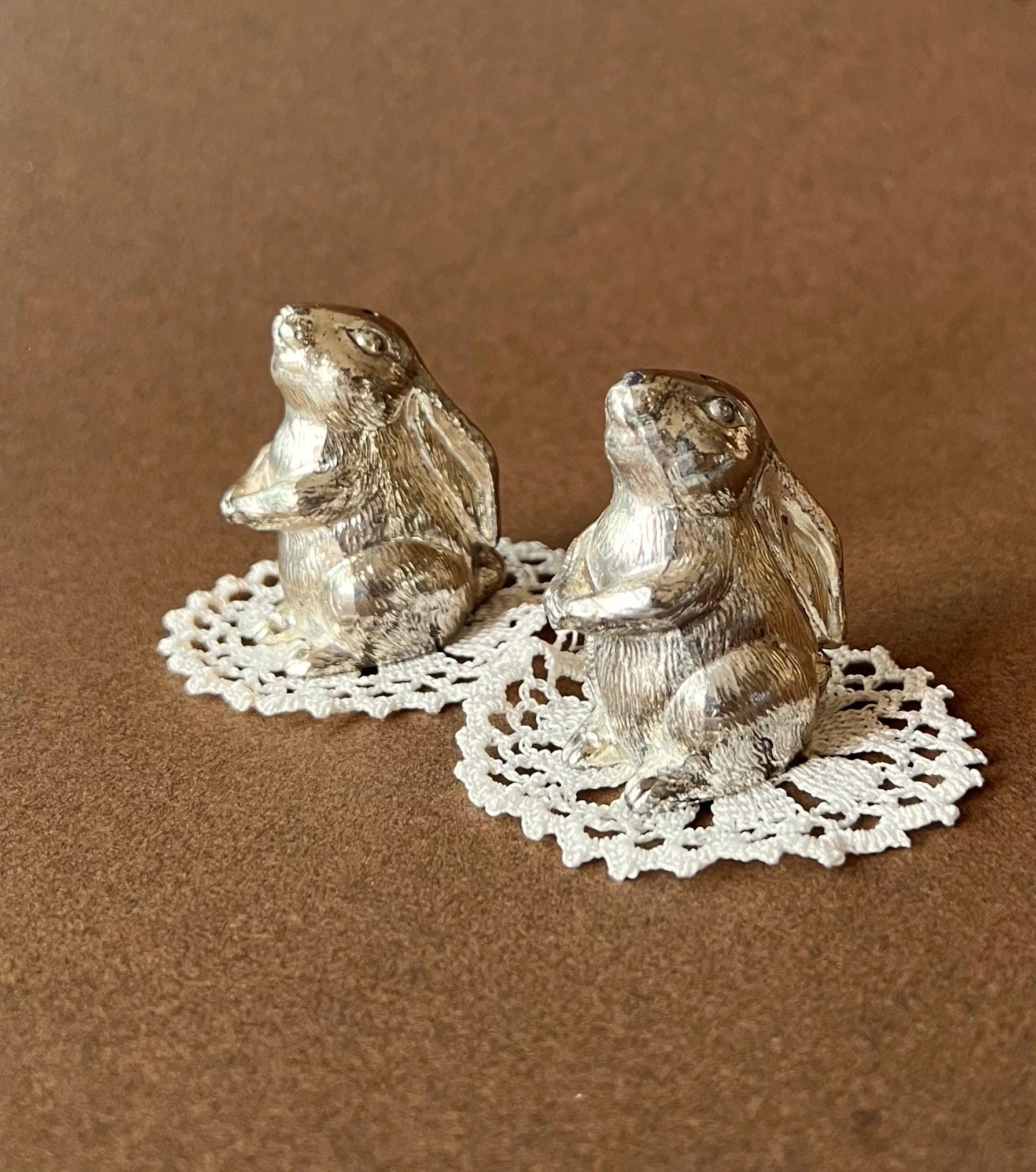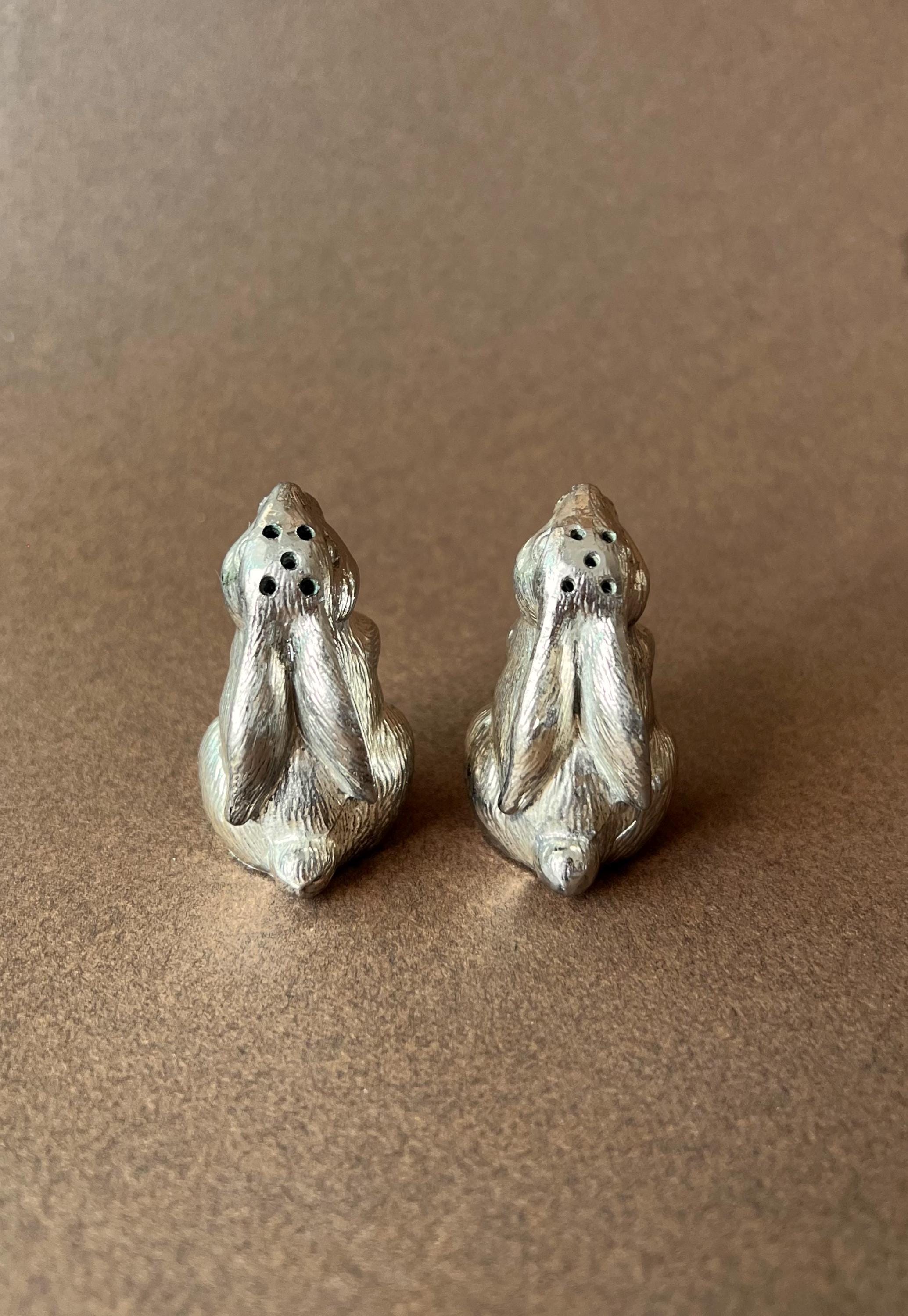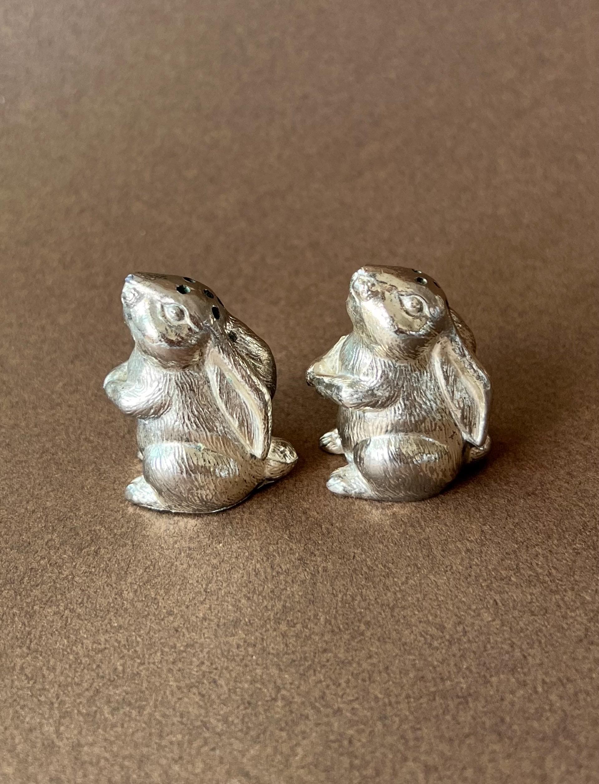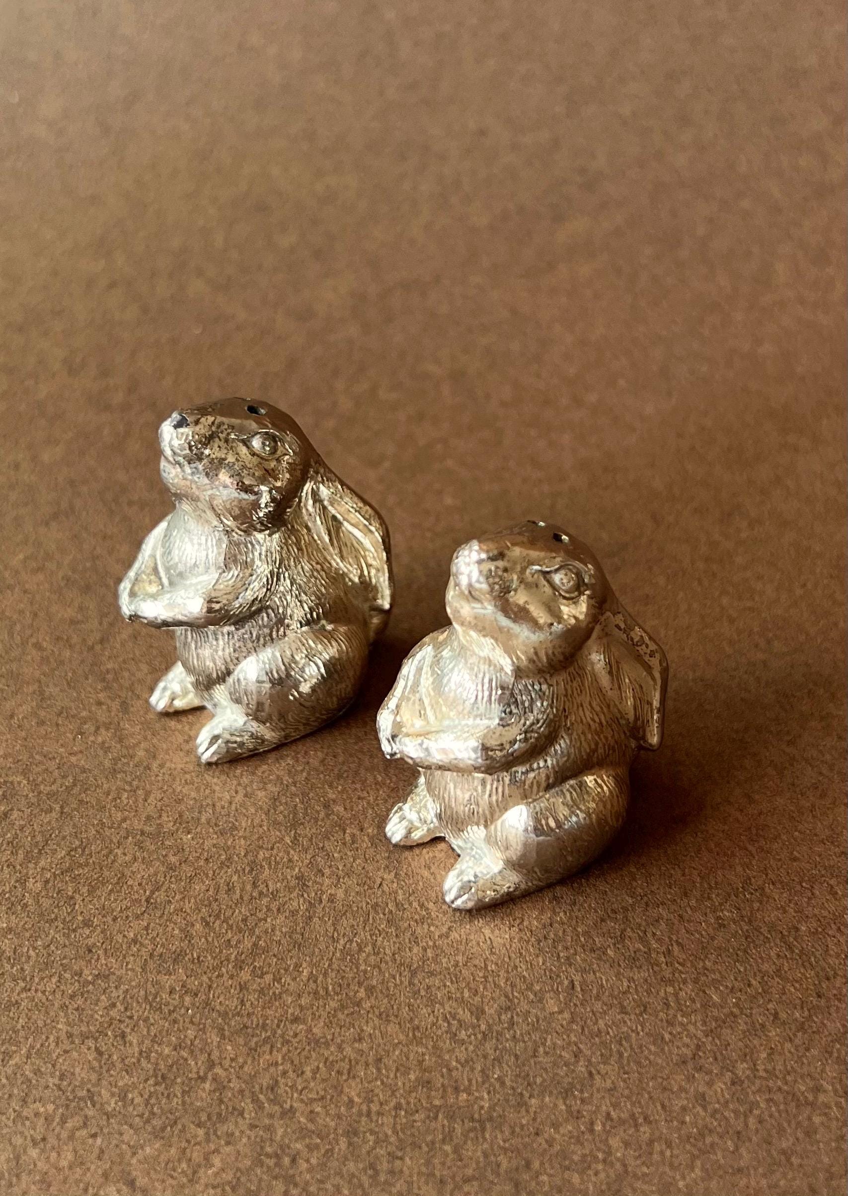 Vintage silver bunny shaped salt and pepper shakers, sourced in Spain.