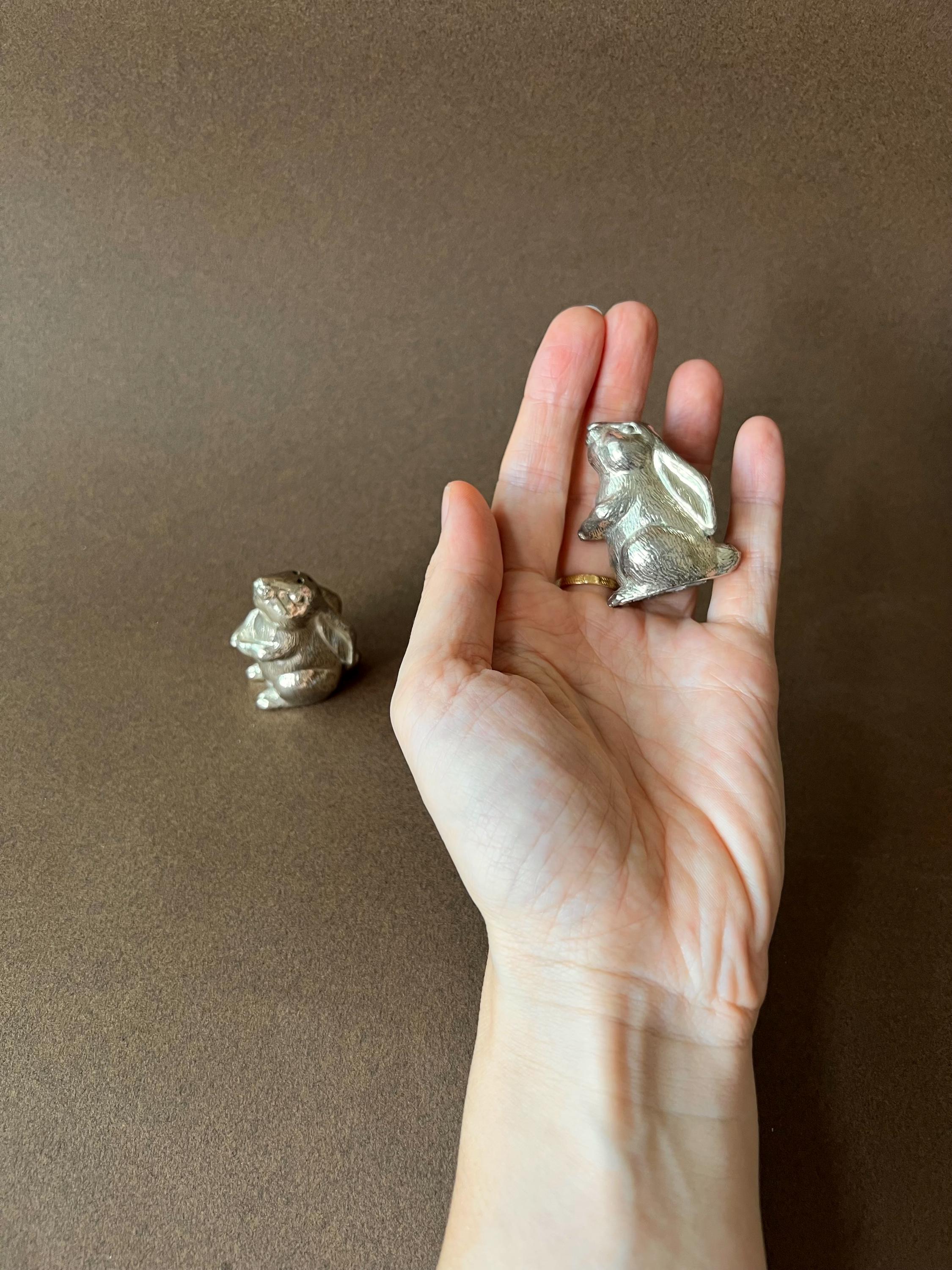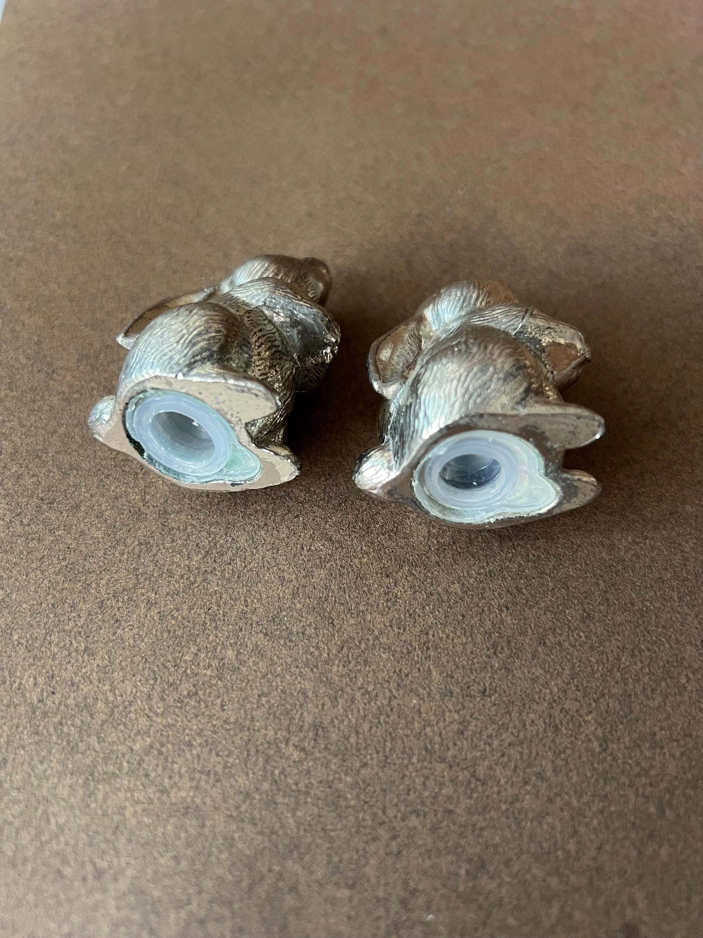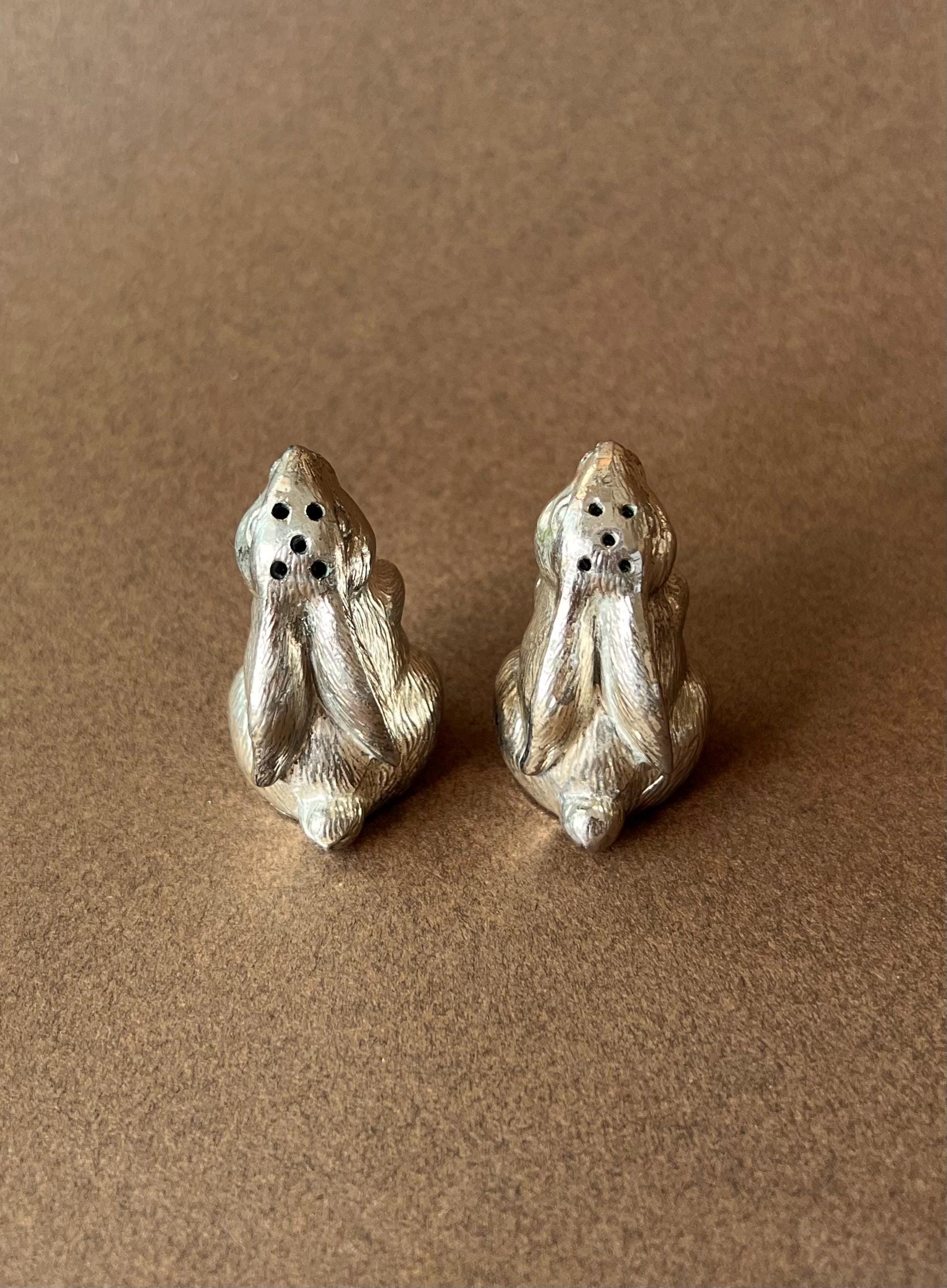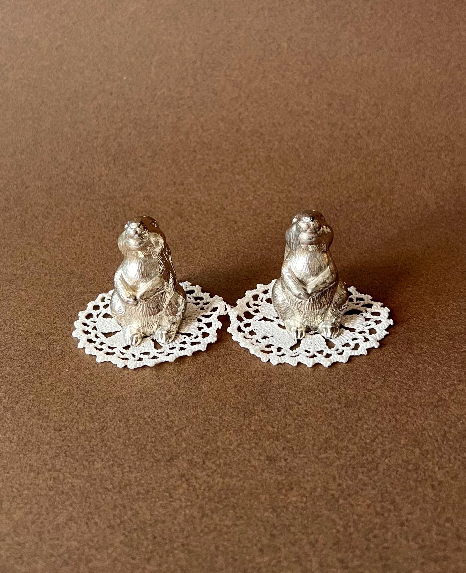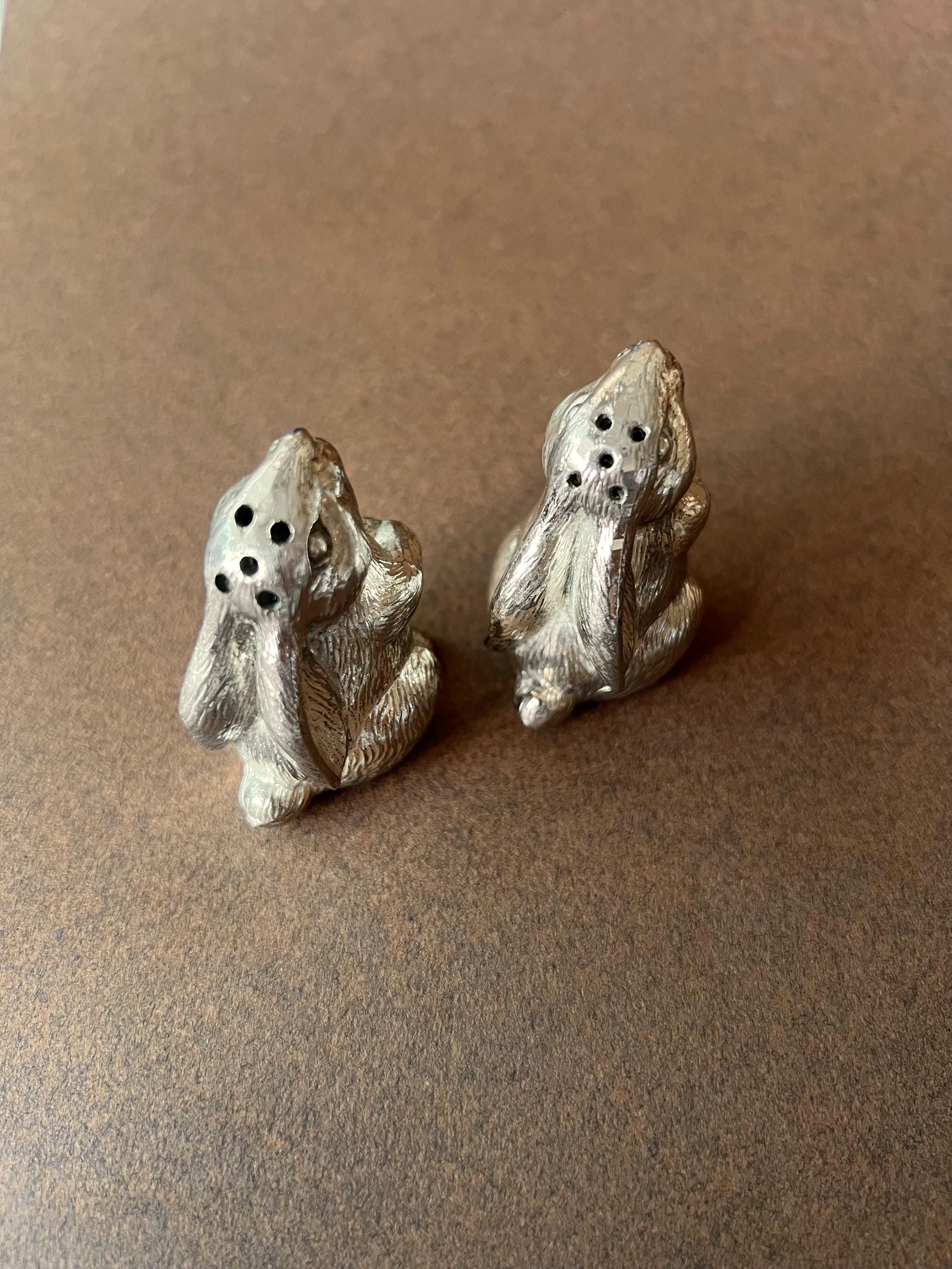 Vintage silver bunny shaped salt and pepper shakers, sourced in Spain.