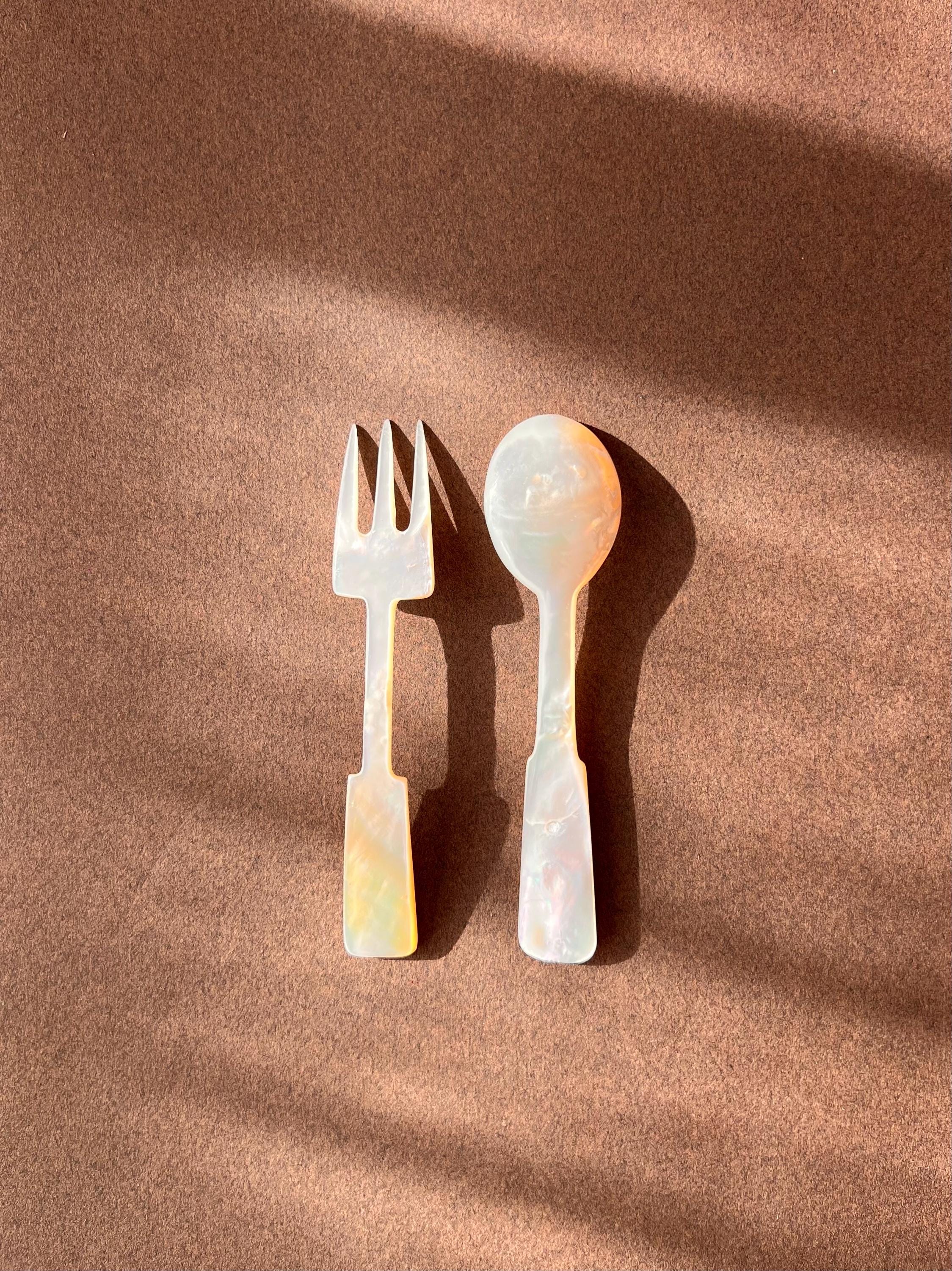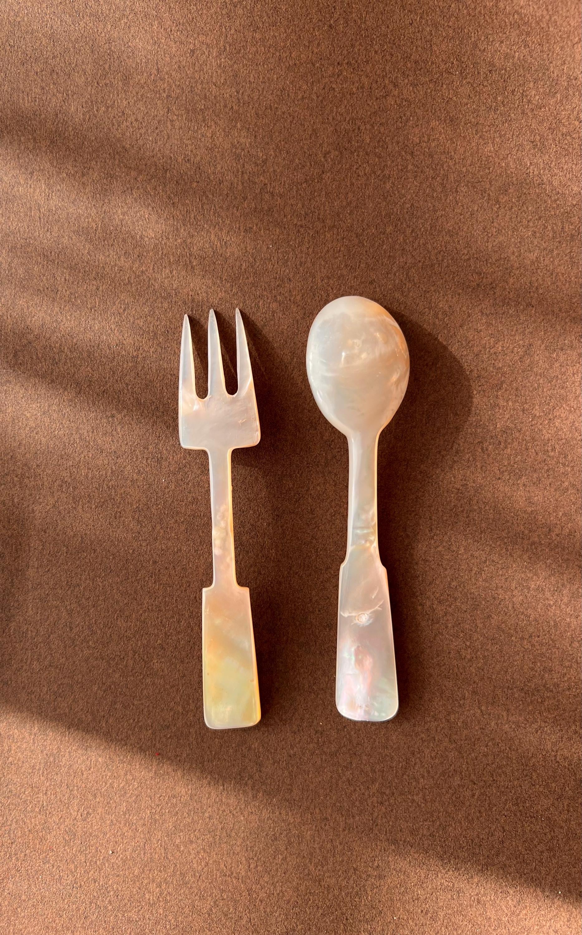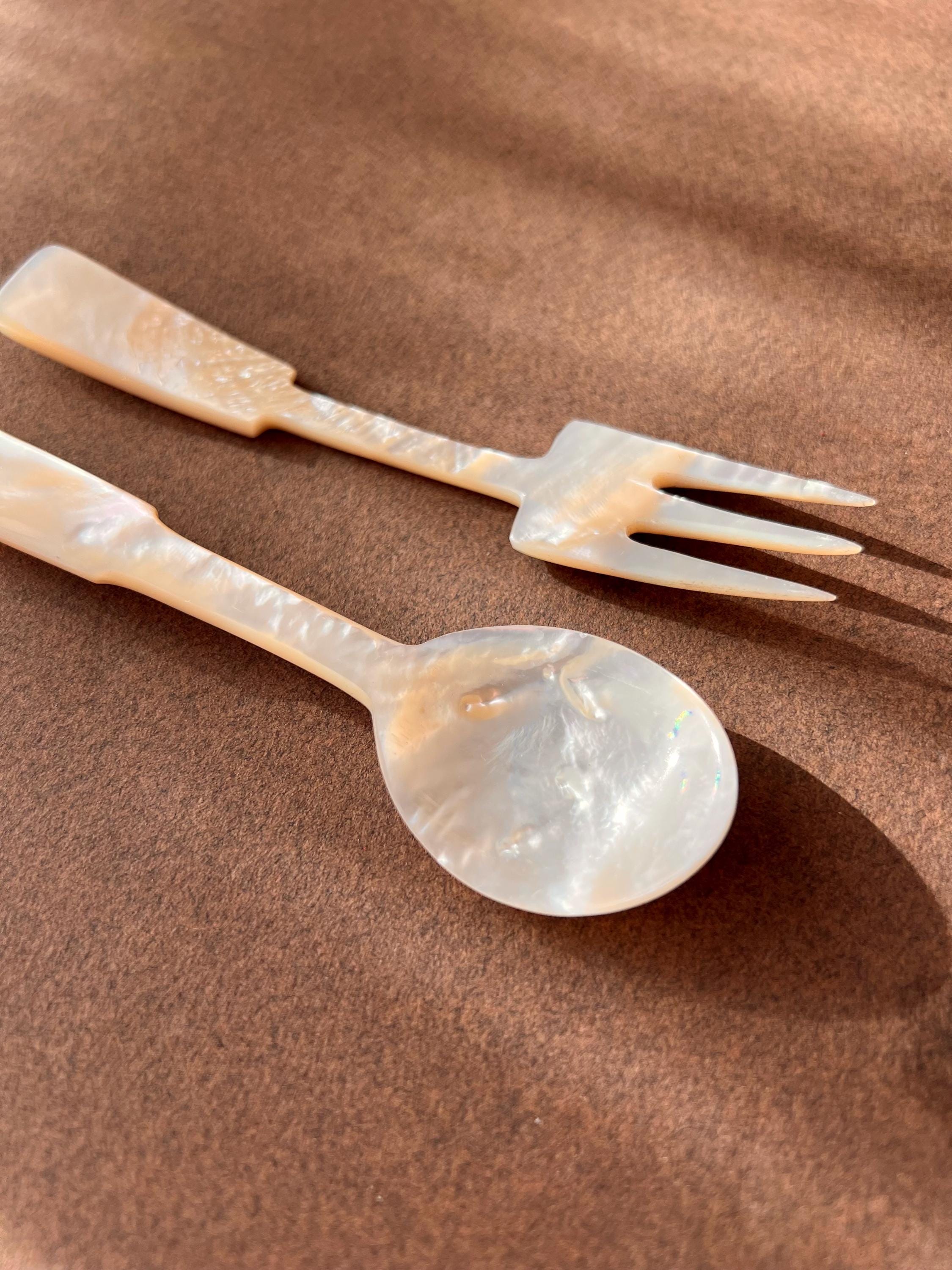 This hand carved set features a spoon and fork in mother-of-pearl. Ideal for entertaining, styling, or gifting to a vintage lover.