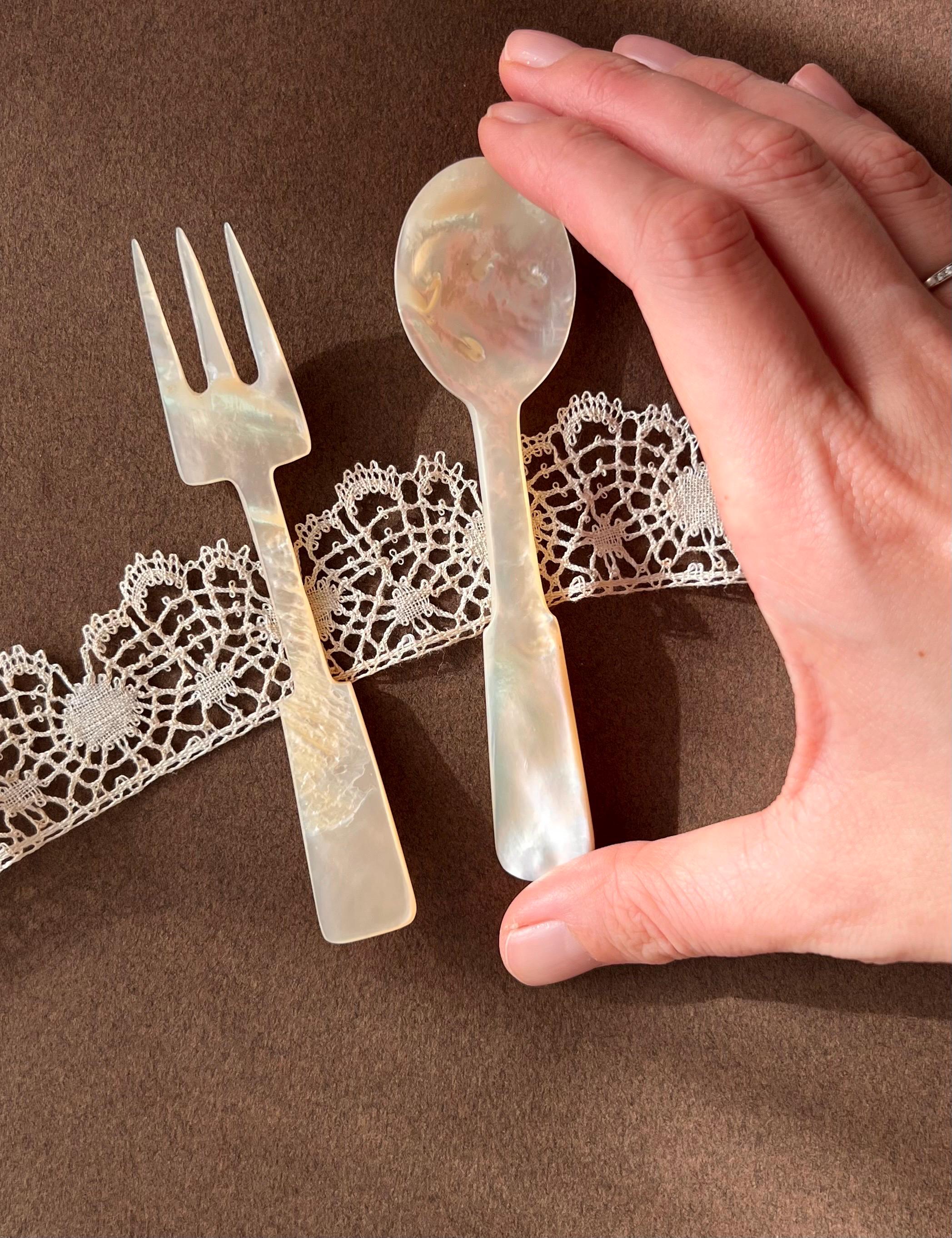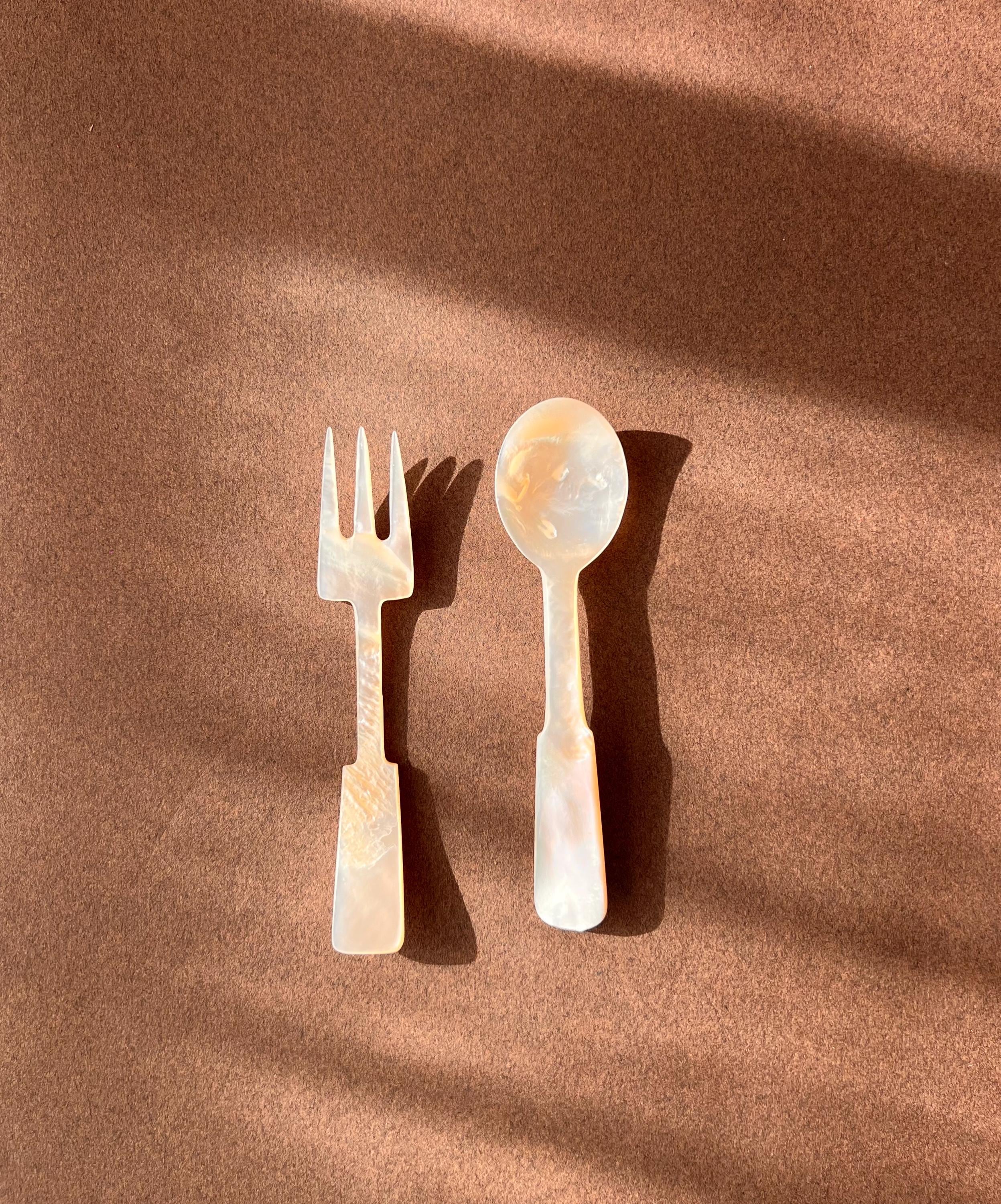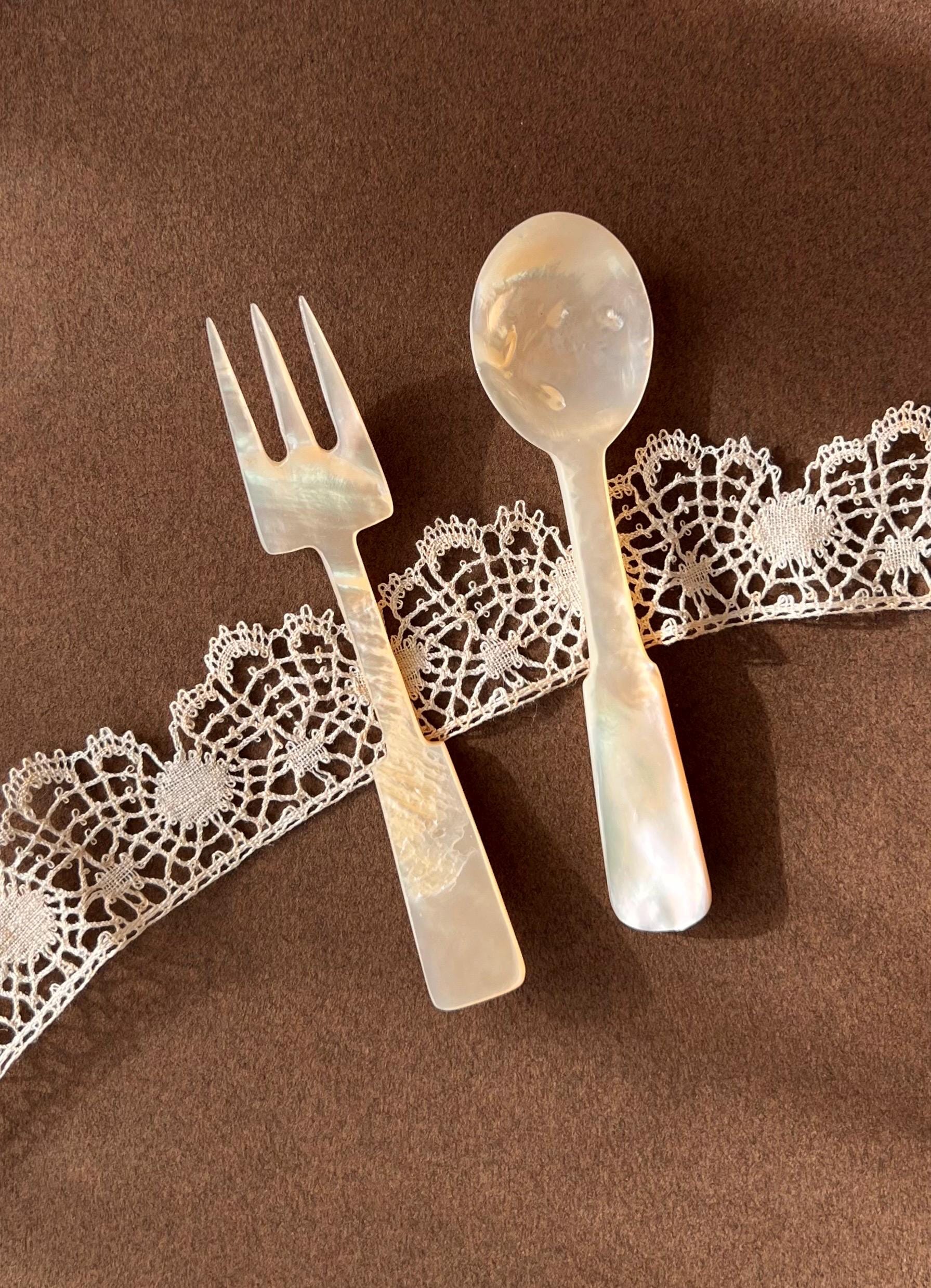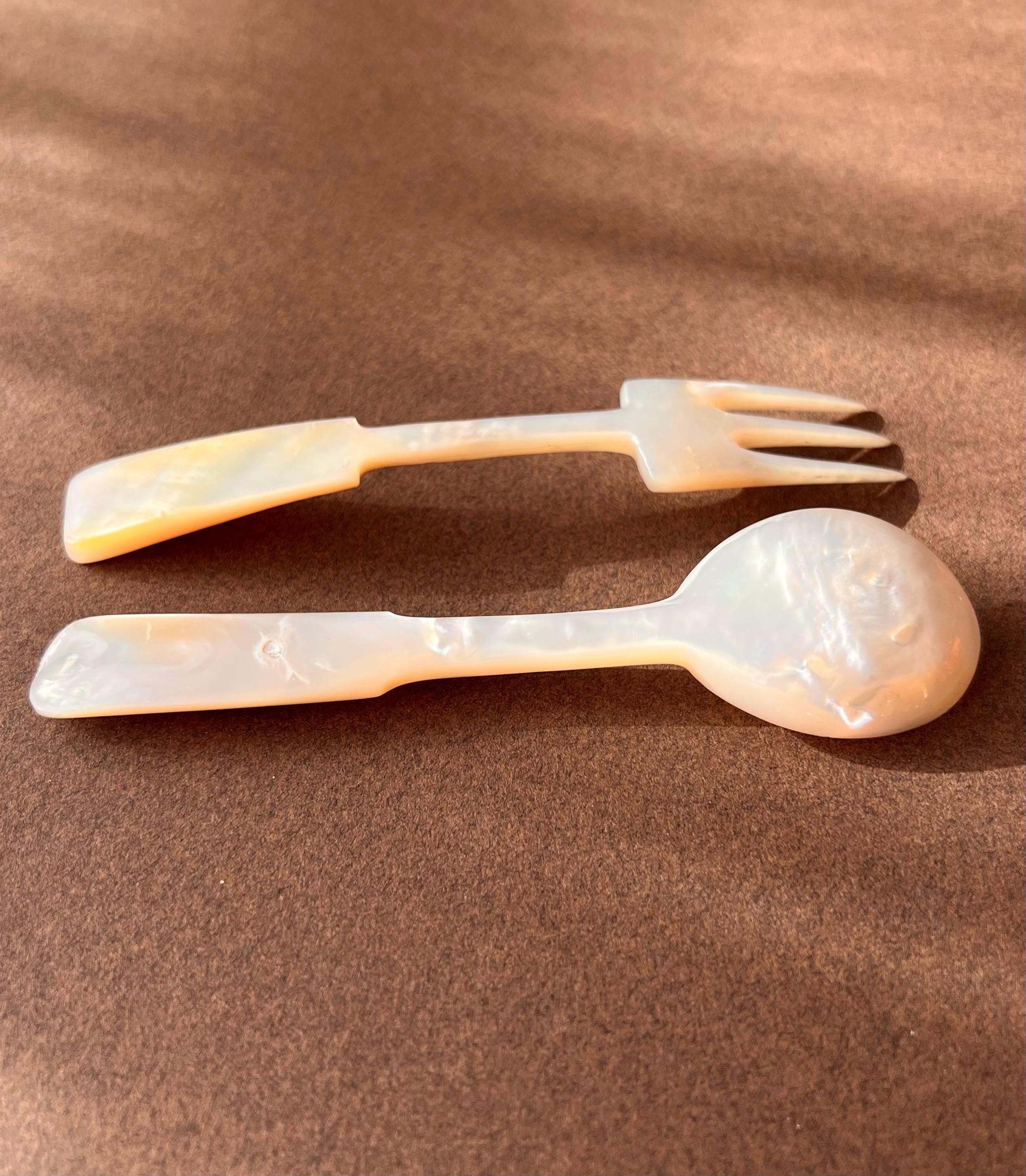 This hand carved set features a spoon and fork in mother-of-pearl. Ideal for entertaining, styling, or gifting to a vintage lover.