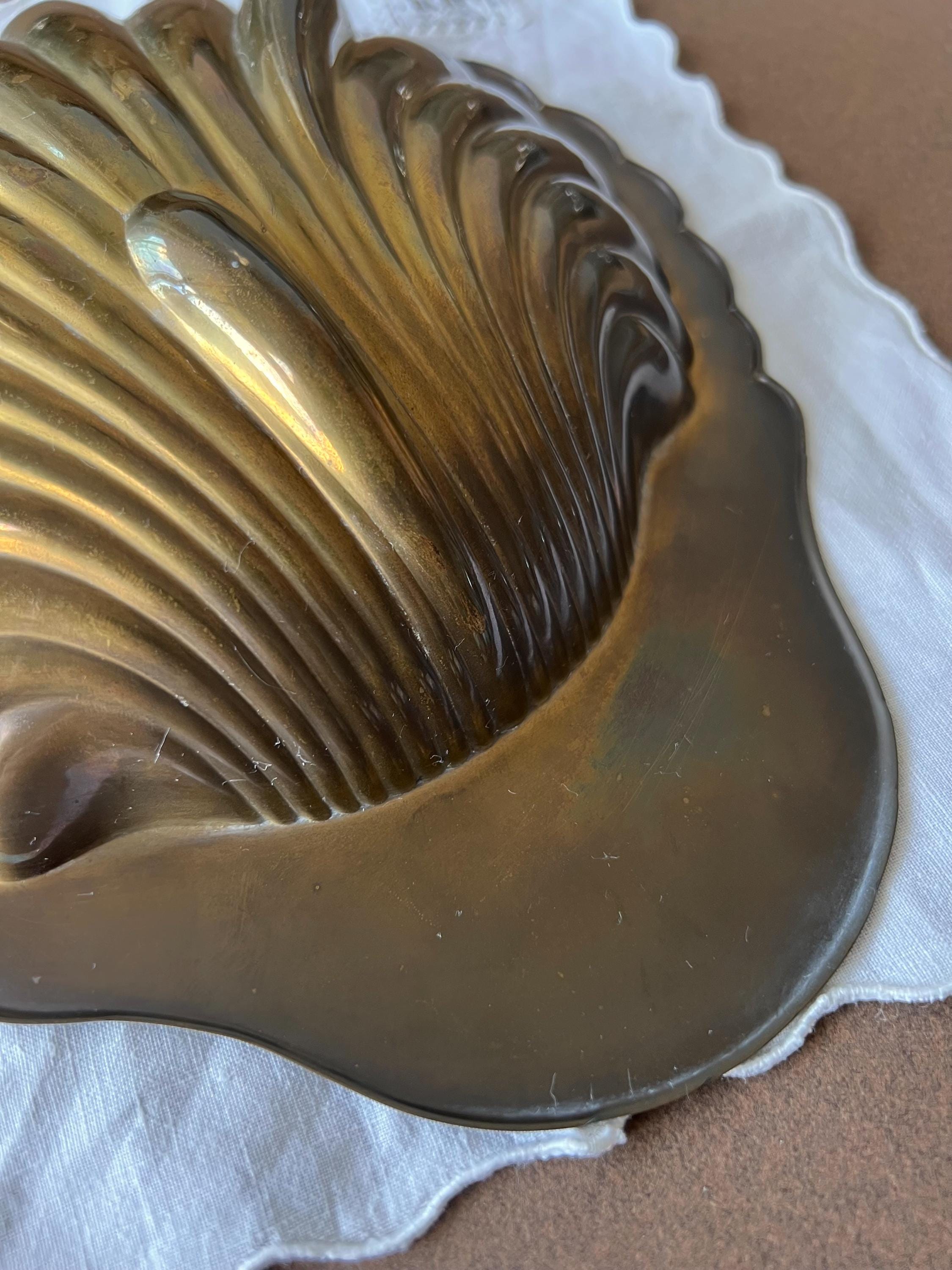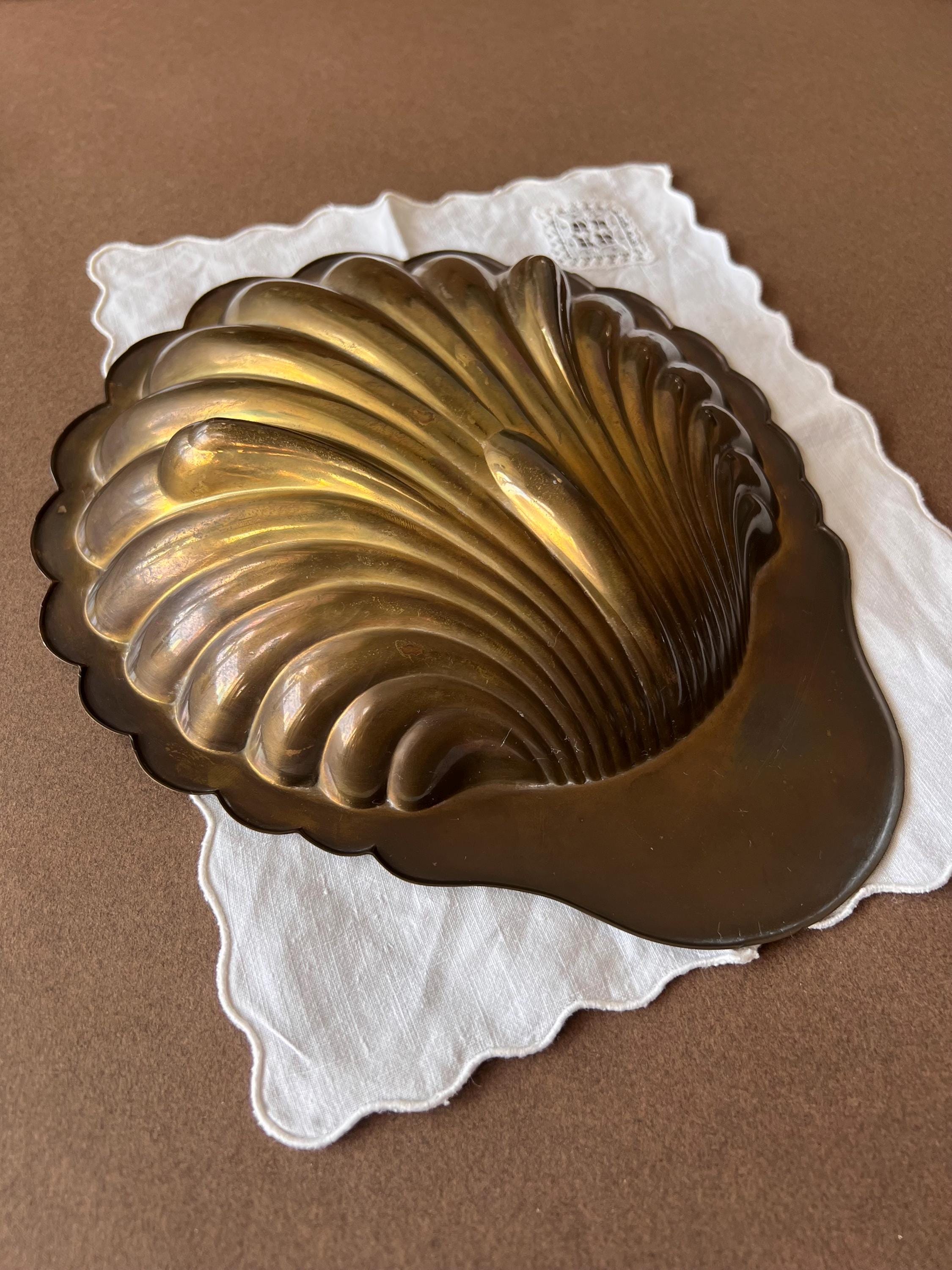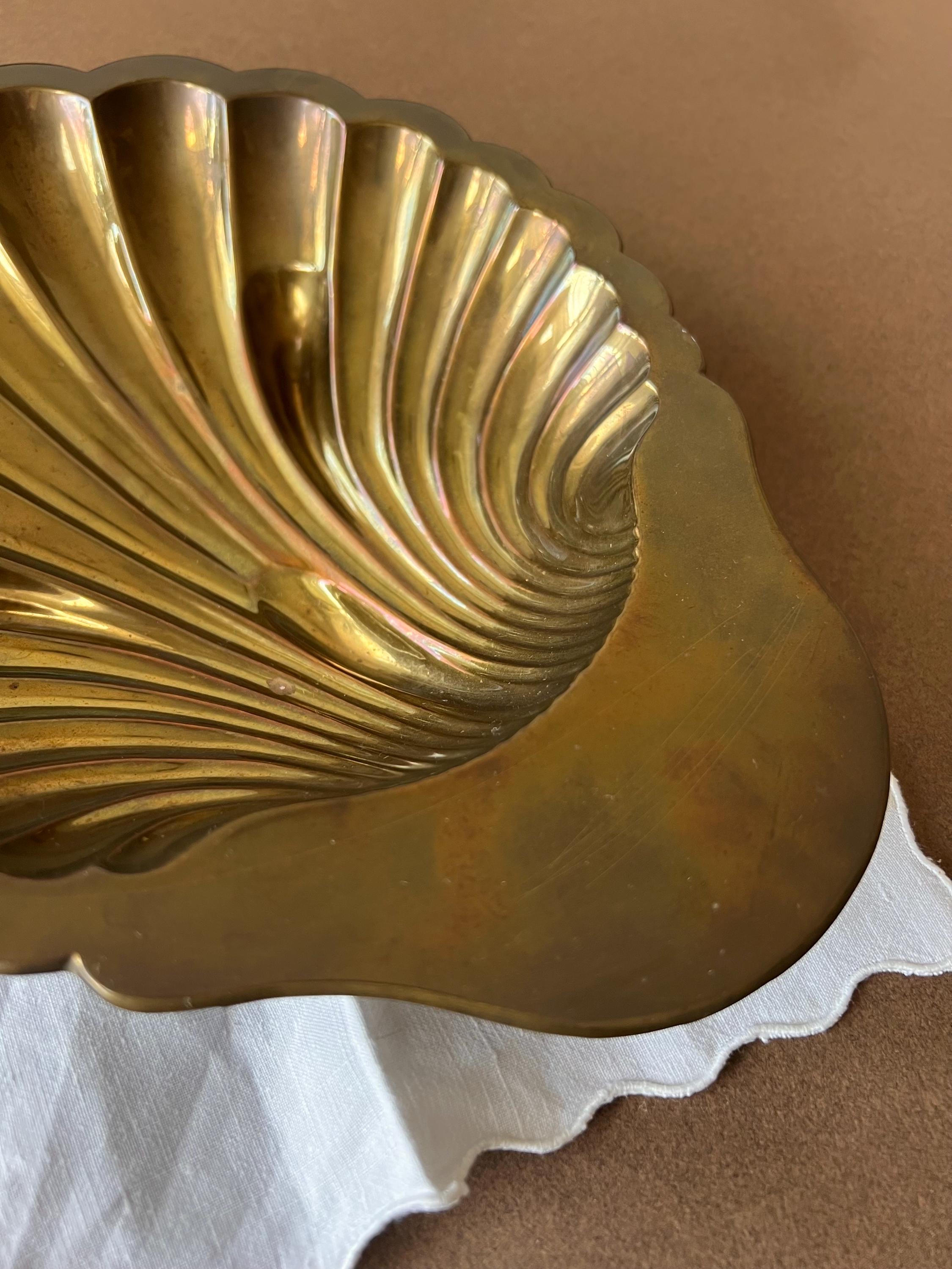 This vintage brass shell dish is a beautiful piece, perfect for adding a touch of mid century decor to any home. The dish features a classic scallop (or clam) shell shape and a polished golden finish that catches the light beautifully. Sourced in Spain.