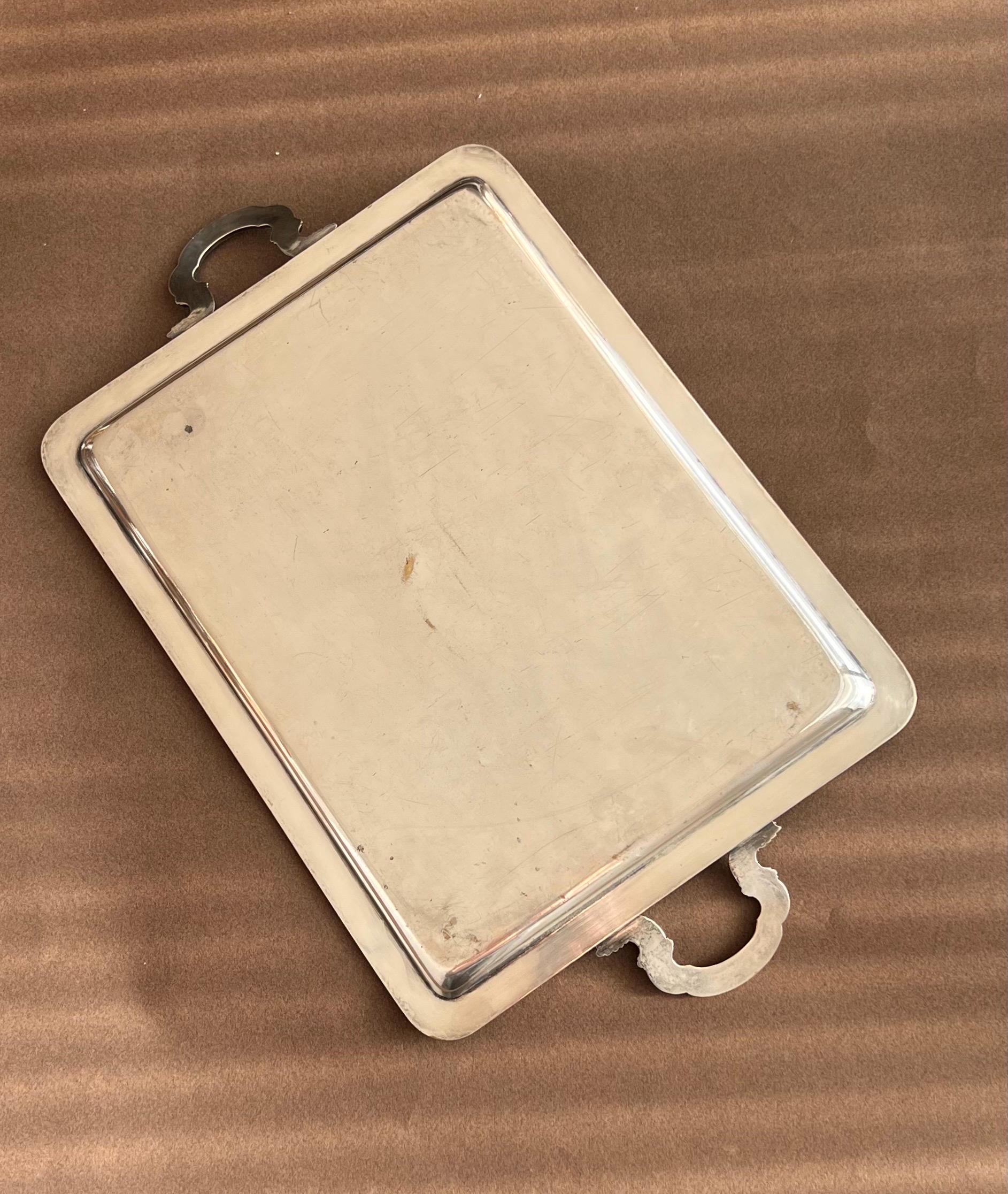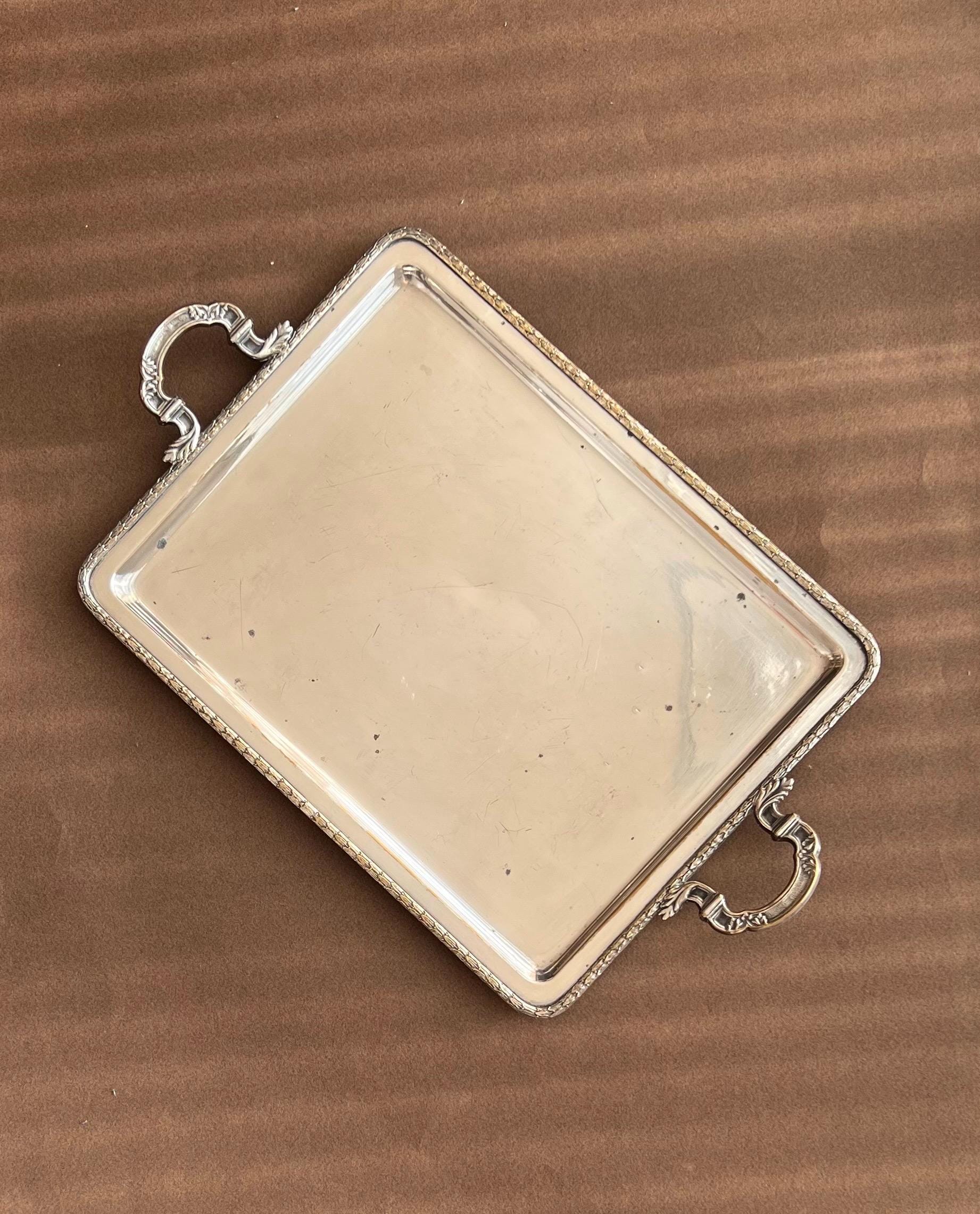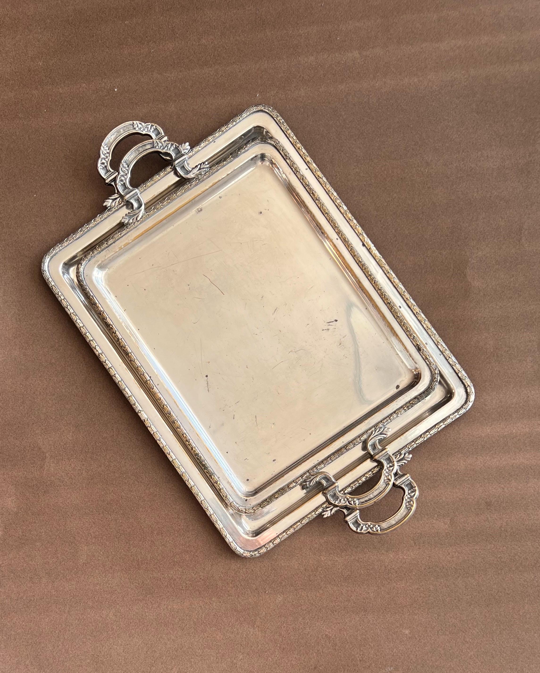 Vintage rectangular trays sourced in Spain. Crafted from silver tone metal, these trays feature a classic design with ornate handles and a finely detailed rim.