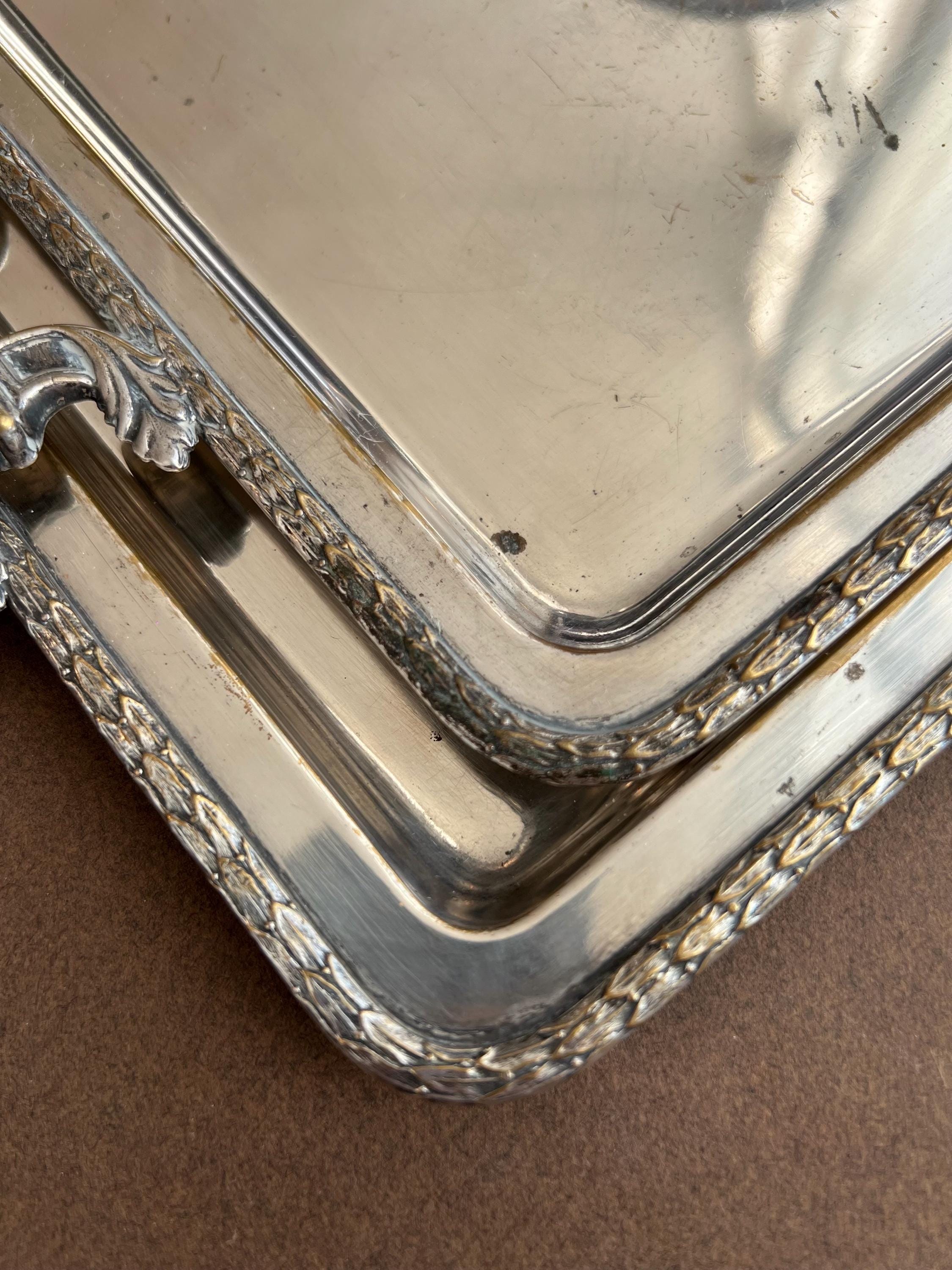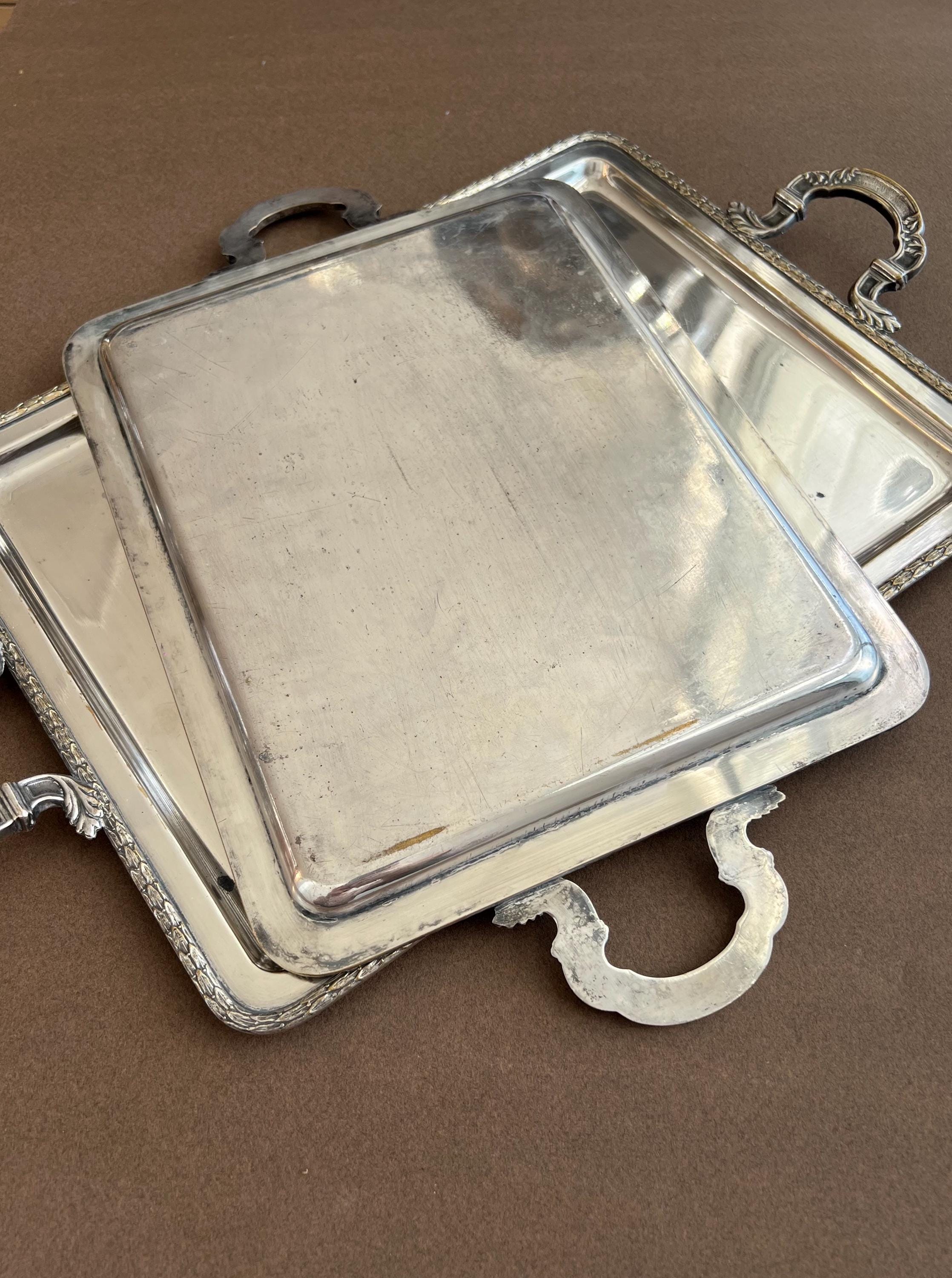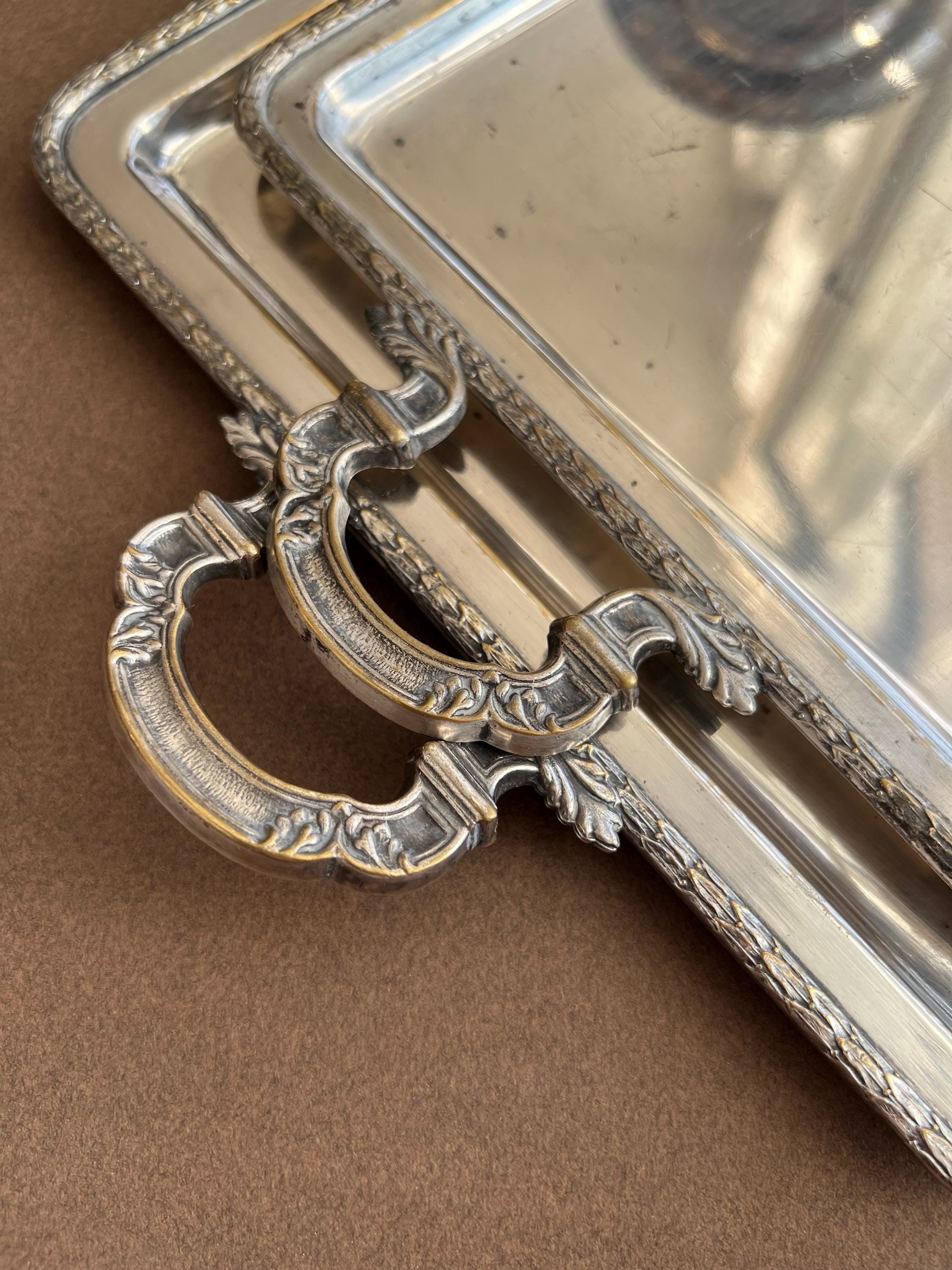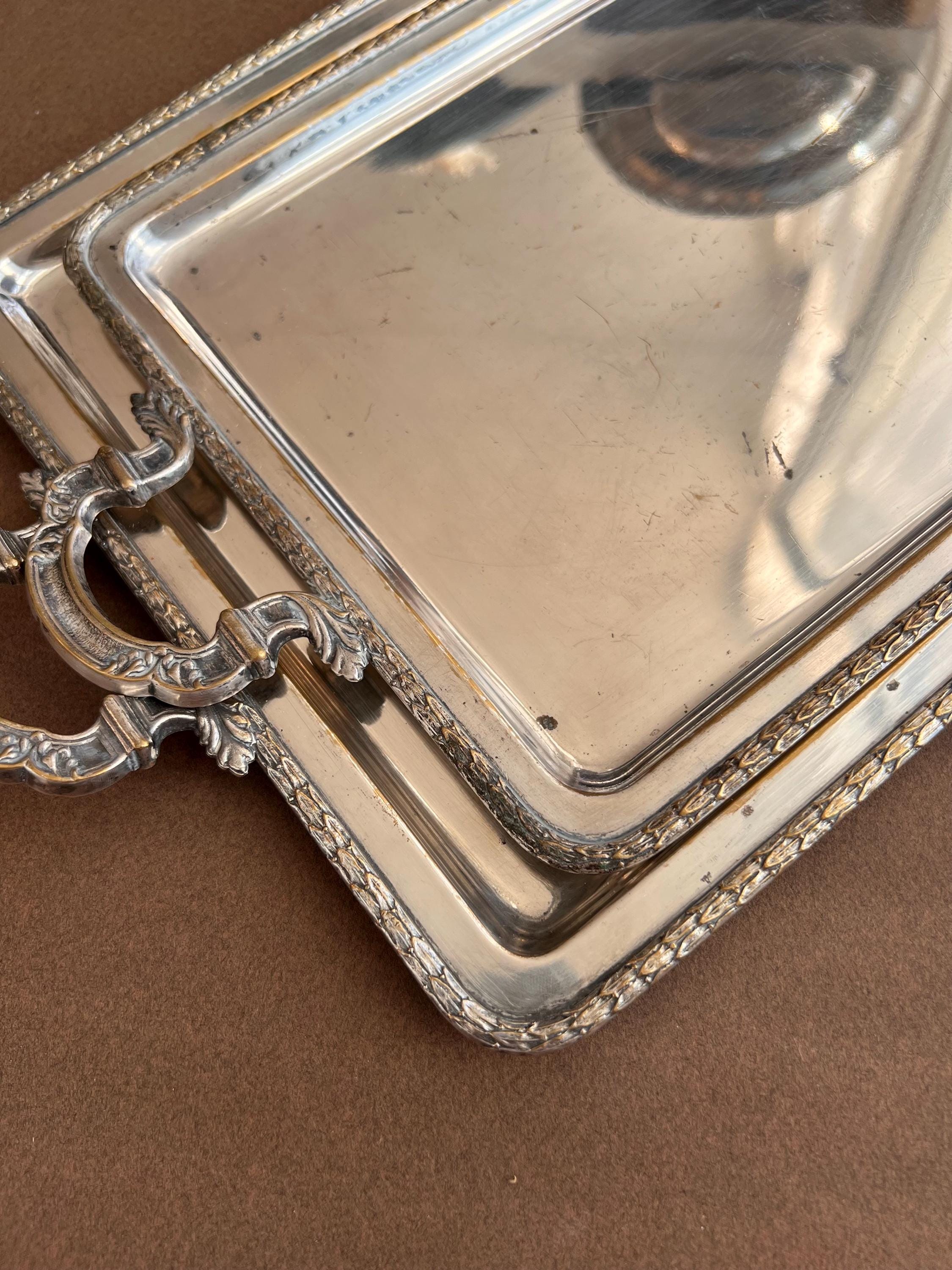 The trays show areas of wear, minor dents (on the big tray only), surface scratches, and some tarnishing or silver loss, as is typical for cherished antique pieces. Please review all photos carefully before purchasing.