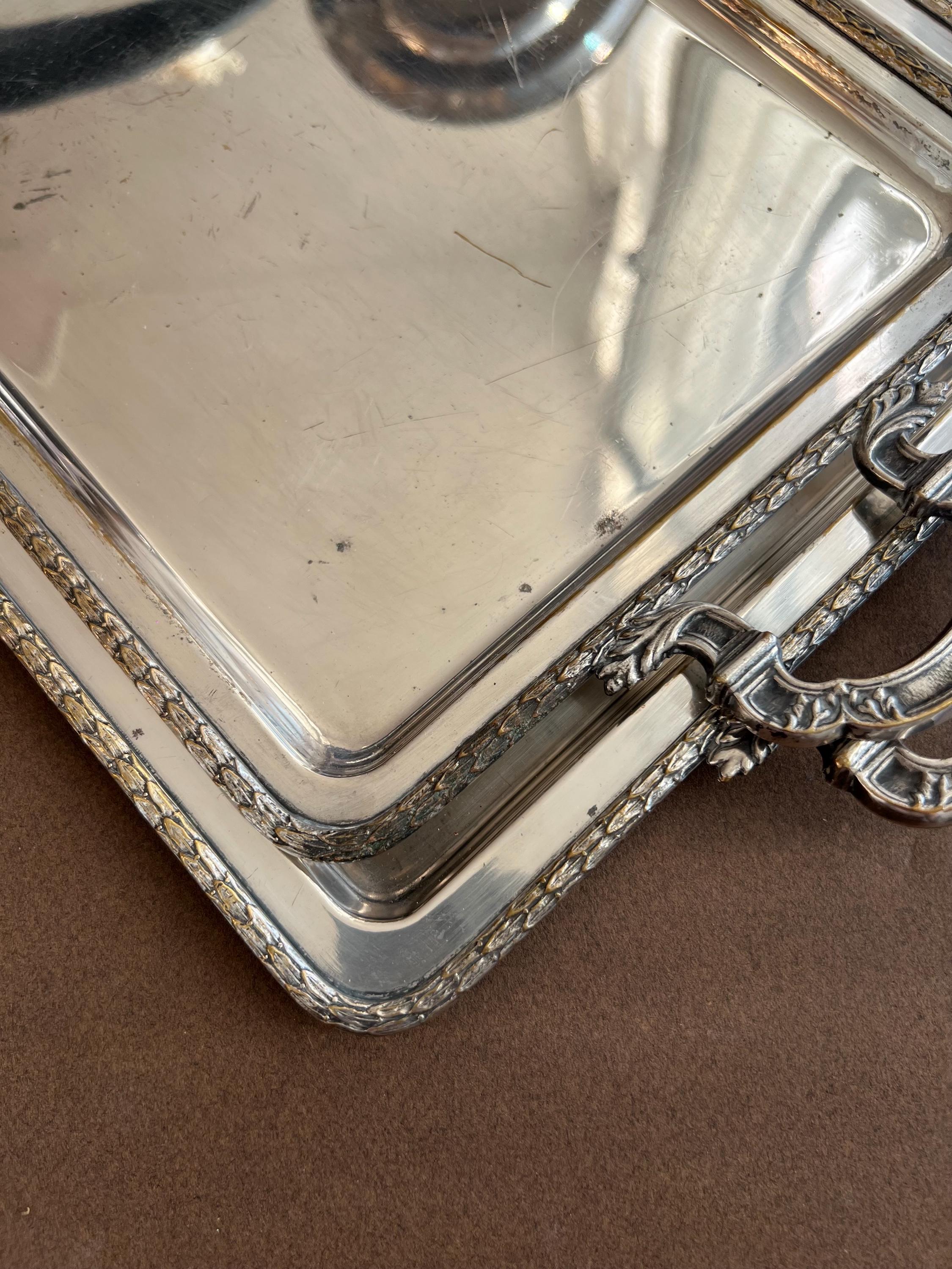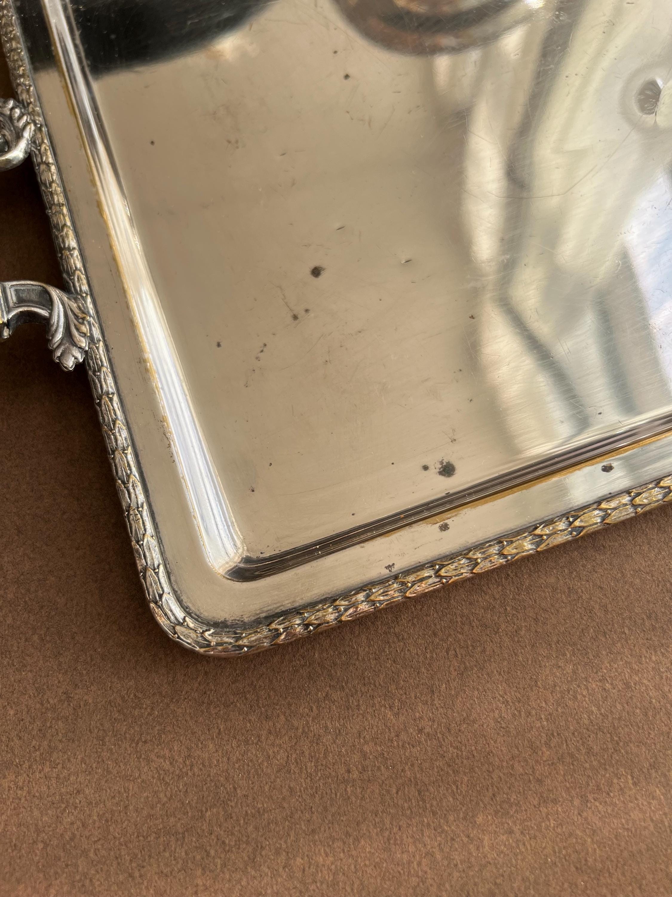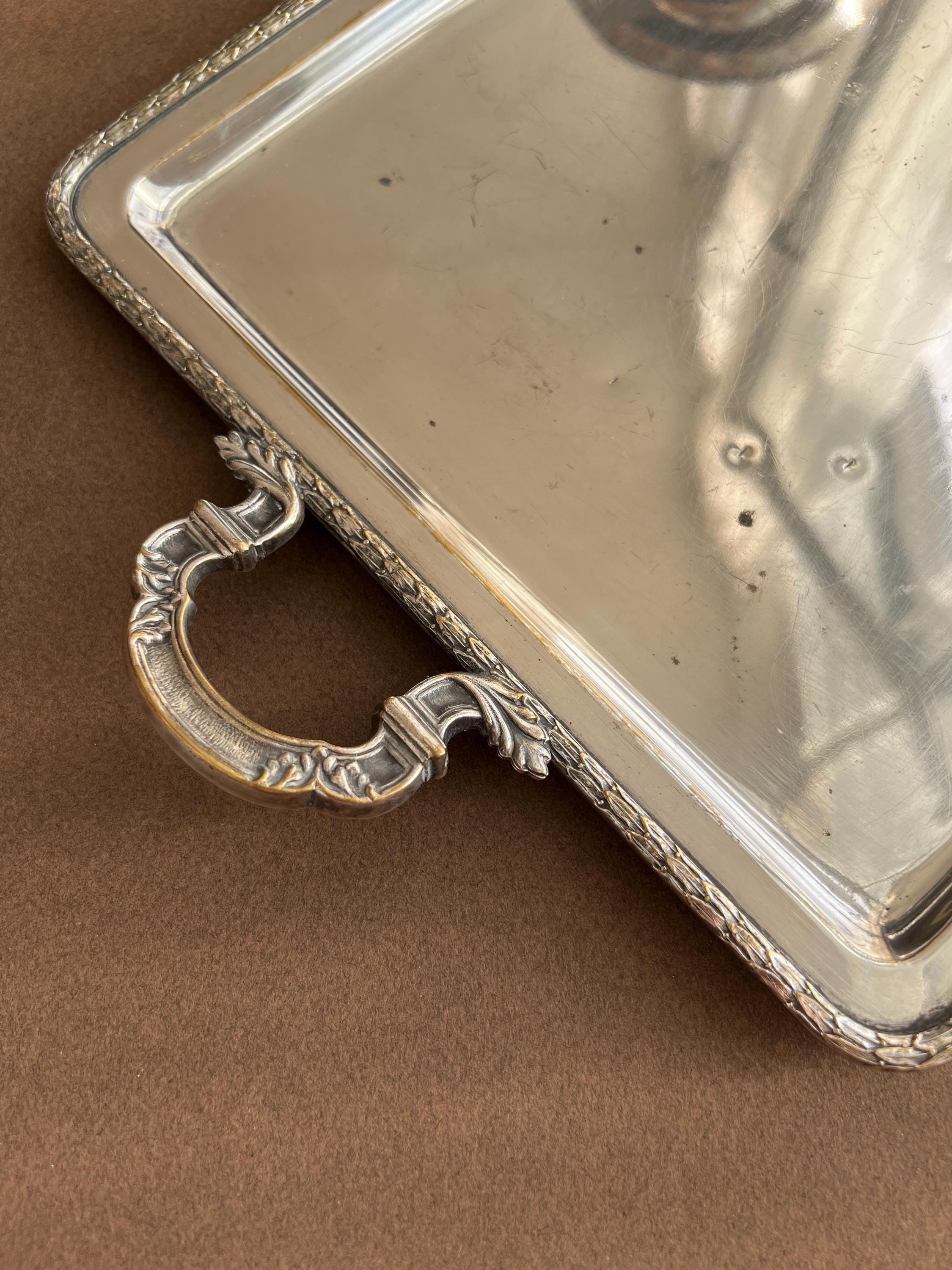 The trays show areas of wear, minor dents (on the big tray only), surface scratches, and some tarnishing or silver loss, as is typical for cherished antique pieces. Please review all photos carefully before purchasing.