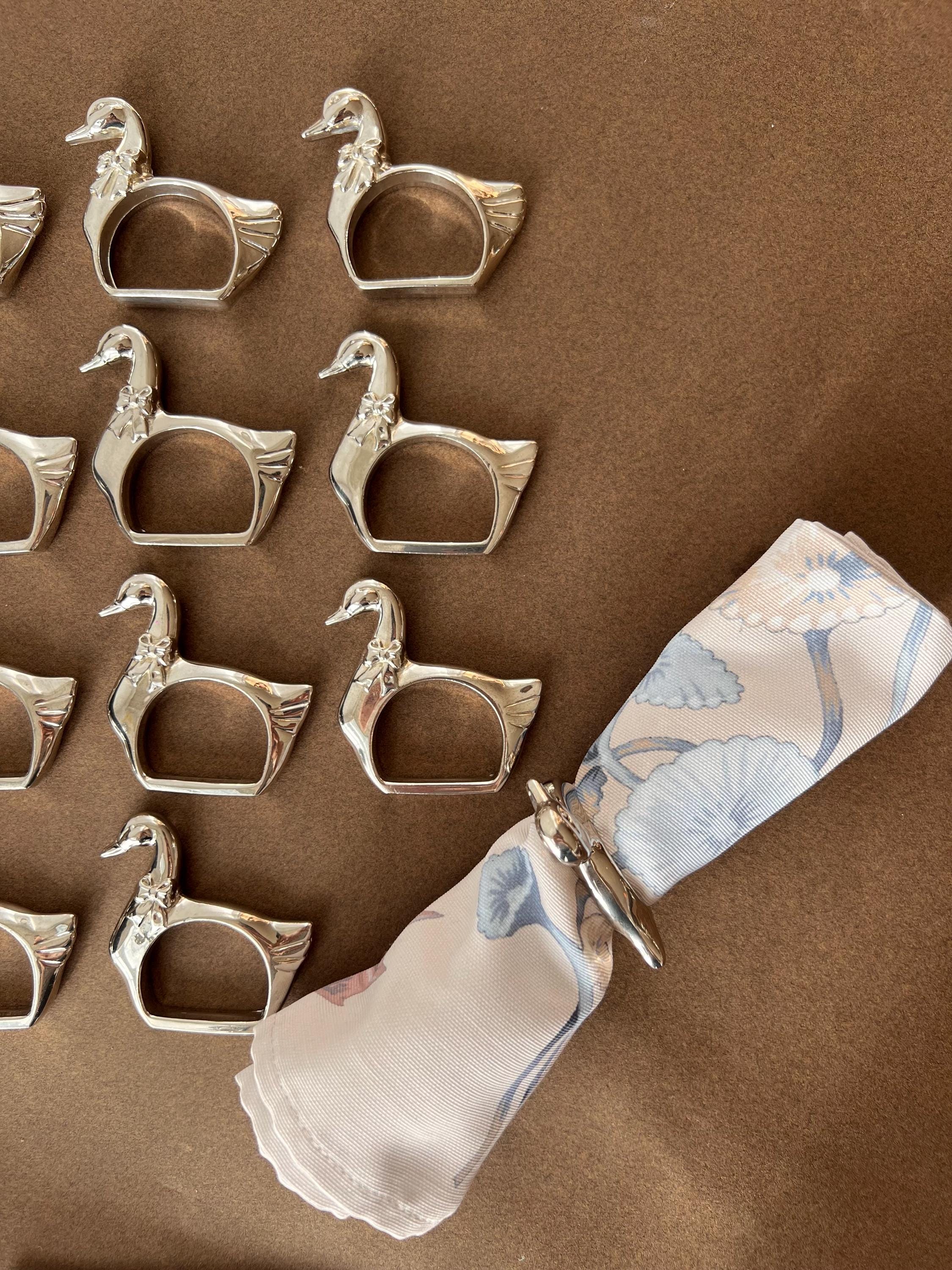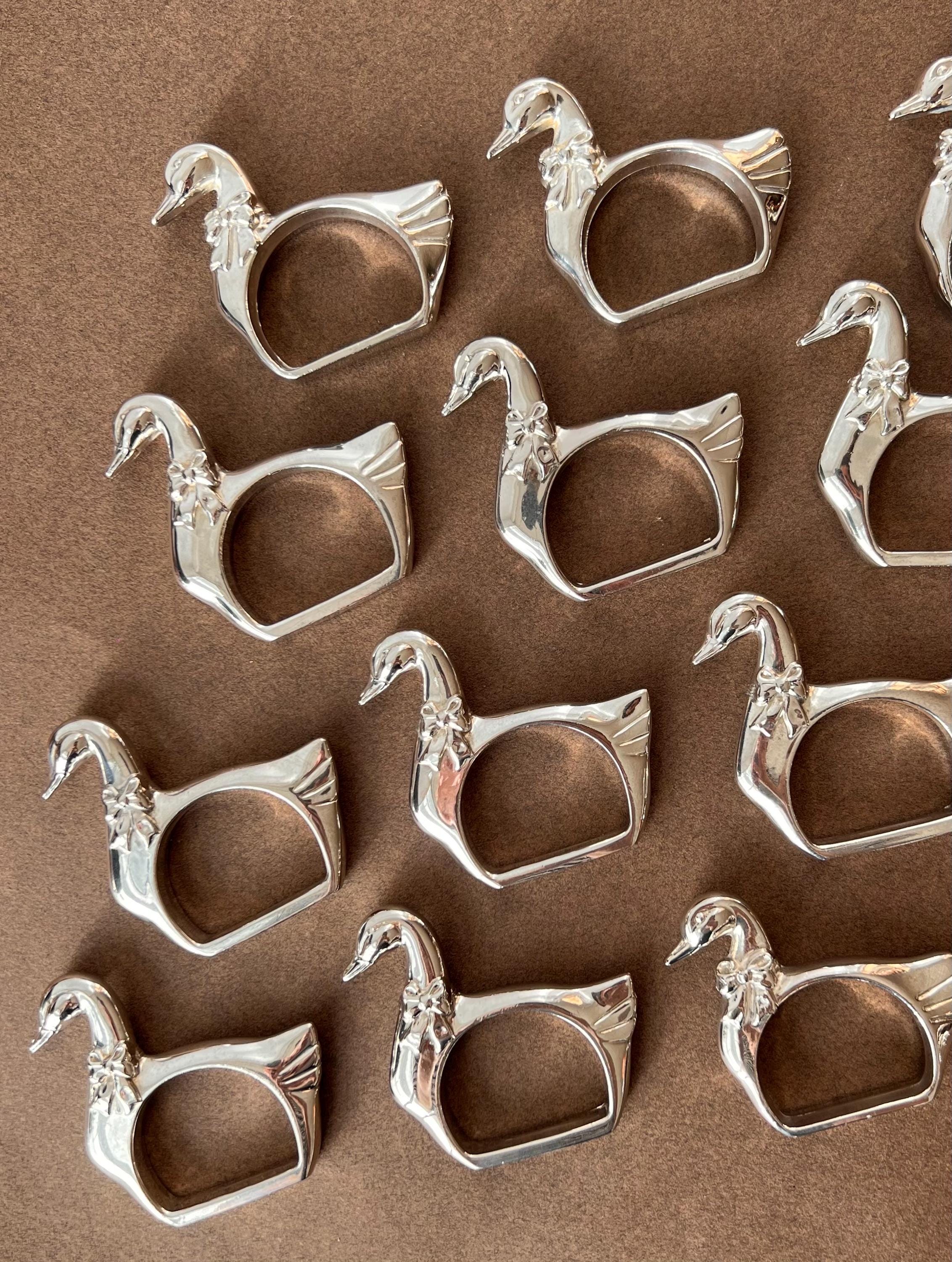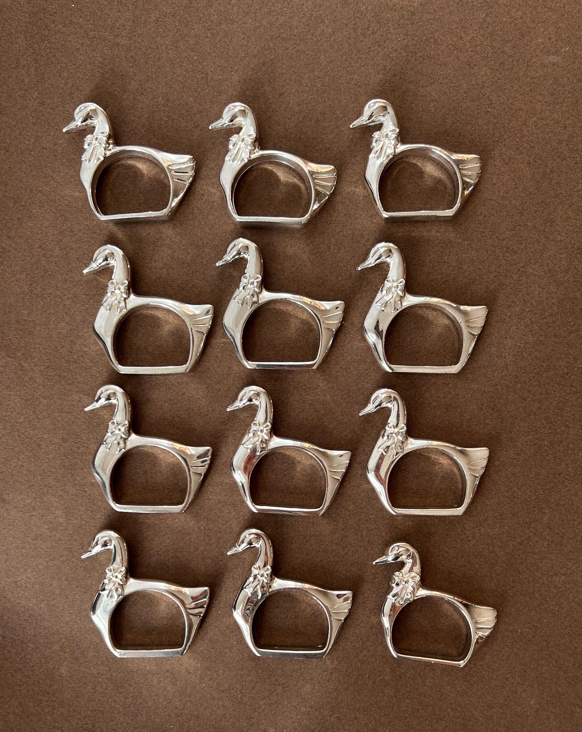 Set of 12 vintage silver-tone napkin rings shaped as elegant ducks, featuring softly sculpted details and a polished finish. Perfect for dressing a formal dining table, holiday meals, spring or farmhouse-style tablescapes, or as a thoughtful gift for hosts and collectors.