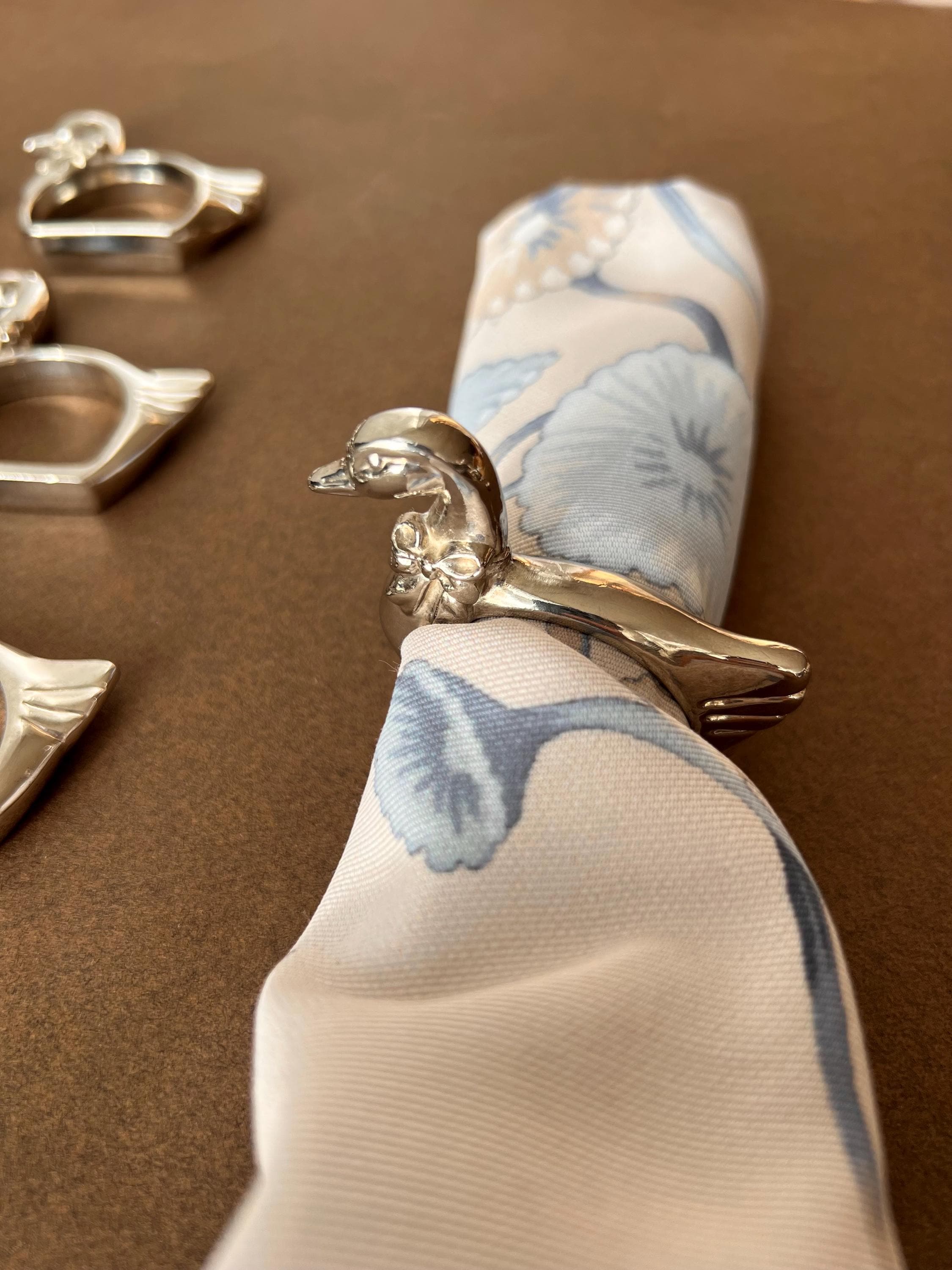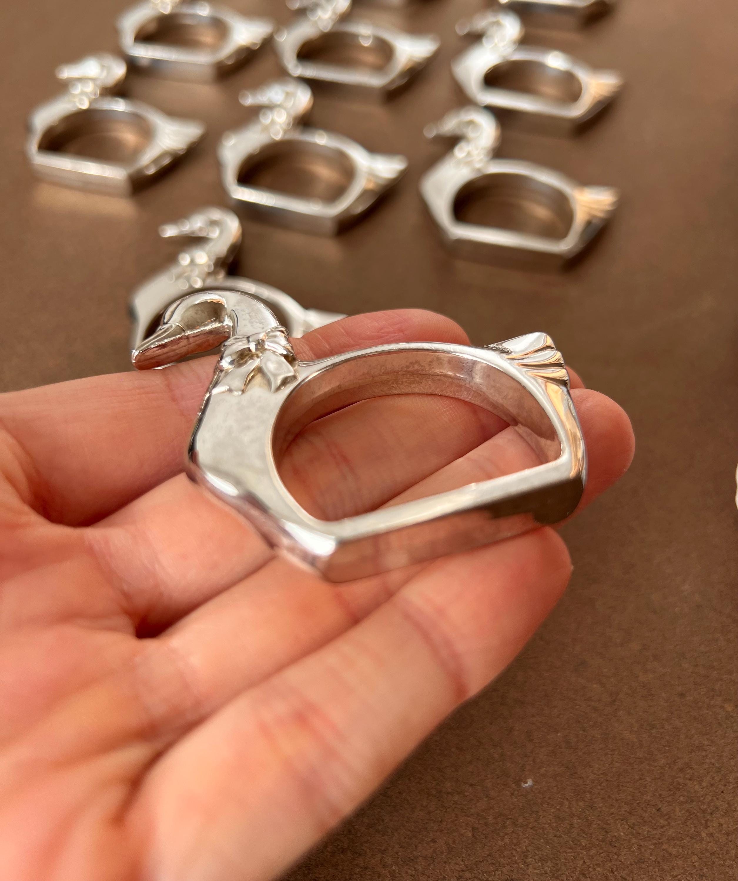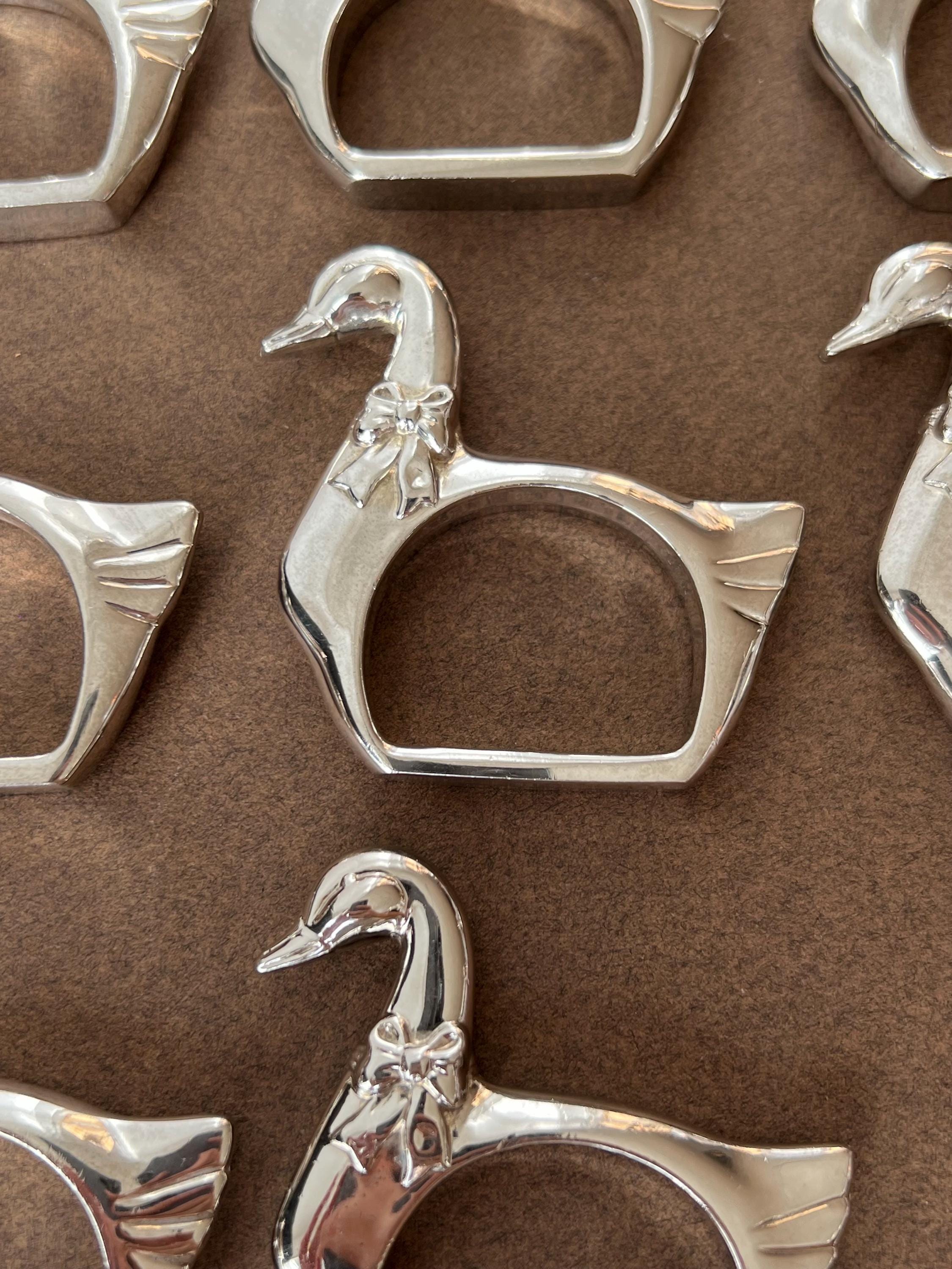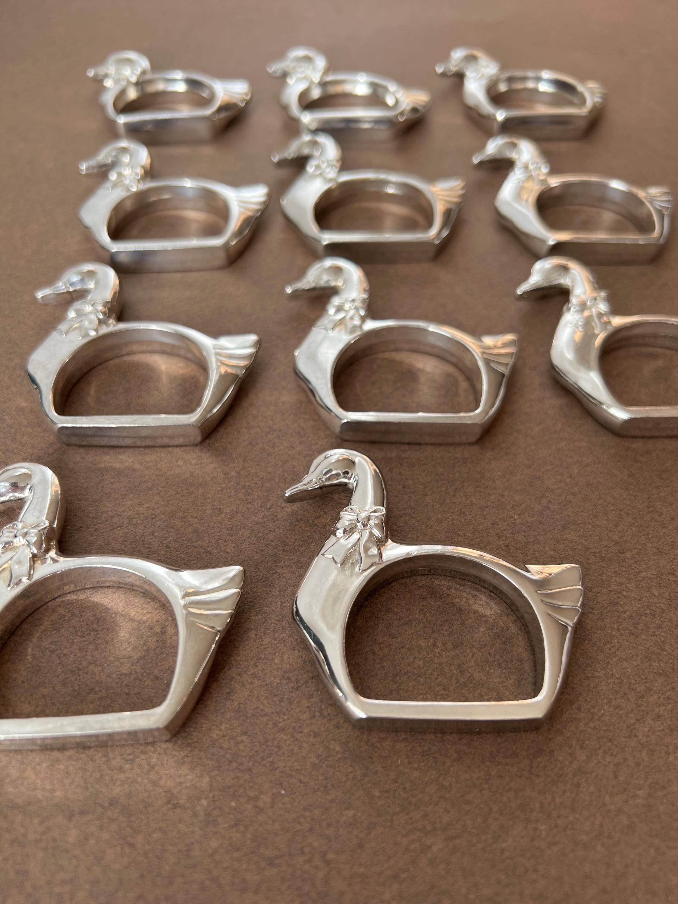 Set of 12 vintage silver-tone napkin rings shaped as elegant ducks, featuring softly sculpted details and a polished finish. Perfect for dressing a formal dining table, holiday meals, spring or farmhouse-style tablescapes, or as a thoughtful gift for hosts and collectors.